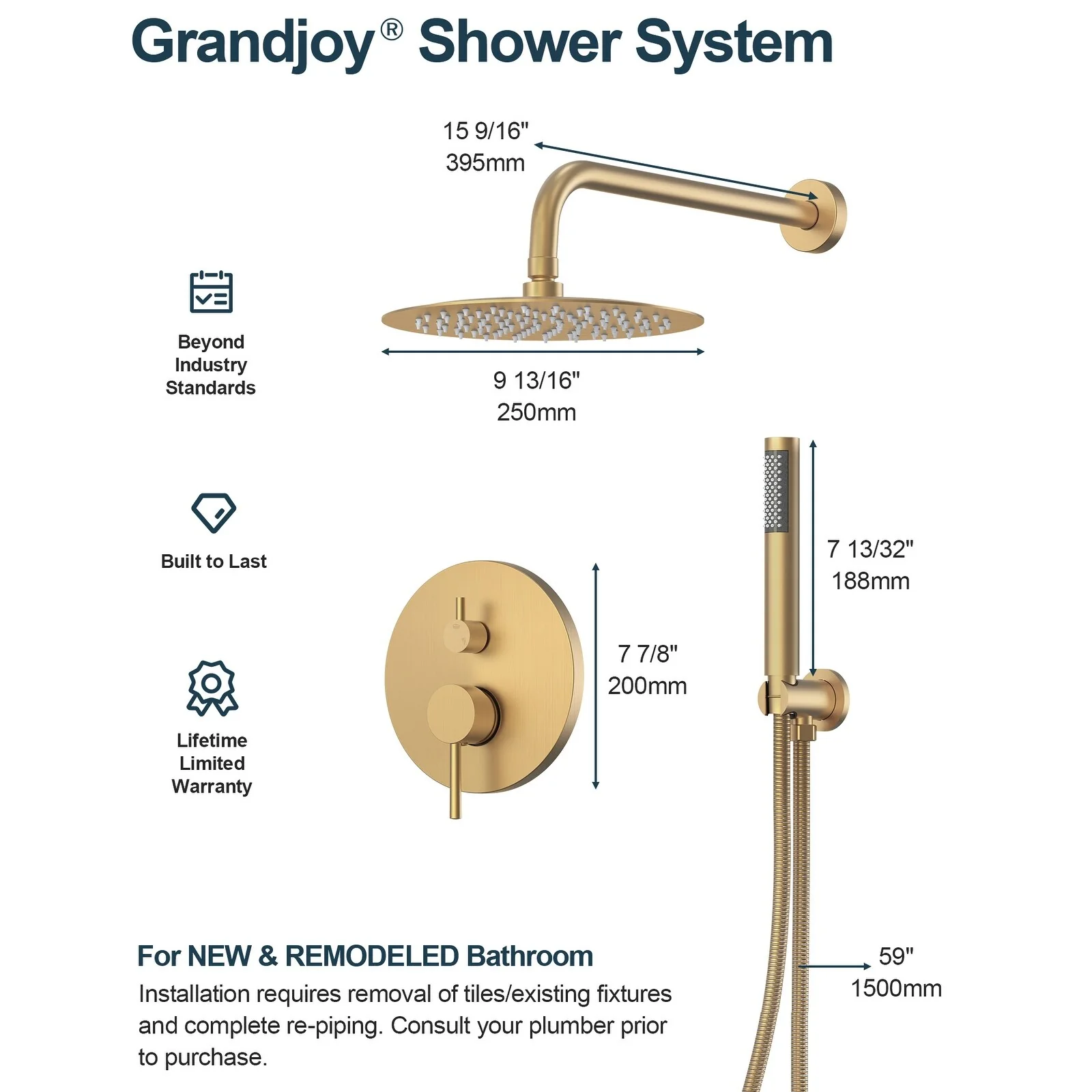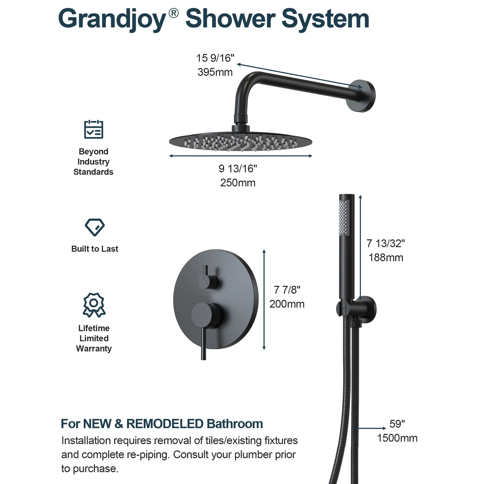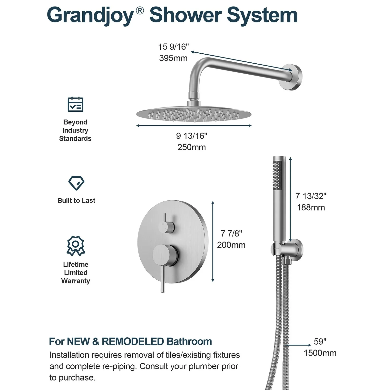 The classic 'GRANDJOY' Shower System is a highly cost-effective and versatile option for families, offering easy installation and meeting diverse household needs with its shower head and handheld spray. With excellent quality and strong corrosion resistance, this system comes with a lifetime warranty, ensuring durability and reliability.