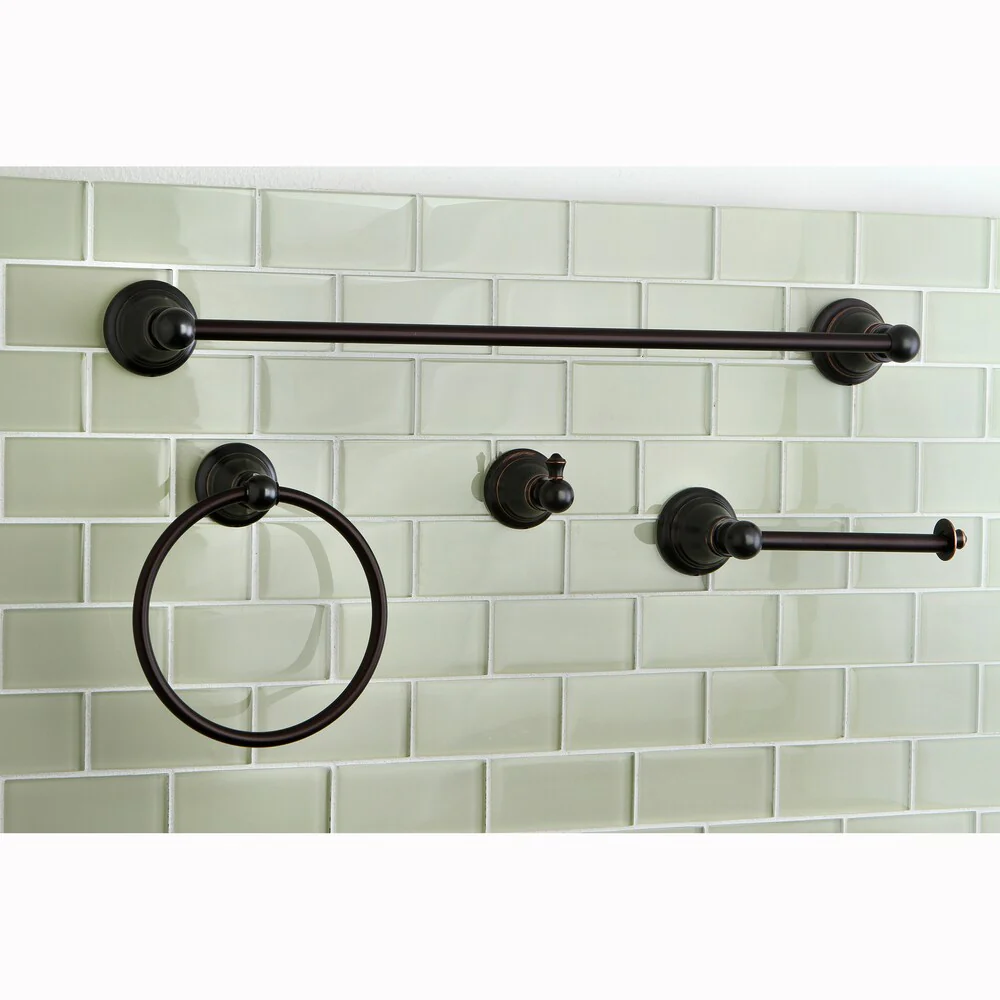 - Includes a faucet, towel bar, towel ring, robe hook and toilet paper holder