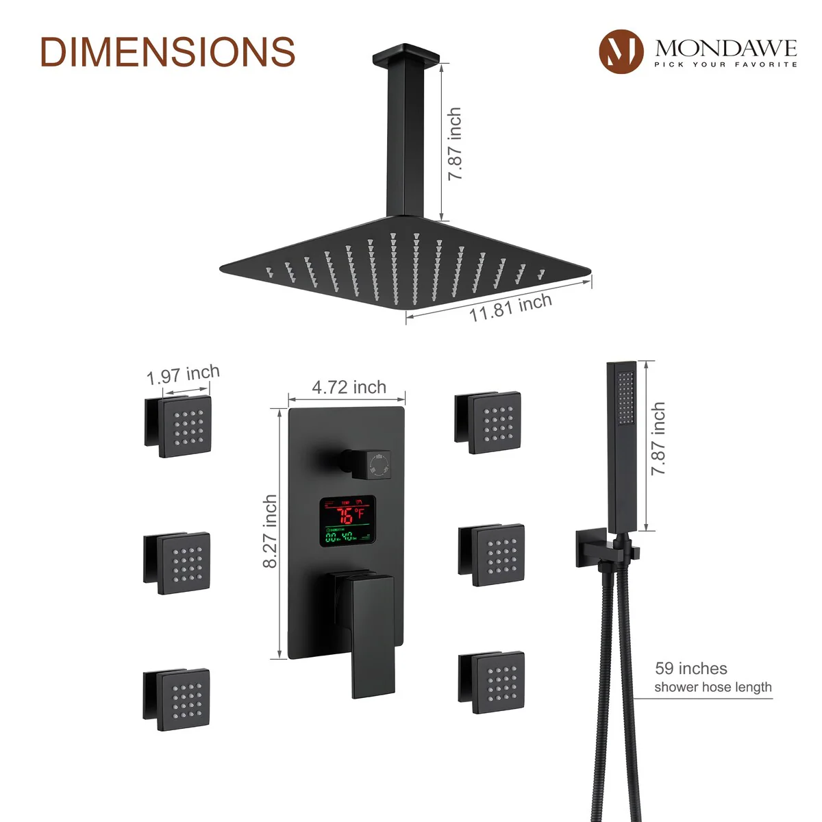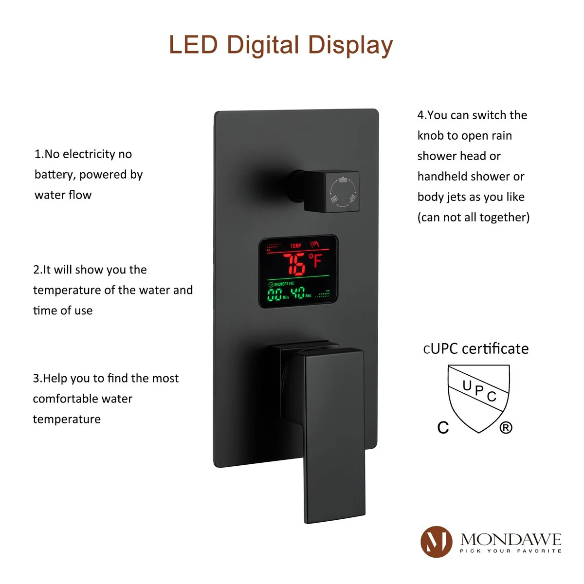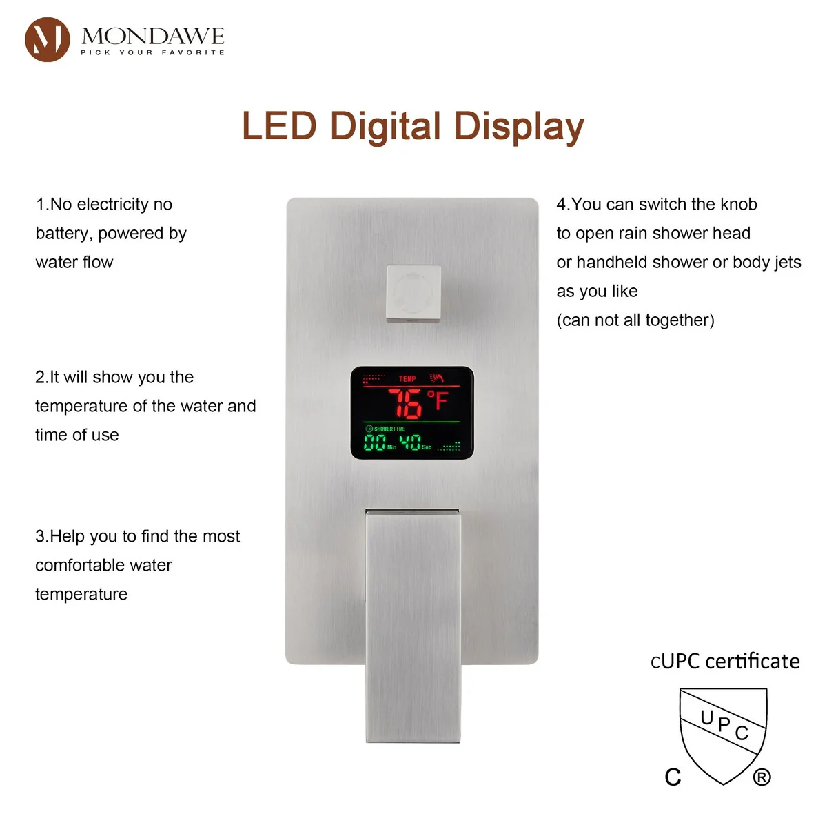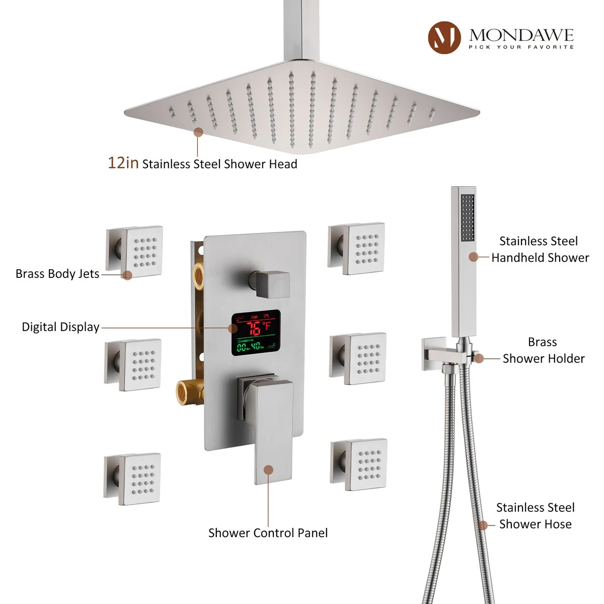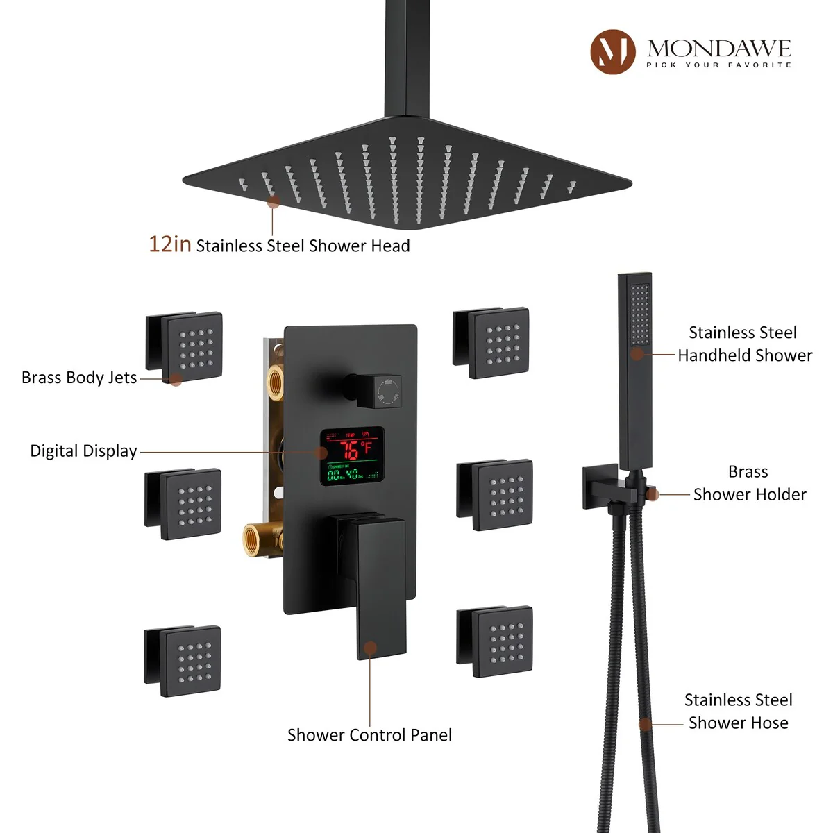 This thermostatic shower system is made of solid brass and stainless steel, with a hand shower and 6 body jets, offering you a full-body shower experience. The digital display is powered by water flow, which can help you find the most comfortable temperature.1.All Metal Construction: 12in stainless steel shower head, stainless steel handheld shower and 6 brass body jets2.Anti-Scald: Thermostatic copper valve with cUPC Certificated offers water at the desired temperature and keeps it constant without fluctuations to prevent scalding3.Digital Display: No electricity no battery, powered by water flow. It will show you the temperature of the water and time of use to help you to find the most comfortable water temperature4.3 Functions: You can switch effortlessly from rain shower head to body jets or hand spray. You can't use all the shower heads at the same time.5.Standard US 1/2'' NPT Connection: The connectors are standard NPT 1/2'' tapered threads, compatible with most existing shower systems6.