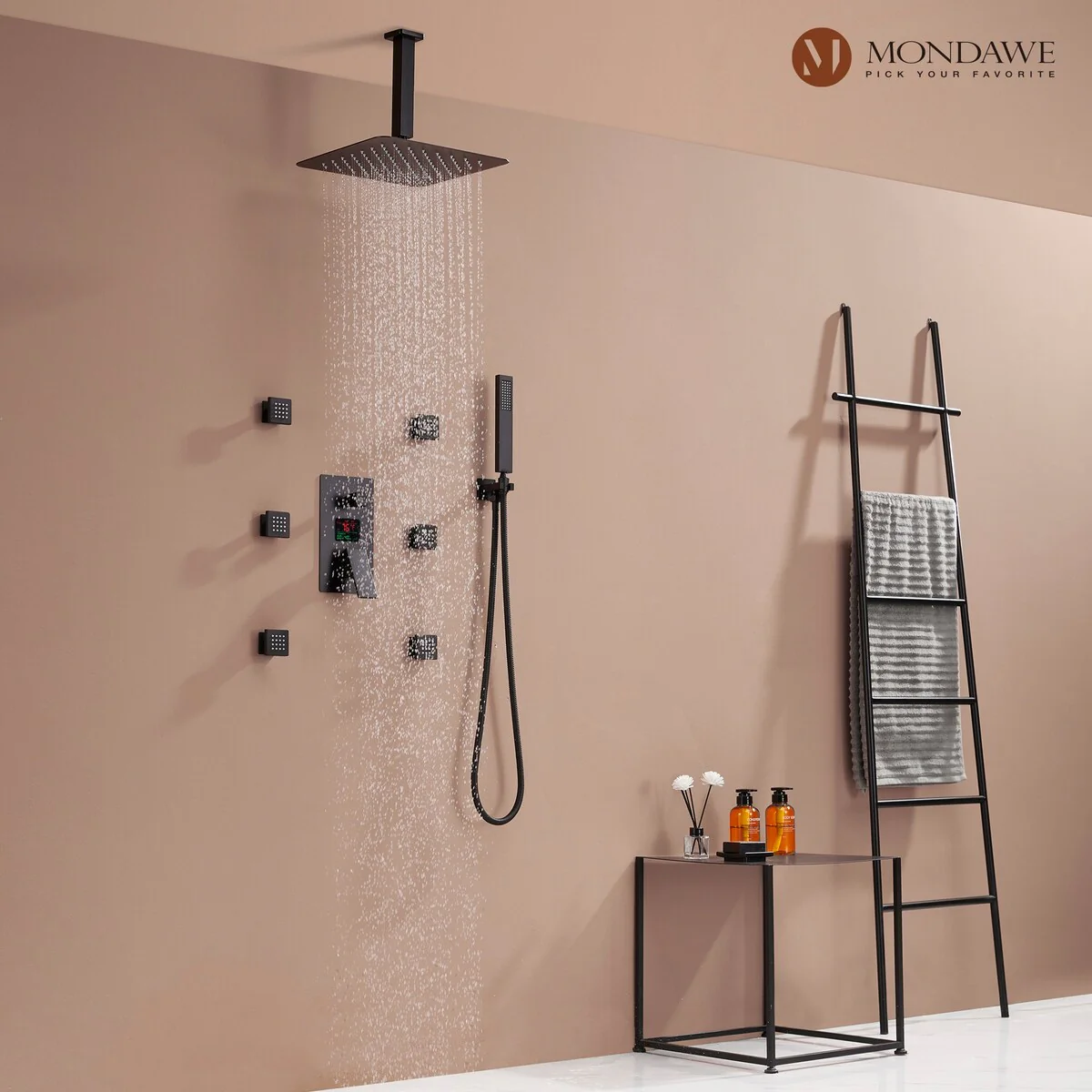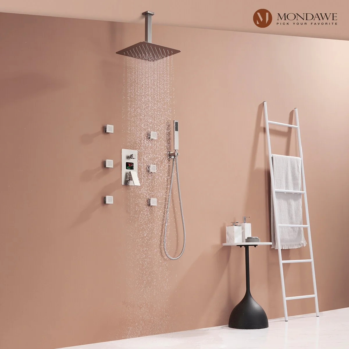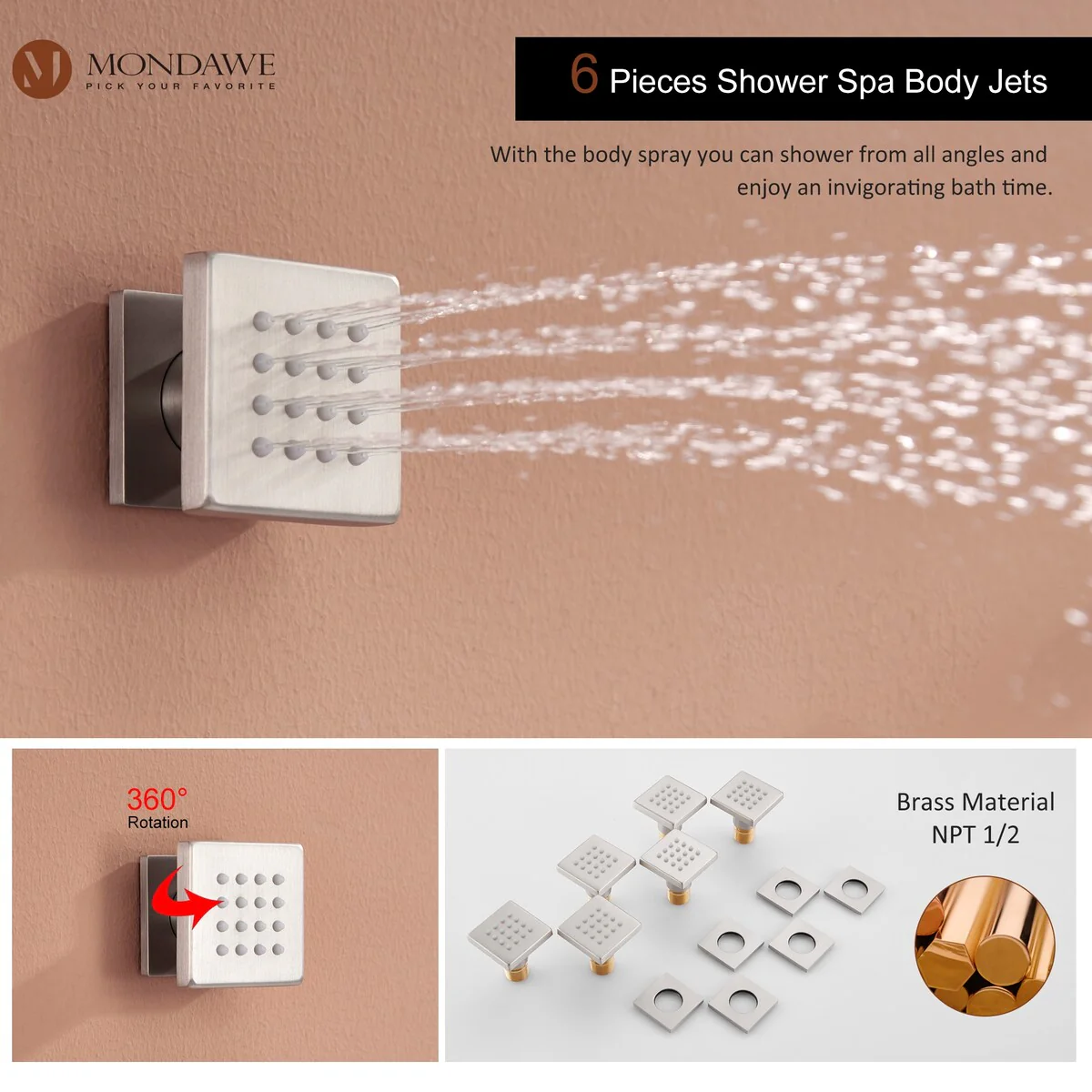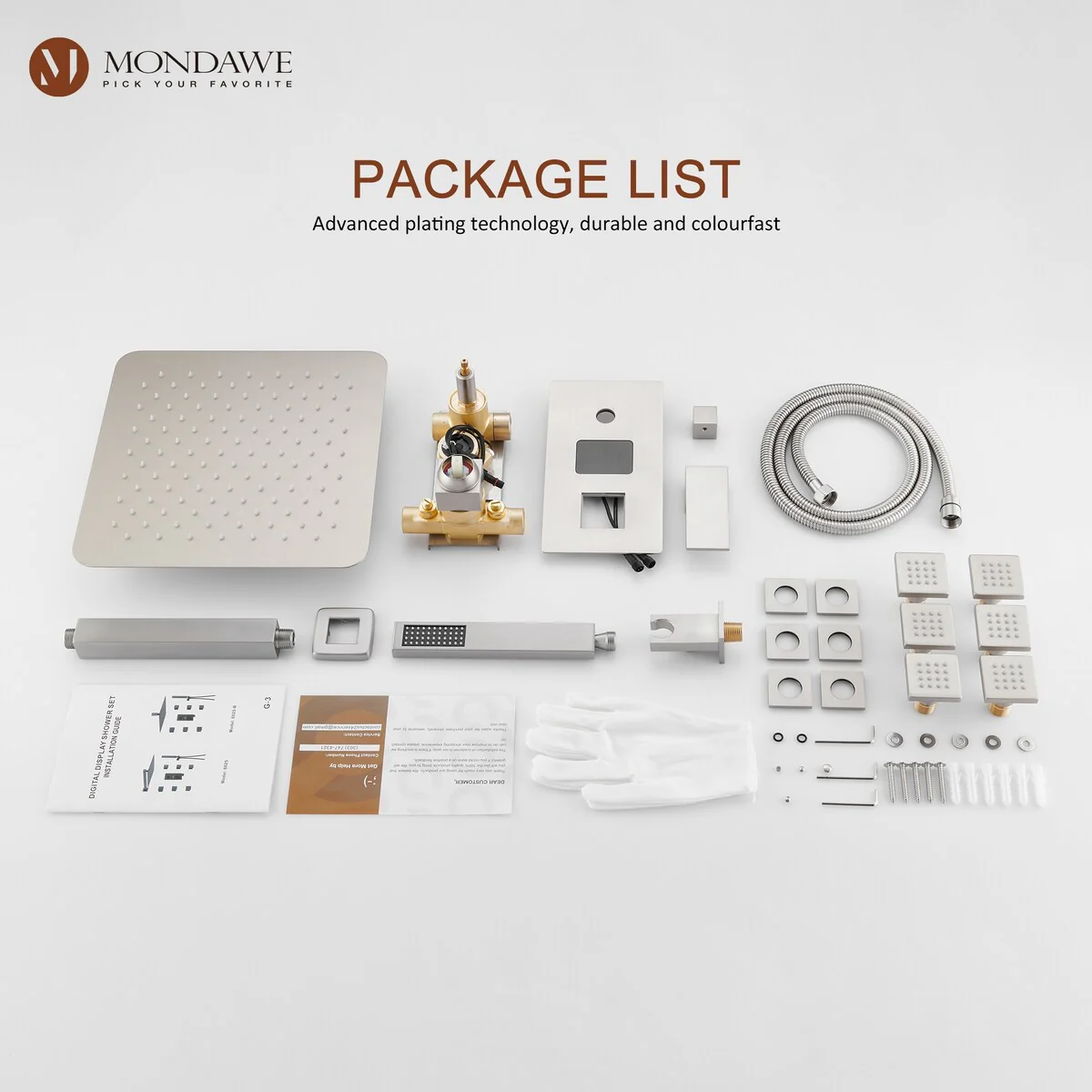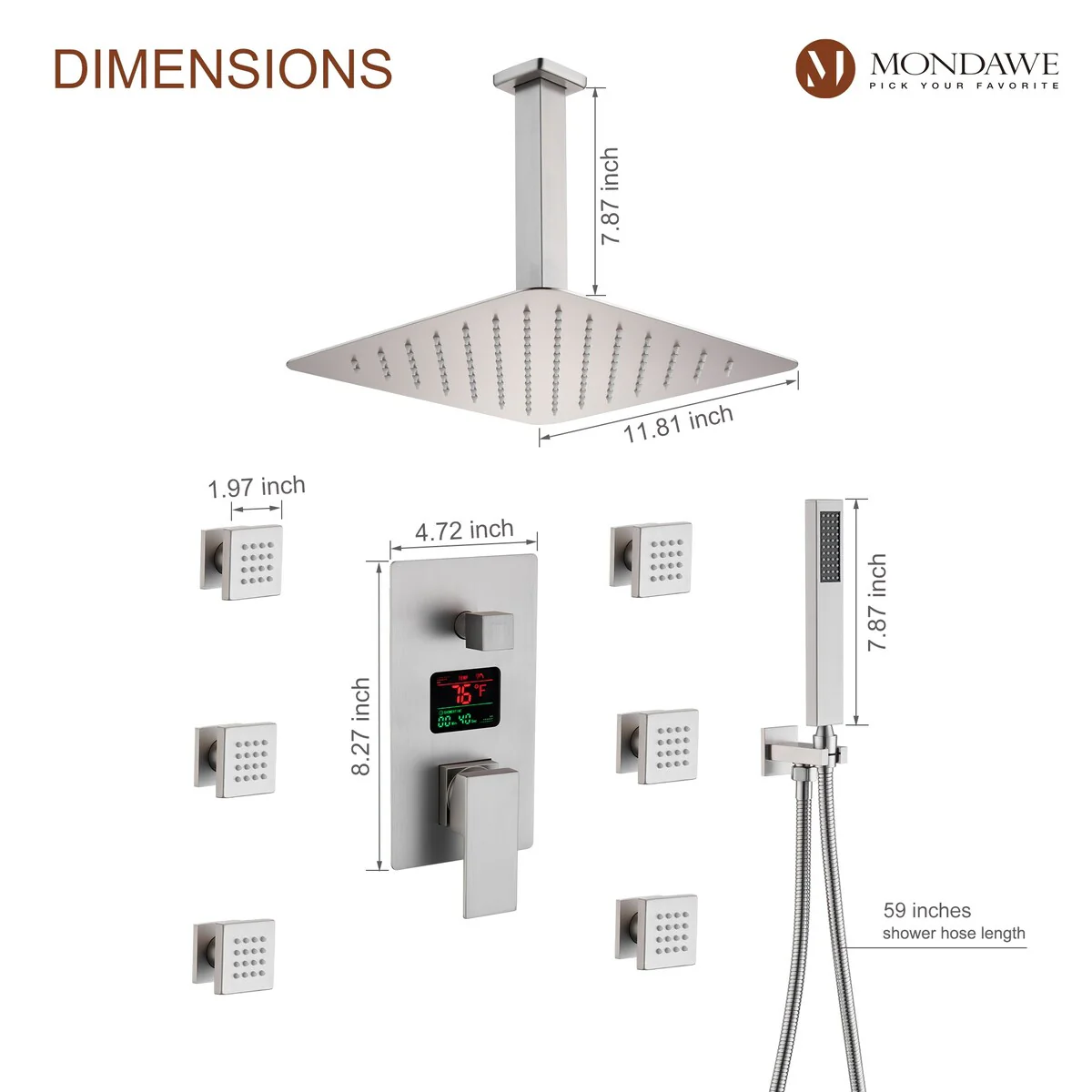 This thermostatic shower system is made of solid brass and stainless steel, with a hand shower and 6 body jets, offering you a full-body shower experience. The digital display is powered by water flow, which can help you find the most comfortable temperature.1.All Metal Construction: 12in stainless steel shower head, stainless steel handheld shower and 6 brass body jets2.Anti-Scald: Thermostatic copper valve with cUPC Certificated offers water at the desired temperature and keeps it constant without fluctuations to prevent scalding3.Digital Display: No electricity no battery, powered by water flow. It will show you the temperature of the water and time of use to help you to find the most comfortable water temperature4.3 Functions: You can switch effortlessly from rain shower head to body jets or hand spray. You can't use all the shower heads at the same time.5.Standard US 1/2'' NPT Connection: The connectors are standard NPT 1/2'' tapered threads, compatible with most existing shower systems6.