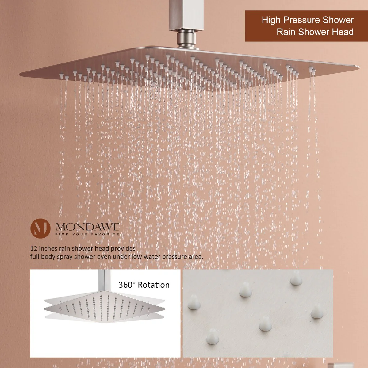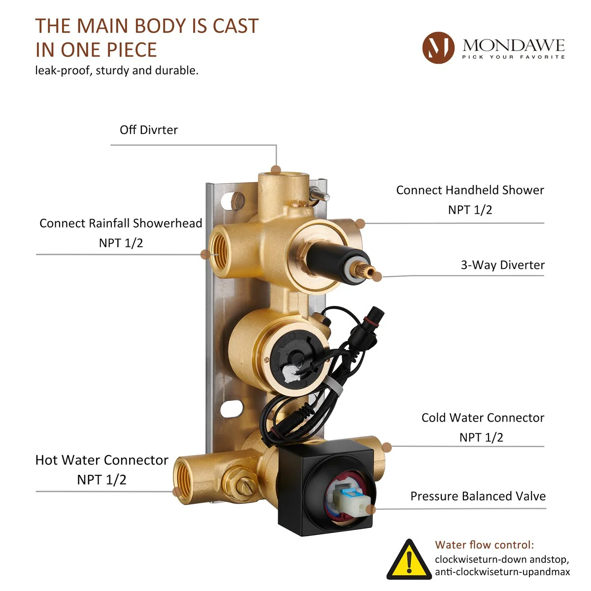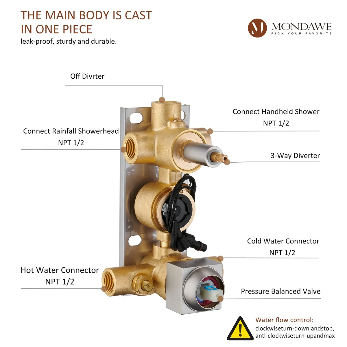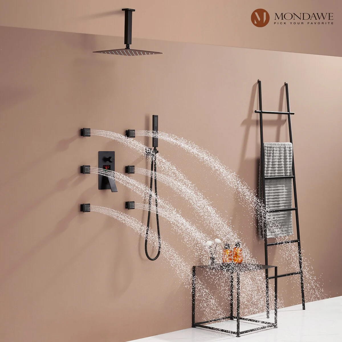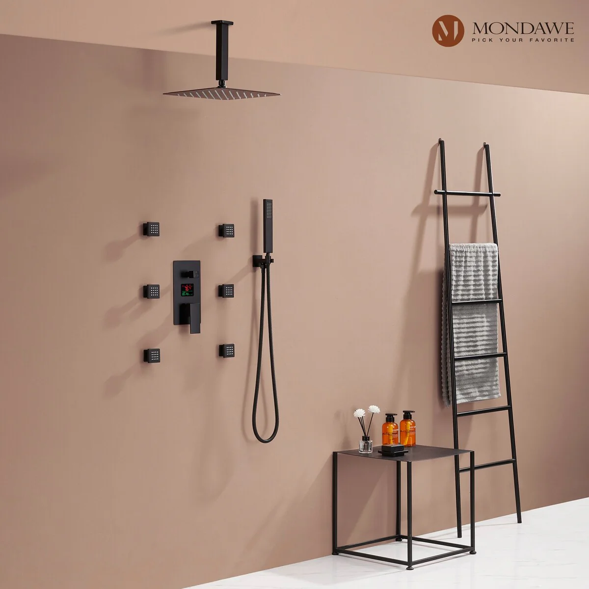 This thermostatic shower system is made of solid brass and stainless steel, with a hand shower and 6 body jets, offering you a full-body shower experience. The digital display is powered by water flow, which can help you find the most comfortable temperature.1.All Metal Construction: 12in stainless steel shower head, stainless steel handheld shower and 6 brass body jets2.Anti-Scald: Thermostatic copper valve with cUPC Certificated offers water at the desired temperature and keeps it constant without fluctuations to prevent scalding3.Digital Display: No electricity no battery, powered by water flow. It will show you the temperature of the water and time of use to help you to find the most comfortable water temperature4.3 Functions: You can switch effortlessly from rain shower head to body jets or hand spray. You can't use all the shower heads at the same time.5.Standard US 1/2'' NPT Connection: The connectors are standard NPT 1/2'' tapered threads, compatible with most existing shower systems6.