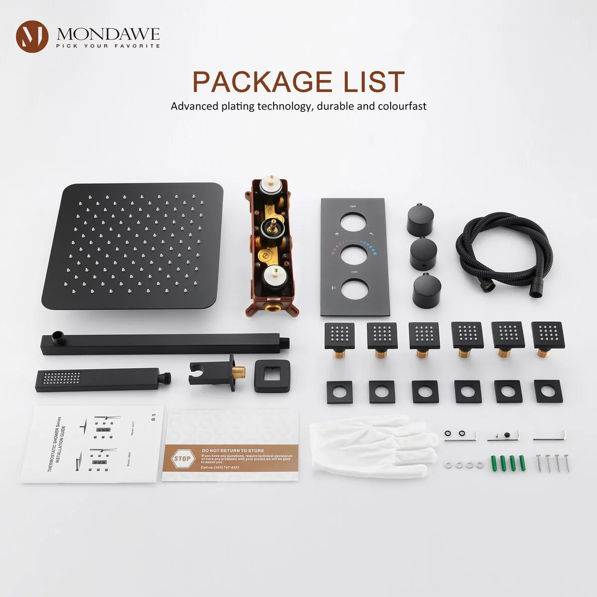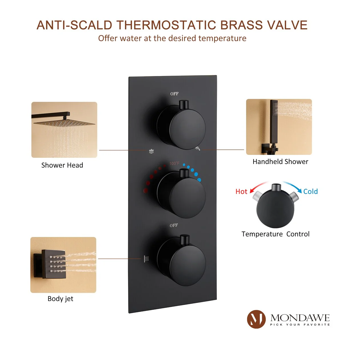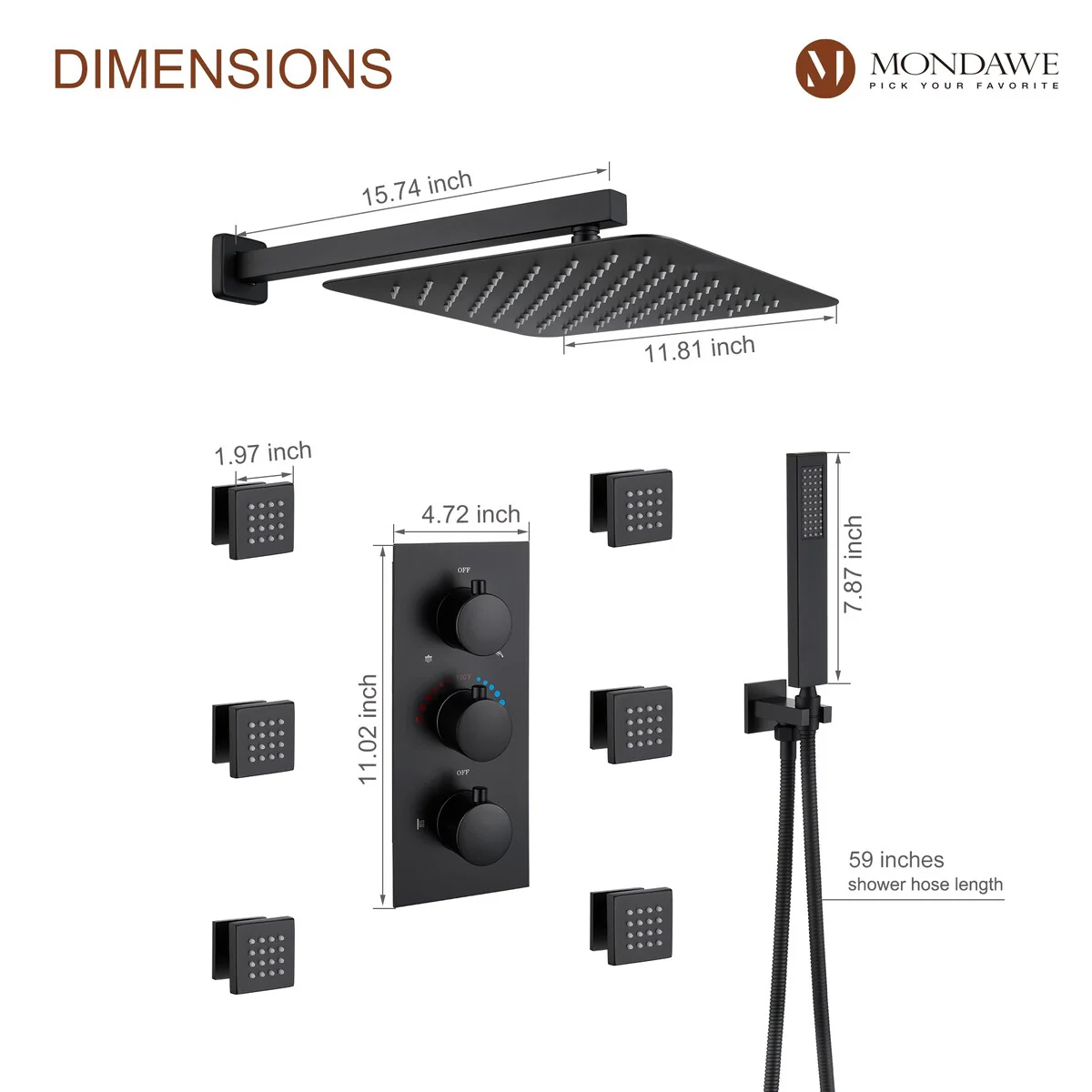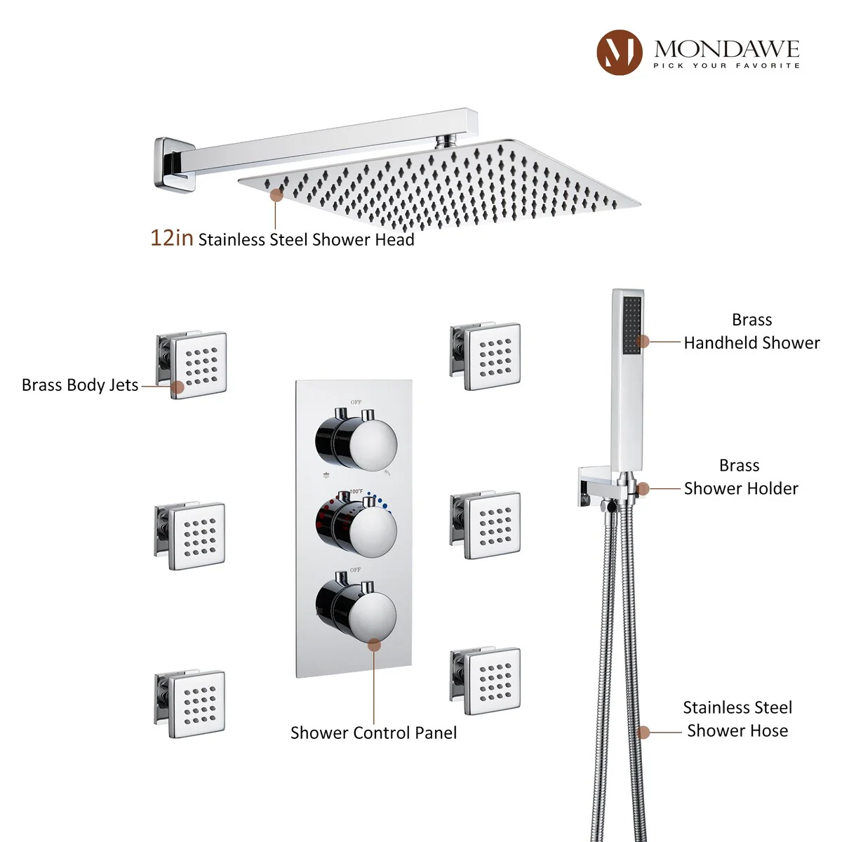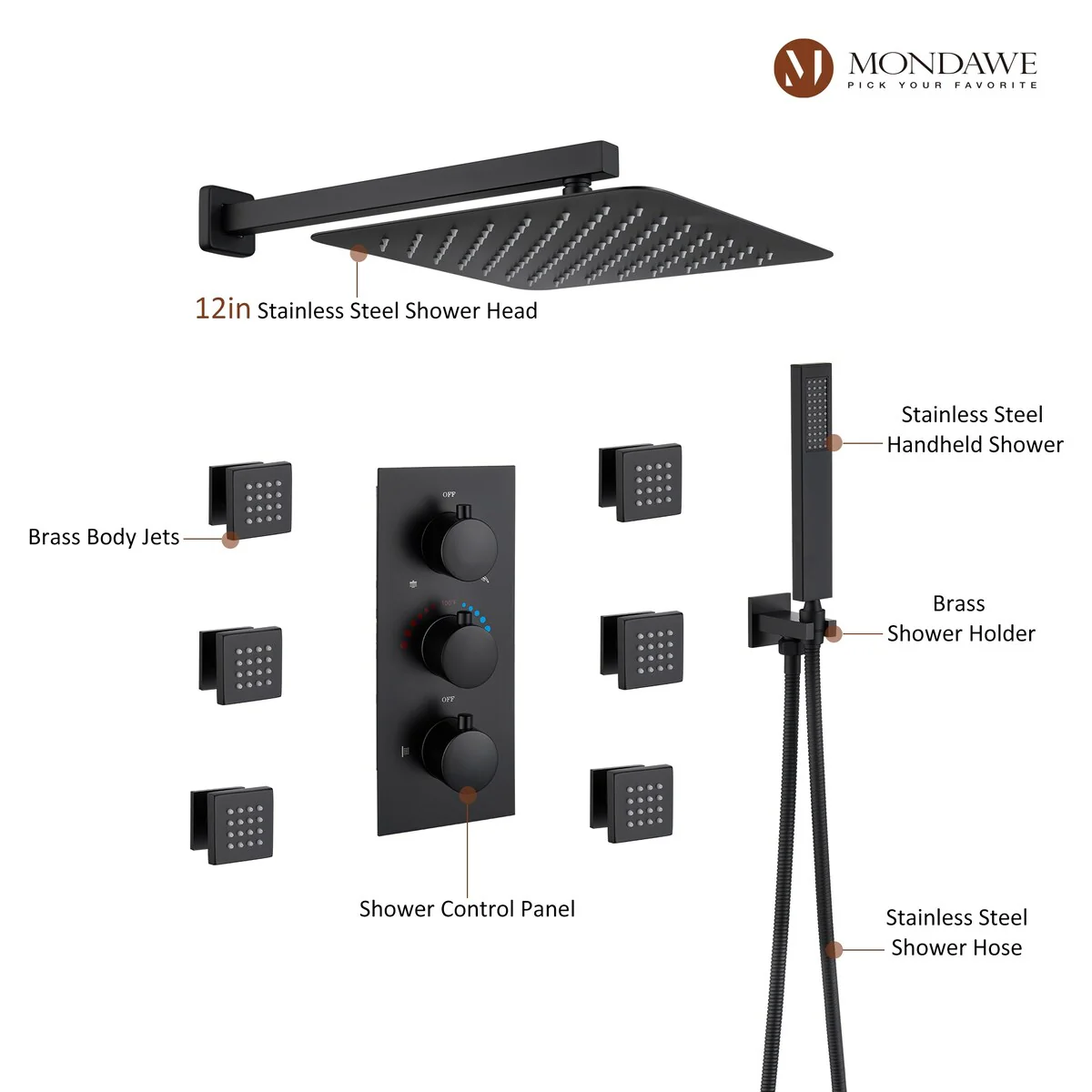 This thermostatic shower system is made of solid brass and stainless steel, with a hand shower and 6 body jets, offering you a full-body shower experience.1.All Metal Construction: 12in stainless steel shower head, stainless steel handheld shower and 6 brass body jets2.Anti-Scald: Thermostatic copper valve offers water at the desired temperature and keeps it constant without fluctuations to prevent scalding3.3 Functions: The shower head and body jet can discharge water at the same time4.Built To Last: Advanced plating technology, durable and colourfast5.Standard US 1/2'' NPT Connection: The connectors are standard NPT 1/2'' tapered threads, compatible with most existing shower systems6.