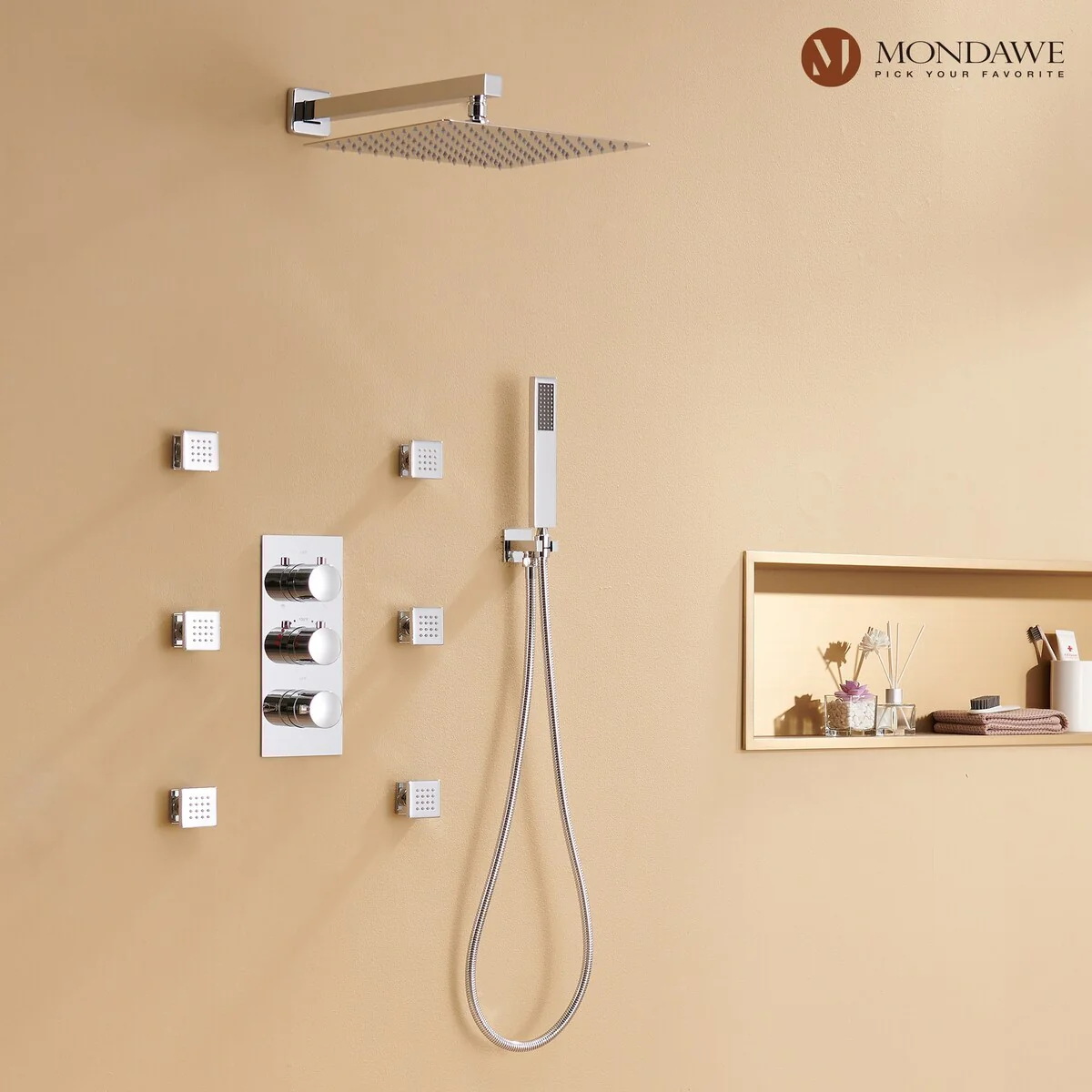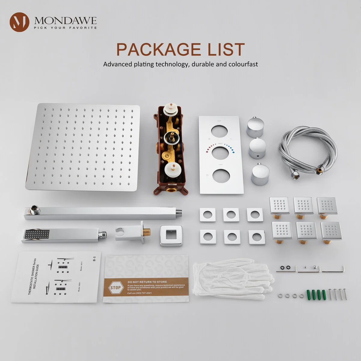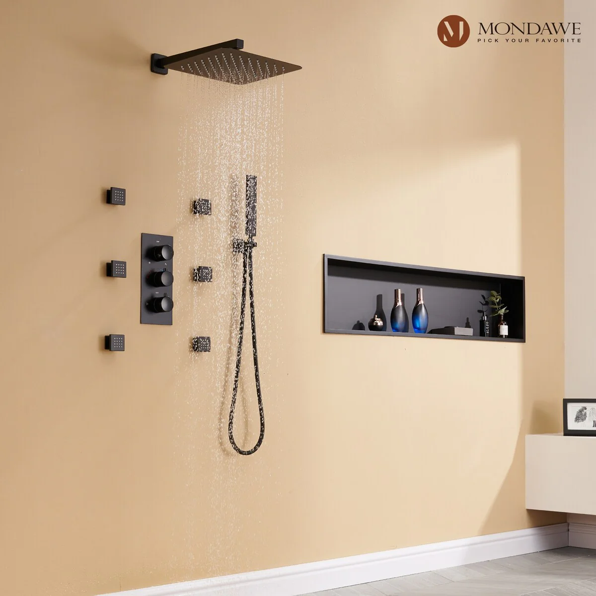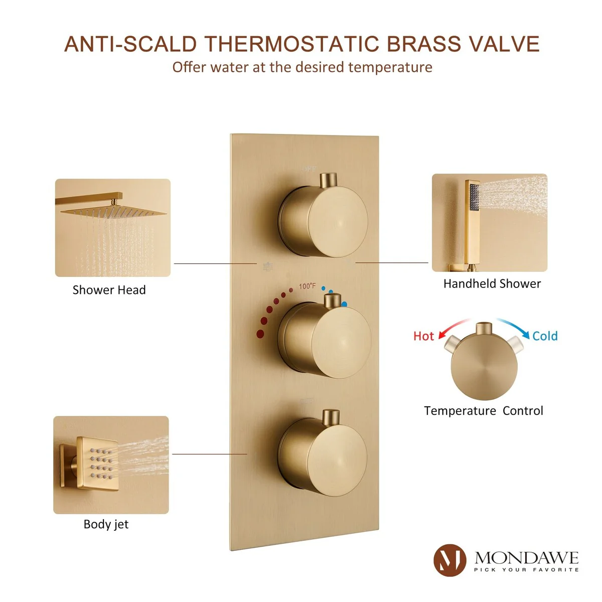 This thermostatic shower system is made of solid brass and stainless steel, with a hand shower and 6 body jets, offering you a full-body shower experience.1.All Metal Construction: 12in stainless steel shower head, stainless steel handheld shower and 6 brass body jets2.Anti-Scald: Thermostatic copper valve offers water at the desired temperature and keeps it constant without fluctuations to prevent scalding3.3 Functions: The shower head and body jet can discharge water at the same time4.Built To Last: Advanced plating technology, durable and colourfast5.Standard US 1/2'' NPT Connection: The connectors are standard NPT 1/2'' tapered threads, compatible with most existing shower systems6.