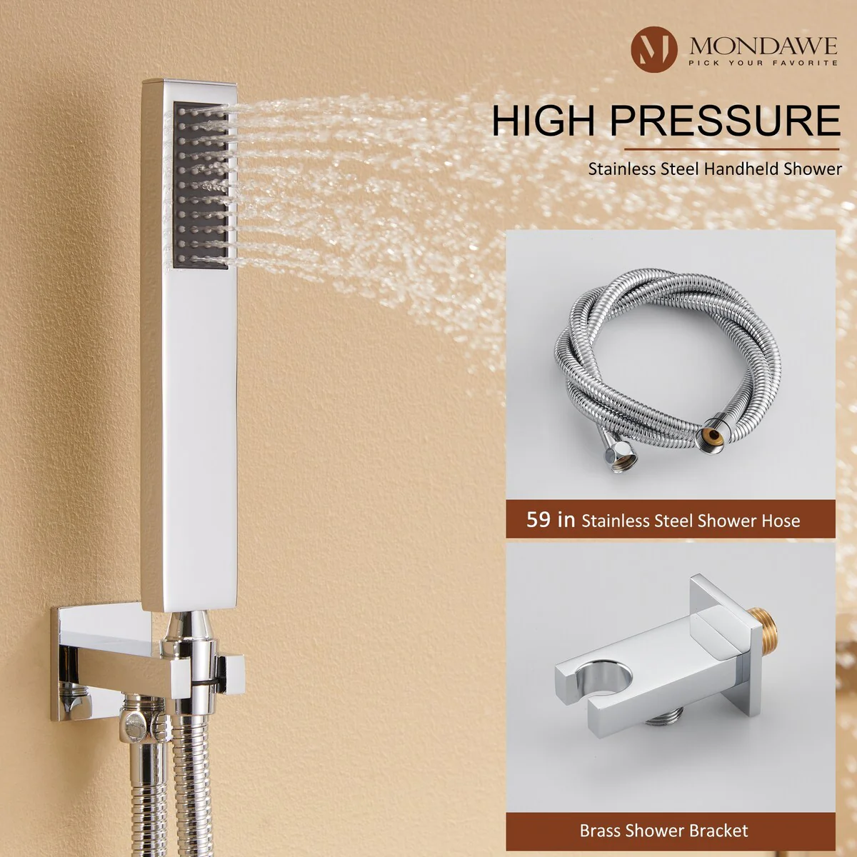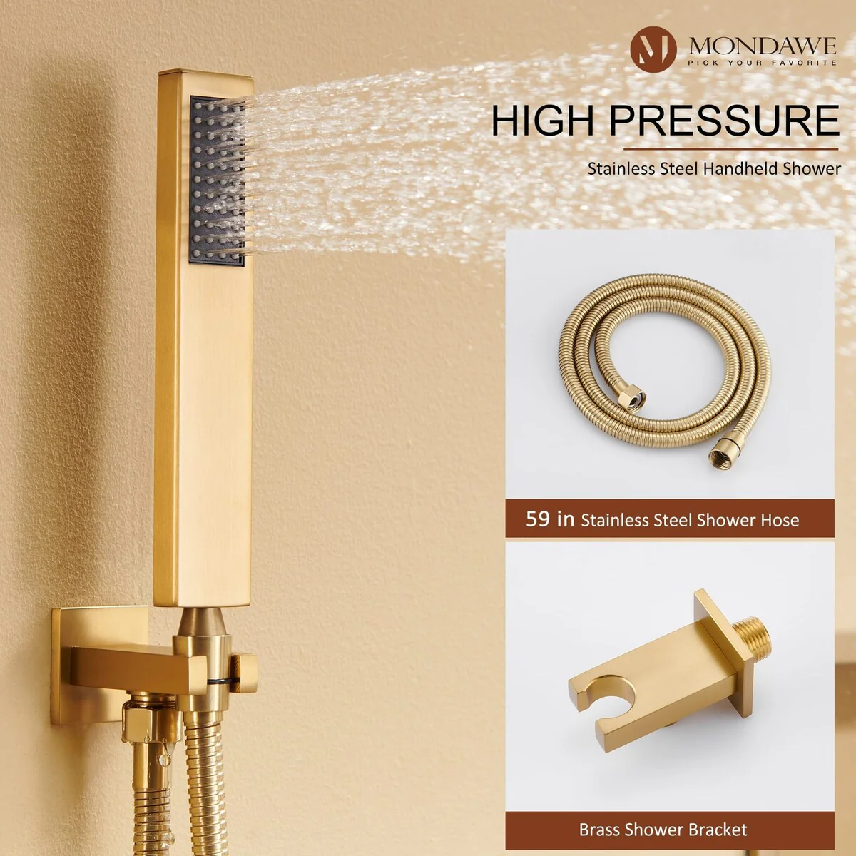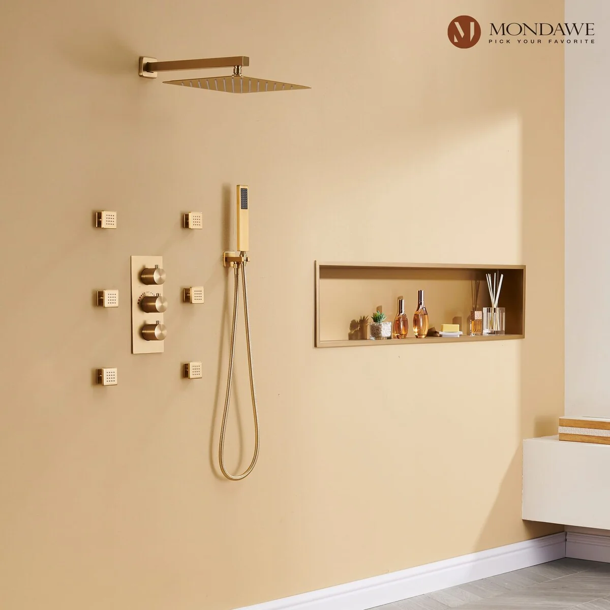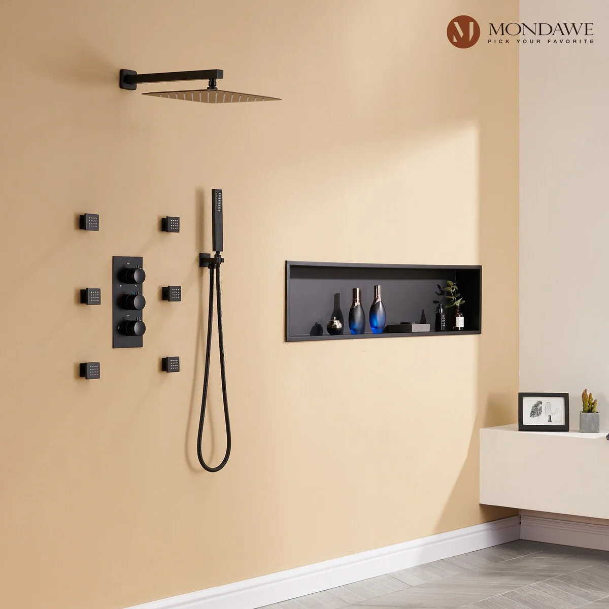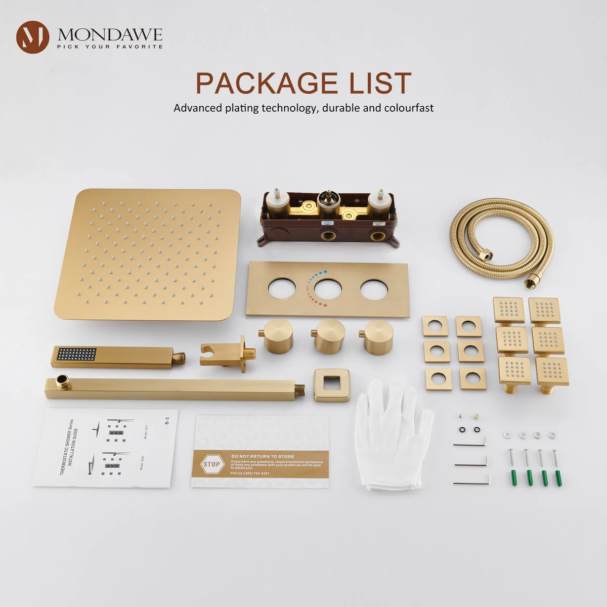 This thermostatic shower system is made of solid brass and stainless steel, with a hand shower and 6 body jets, offering you a full-body shower experience.1.All Metal Construction: 12in stainless steel shower head, stainless steel handheld shower and 6 brass body jets2.Anti-Scald: Thermostatic copper valve offers water at the desired temperature and keeps it constant without fluctuations to prevent scalding3.3 Functions: The shower head and body jet can discharge water at the same time4.Built To Last: Advanced plating technology, durable and colourfast5.Standard US 1/2'' NPT Connection: The connectors are standard NPT 1/2'' tapered threads, compatible with most existing shower systems6.
