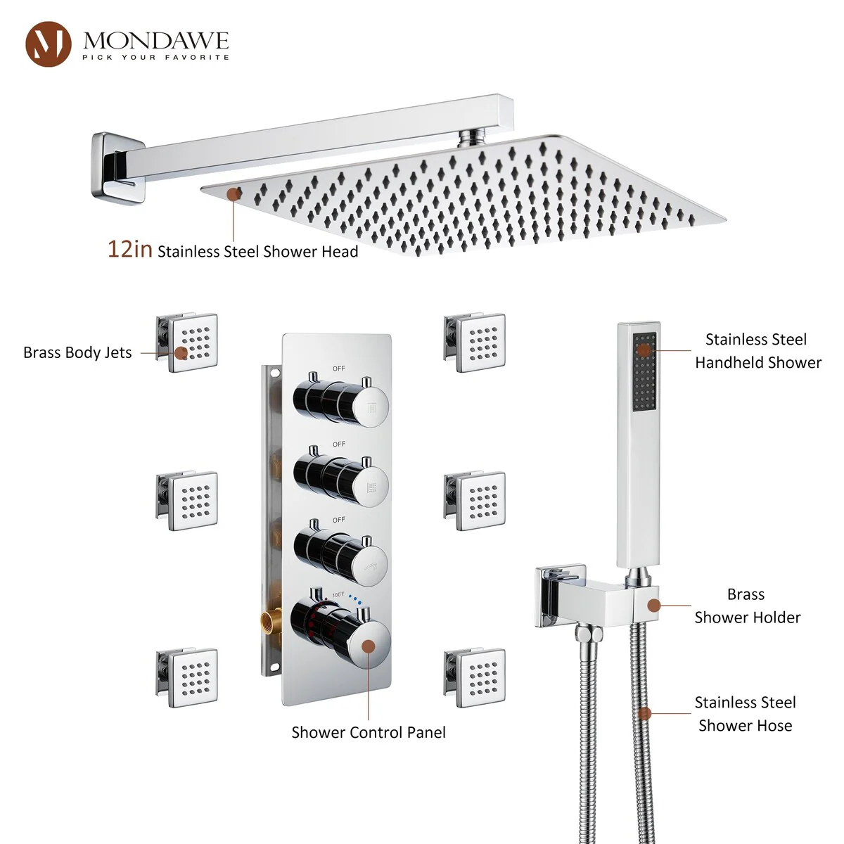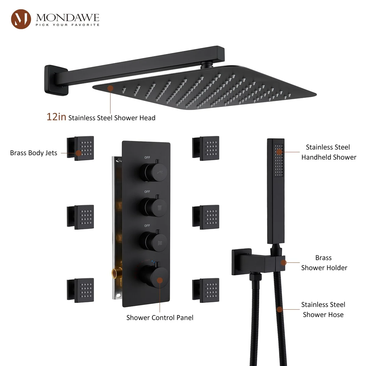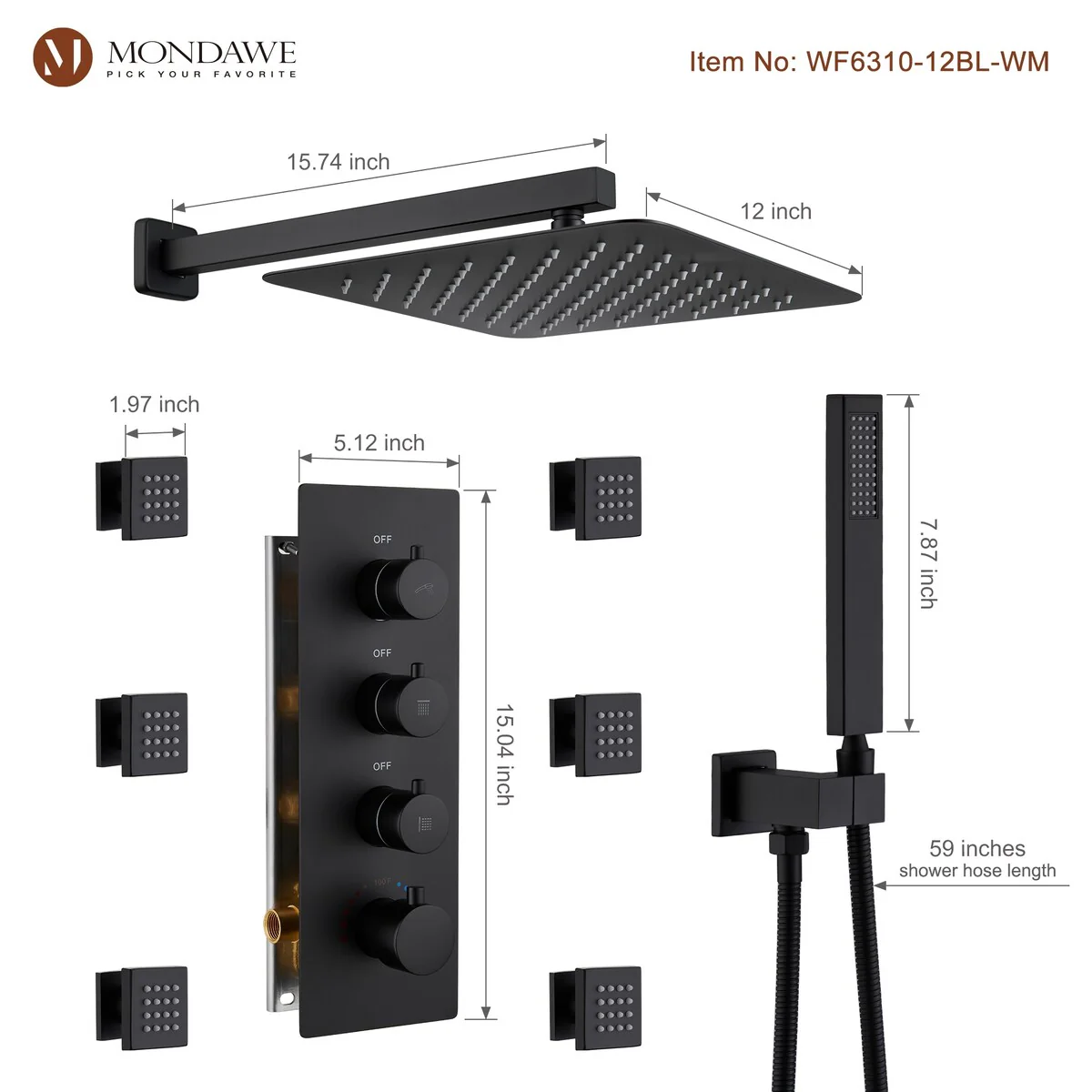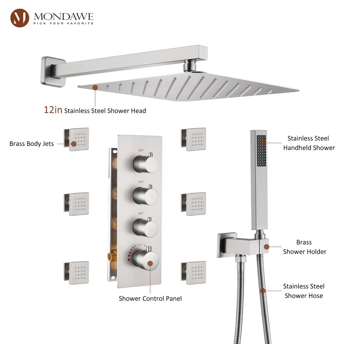 - All Metal Construction: 12-inch stainless steel shower head, stainless steel handheld shower, and 6 brass body jets for durability and elegance.