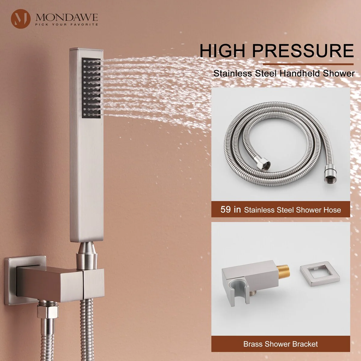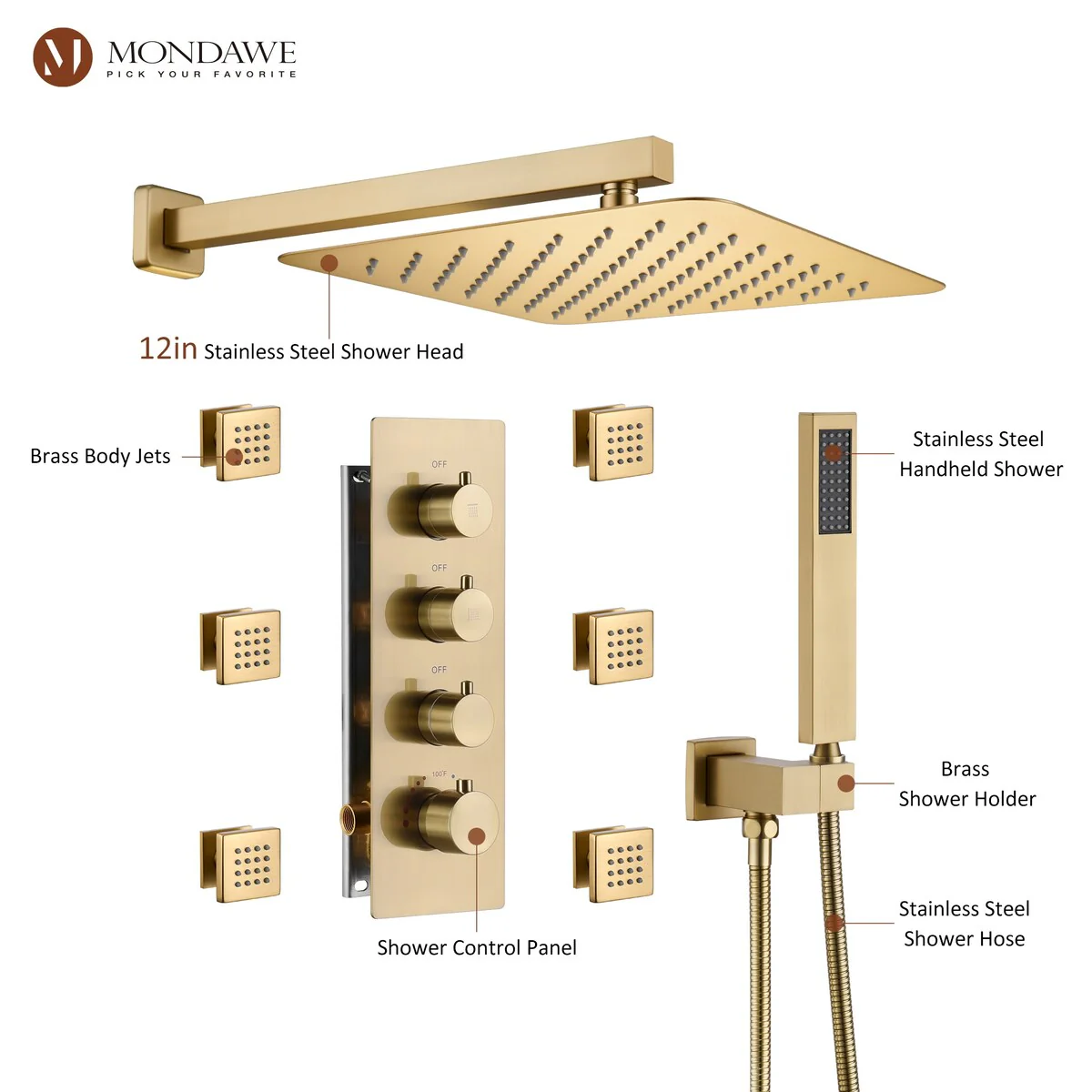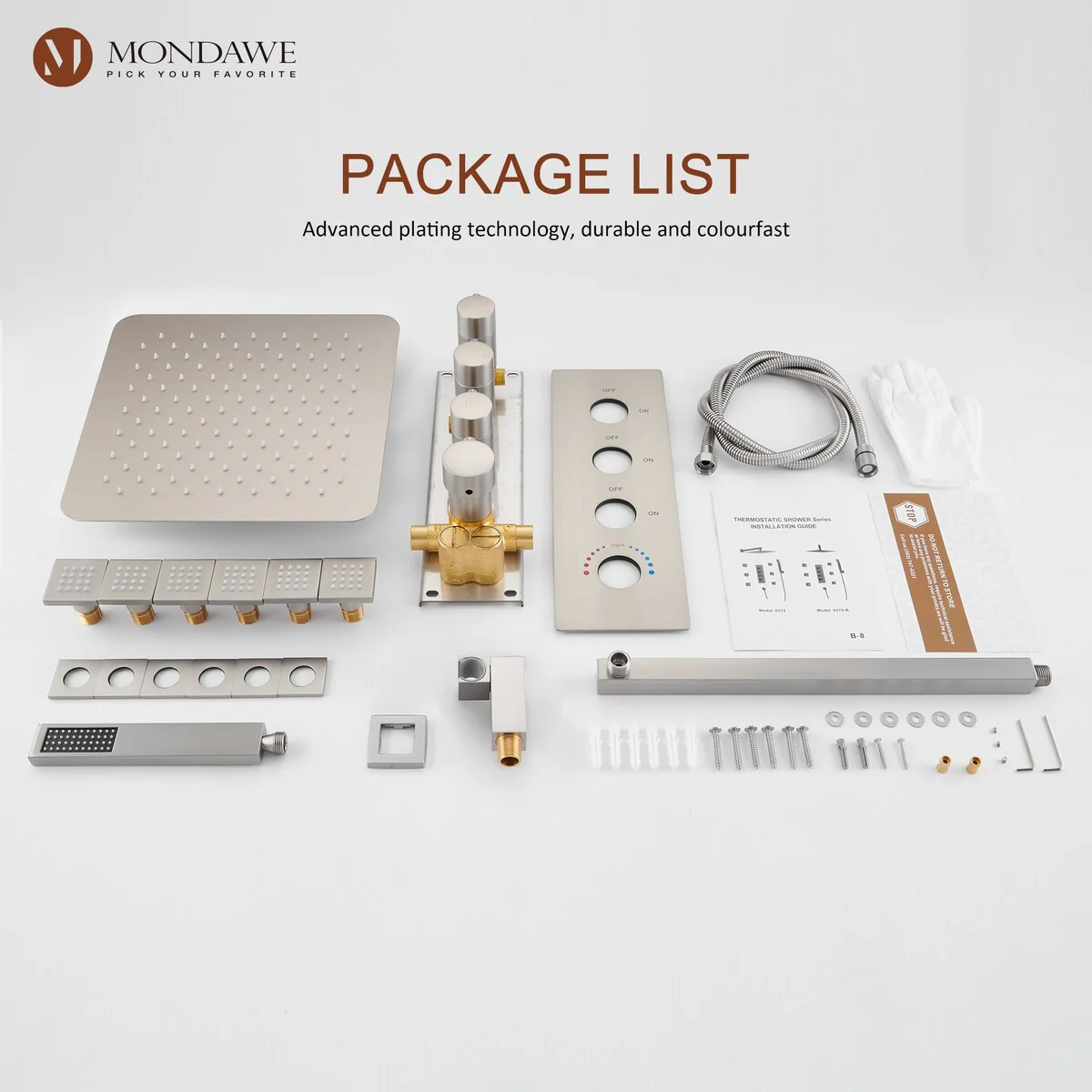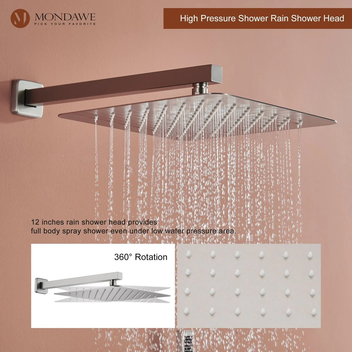 - All Metal Construction: 12-inch stainless steel shower head, stainless steel handheld shower, and 6 brass body jets for durability and elegance.