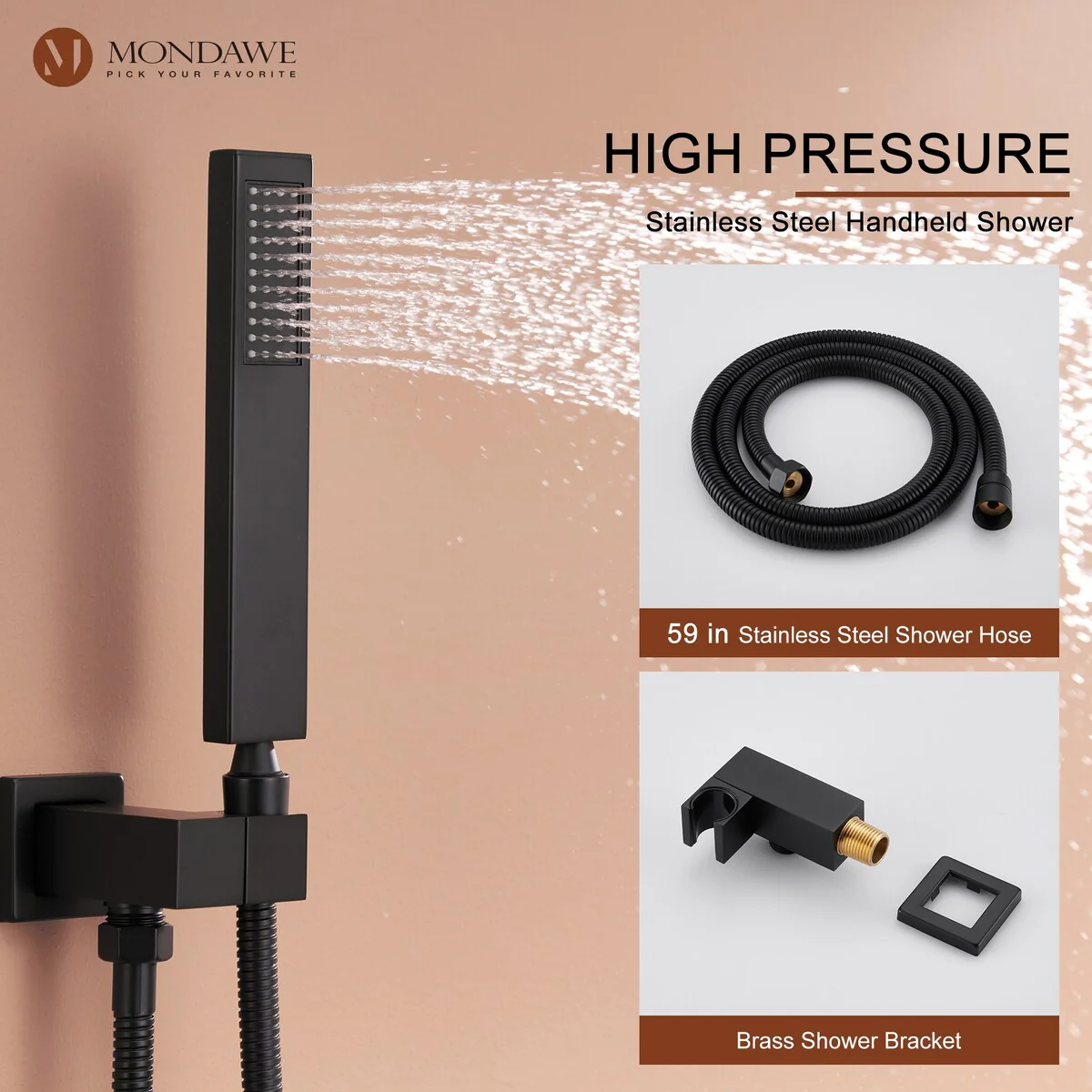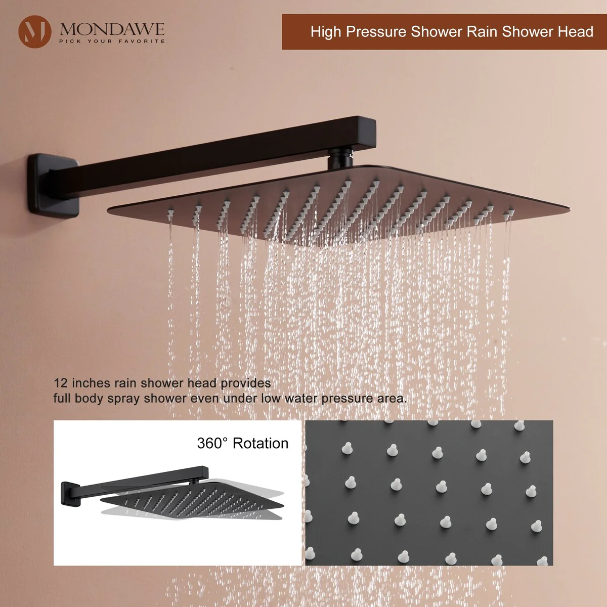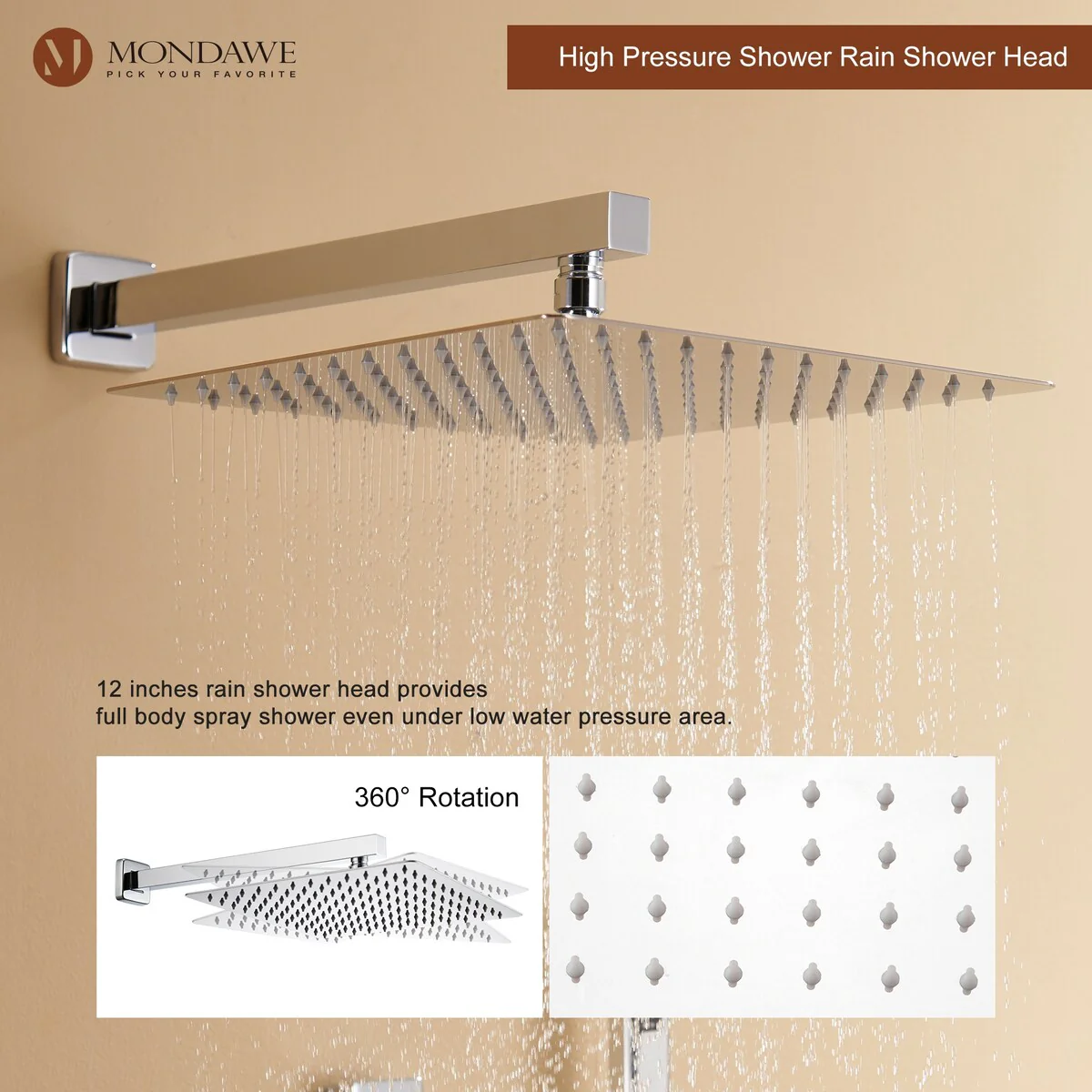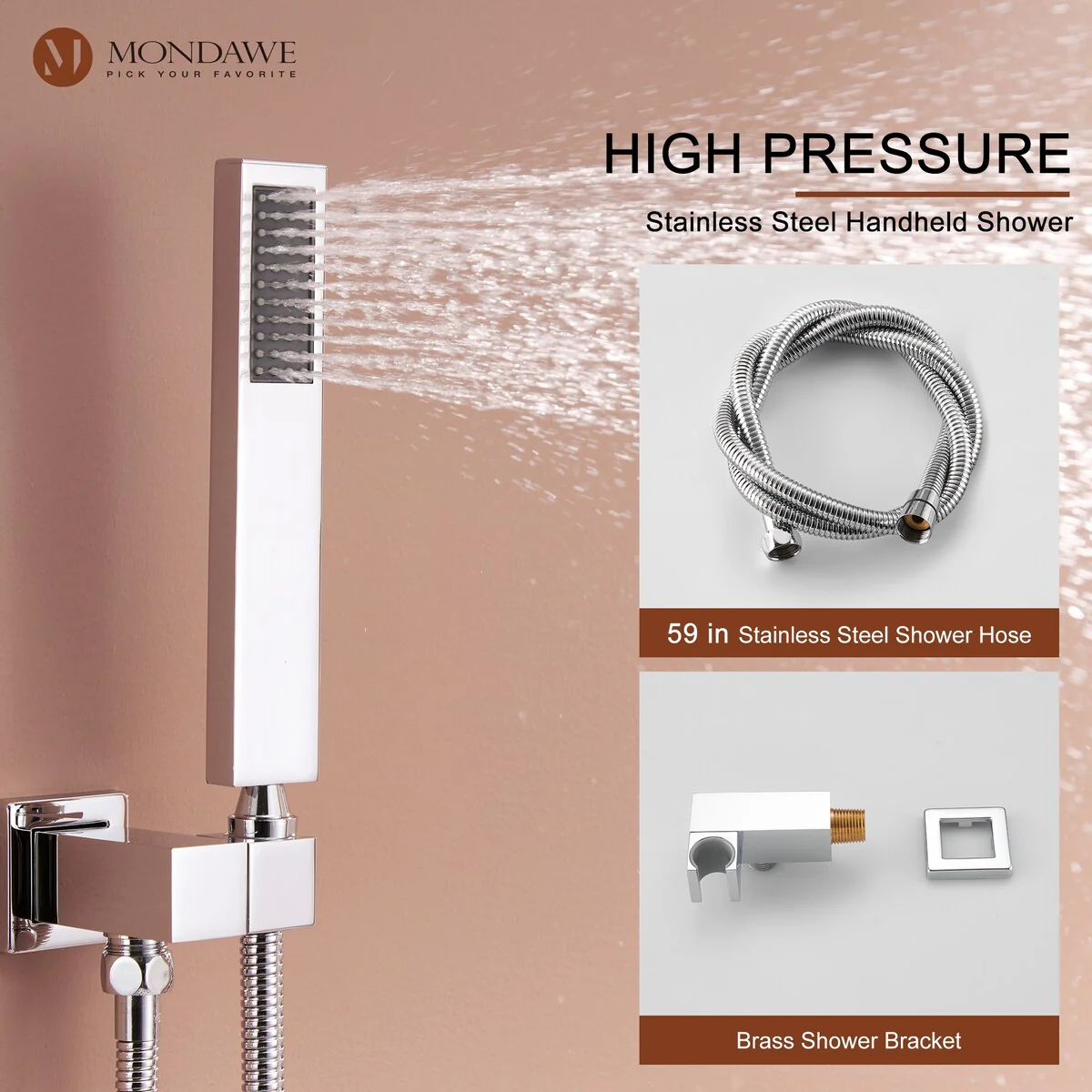 - All Metal Construction: 12-inch stainless steel shower head, stainless steel handheld shower, and 6 brass body jets for durability and elegance.
