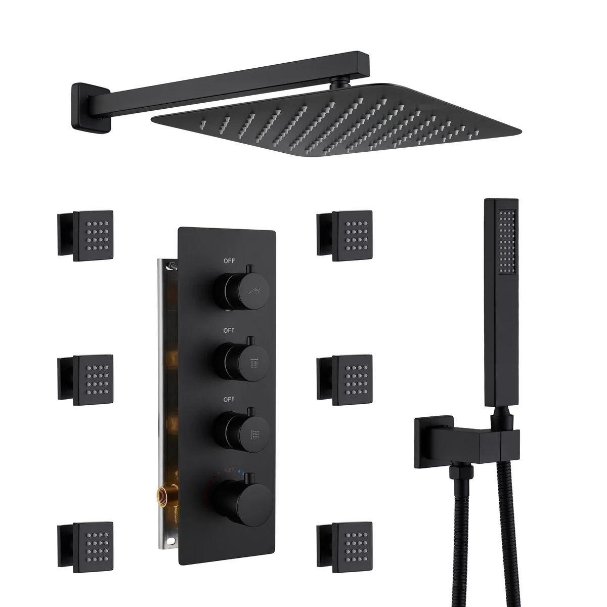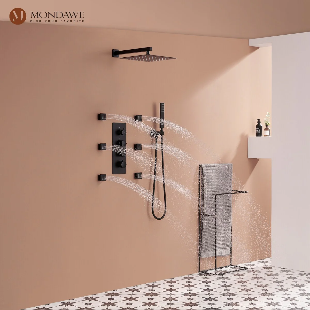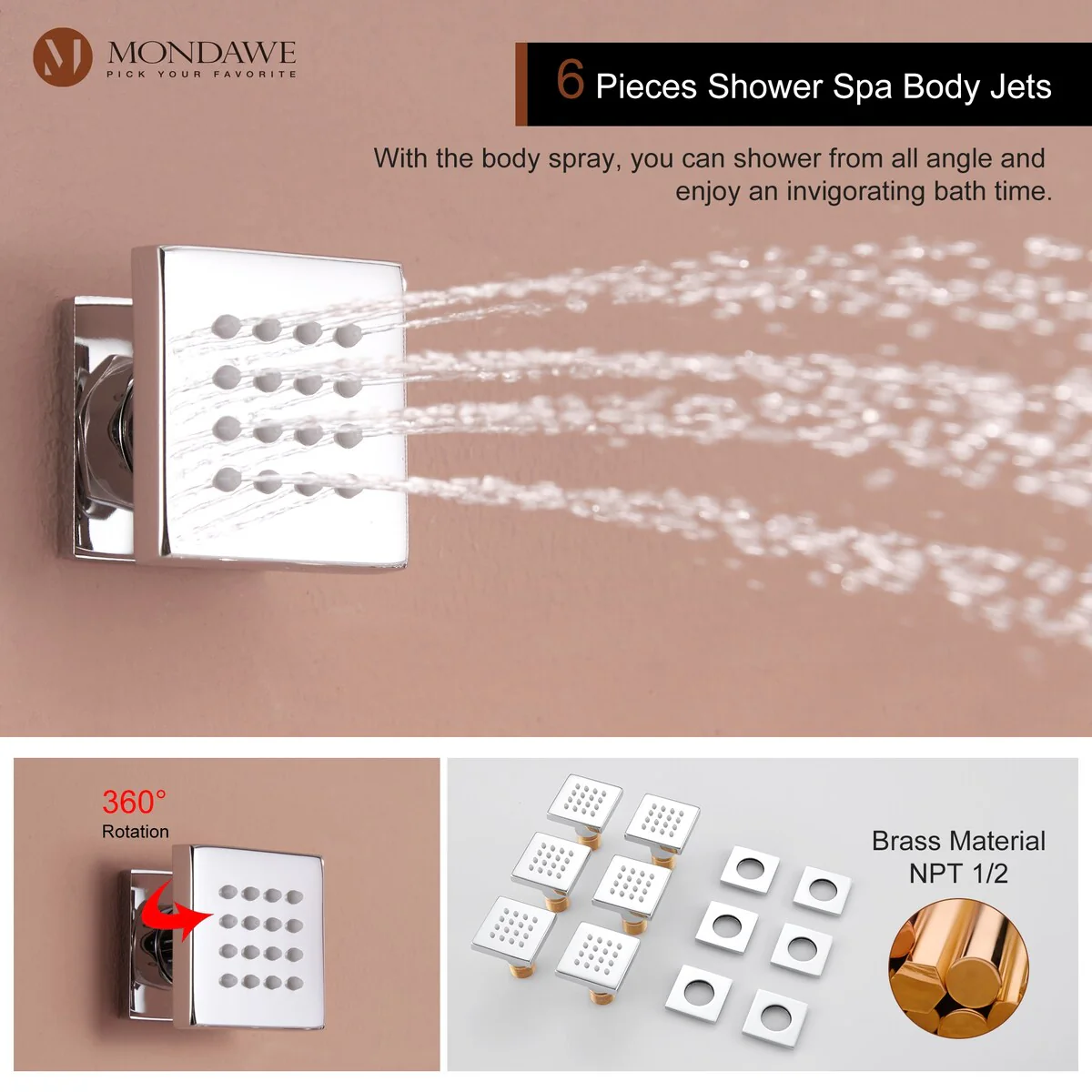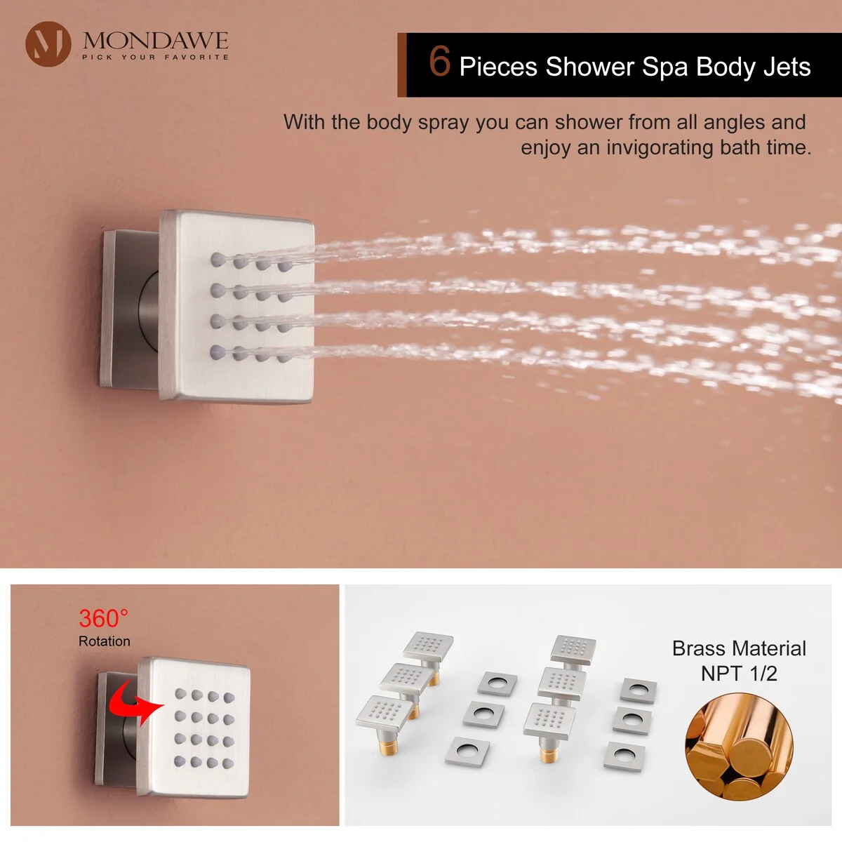 Enhance your shower experience with our premium Thermostatic Shower System. This system is designed to provide a luxurious full-body shower experience with a hand shower and 6 body jets. Crafted from solid brass and stainless steel, it ensures durability and long-lasting performance.