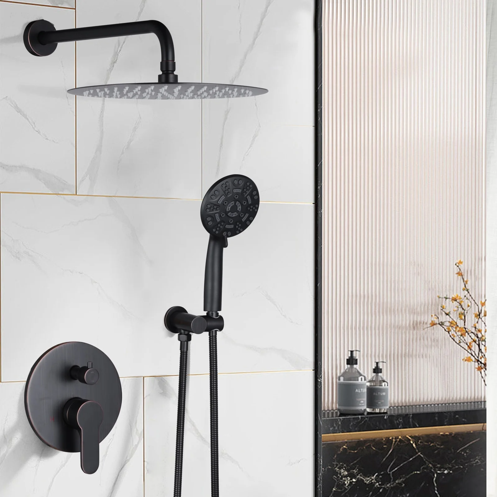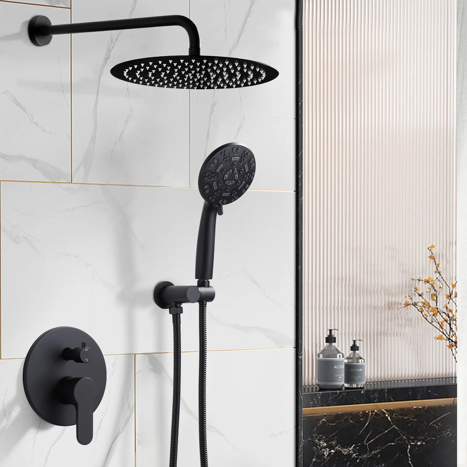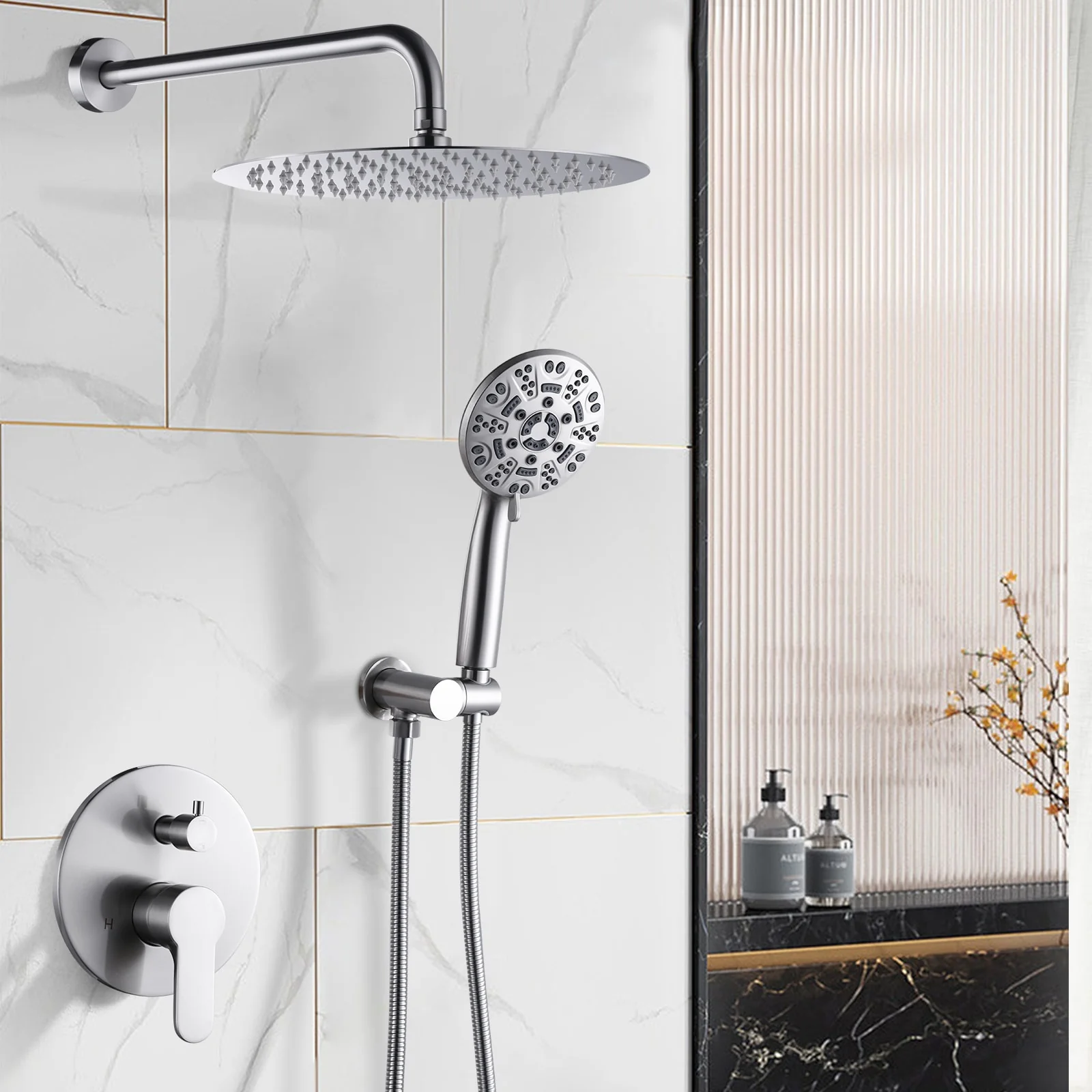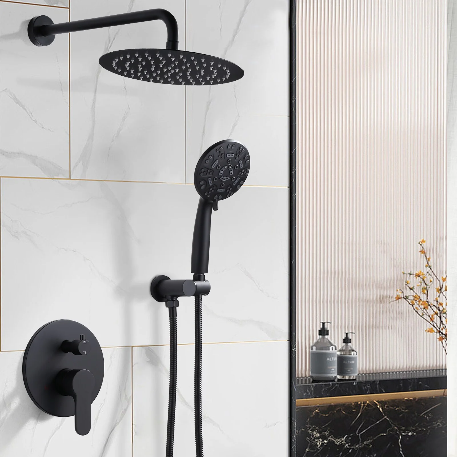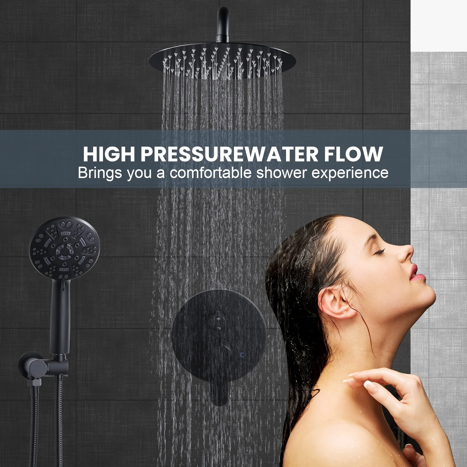 This shower set includes a fixed showerhead (10 inches or 12 inches) and a 4.5-inch handheld shower with multiple spray modes. It features a wall-mounted installation, allowing the water to cascade down elegantly, enhancing the luxurious feel of your shower experience.