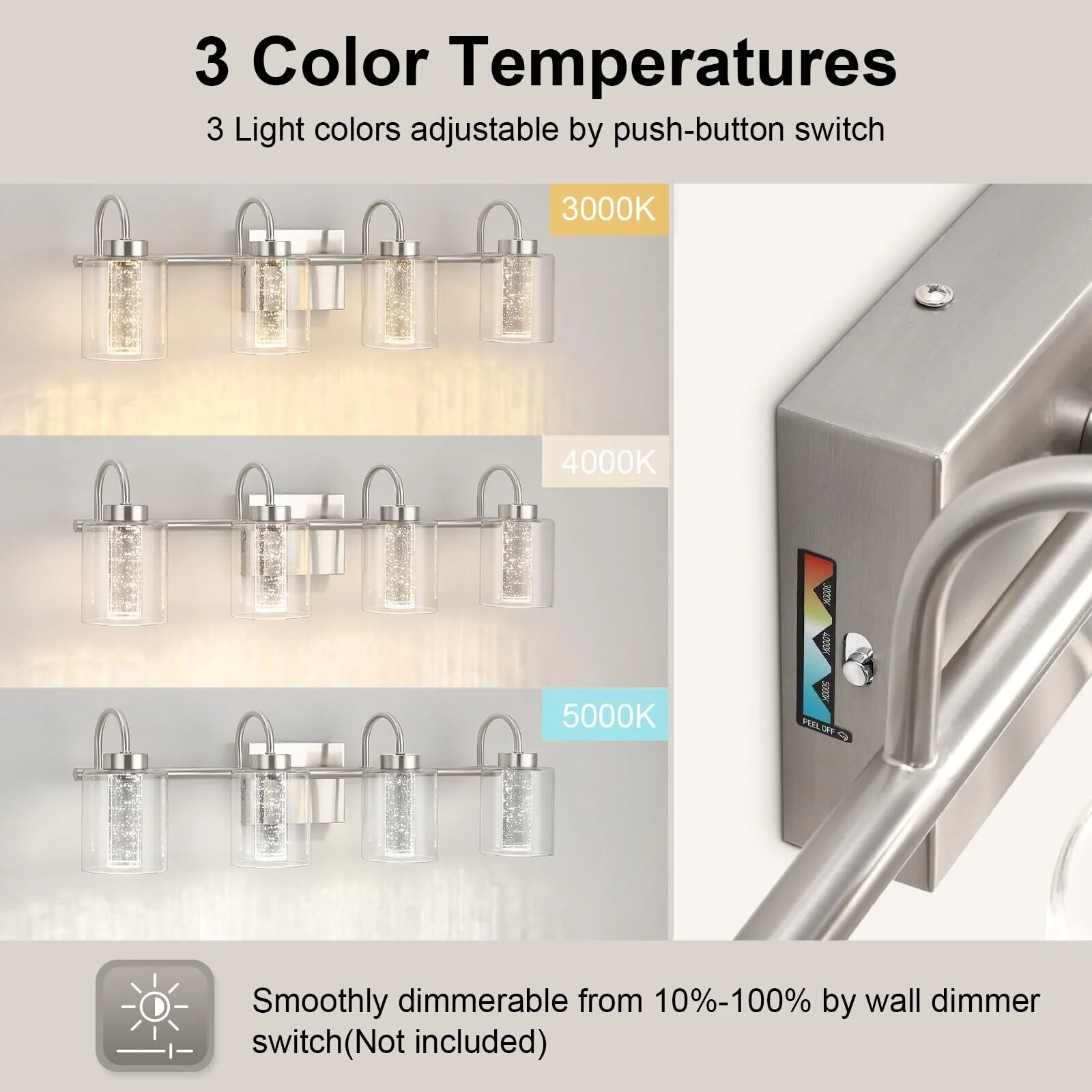 Dimmable 3 Color Temperatures: The LED bathroom light over mirror integrated LED light, no bulb required; 3 Color Temperatures for your choice: cool white/natural white/warm white (5000k, 4000k, 3000k); the vanity light also can be dimmable with wall dimmer. Note: Dimmer switch is not included.