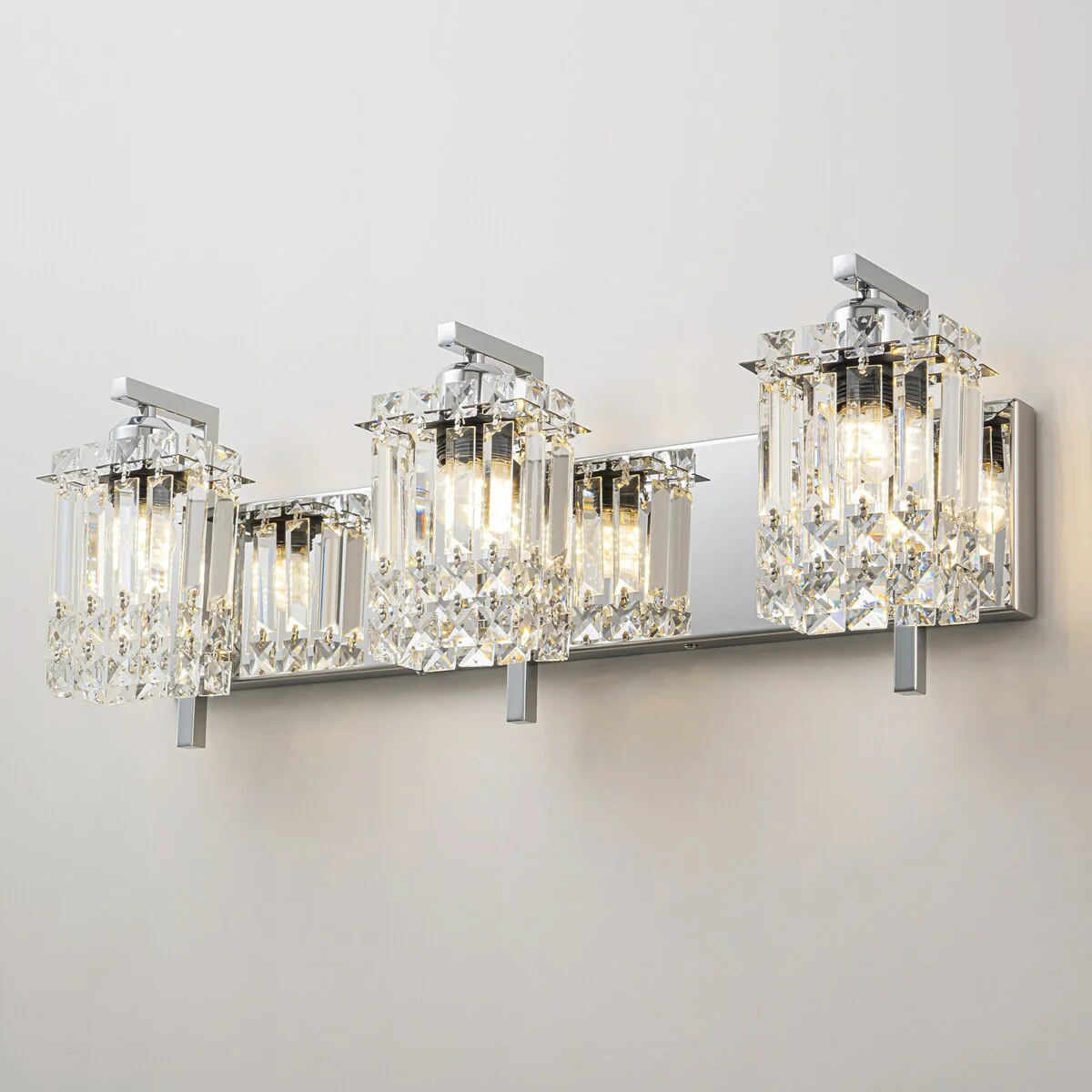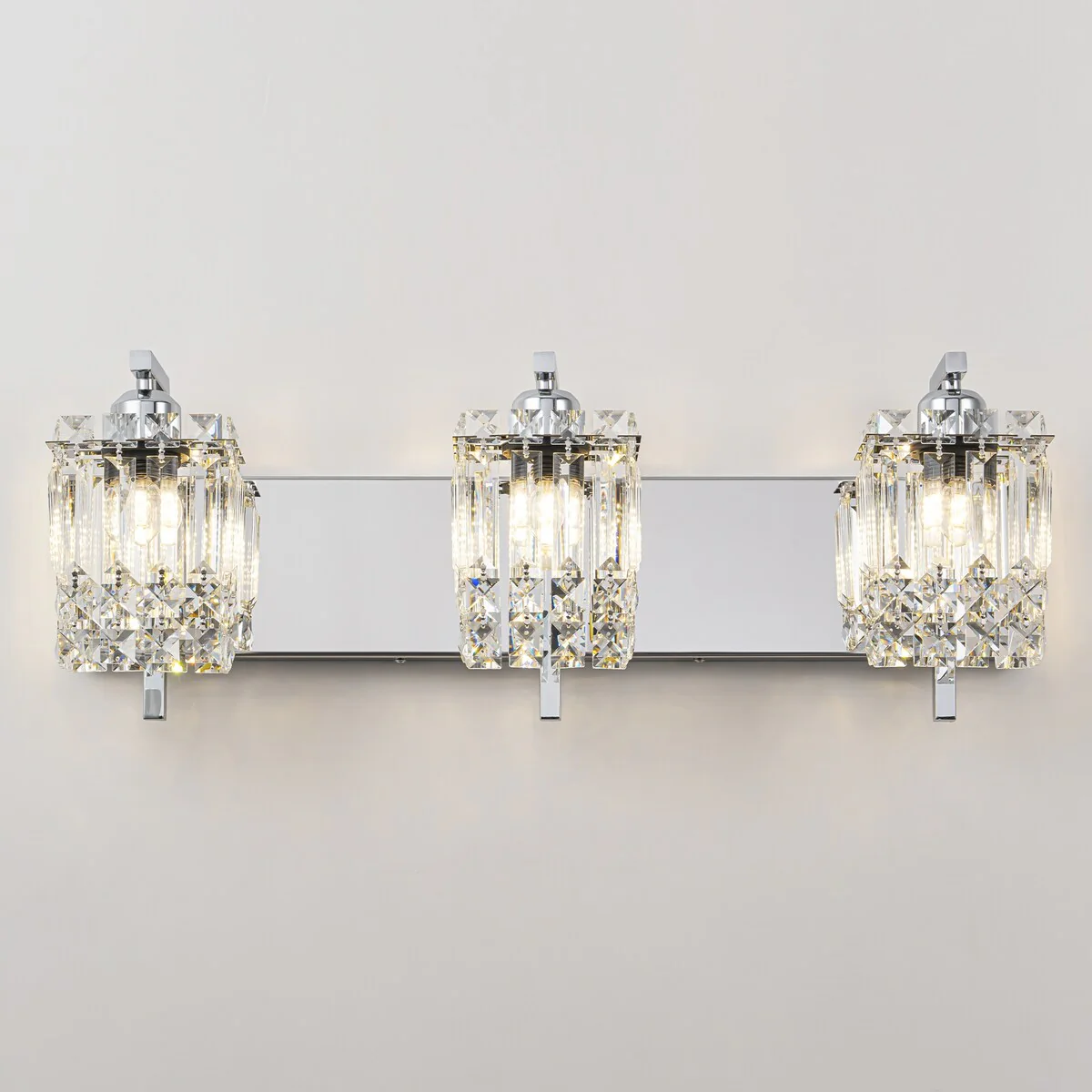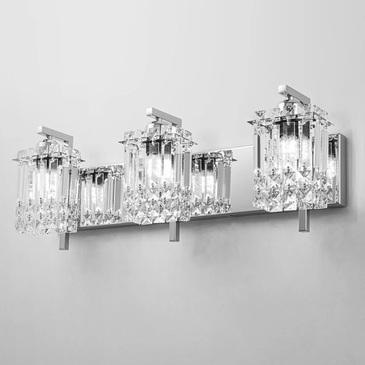 This 3-light contemporary luxury crystal string bathroom vanity light showcases a square backplate and stunning crystal shade with precision cutting, promising to elevate the opulence and refinement of your room's aesthetic. Its sturdy metal arms and meticulously polished crystals ensure enduring durability and timeless allure. Each crystal shade conceals a charming spectrum of rainbow hues, captivating the eye even in natural daylight and serving as a captivating focal point for your bathroom or dressing area mirror. Install this bathroom lighting fixtures over mirror in your bathroom for more illumination.