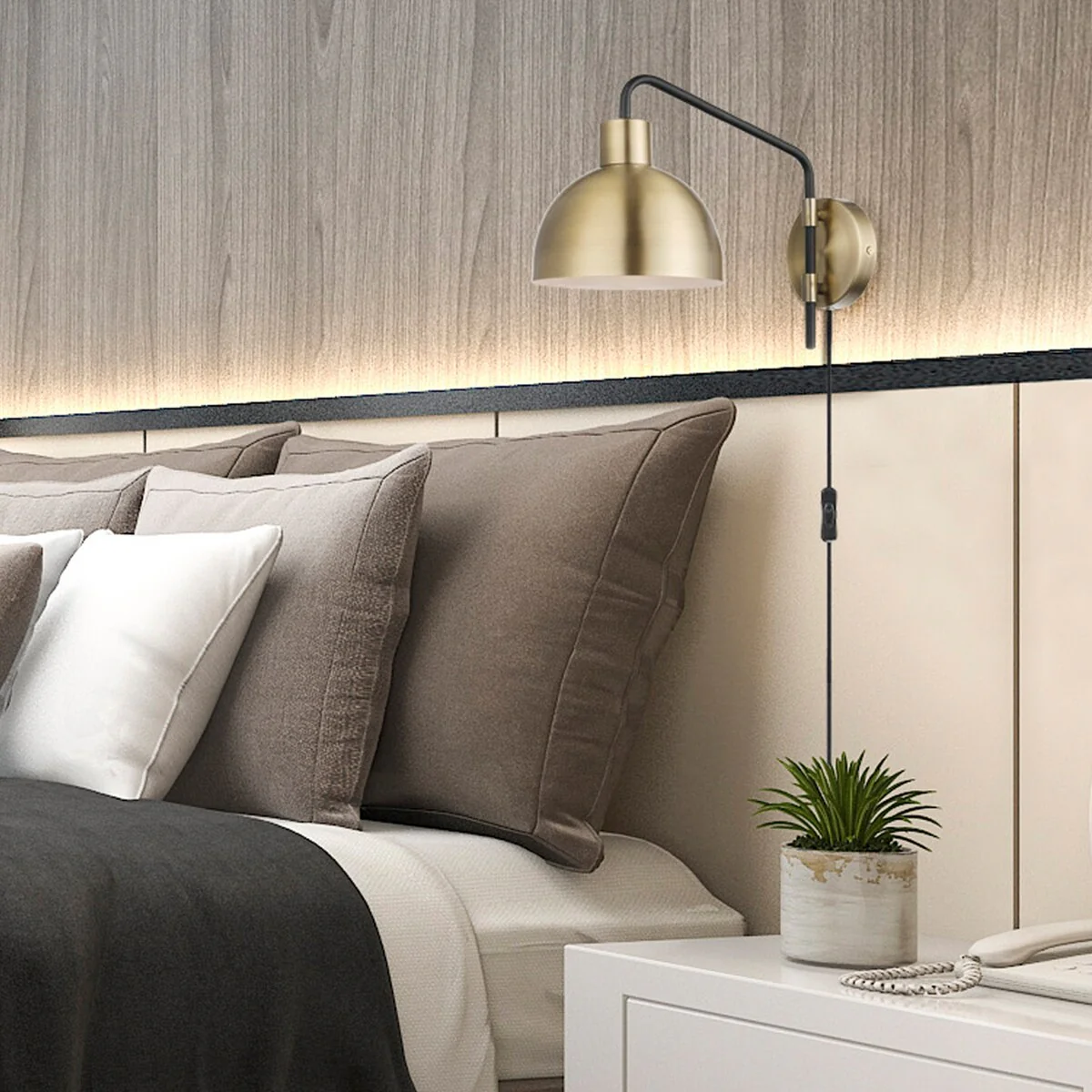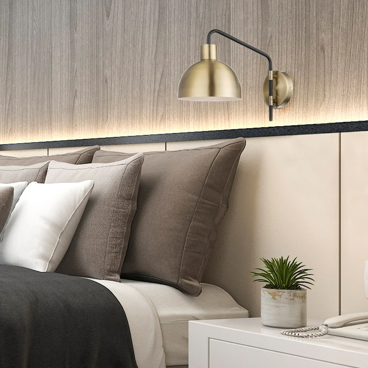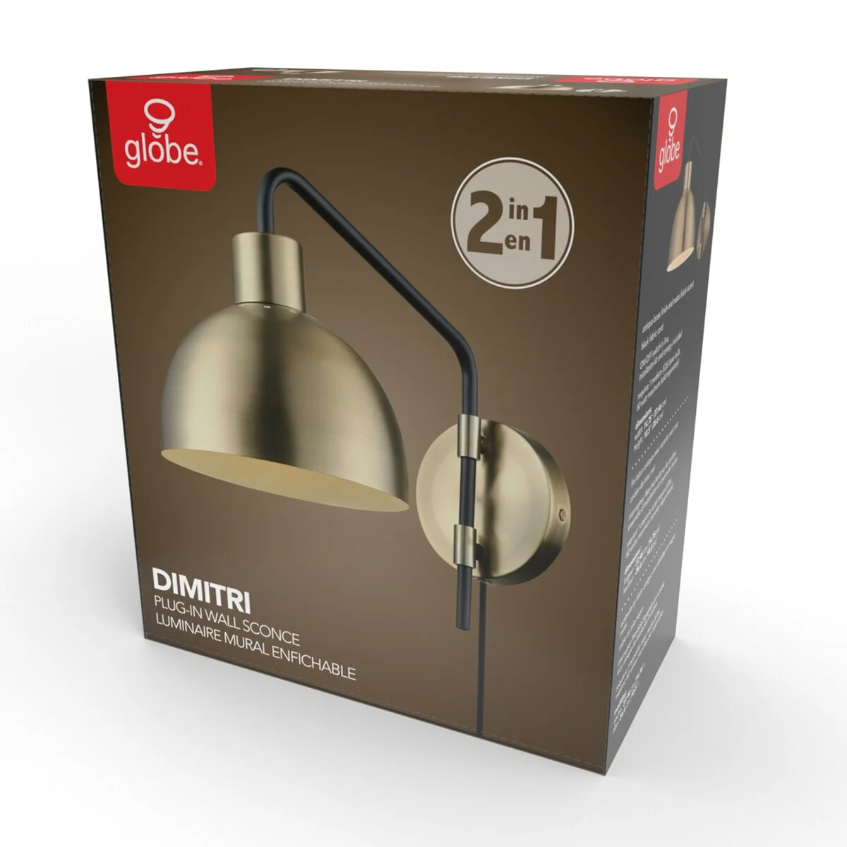 Add vintage industrial charm to any room with the Globe Electric Dimitri 1-Light Antique Brass Plug-In or Hardwire Wall Sconce. The sculptural arm and bowl shade, finished in antique brass, create a striking vintage aesthetic. Use with a vintage filament bulb to complete the look or modernize with a Smart bulb for easy control. The innovative 2-in-1 design allows for plug-in or hardwire installation, and the six-foot cord provides versatility in placement. Includes all mounting hardware for easy installation.