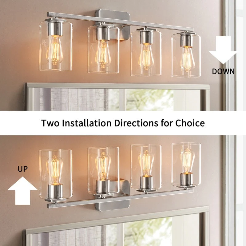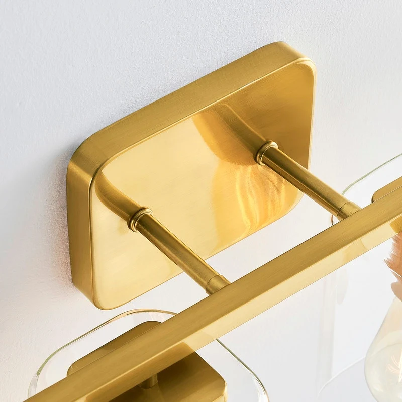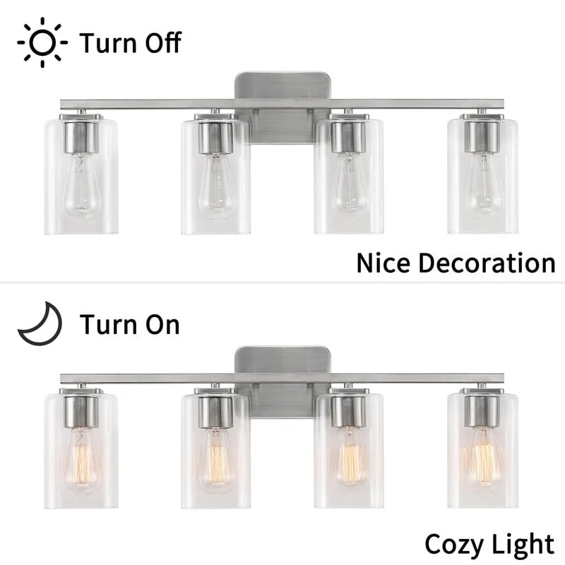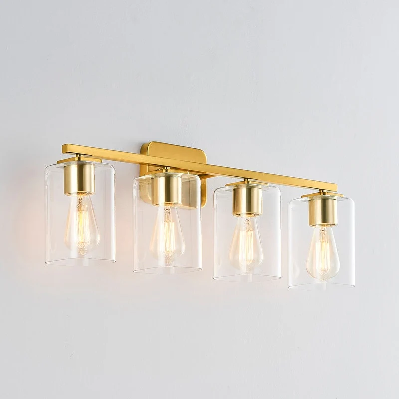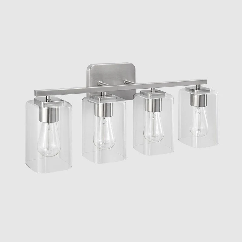 Featuring rectangular glass shades, this 4-light vanity light brightens up your bathroom and provides proper task lighting. The square backplate and arms match the glass shades, bringing the charm of a contemporary style. It's rated for damp locations and safe to use above the mirror in the bathroom or powder room.
