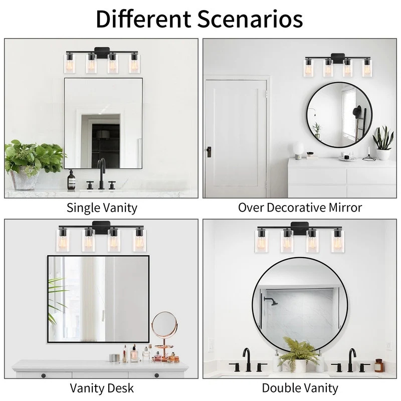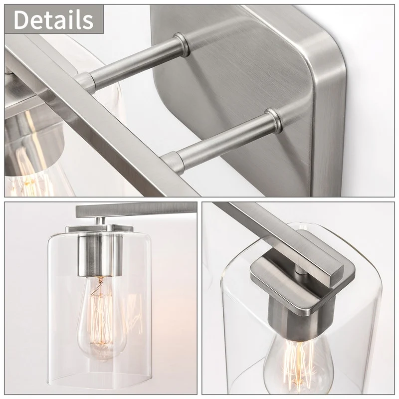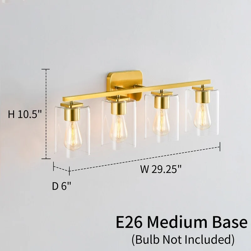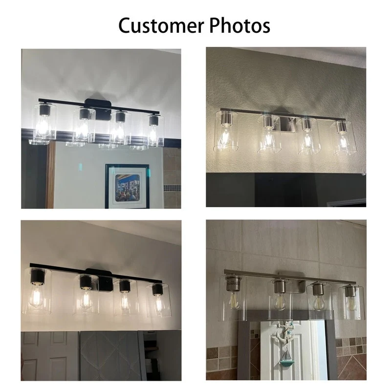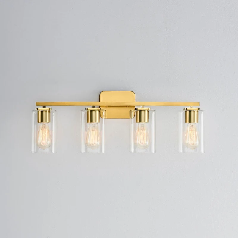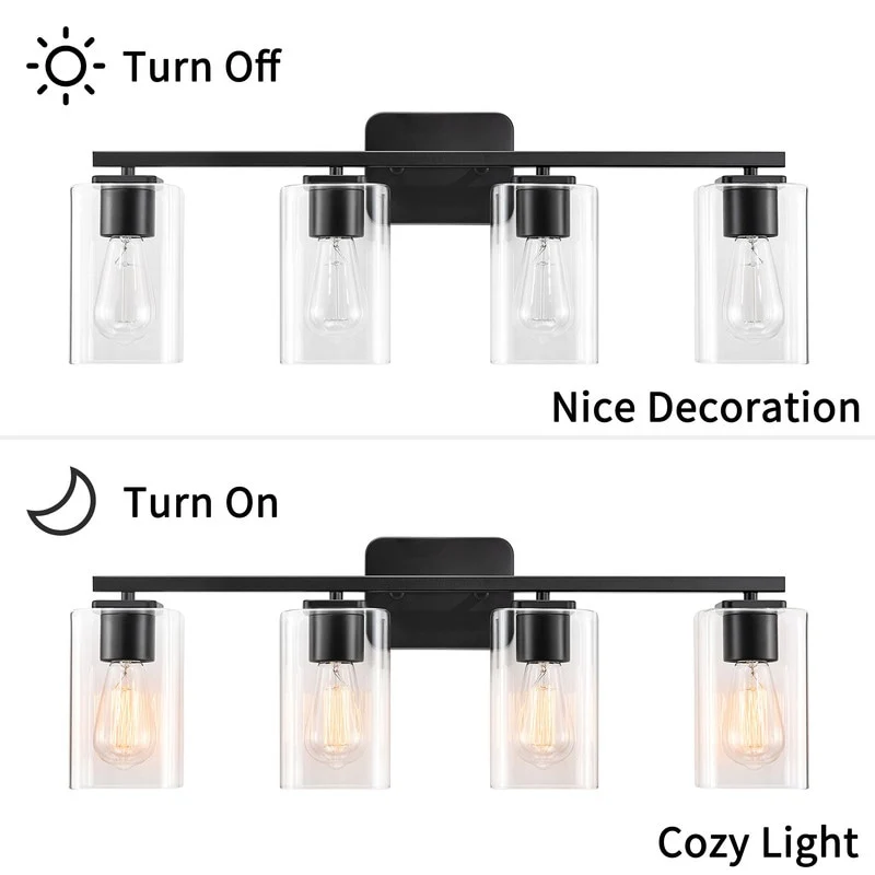 Featuring rectangular glass shades, this 4-light vanity light brightens up your bathroom and provides proper task lighting. The square backplate and arms match the glass shades, bringing the charm of a contemporary style. It's rated for damp locations and safe to use above the mirror in the bathroom or powder room.