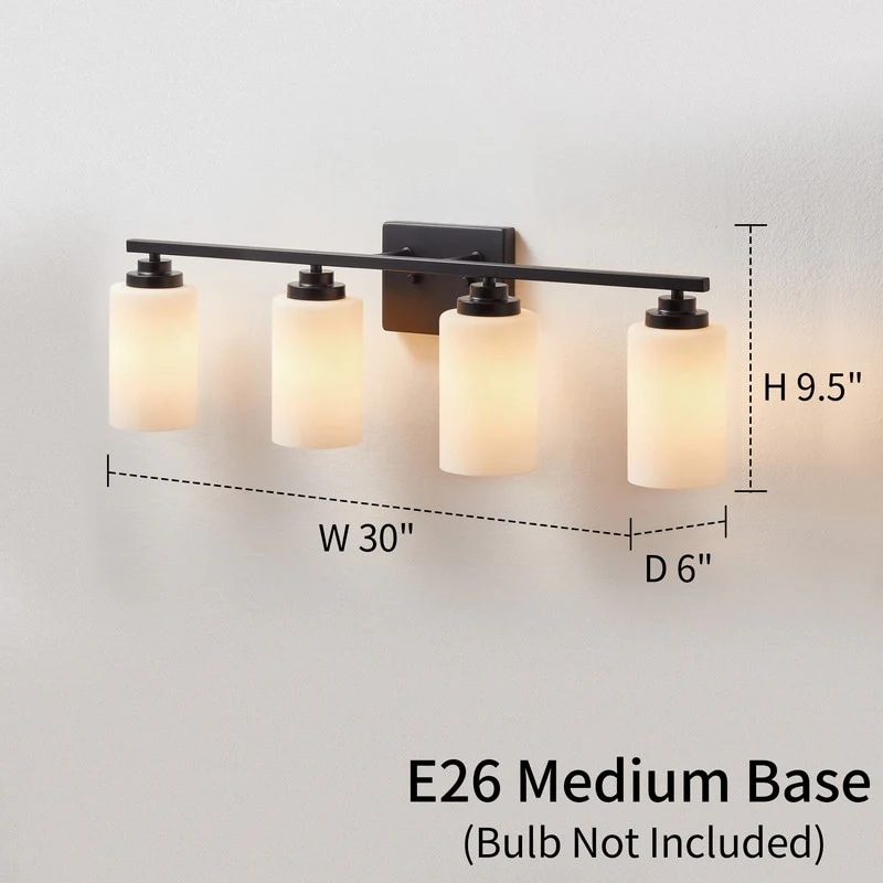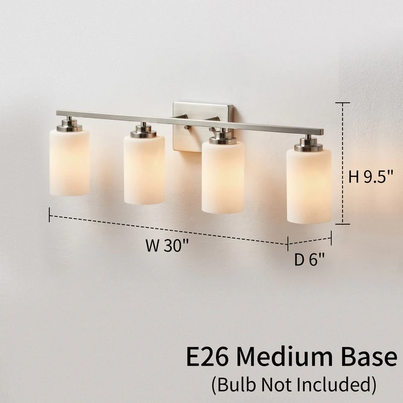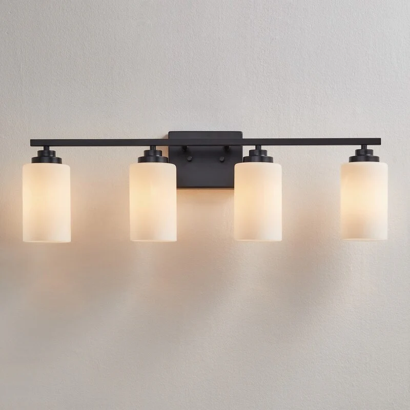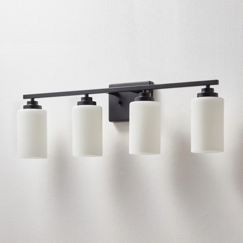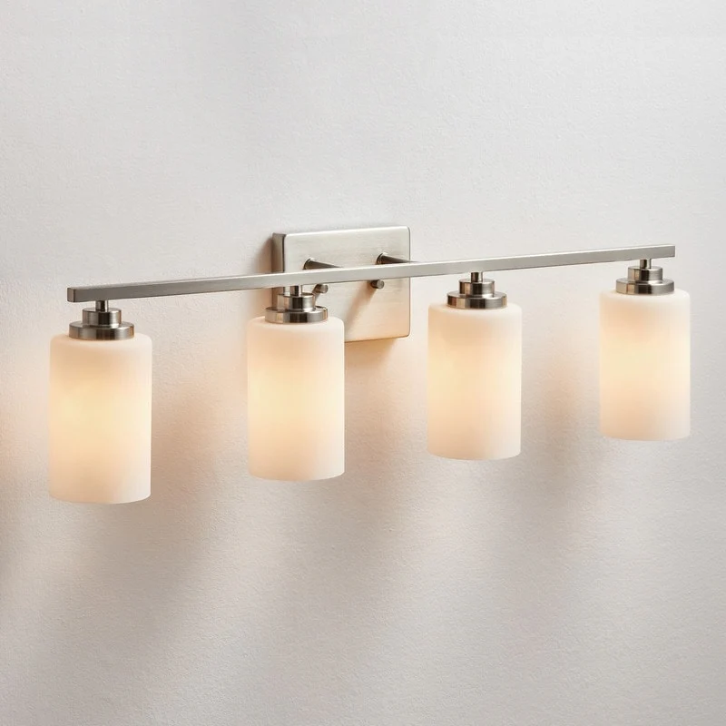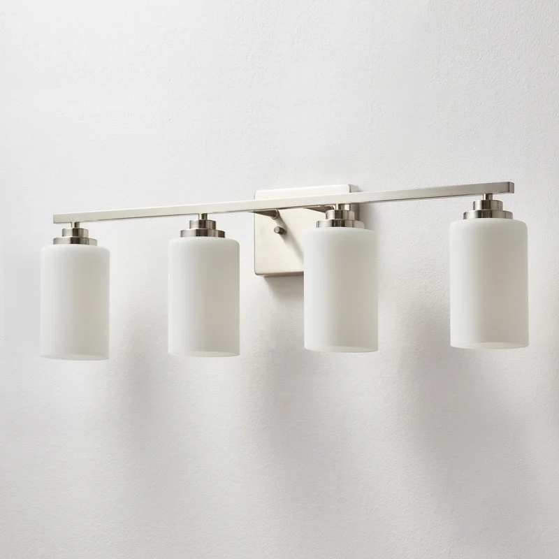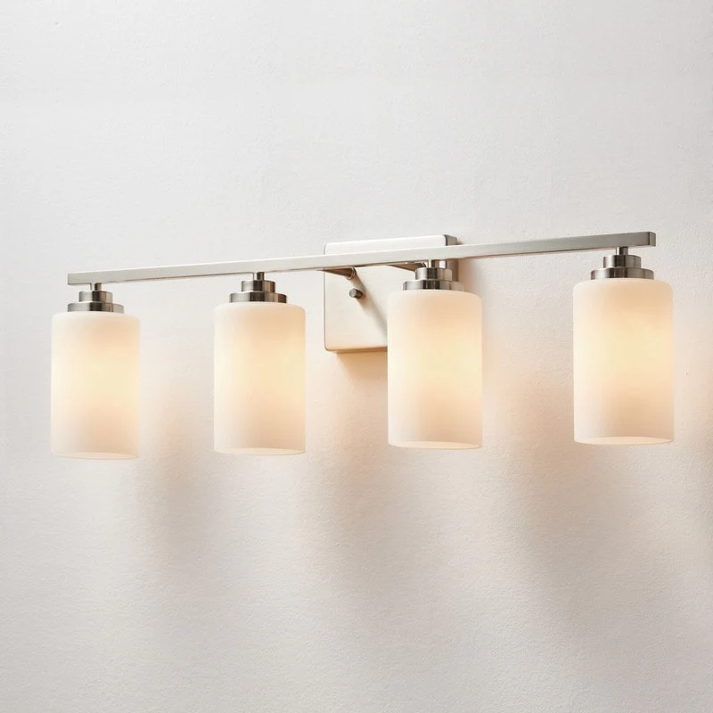 This 4-light vanity fixture will be a perfect pick for your powder room or main bathroom. Made from metal, a clean-lined backplate and vertical arm bring a simple and sleek style to your room. The arm holds four cylindrical frosted white glass shades that disperse ambient light all around your space from four 60W bulbs (not included). It's compatible with a dimmer switch, allowing you to adjust the lighting level to suit your sleepy eyes in the mornings.