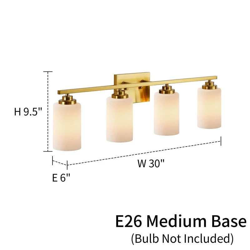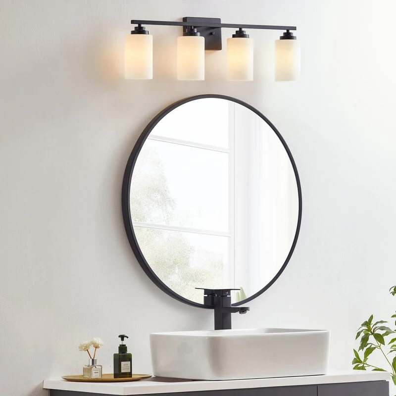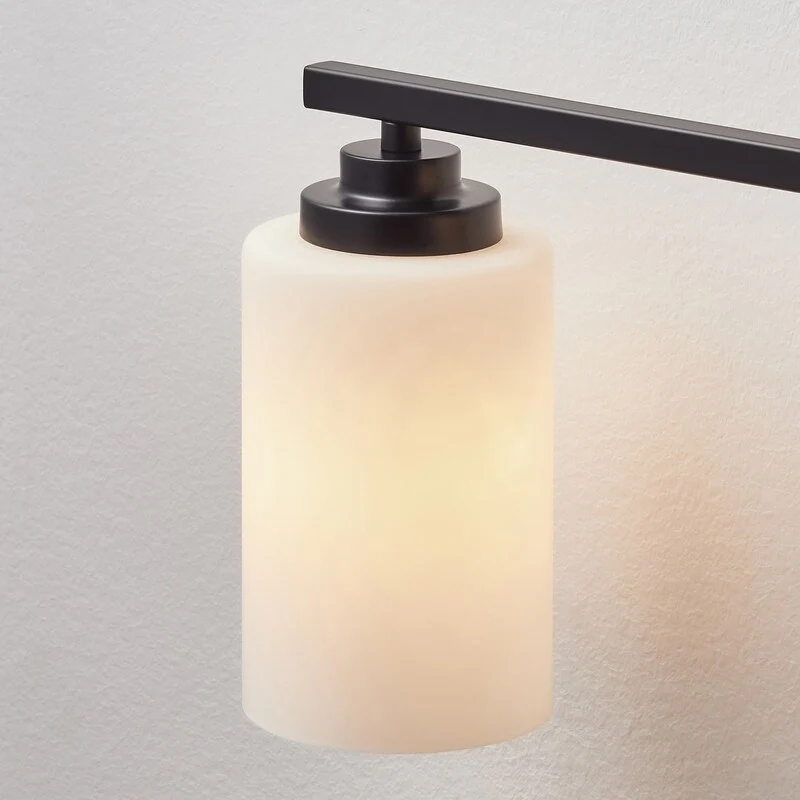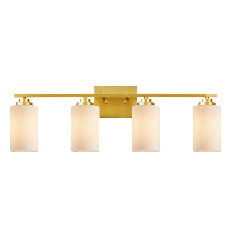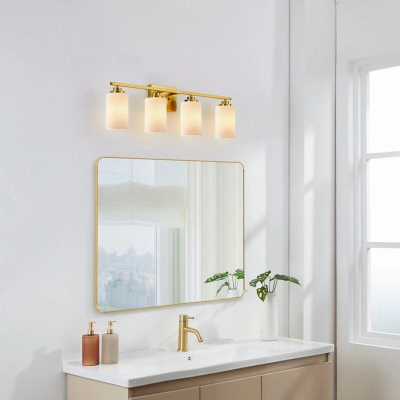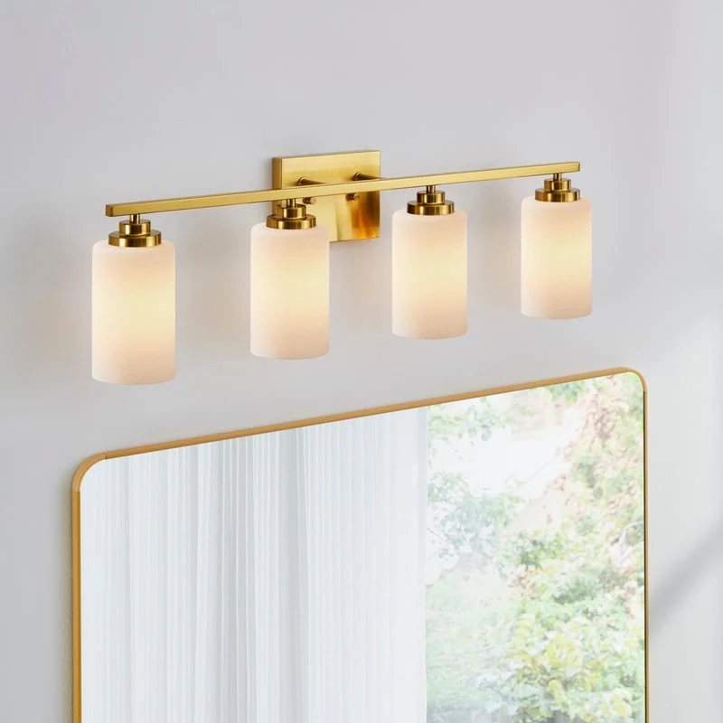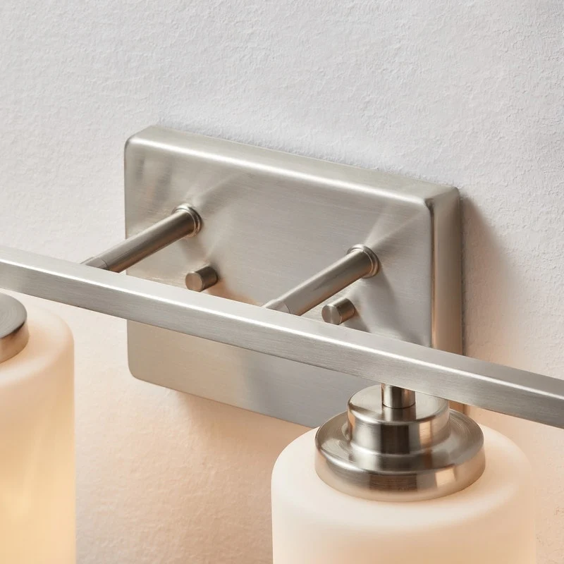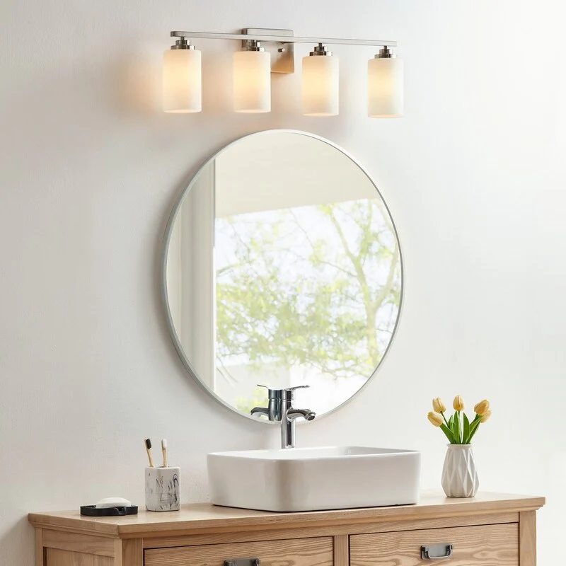 This 4-light vanity fixture will be a perfect pick for your powder room or main bathroom. Made from metal, a clean-lined backplate and vertical arm bring a simple and sleek style to your room. The arm holds four cylindrical frosted white glass shades that disperse ambient light all around your space from four 60W bulbs (not included). It's compatible with a dimmer switch, allowing you to adjust the lighting level to suit your sleepy eyes in the mornings.