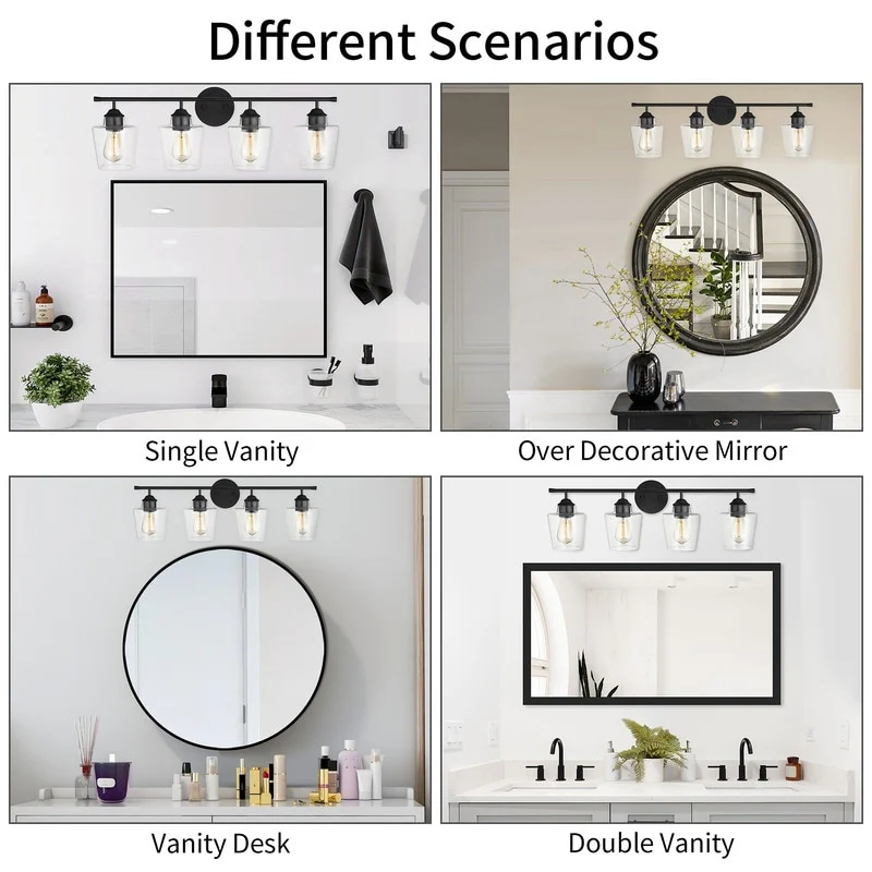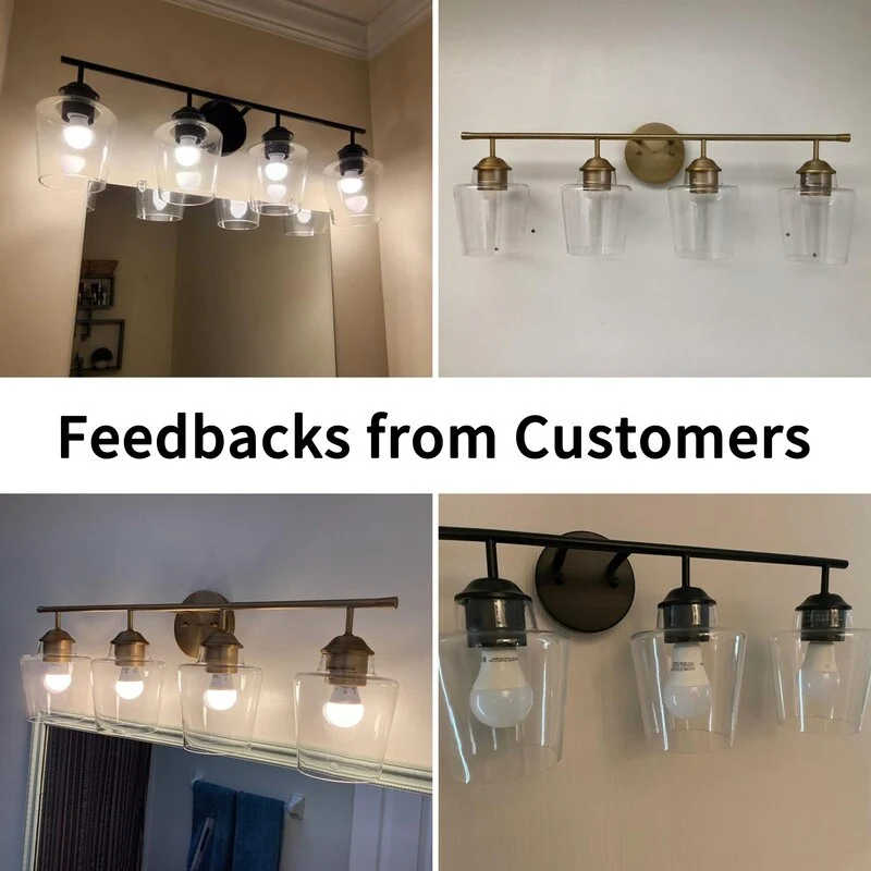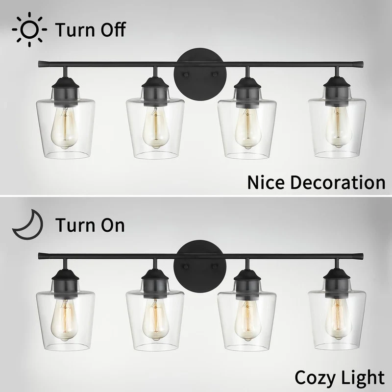 Featuring four clear hand-blown glass shades in a goblet shape, this vanity light is mounted on a sturdy iron frame. Finish in a choice of black, antique brass, and brushed nickel provides options for different styles of décor. Its sockets are compatible with a dimmer switch, allowing you to adjust the brightness to your preference. This versatile fixture can be mounted facing upwards or downwards.