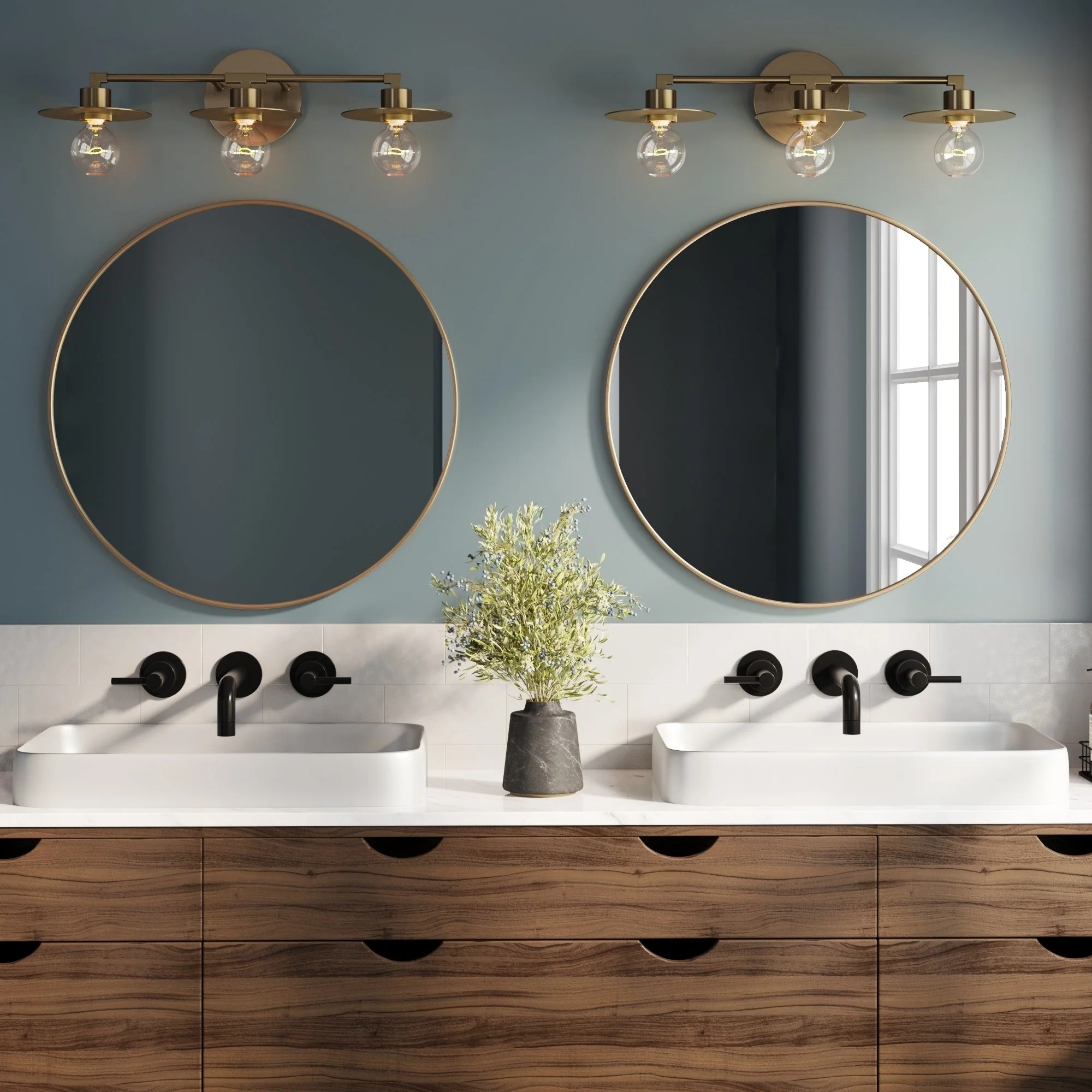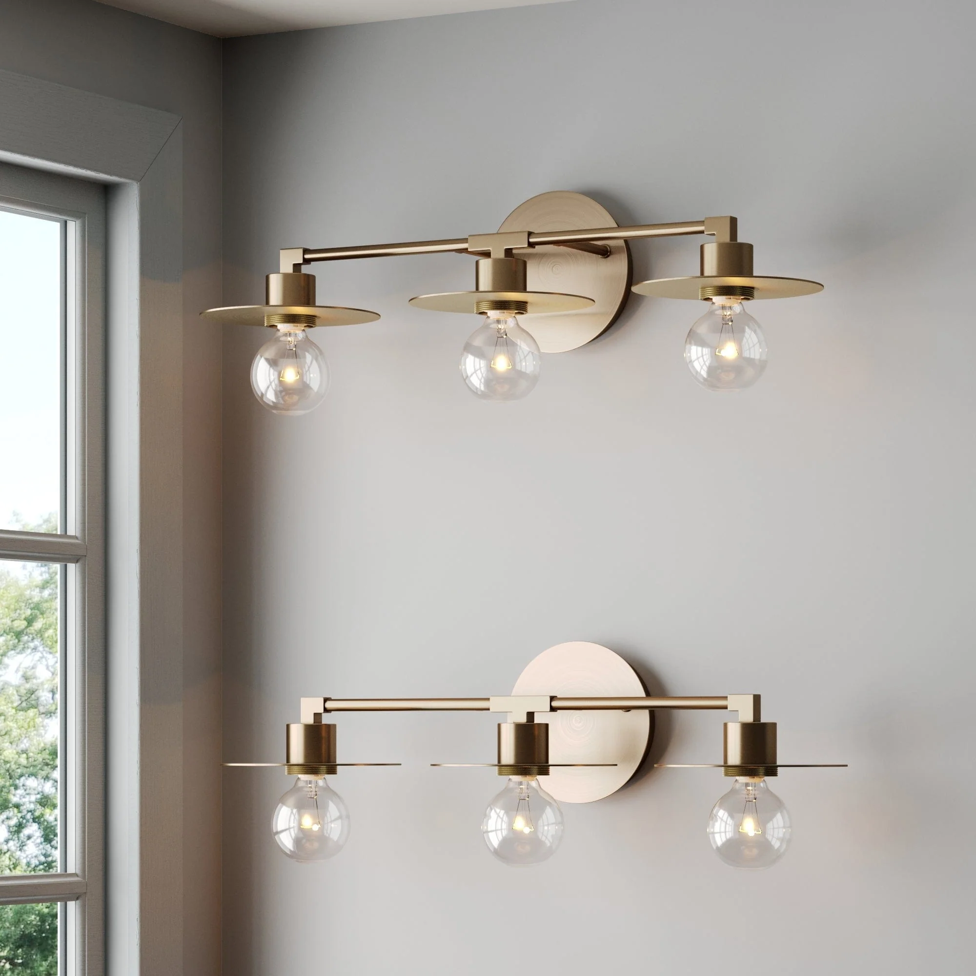 The Pattinson bathroom light fixture is a mid-century modern 3-light vanity light with three bulb capacity ensures you'll have plenty of light to brighten up any space—above a mirror in your bathroom, over a gallery wall in your living room, even above a window in your kitchen. Thin plate shades in a vintaged brass finish allow you to show off the designer bulbs of your choice (not included). Plus, our vanity lights are all damp rated, meaning they were designed for use in damp spaces, such as bathrooms and kitchens. Bonus: you can even hang with the bulbs facing up or down—talk about versatility!