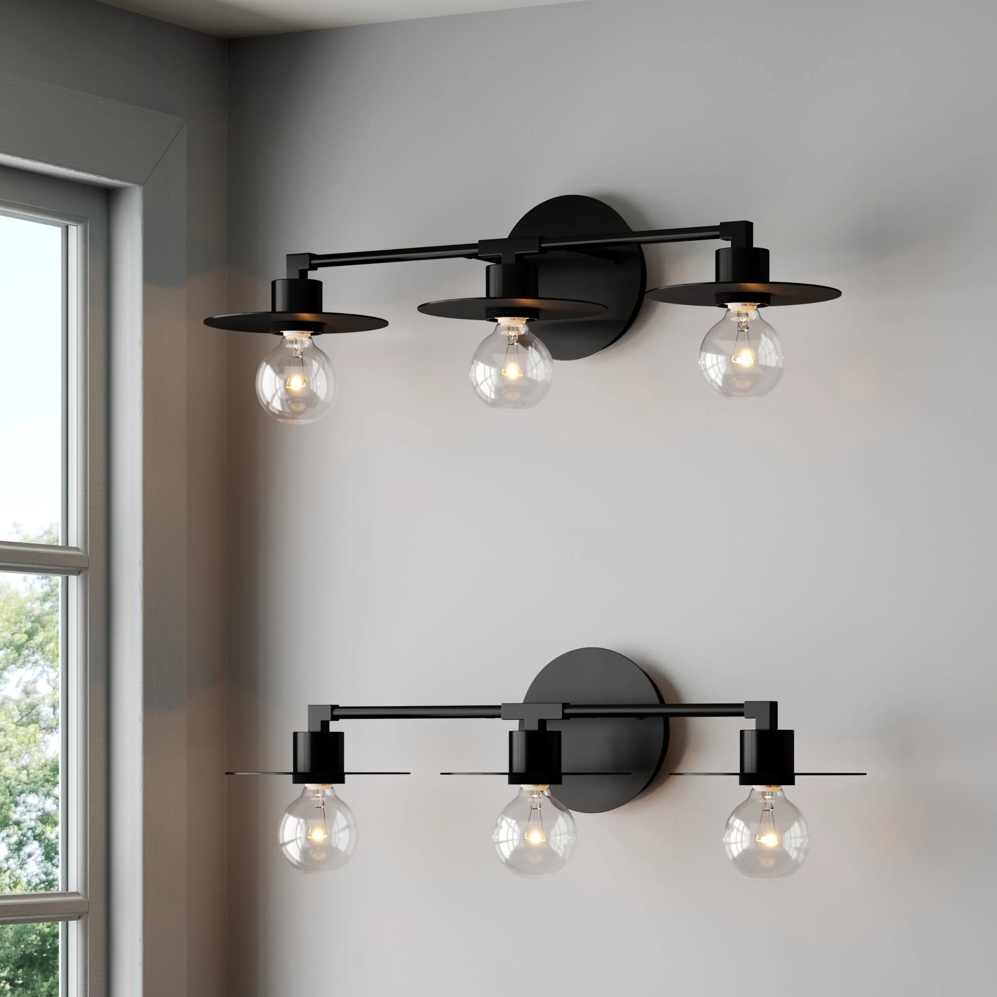 - This bathroom light has 3-lights that you can hang with the bulbs facing up or down for extra versatility!