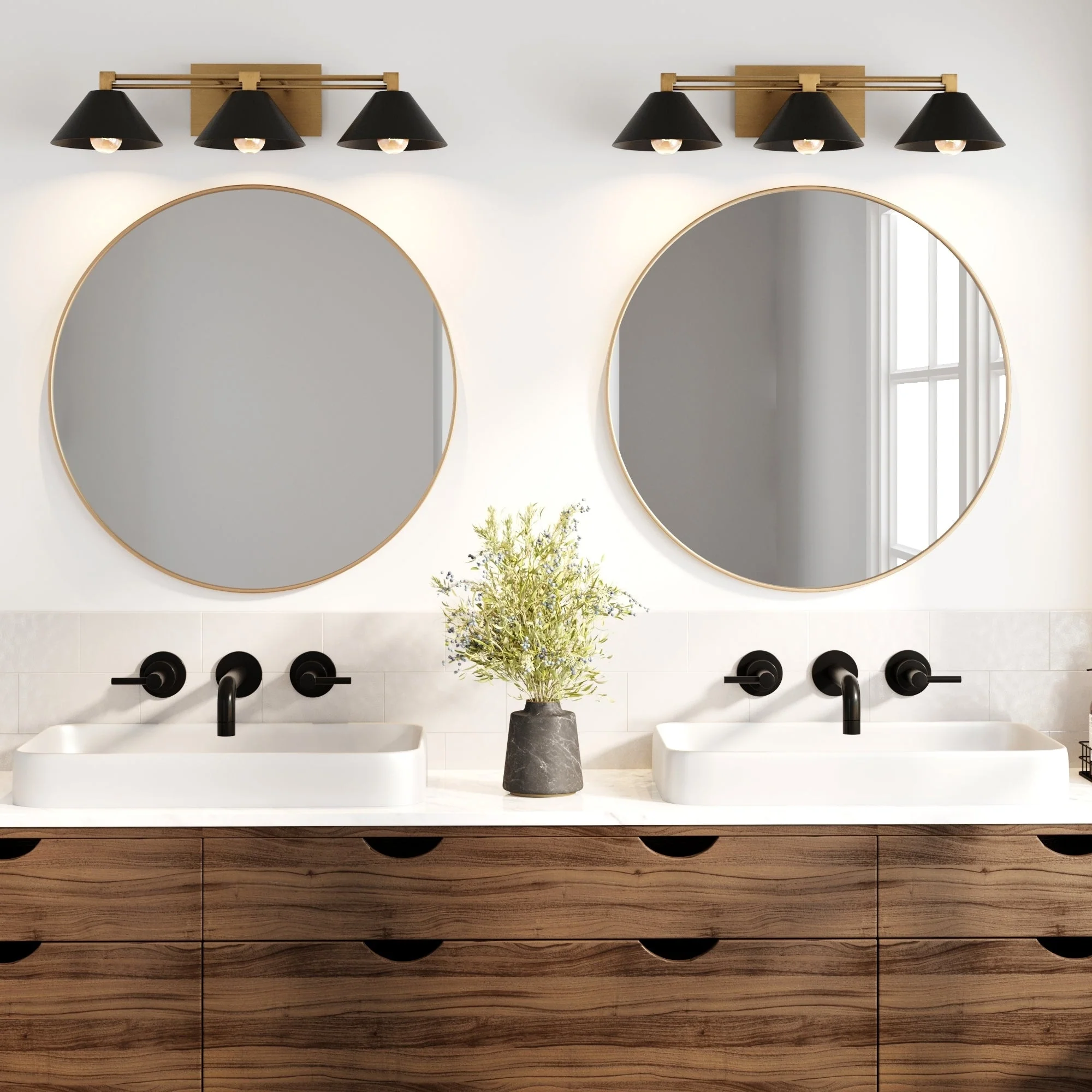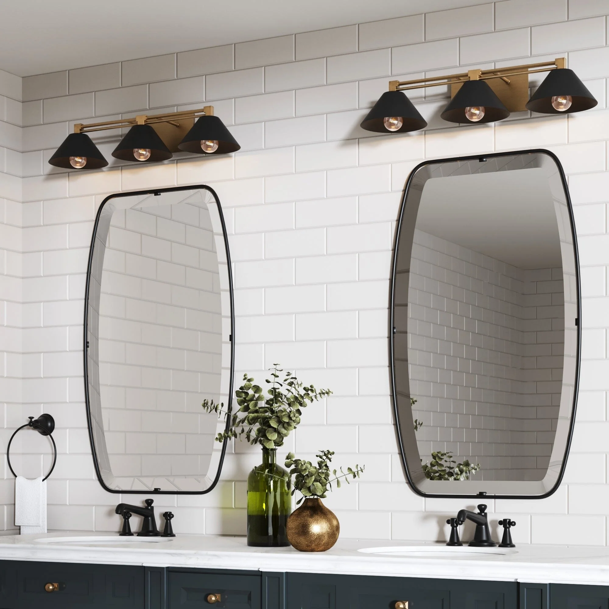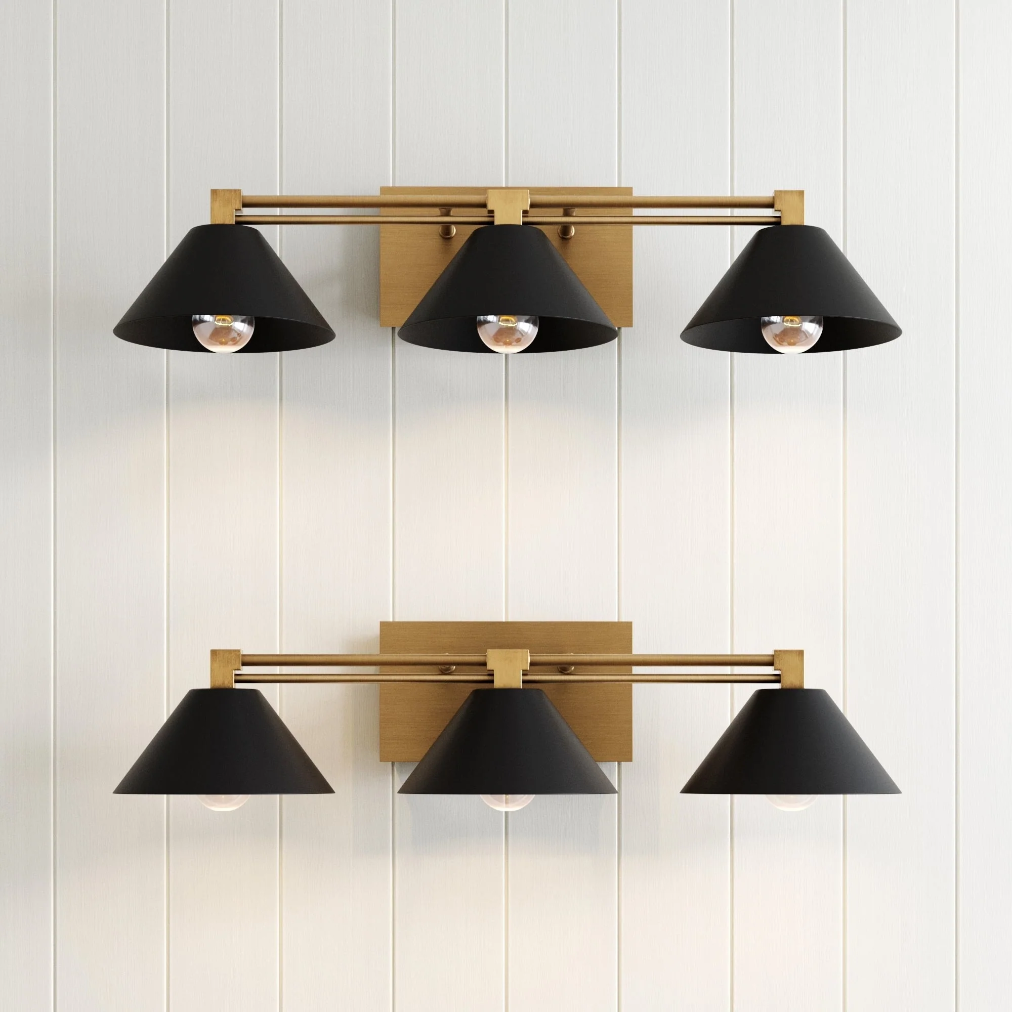 The Ronnie art deco vanity wall light is a versatile and stylish option for brightening up your space with a touch of industrial glam. Its three-bulb capacity ensures ample lighting, while the two-toned vintaged brass and matte black finish adds a hint of luxury and glam to any interior. Ronnie wall light also highlights an elegant rectangular backplate, clean lines, and decorative details. This bathroom wall light is damp-rated, making it ideal for your bathroom or kitchen. But feel free to place it to highlight your gallery wall or on top of your bedroom vanity!