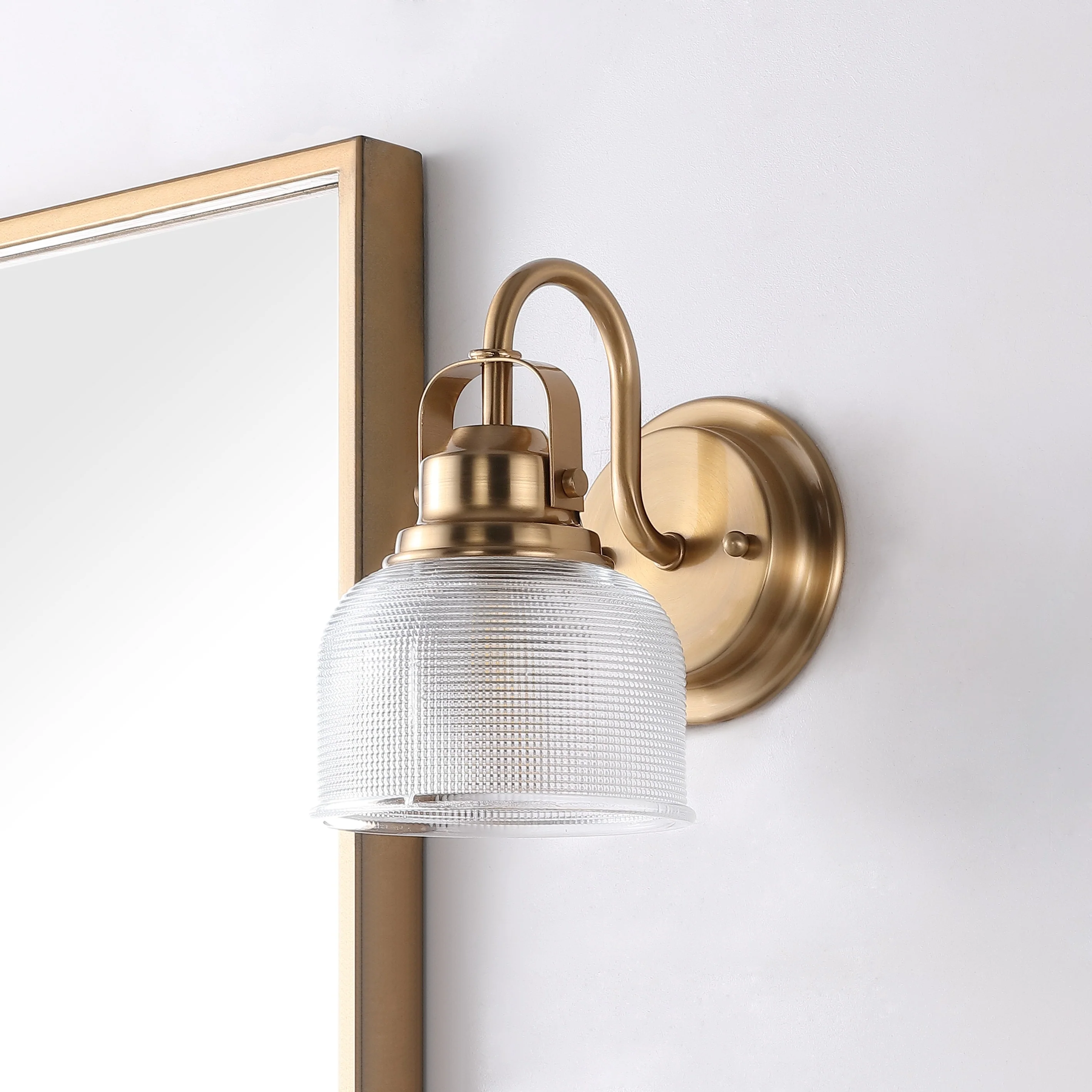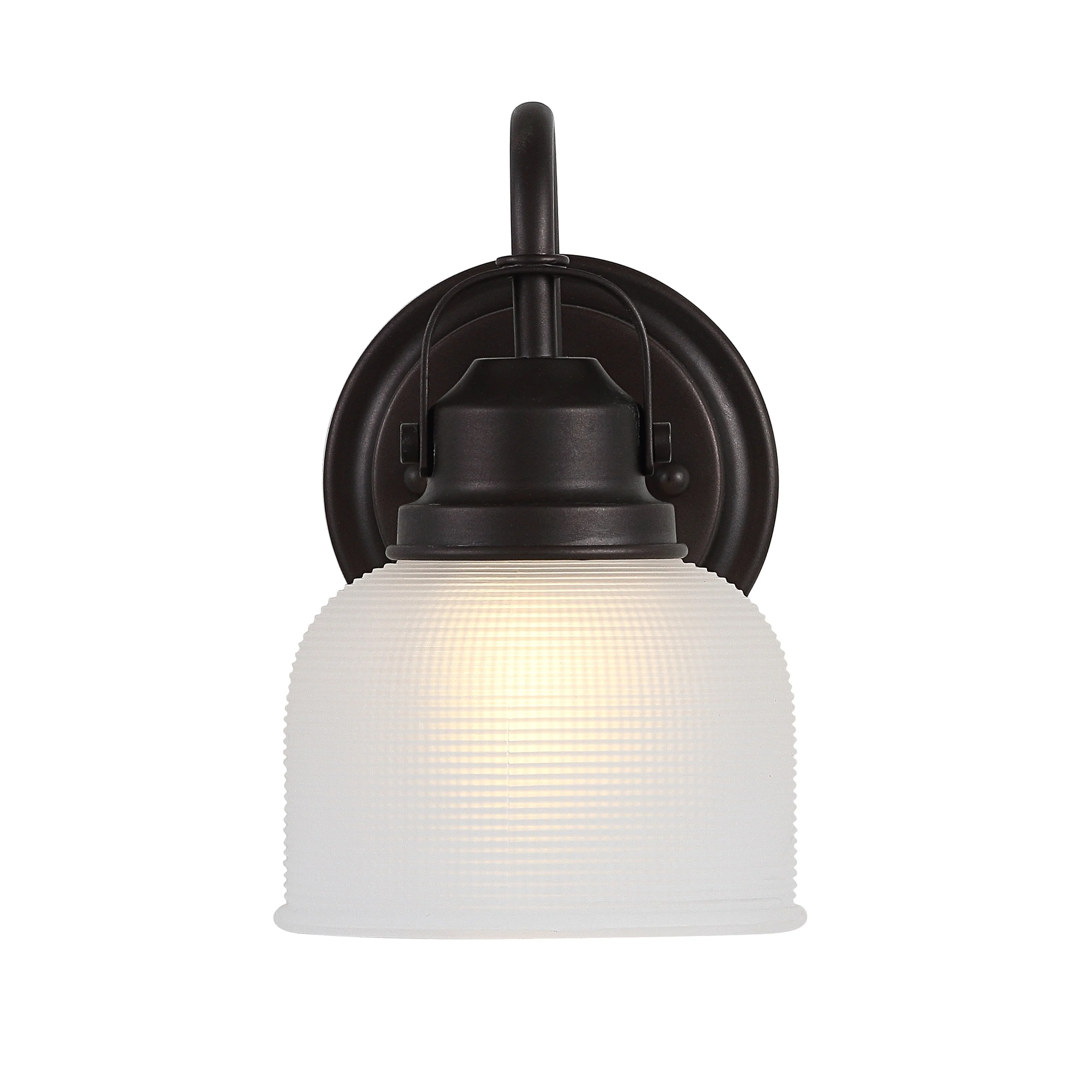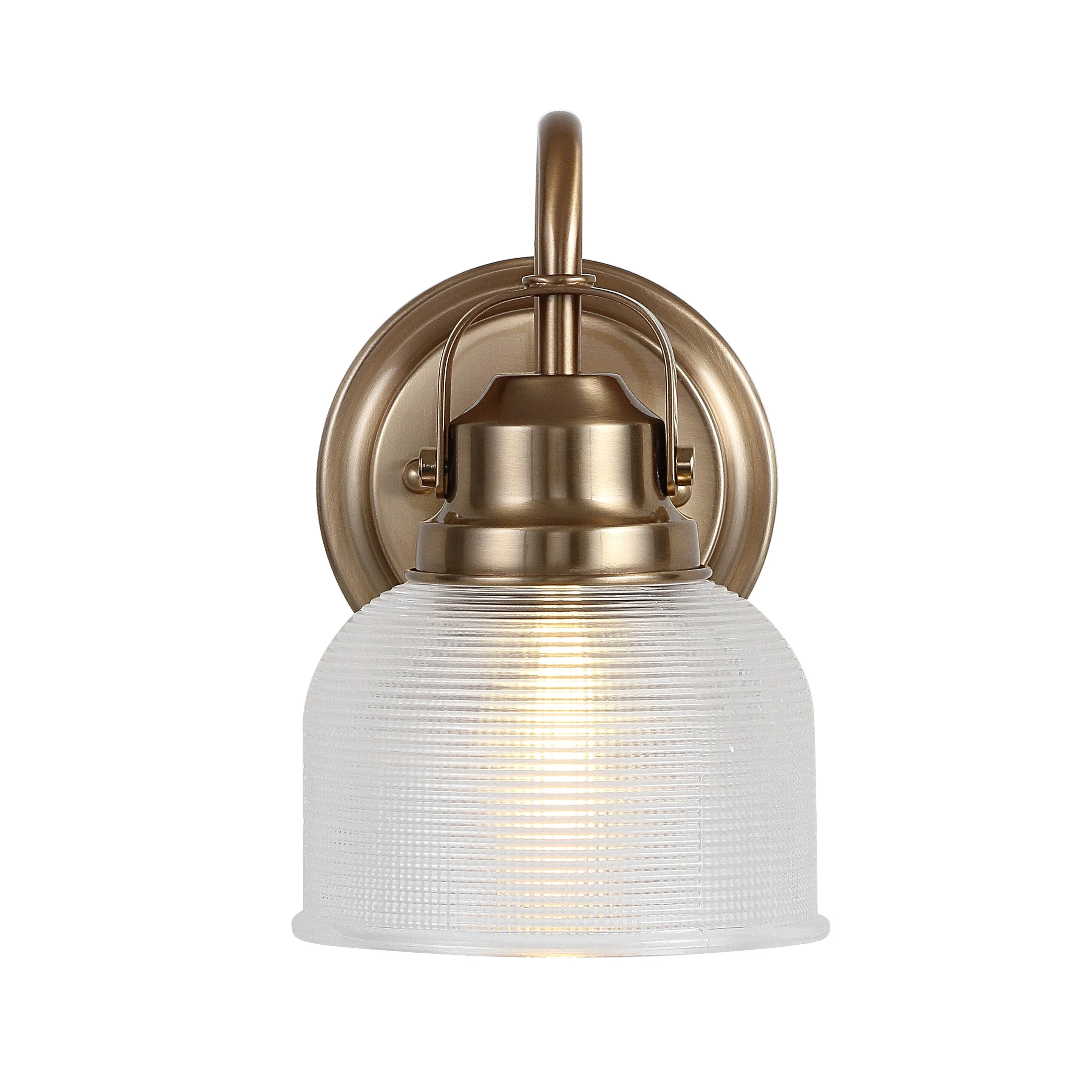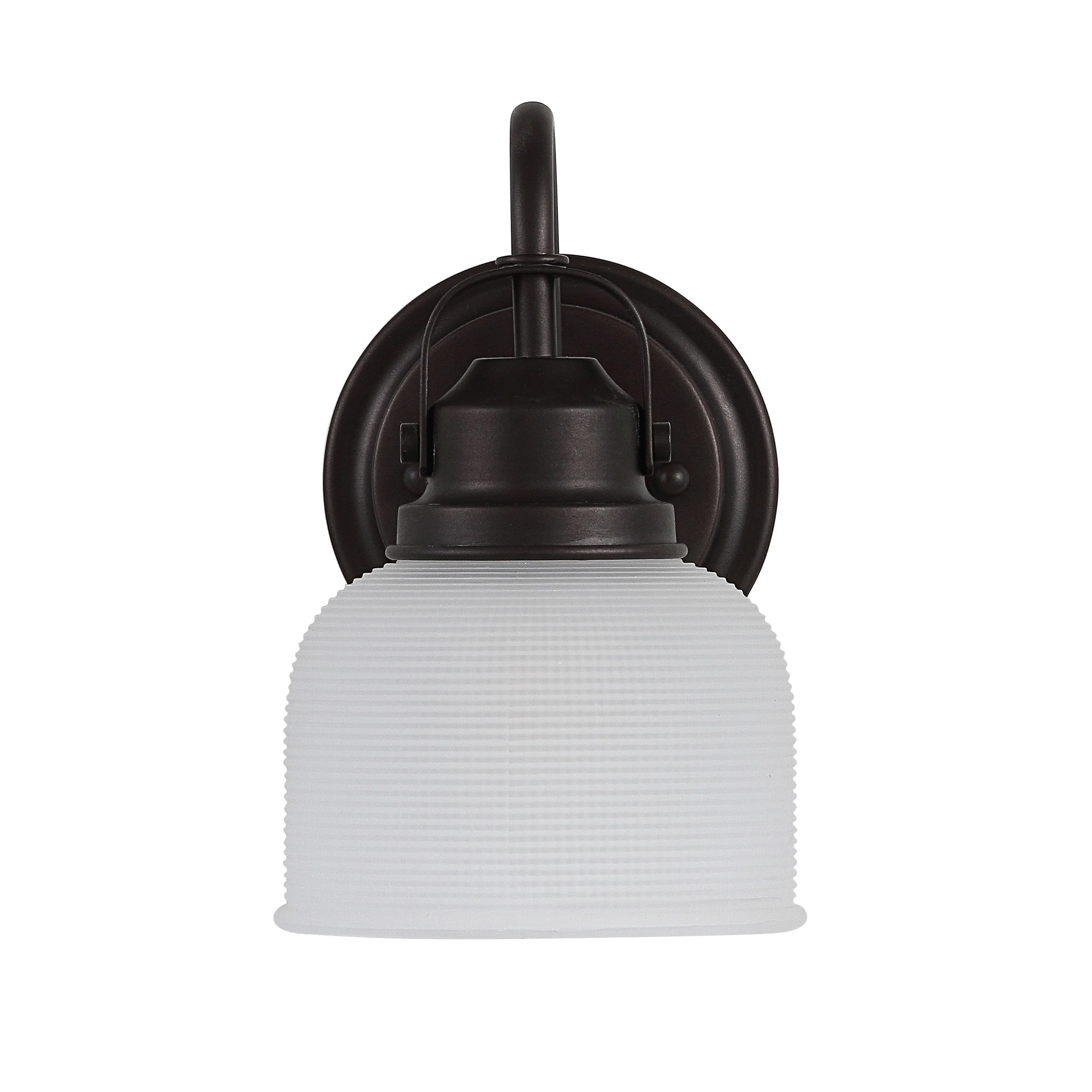 With a hint of texture on the glass shade to blur the glare of the bulb, this elegant sconce is perfect for a bathroom or vanity setting that calls for bright, but not harsh, light. On either side of a mirror, you'll find this stylish piece the perfect addition to your morning makeup routine, as it is compatible with a variety of bulbs. Also versatile within any style of decor, we particularly love seeing these in bathrooms and kitchens, where the arch of the light's arm is reminiscent of the curve of a beautiful faucet.