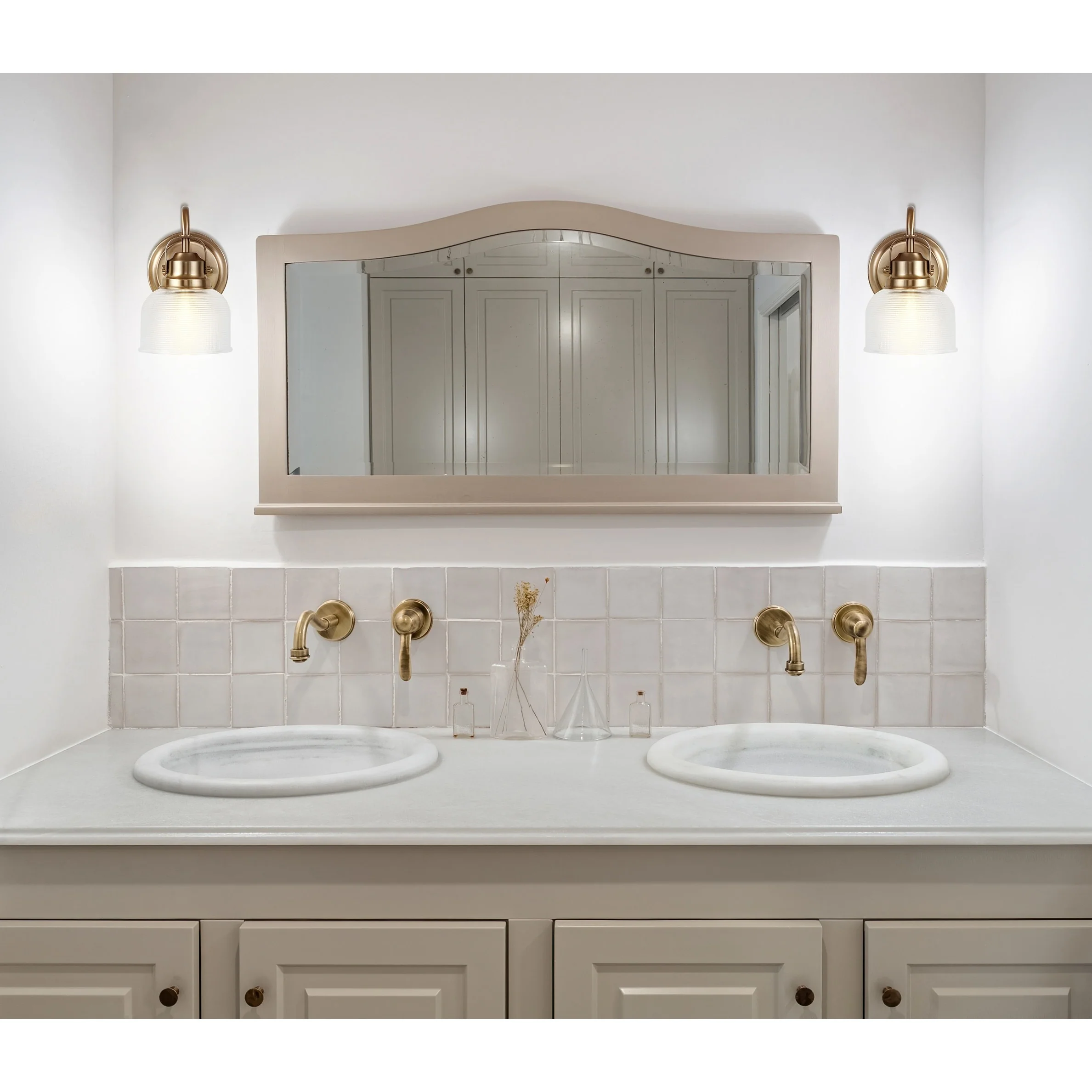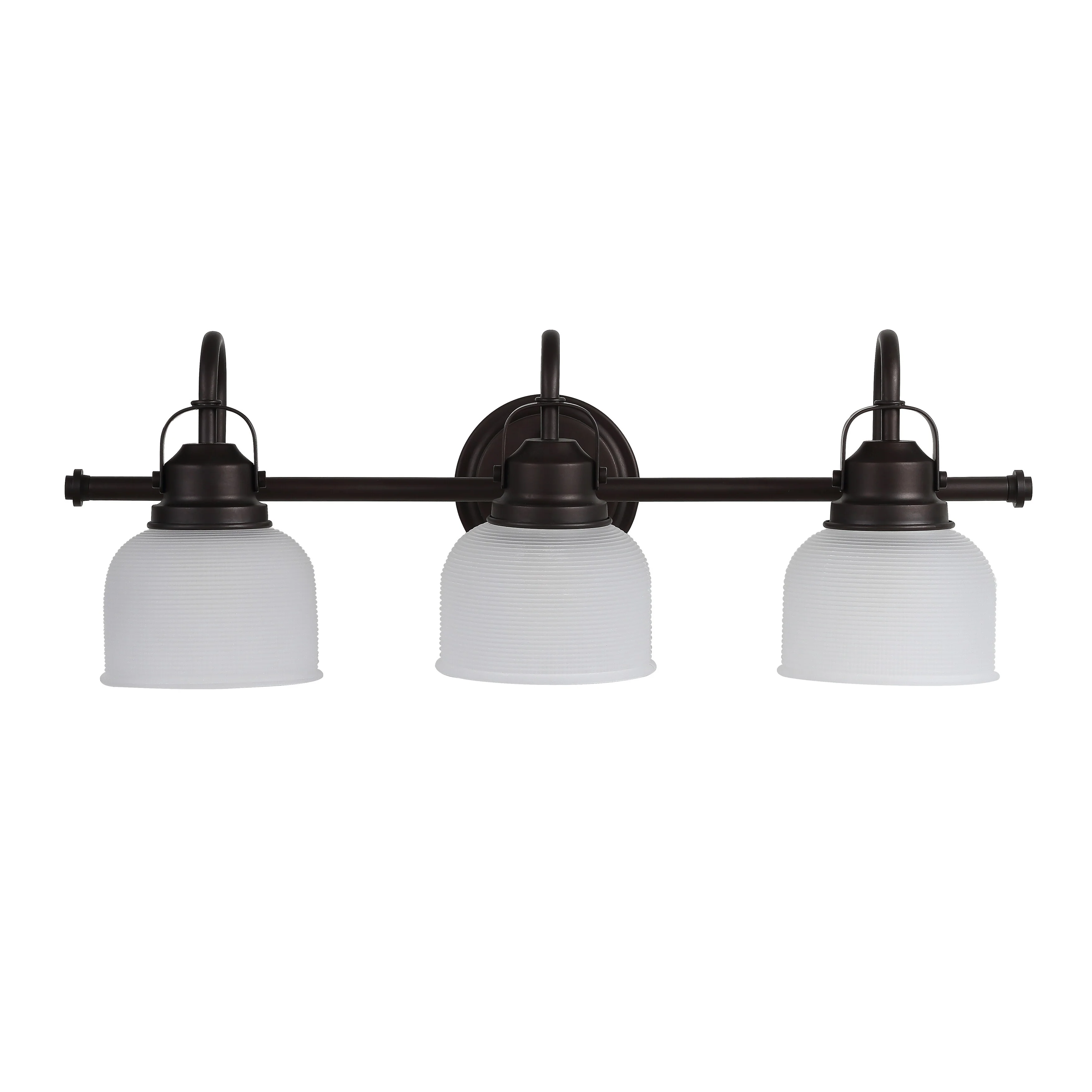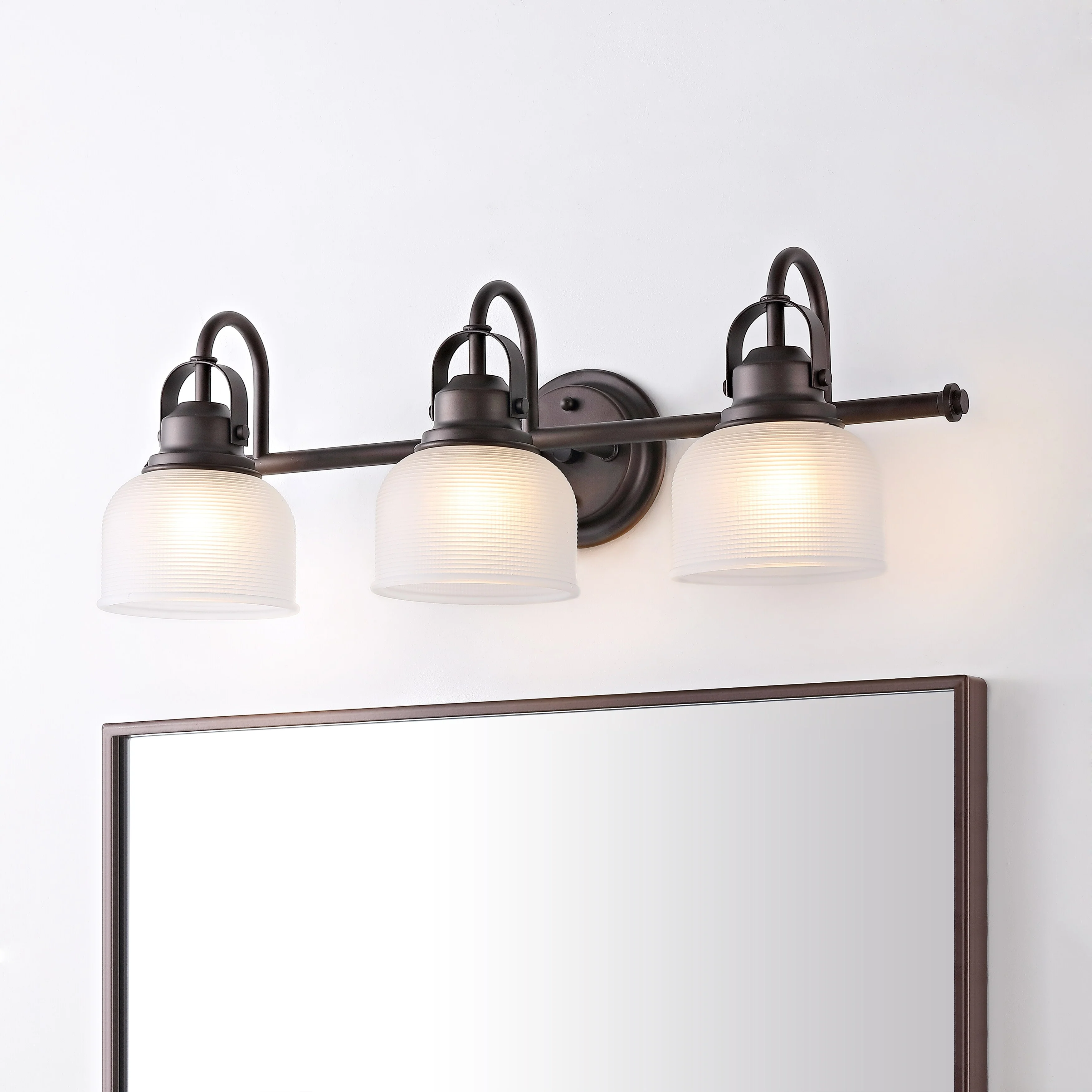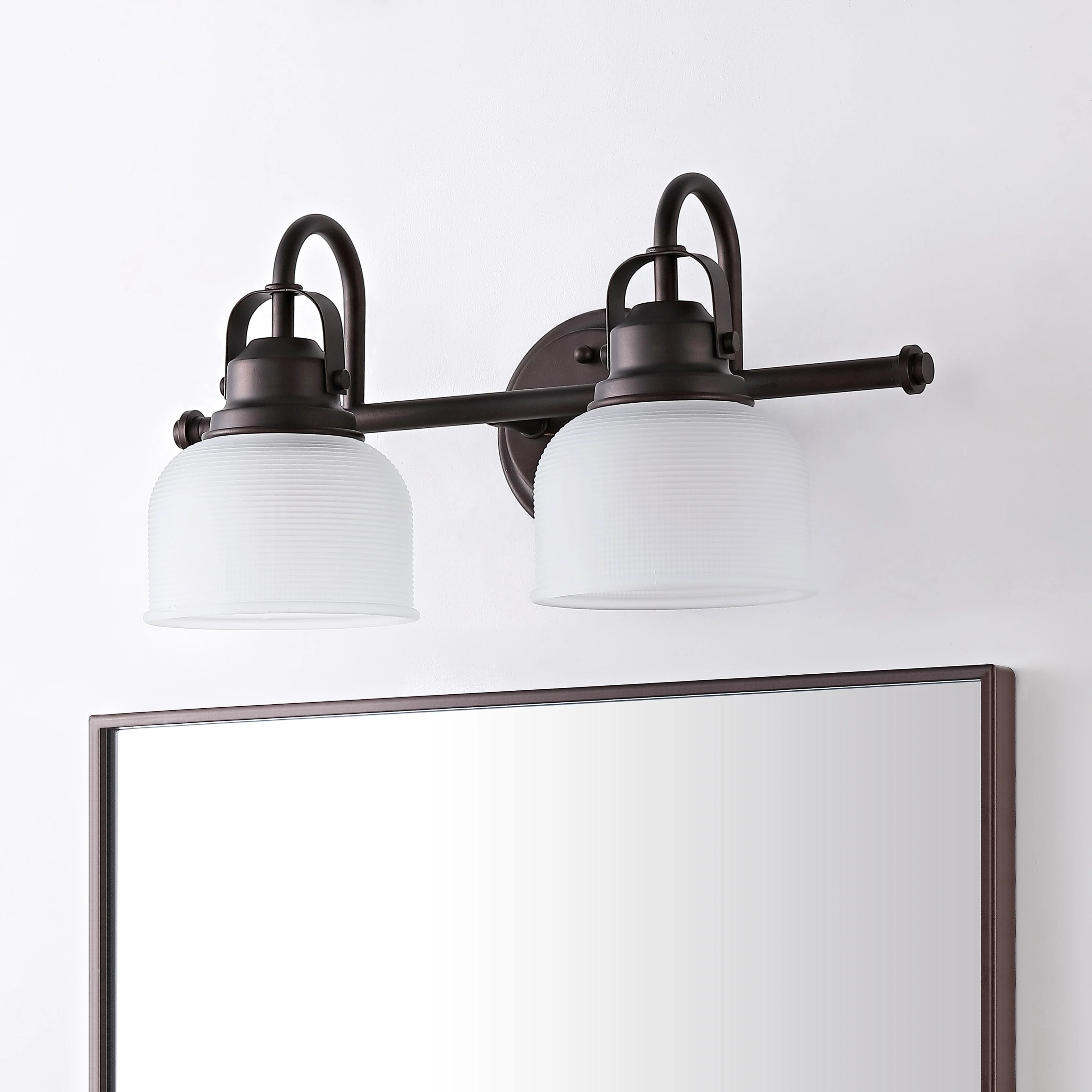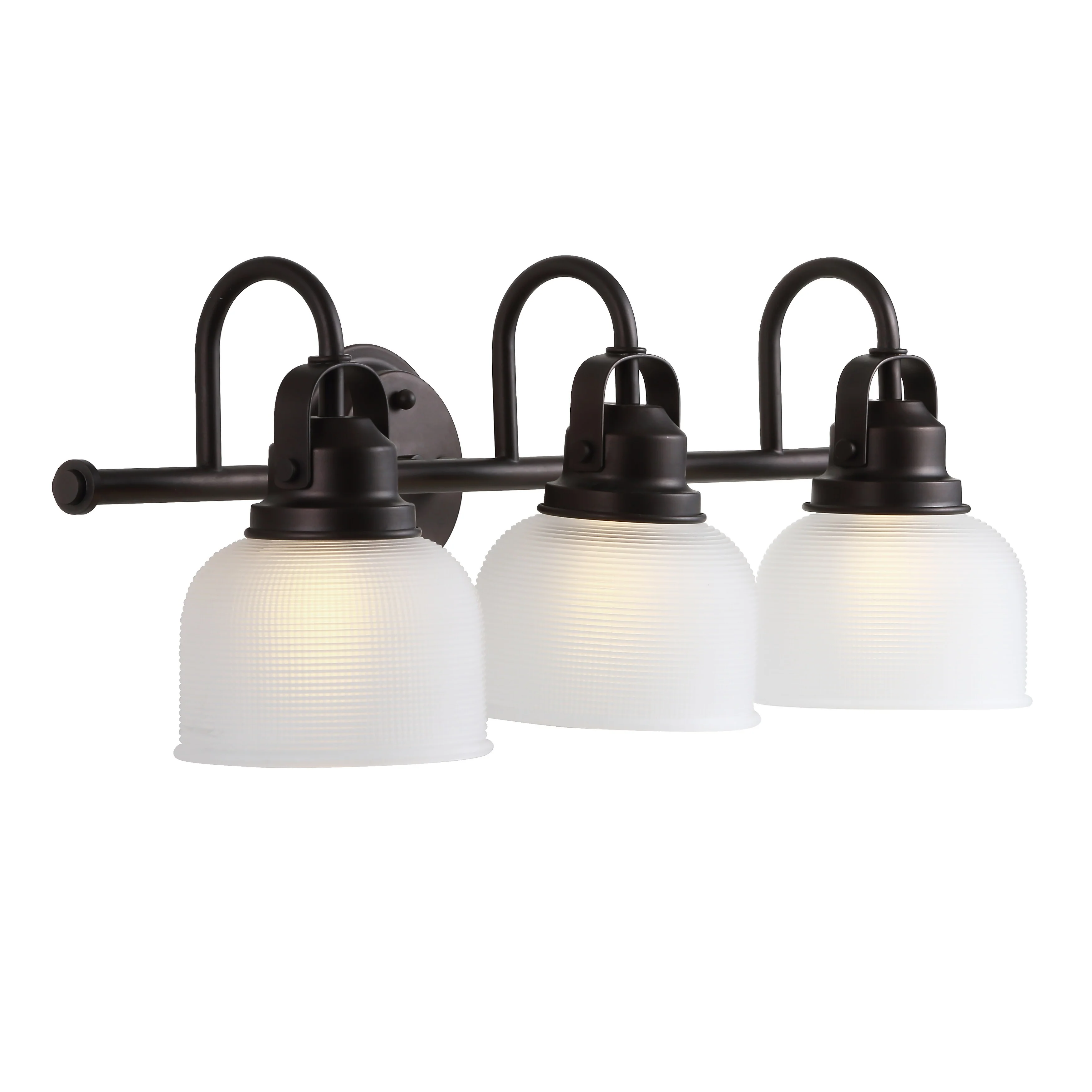 With a hint of texture on the glass shade to blur the glare of the bulb, this elegant sconce is perfect for a bathroom or vanity setting that calls for bright, but not harsh, light. On either side of a mirror, you'll find this stylish piece the perfect addition to your morning makeup routine, as it is compatible with a variety of bulbs. Also versatile within any style of decor, we particularly love seeing these in bathrooms and kitchens, where the arch of the light's arm is reminiscent of the curve of a beautiful faucet.