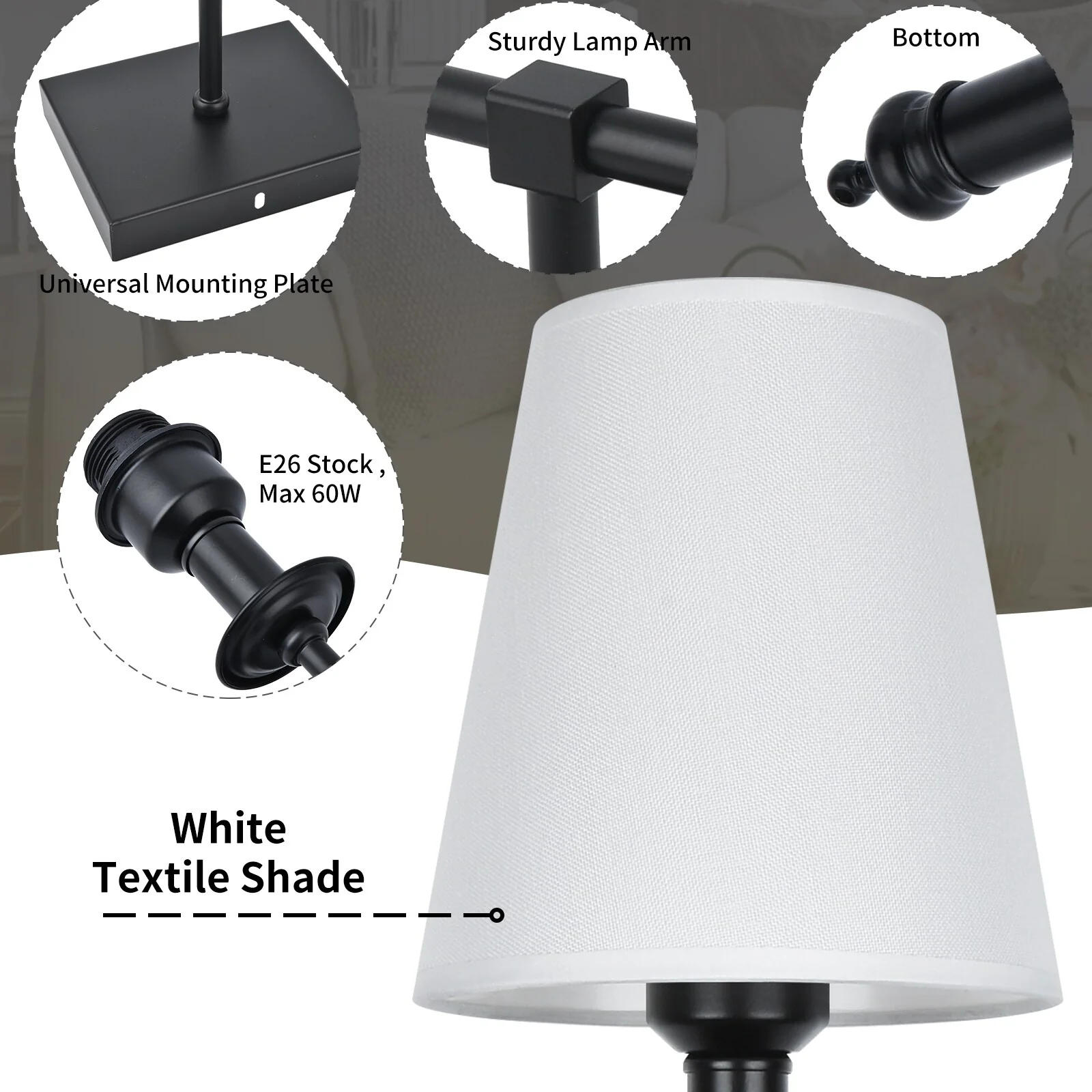 - Tapered fabric shade adds a subtle sophistication to the industrial design