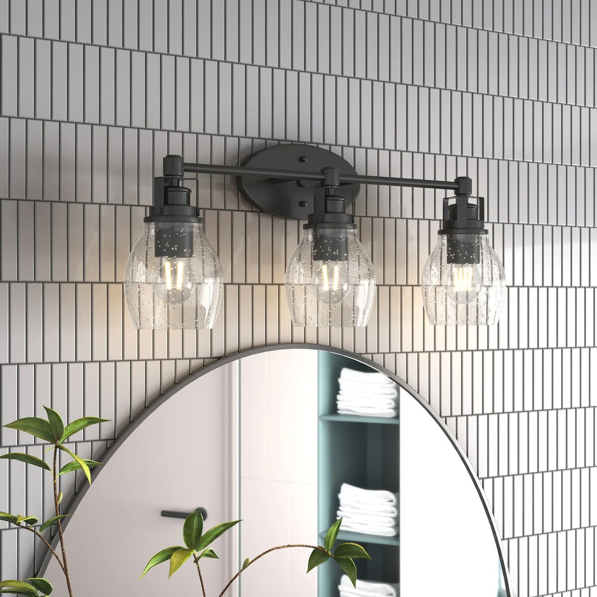 Modern 3-Light Bathroom Vanity Light in Black Finish with Seeded Glass Shade