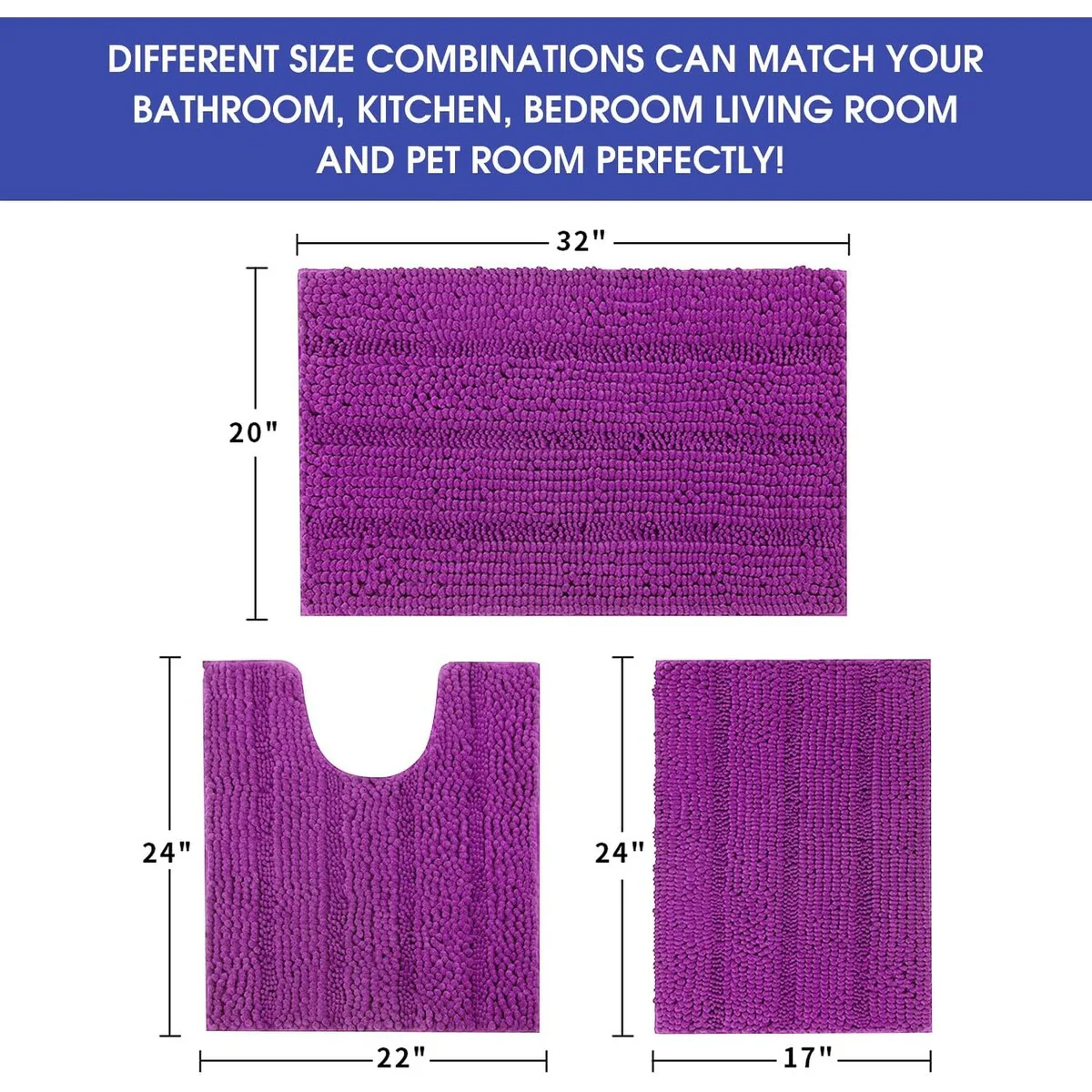 LUXURY 3 PIECE BATHROOM RUG: Including 1 Large Bath Rug 20'x32', 1 U-Shape Contoured Rug 22'x24', 1 Small Bath Rug 17'x24'. ��bathroom rug set made of 100% luxurious chenille fabric microfiber with higher pile than others. ��The thick and soft chenille helps soothe tired feet and keep your toes warm on the cold floor. ��The high density and plushness of the chenille offers exceptional comfort and support for your feet. ��You will feel like stepping on a cozy cloud to enjoy the ultimate luxury.