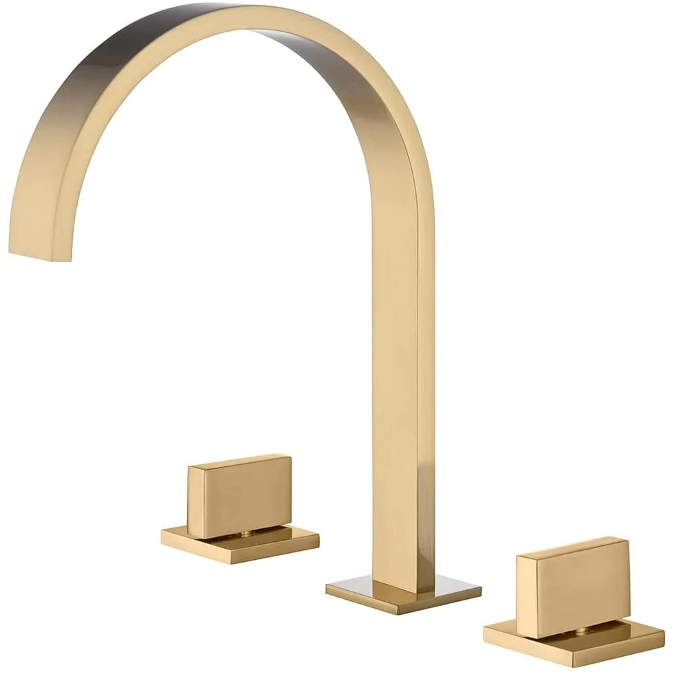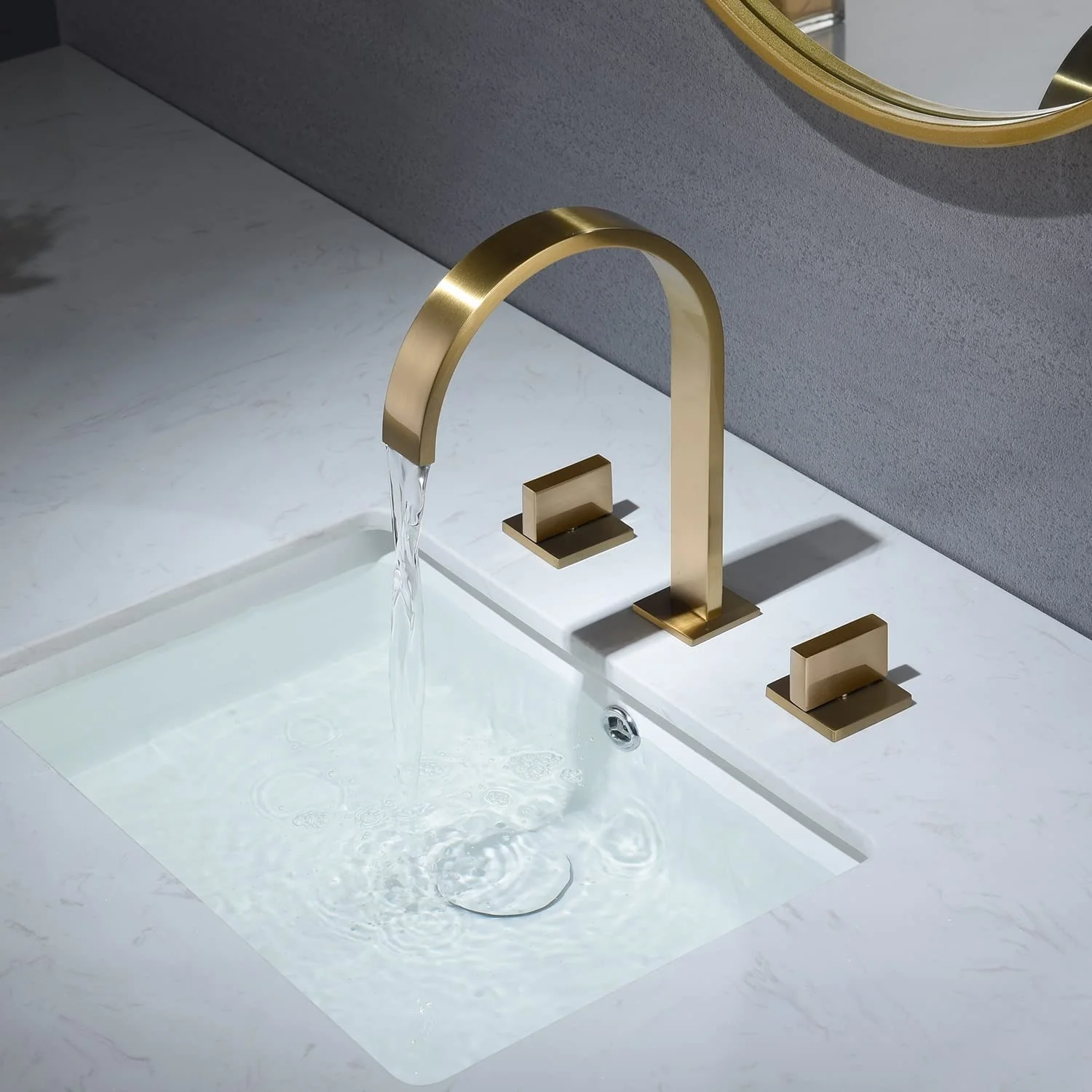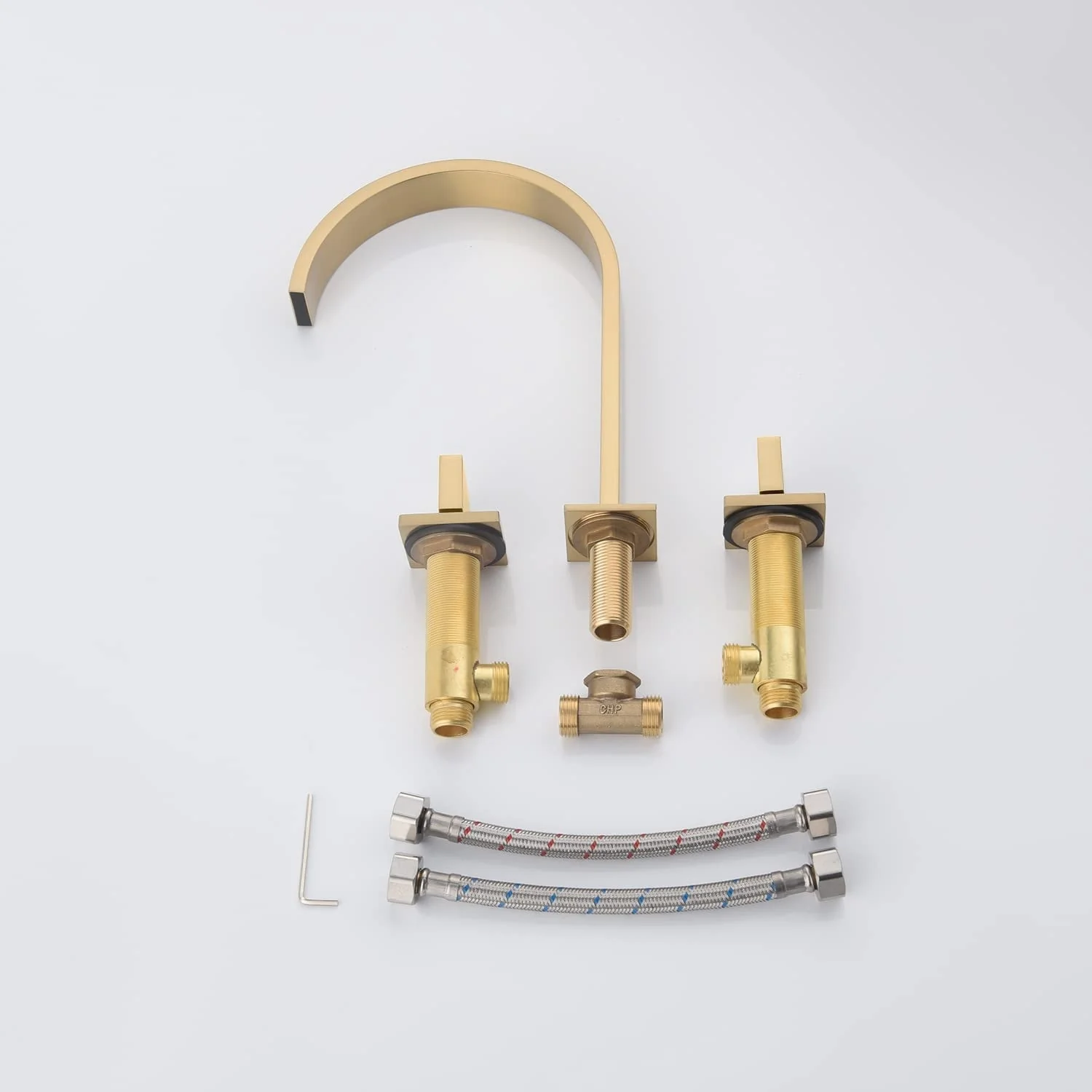 Upgrade your bathroom with the Brushed Gold Two-Handle Waterfall Bathroom Sink Faucet from Grolta. Crafted from solid brass, this faucet is built to last and comes with a lifetime warranty. The elegant waterfall design and dual handles make it easy to control the flow and temperature of the water. Choose from five different finish options to match your bathroom decor. Comes with 2 hoses and a pop-up brass overflow drain for easy installation.