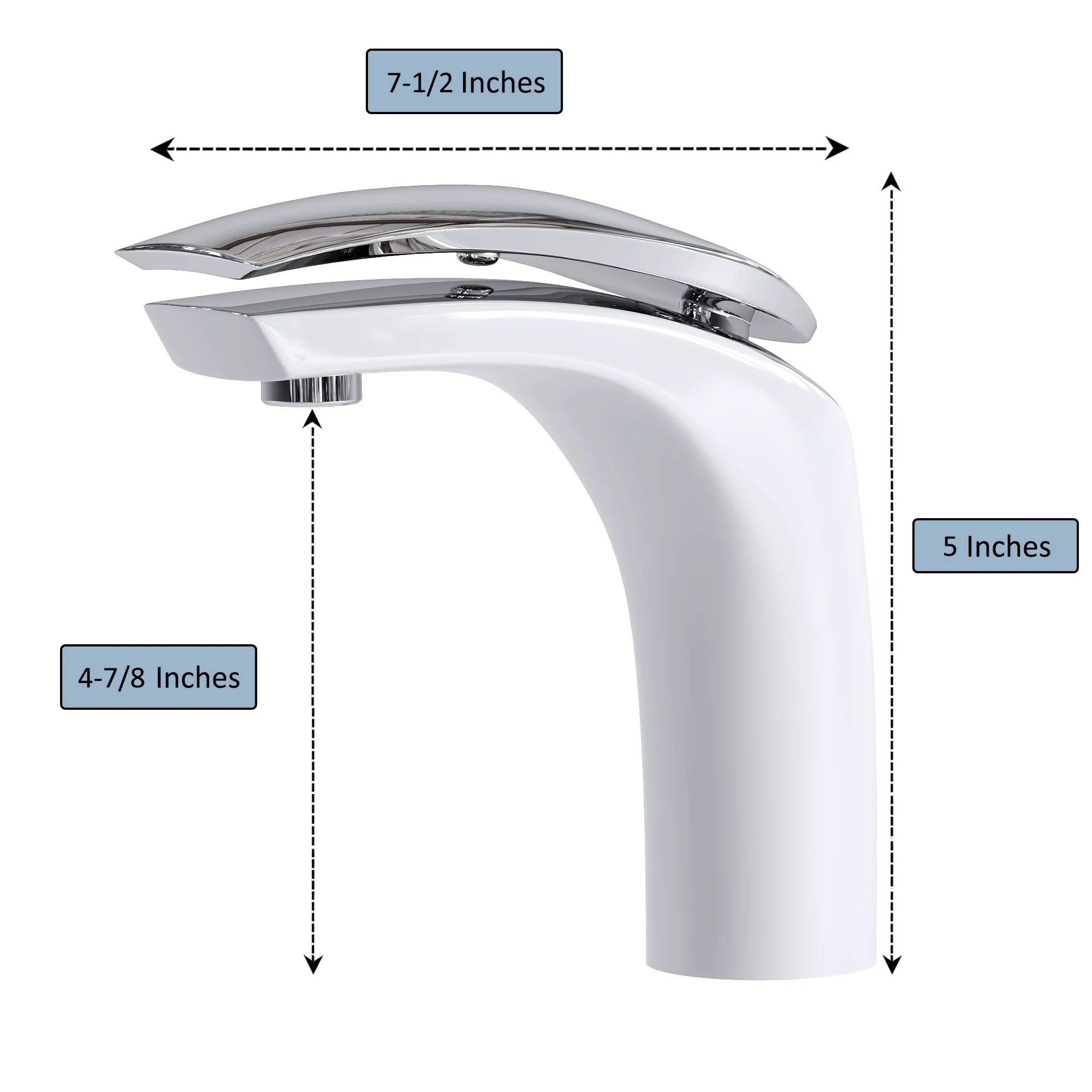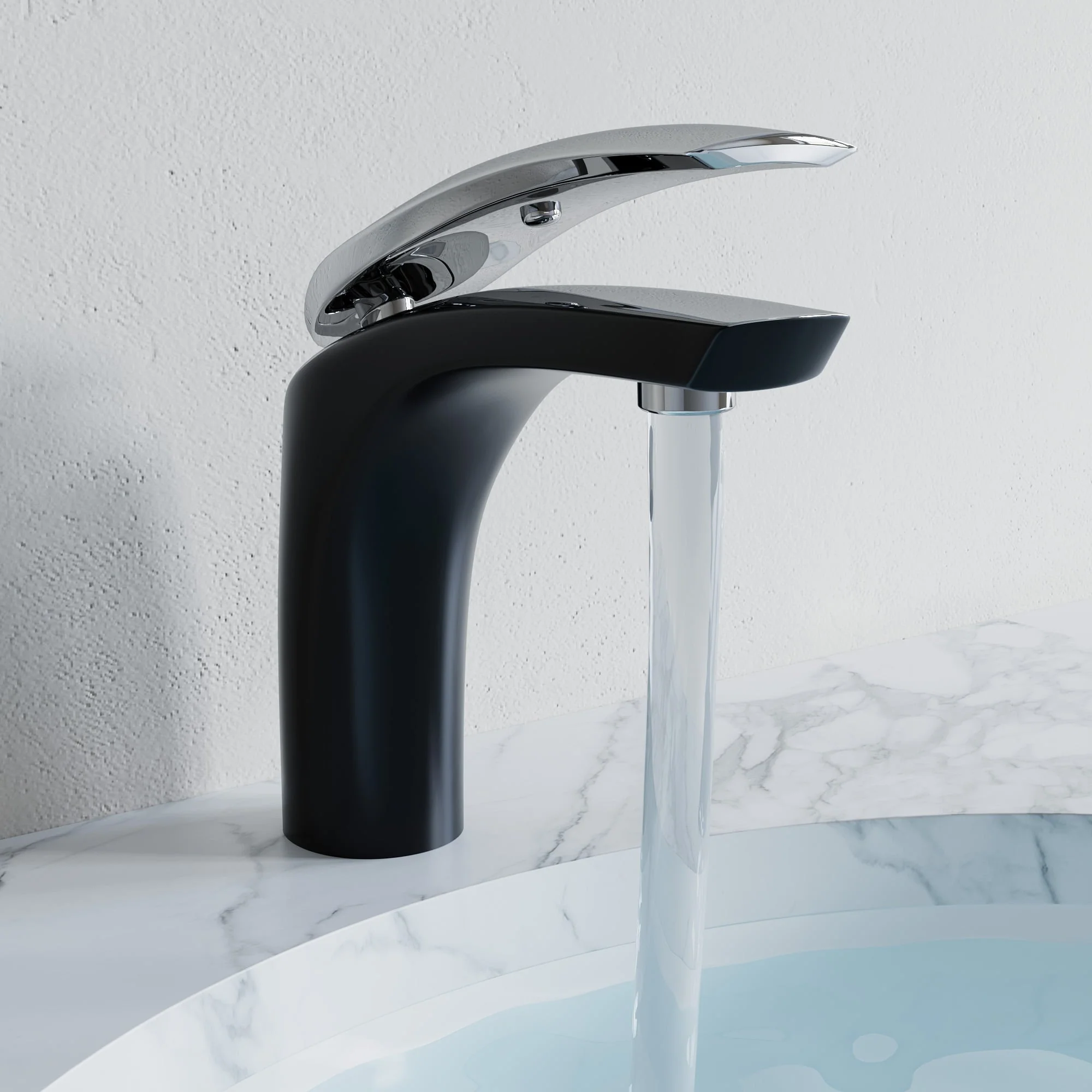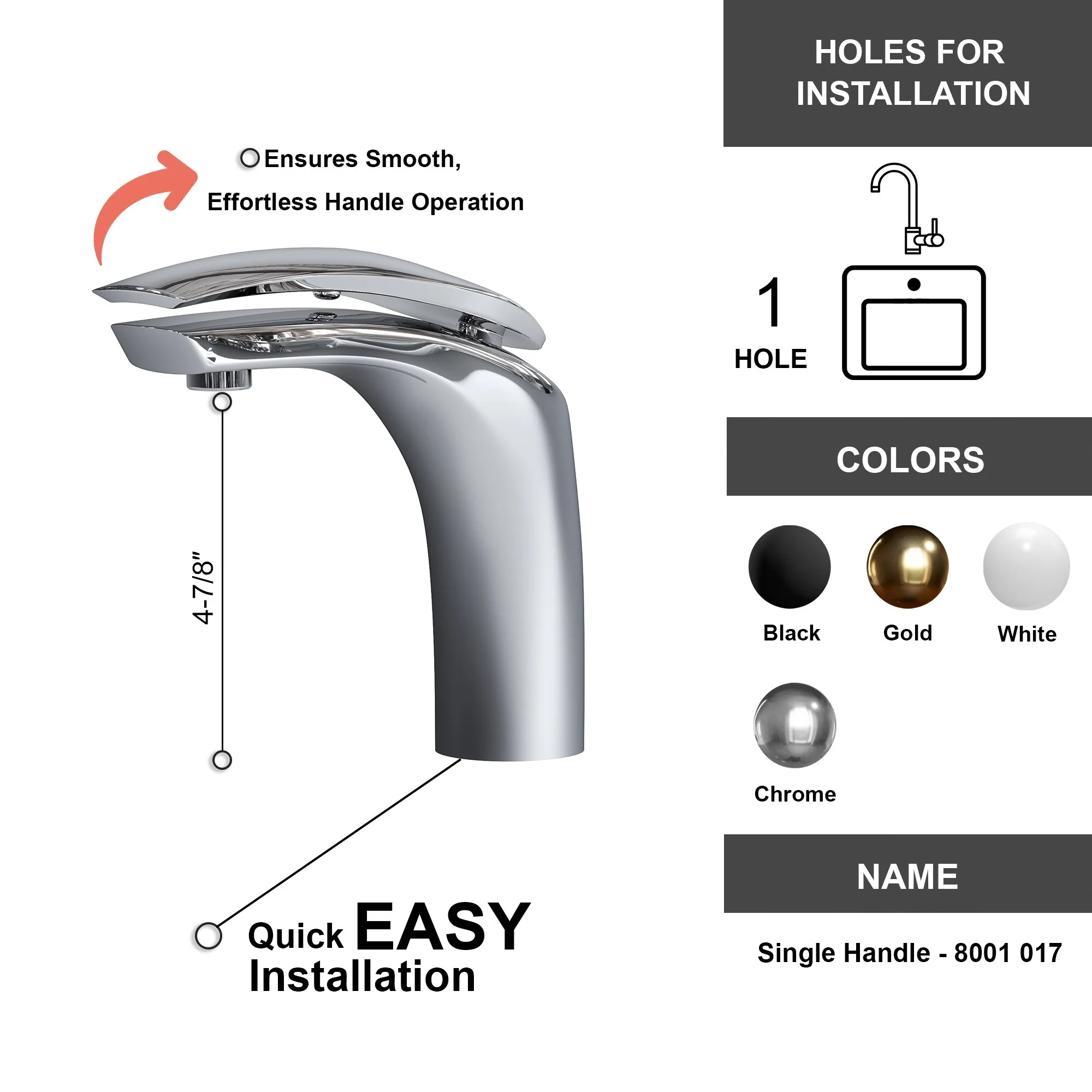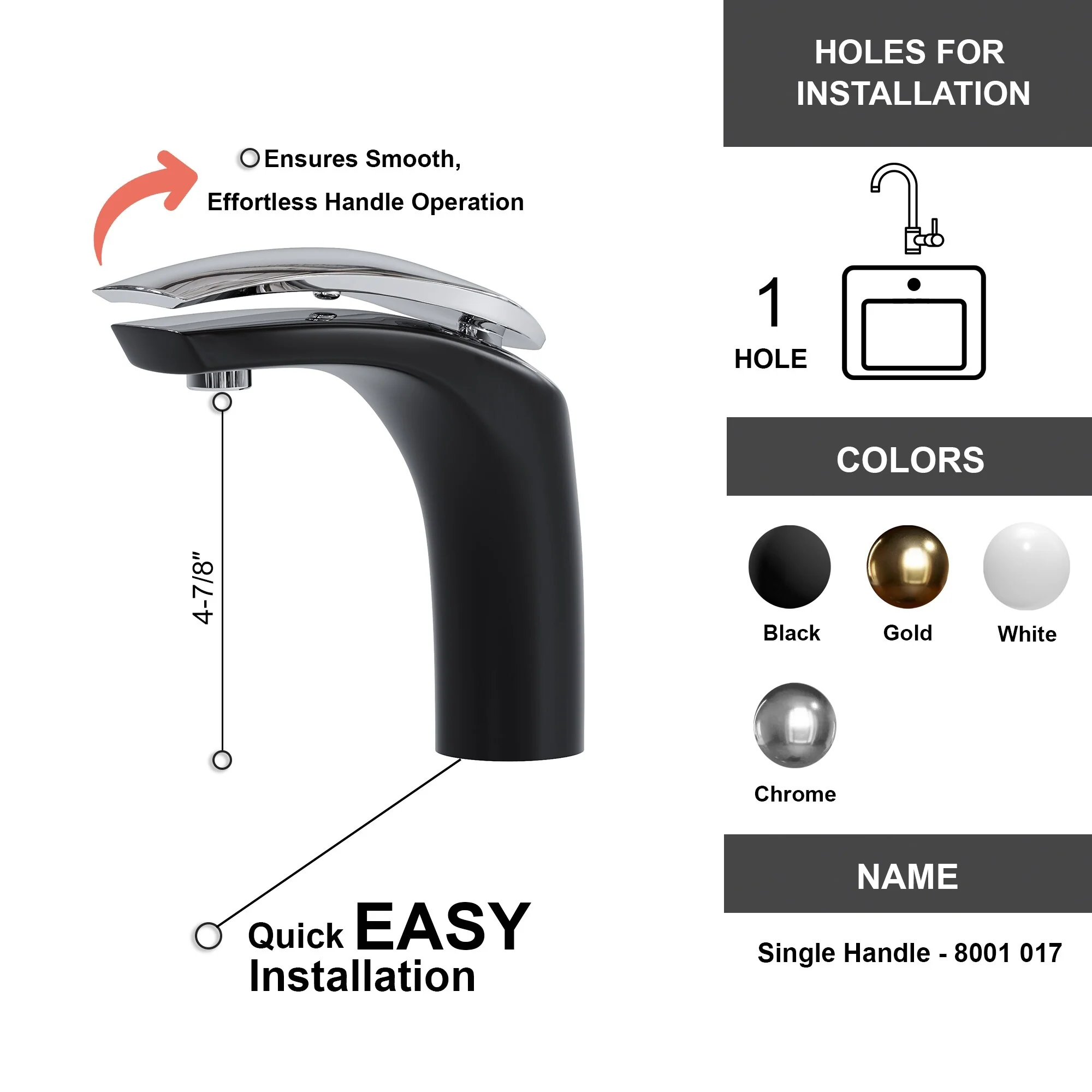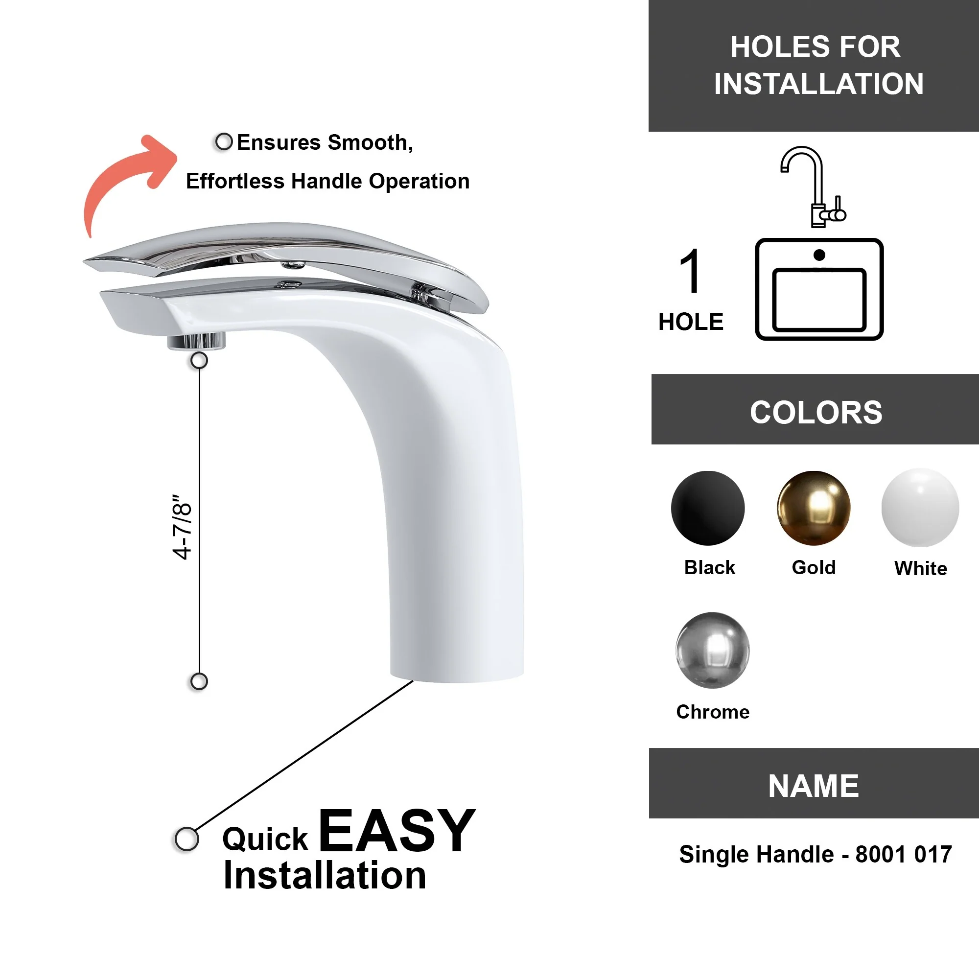 Single top handle bathroom faucet with oval base. Lead-free waterway, low-arc spout and made with premium components. Available in Chrome, Chrome with Black, and Chrome with White. Easy single hole installation with any undermount sink