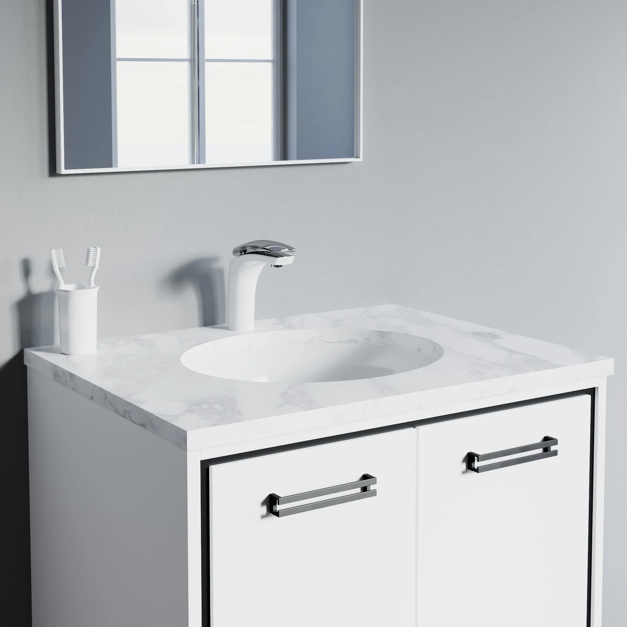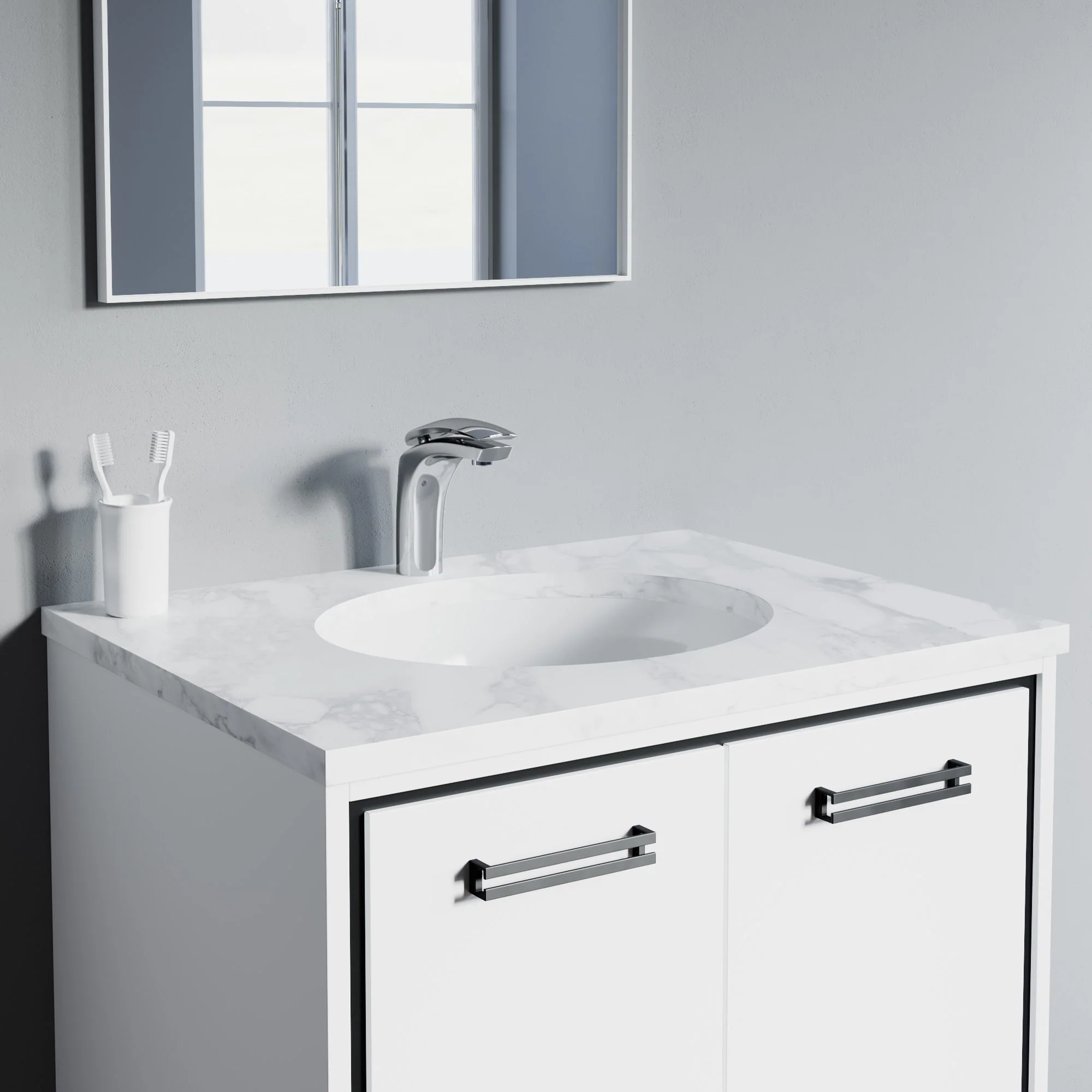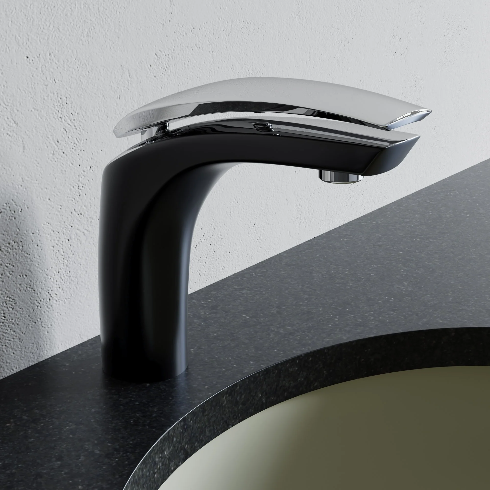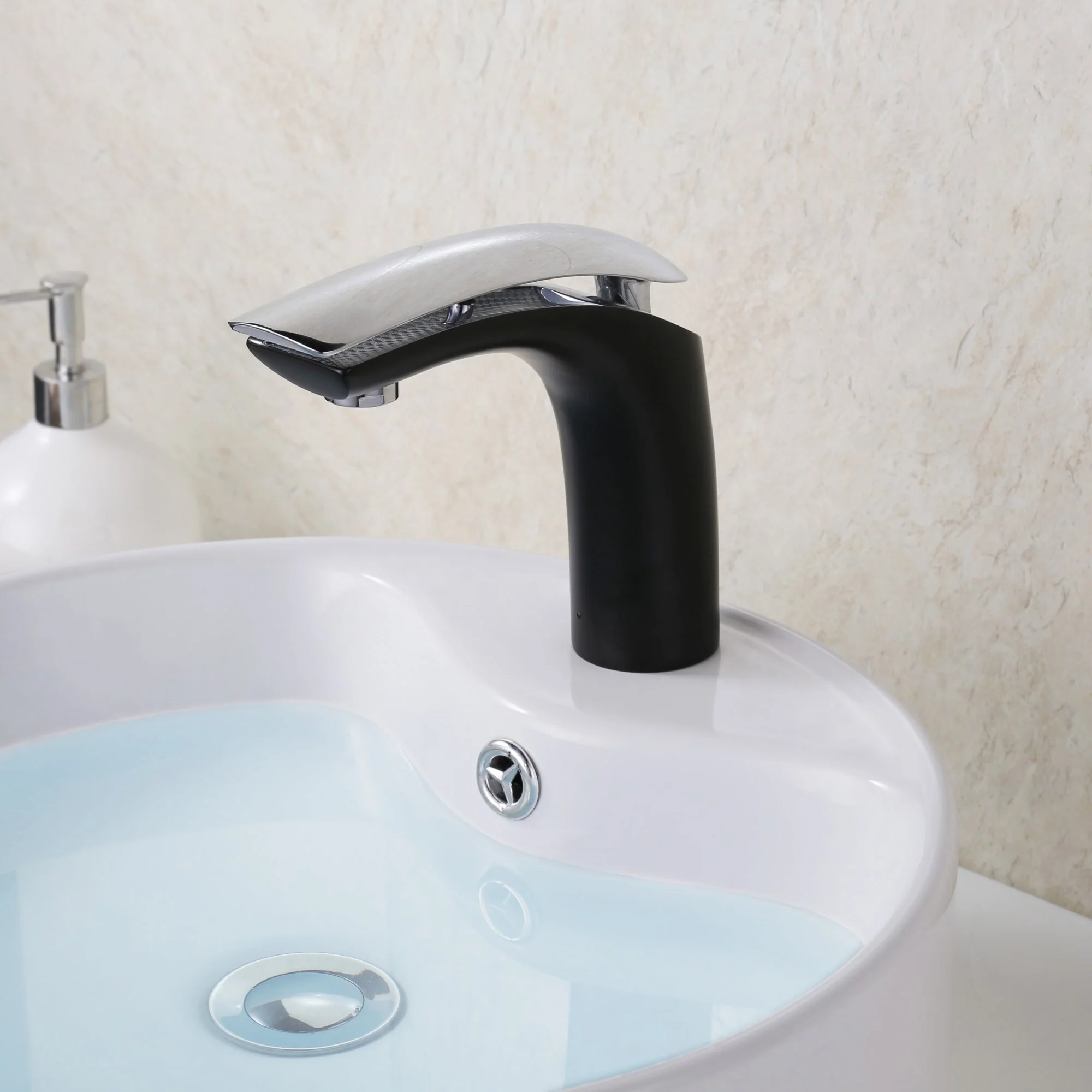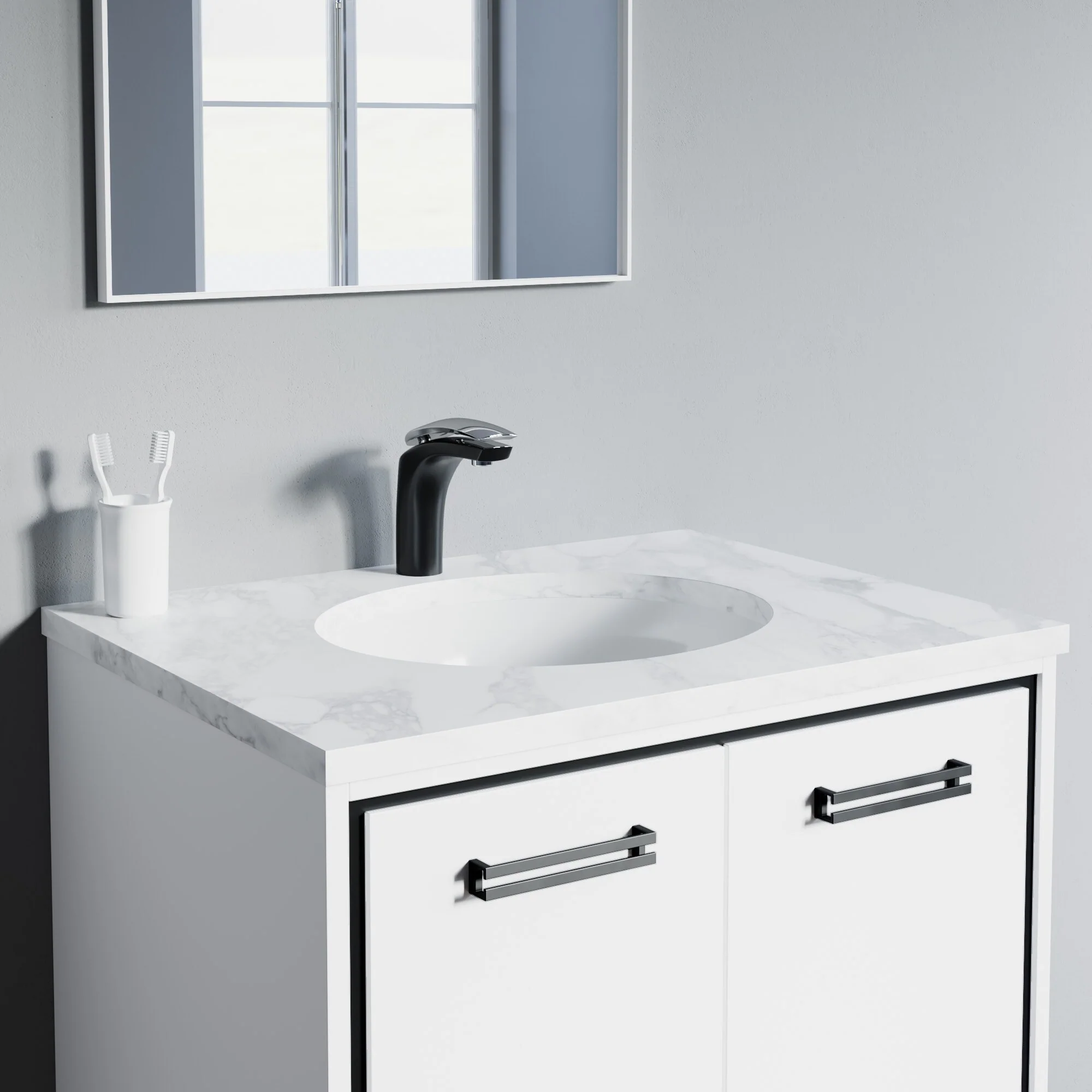 Single top handle bathroom faucet with oval base. Lead-free waterway, low-arc spout and made with premium components. Available in Chrome, Chrome with Black, and Chrome with White. Easy single hole installation with any undermount sink