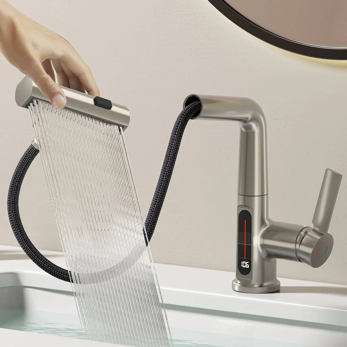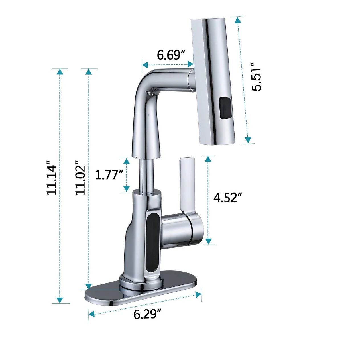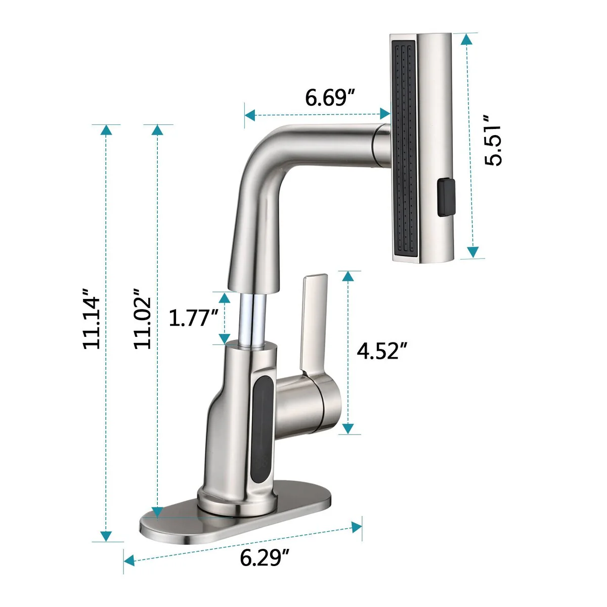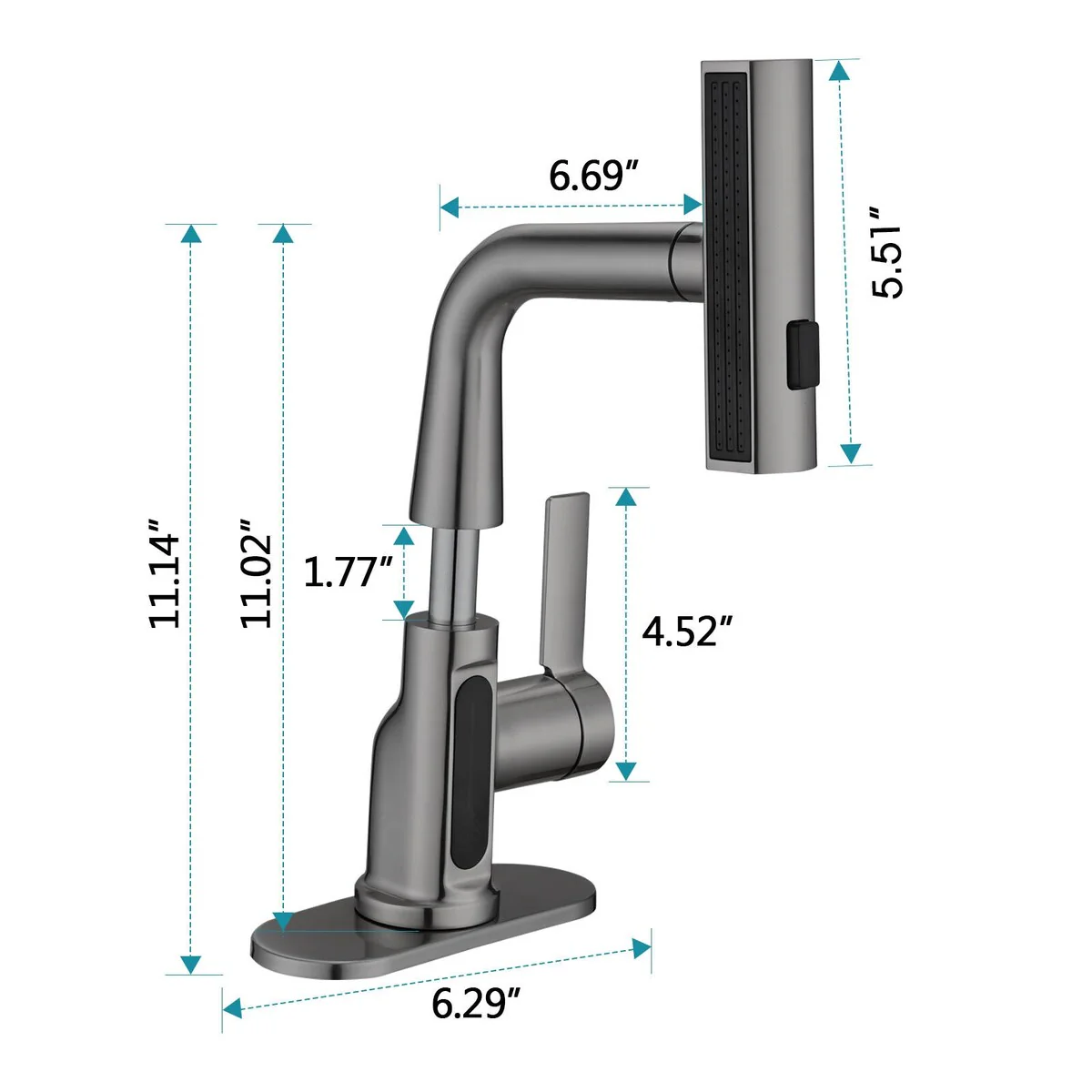 ����Pull-Out Design for Convenience�� The basin faucet with a pull-out sprayer breaks the space limitation of traditional faucets, expanding the range of water use. It is also suitable for scenarios such as washing your face, washing your hair and bathing your pet. With the gravity ball design, the hose retracts smoothly and precisely on its own.