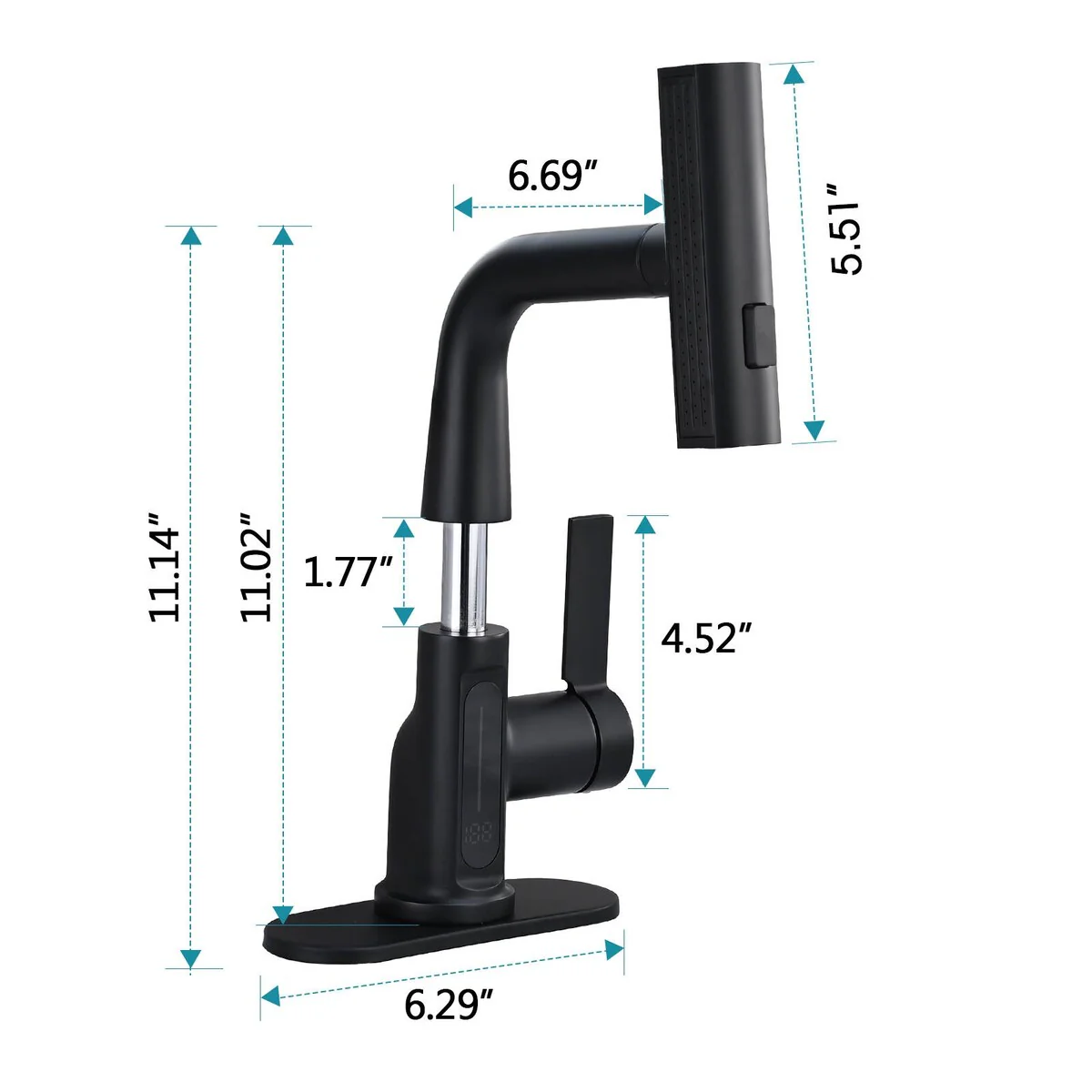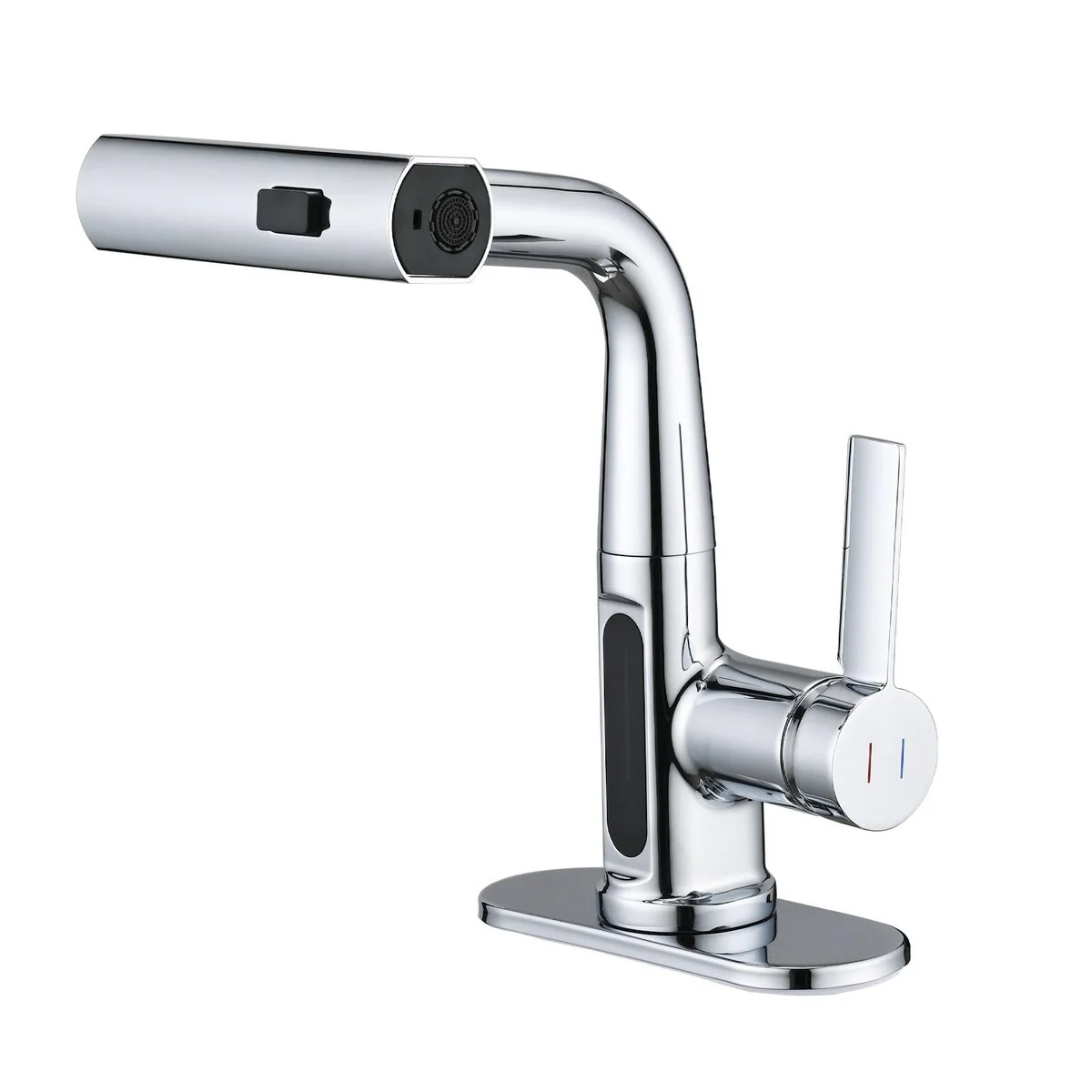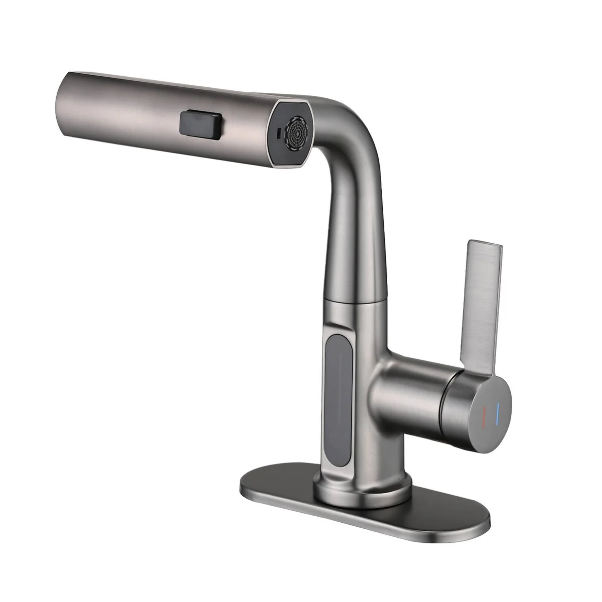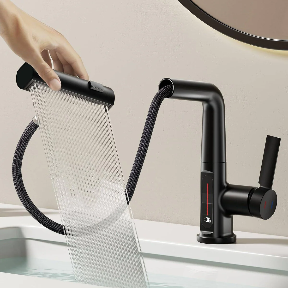 ����Pull-Out Design for Convenience�� The basin faucet with a pull-out sprayer breaks the space limitation of traditional faucets, expanding the range of water use. It is also suitable for scenarios such as washing your face, washing your hair and bathing your pet. With the gravity ball design, the hose retracts smoothly and precisely on its own.