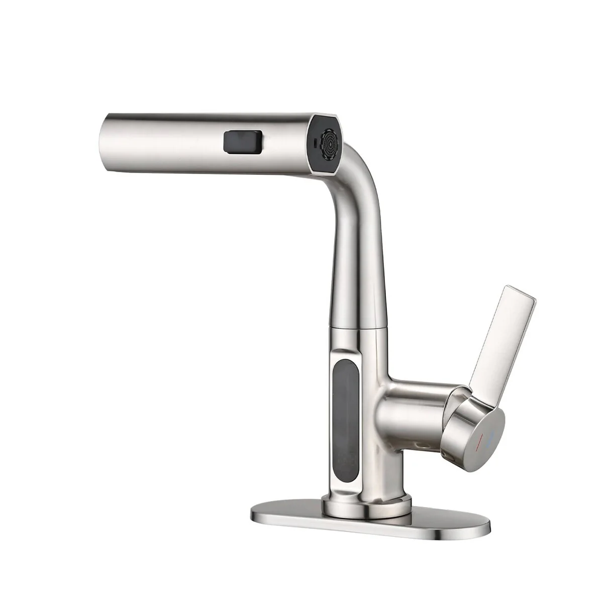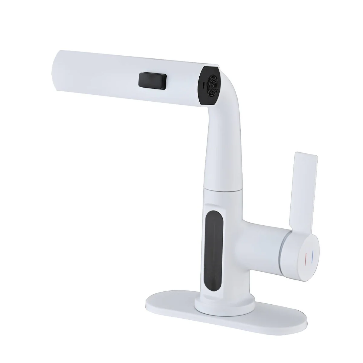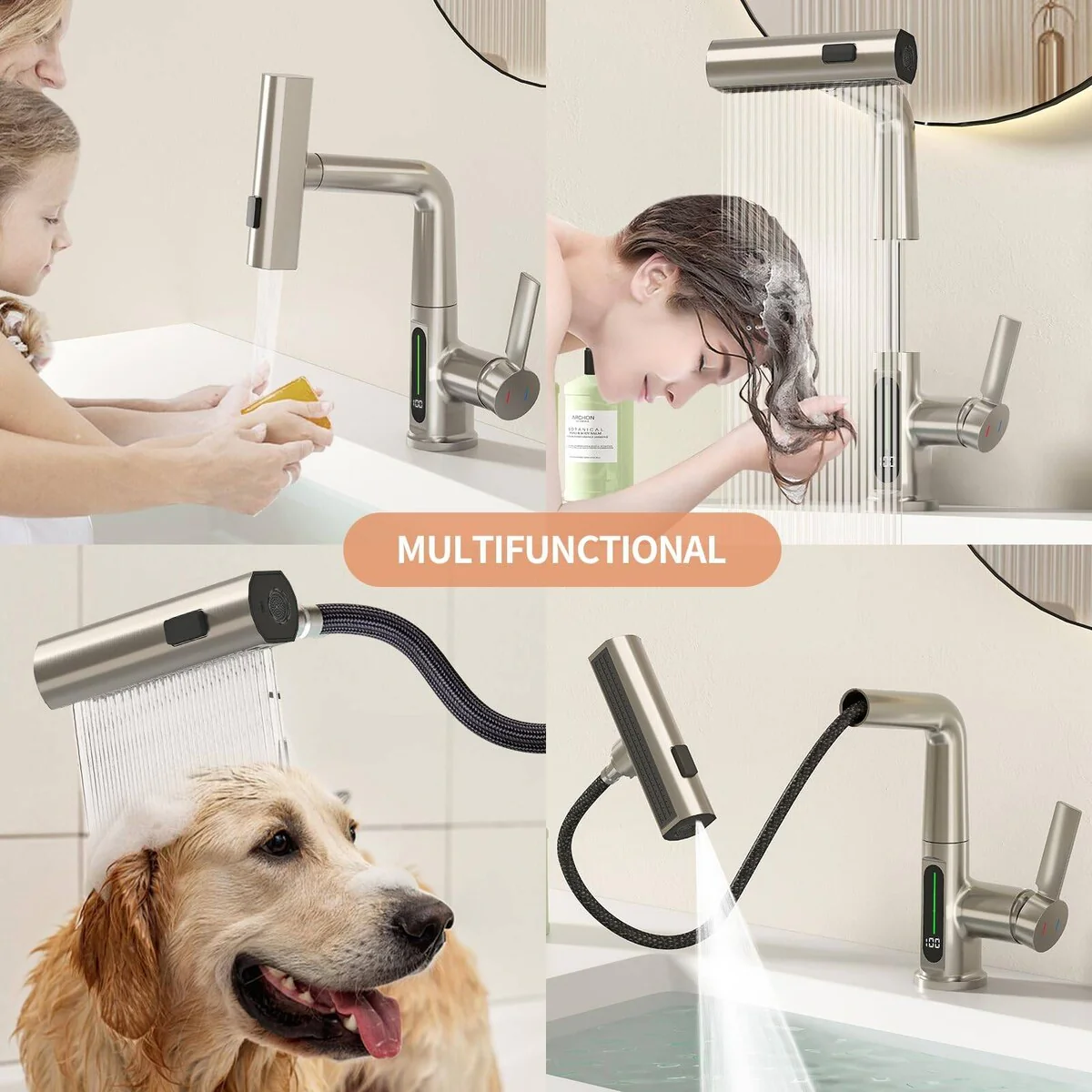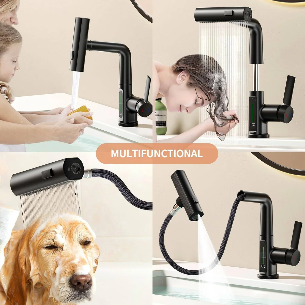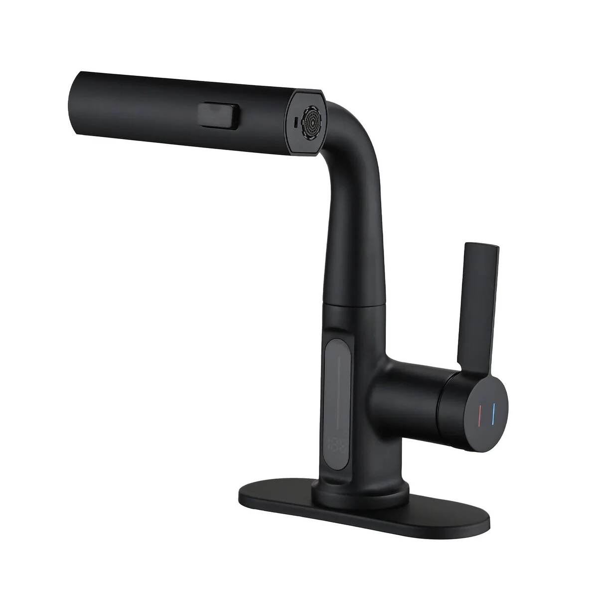 ����Pull-Out Design for Convenience�� The basin faucet with a pull-out sprayer breaks the space limitation of traditional faucets, expanding the range of water use. It is also suitable for scenarios such as washing your face, washing your hair and bathing your pet. With the gravity ball design, the hose retracts smoothly and precisely on its own.