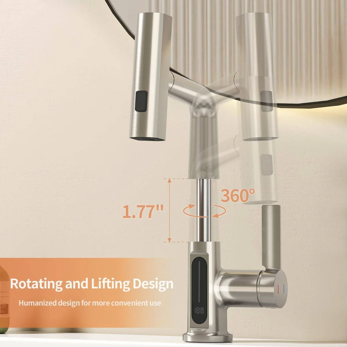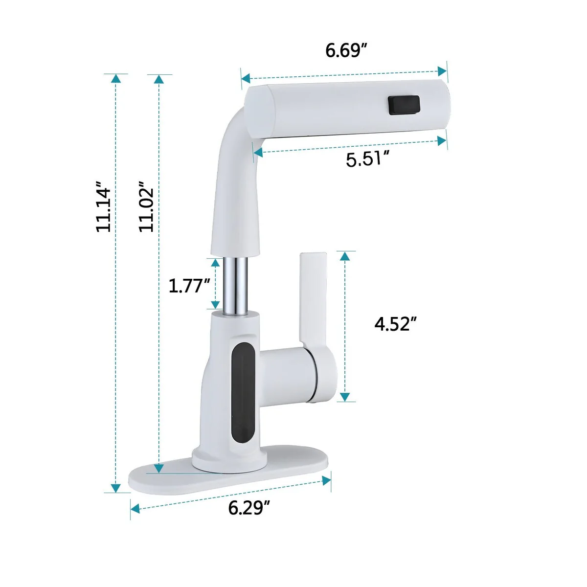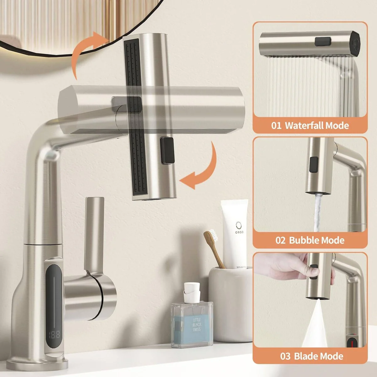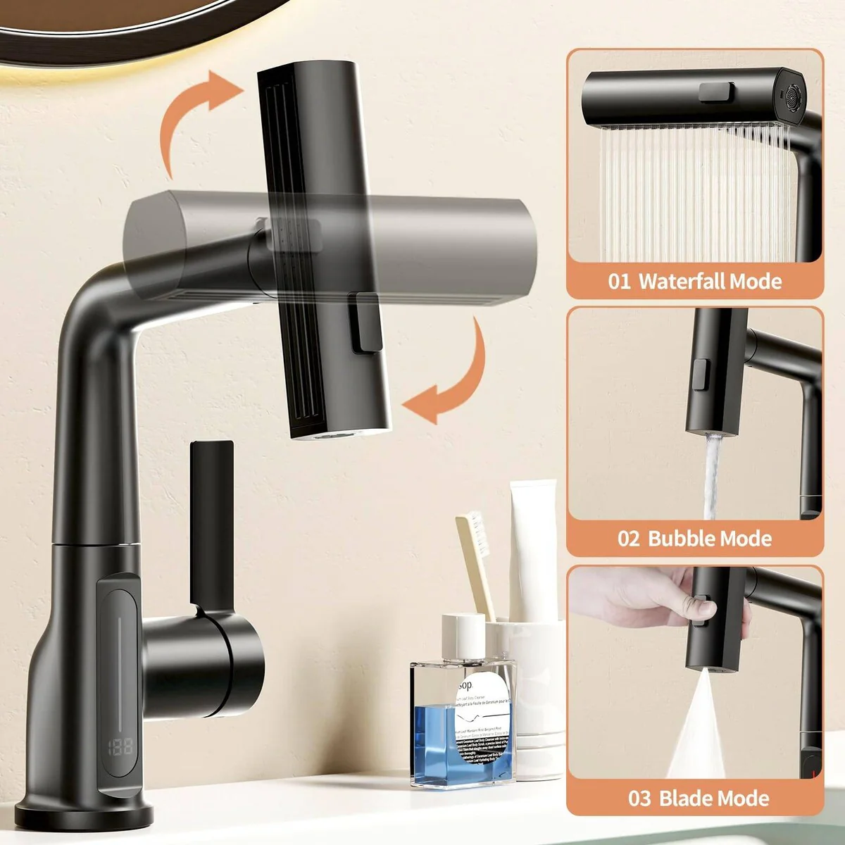 ����Pull-Out Design for Convenience�� The basin faucet with a pull-out sprayer breaks the space limitation of traditional faucets, expanding the range of water use. It is also suitable for scenarios such as washing your face, washing your hair and bathing your pet. With the gravity ball design, the hose retracts smoothly and precisely on its own.