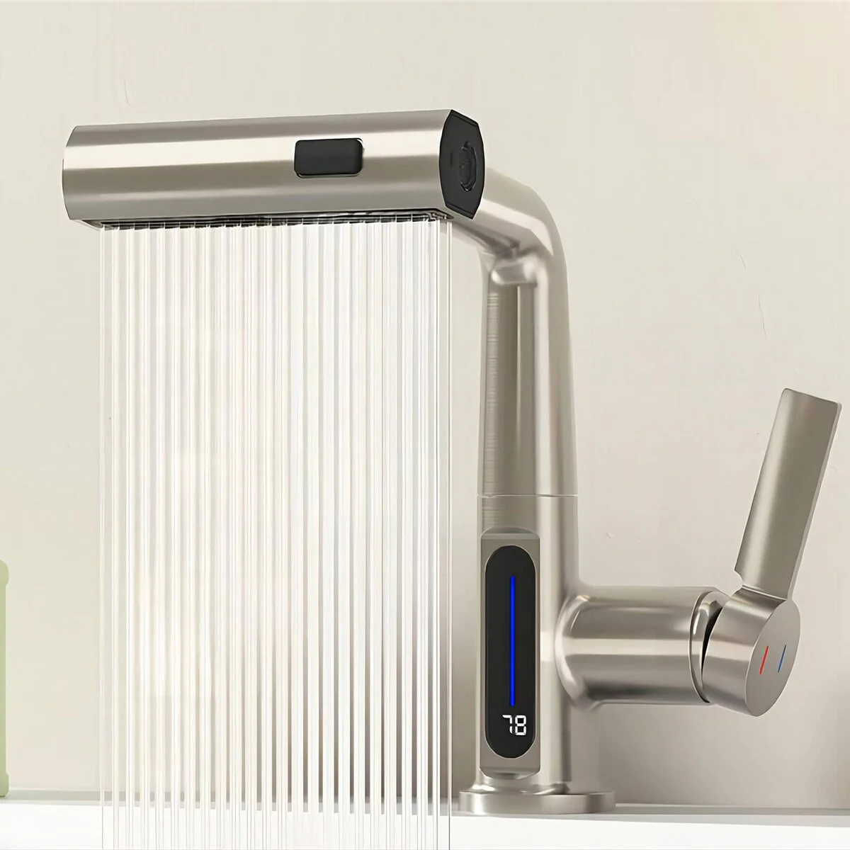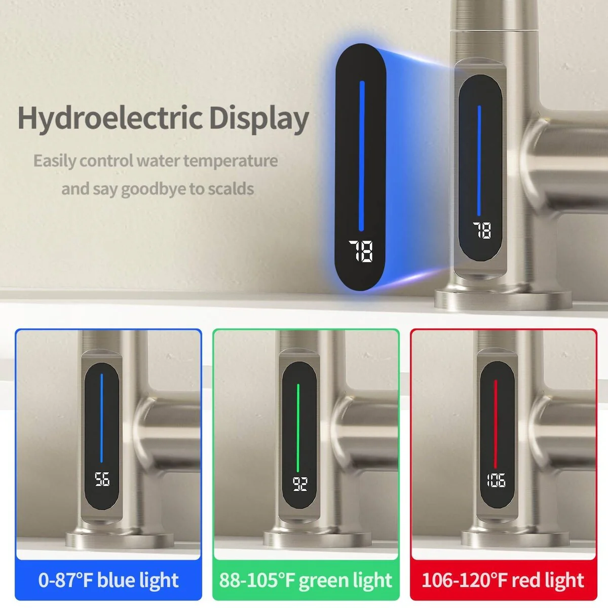 ����LED Temperature Display Basin Faucet��The bathroom faucets for sink 1 hole features an accurate temperature display. With advanced hydroelectric technology, the modern bathroom vanity faucet displays the water temperature in real time without requiring any power supply. No need to manually test the water temperature, effectively avoid being scalded, safer to use.