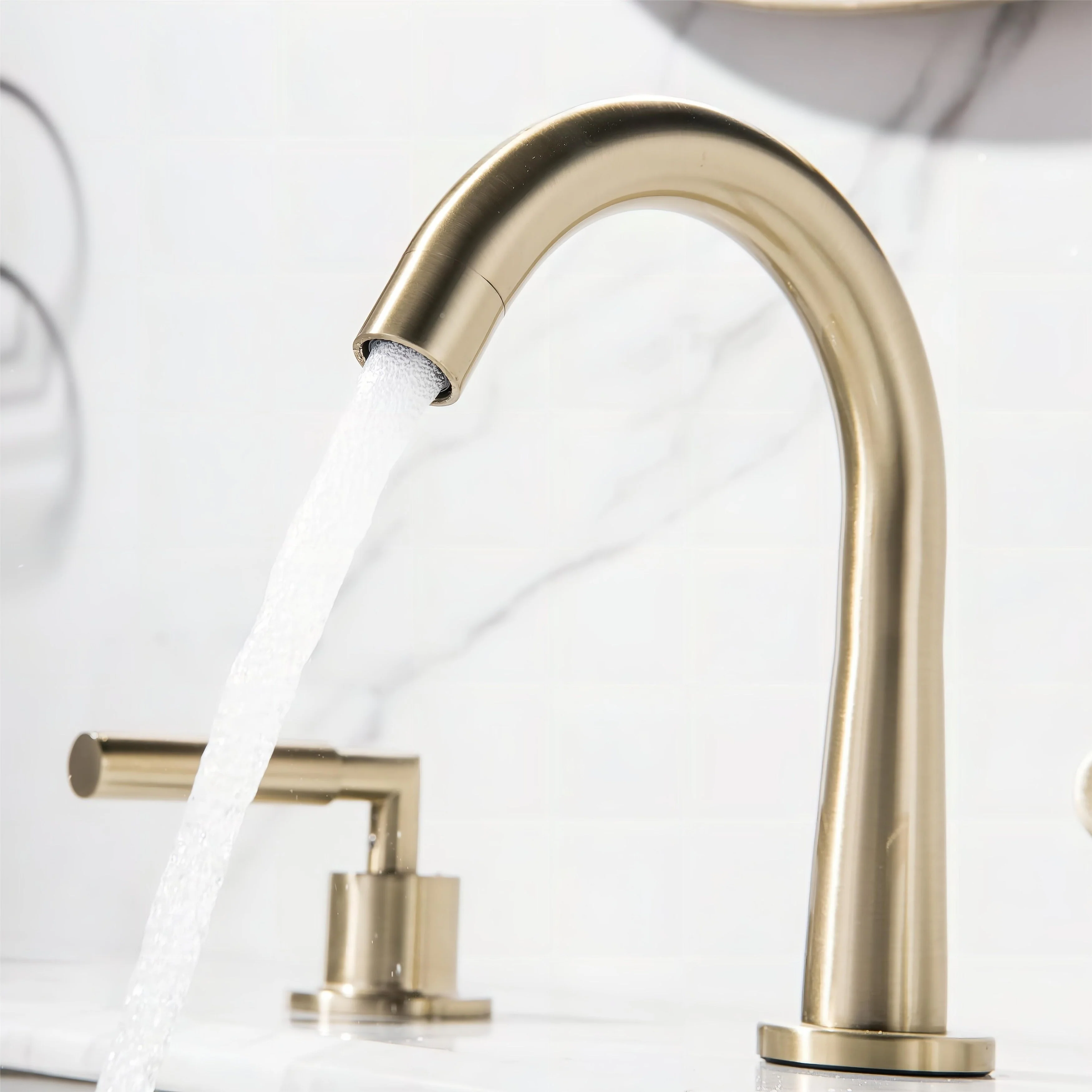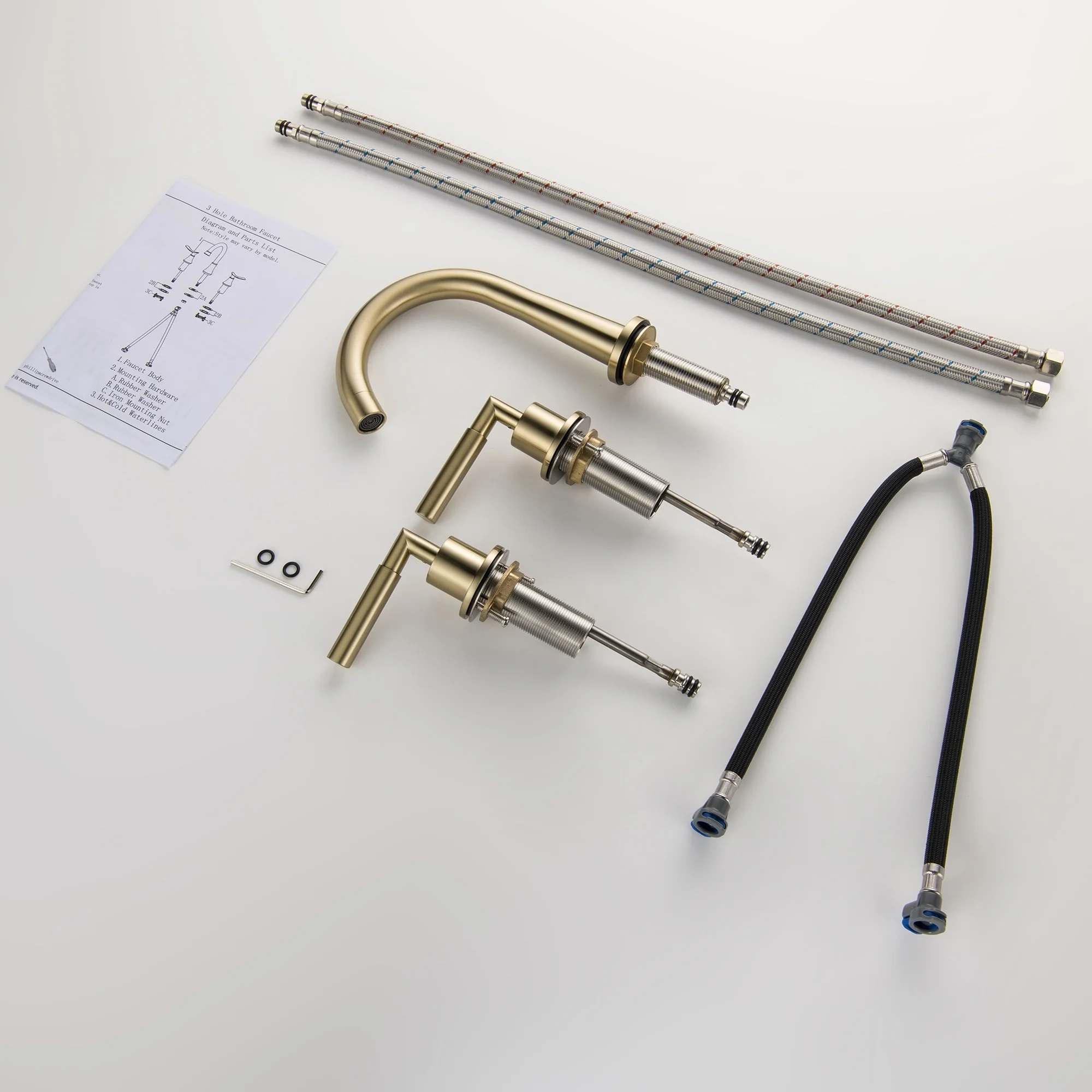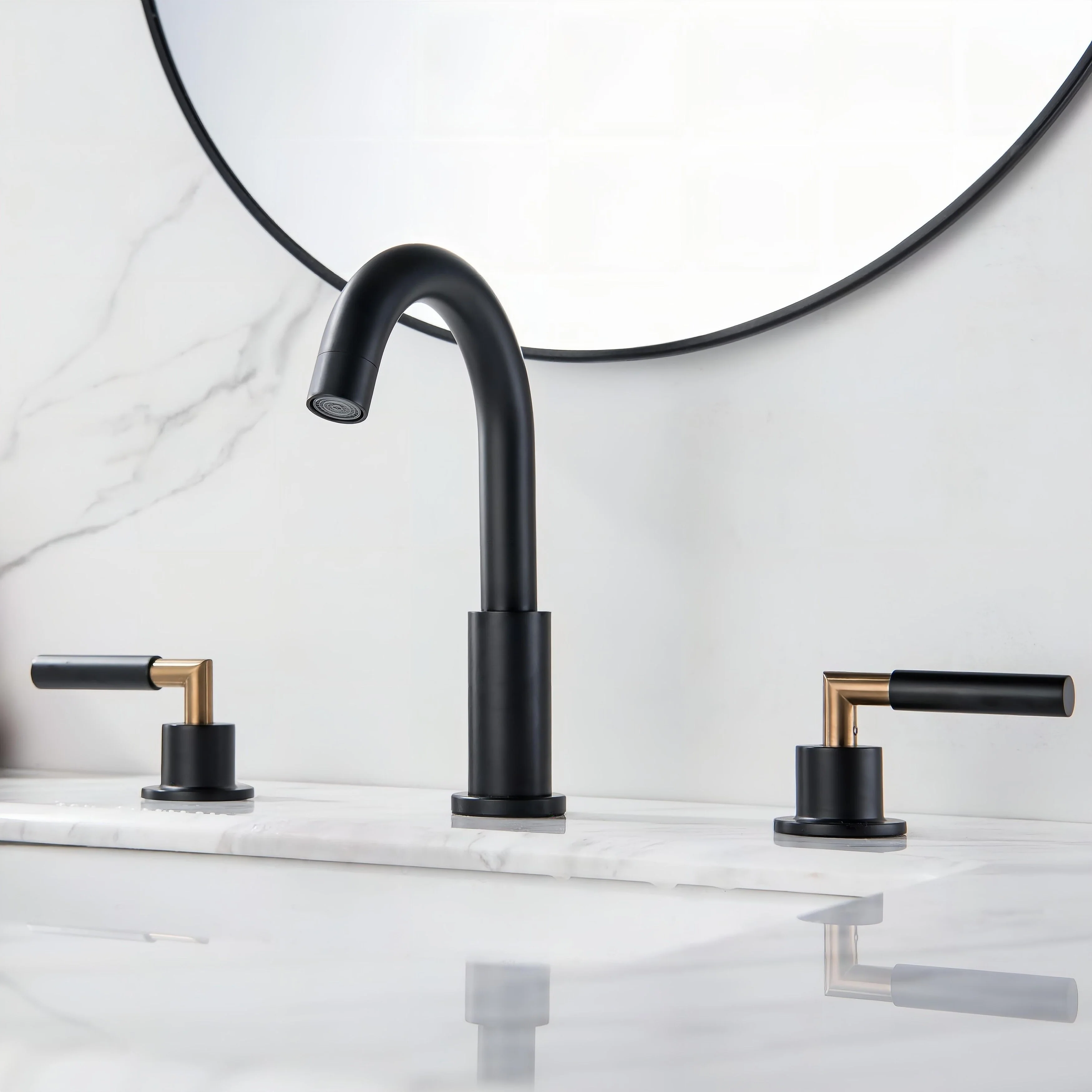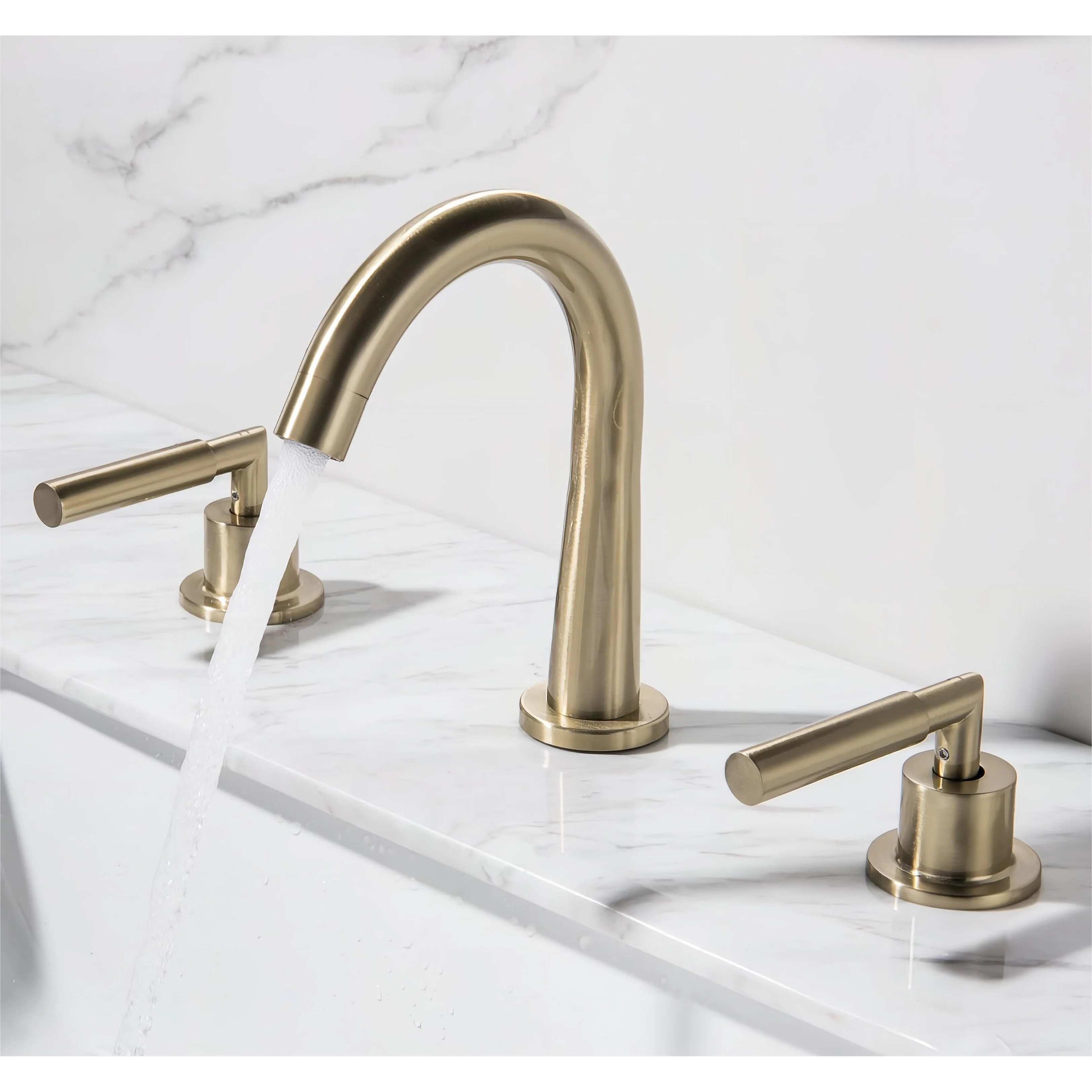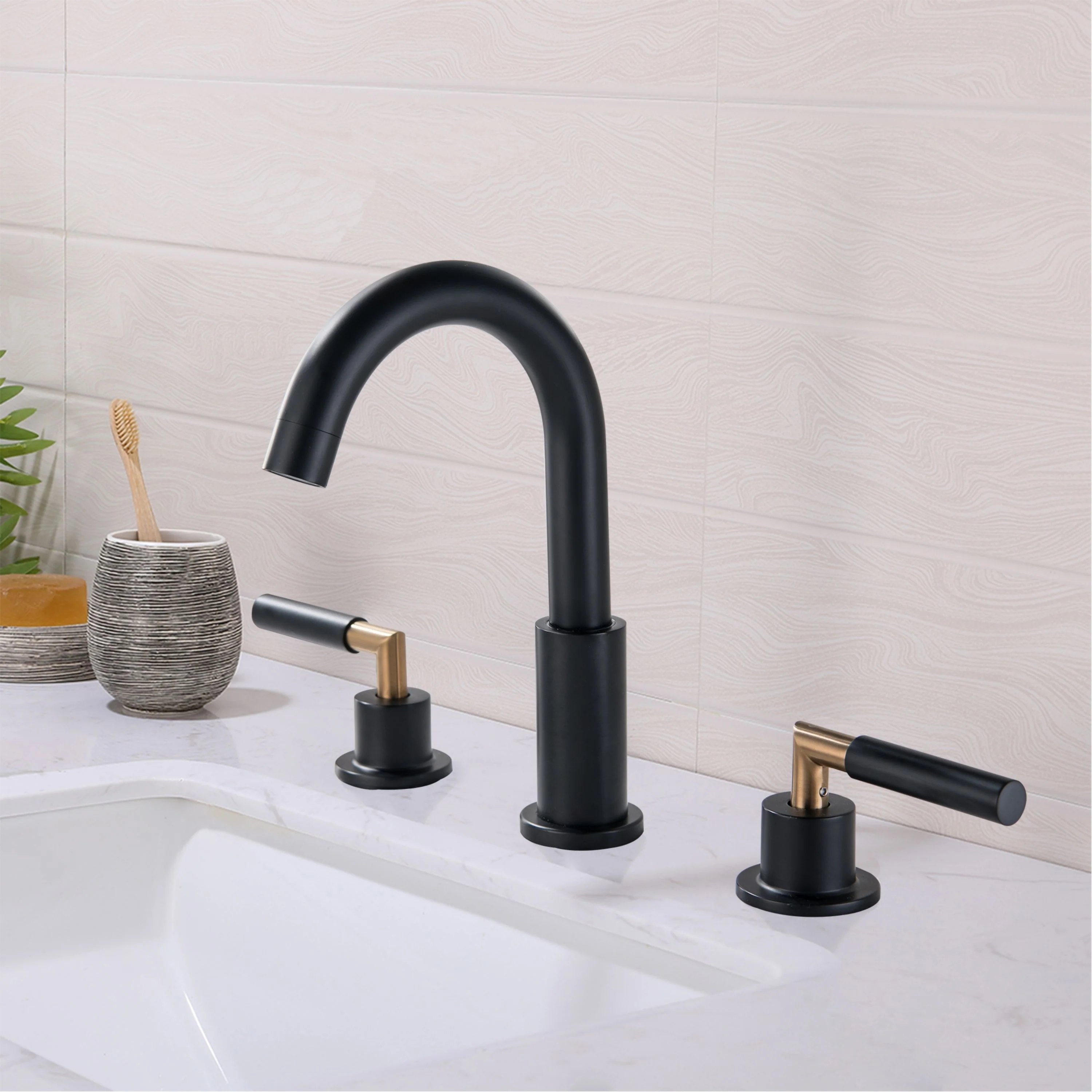Elevate your bathroom's style and functionality with our Luxury 2 Long Handles Bathroom Sink Faucet Widespread, now offered in luxurious Gold and trendy Matte Black. Its modern design is a perfect fit for any bathroom decor, adding a touch of elegance. The high-quality finish not only catches the eye but also keeps fingerprints and water spots at bay, simplifying your cleaning routine. Made from durable brass, it guarantees long-lasting durability and reliability. The leak-free ceramic disk valves ensure smooth water flow control, and with easy installation, you can enjoy its excellent performance for years. Upgrade your bathroom with this remarkable faucet today.�