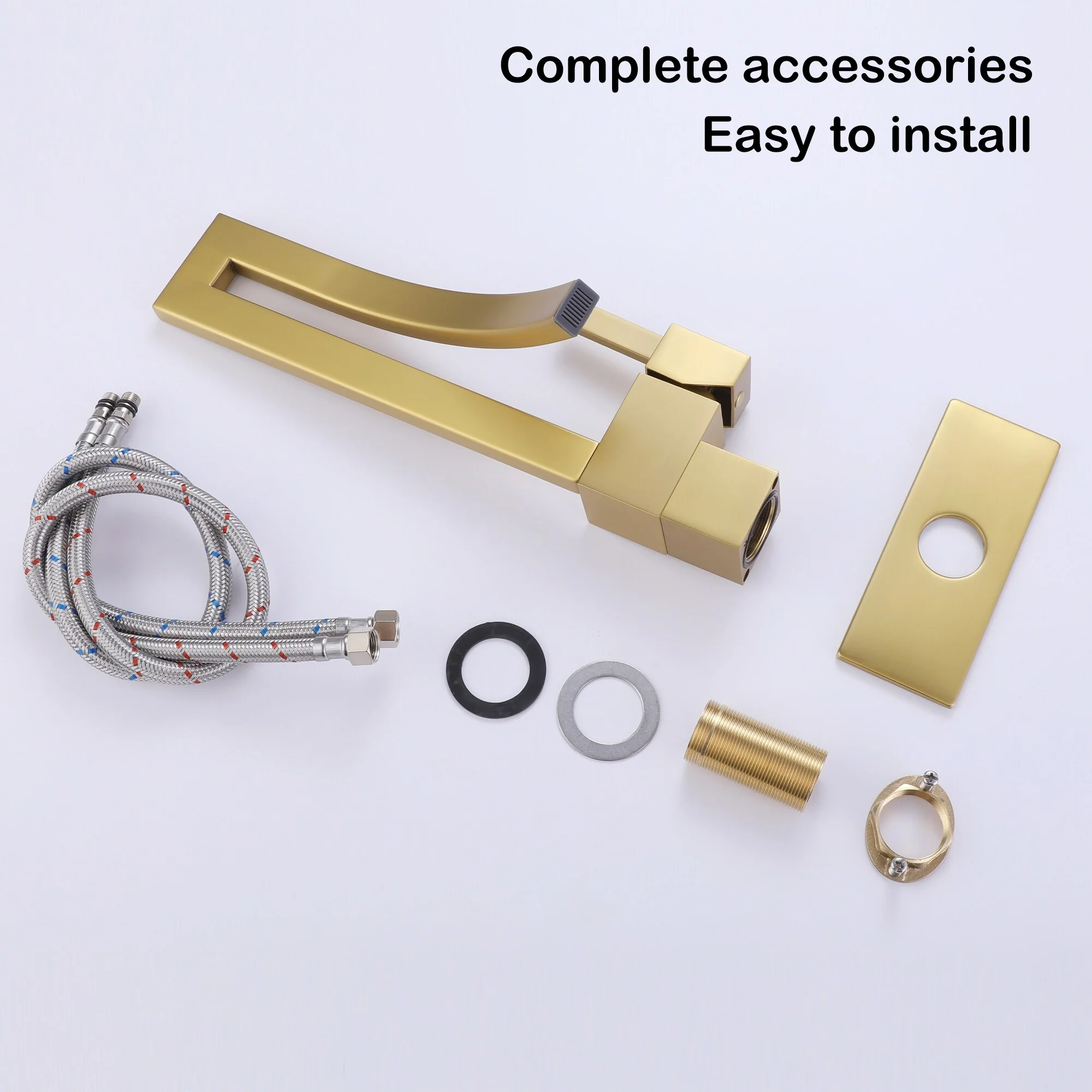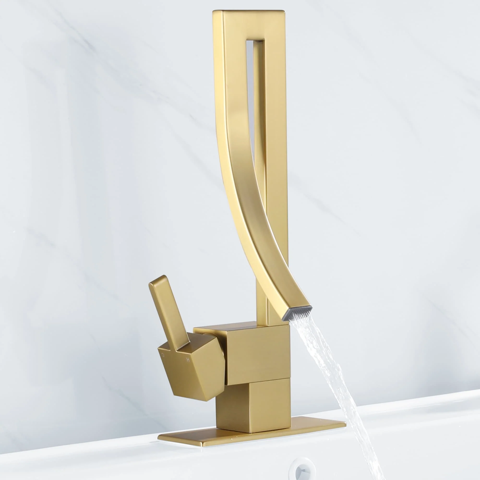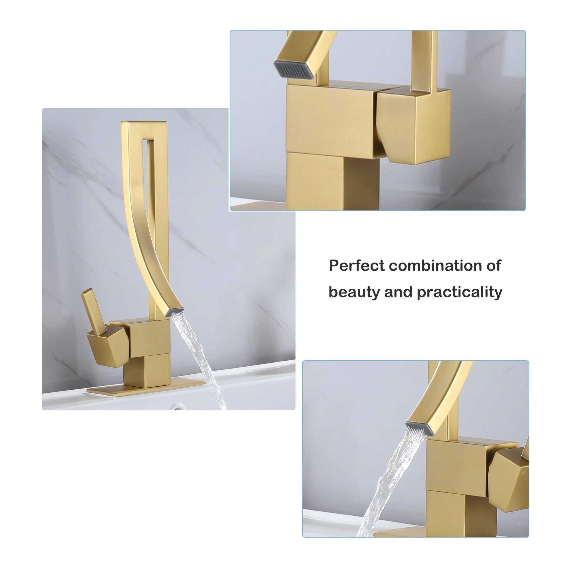 Elevate your bathroom's allure with our exquisite matte black and brushed gold bathroom sink faucet. Tailored to embrace modern aesthetics, this single-hole, single-handle faucet is a seamless fit for any bathroom sink. Constructed from premium brass, its sleek waterfall design injects a dose of elegance into your bathroom decor. The faucet's CUPC-certified ceramic spool and inlet pipe guarantee long-lasting durability and reliable performance. What's more, the electroplated coating significantly boosts its corrosion resistance, ensuring it stands the test of time. Adjusting the water temperature is a breeze with the lift-up faucet handle. This faucet is an ideal choice for those who value both style and functionality. It's an essential addition to any contemporary bathroom, making it a must-have item.