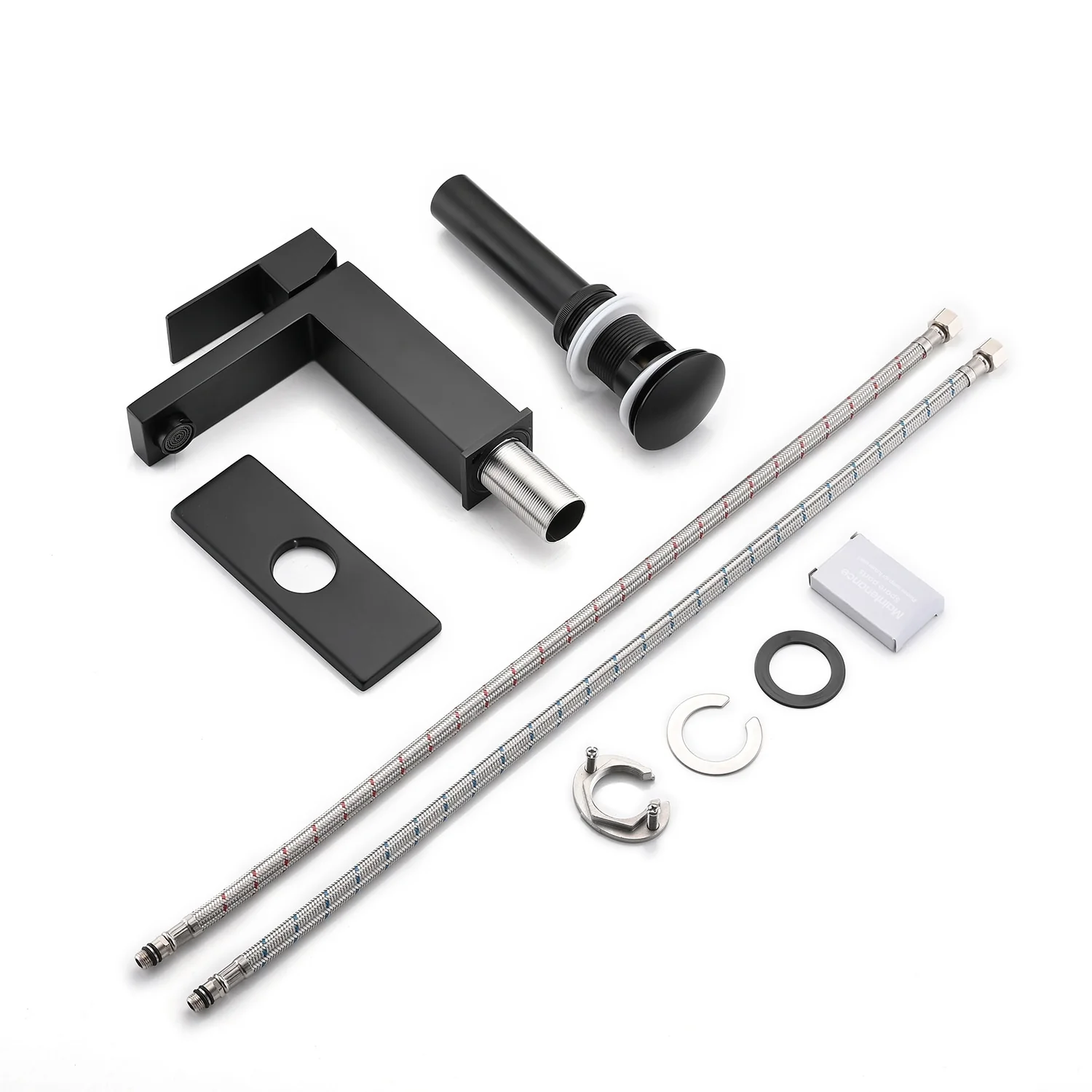 - All parts ready for Installtion. Quick connect fitting hose, pop-up drain assembly and faucet supply hoses included.