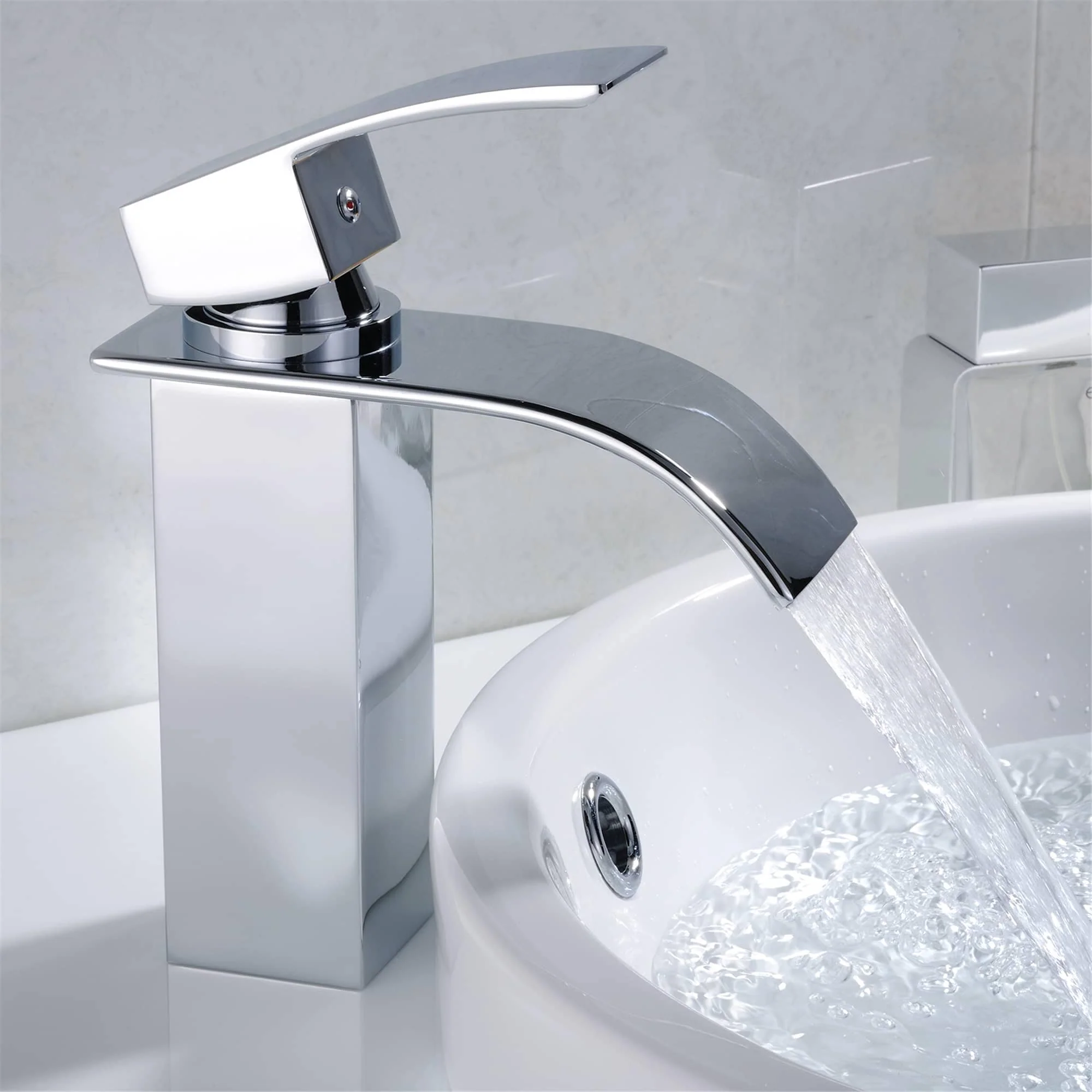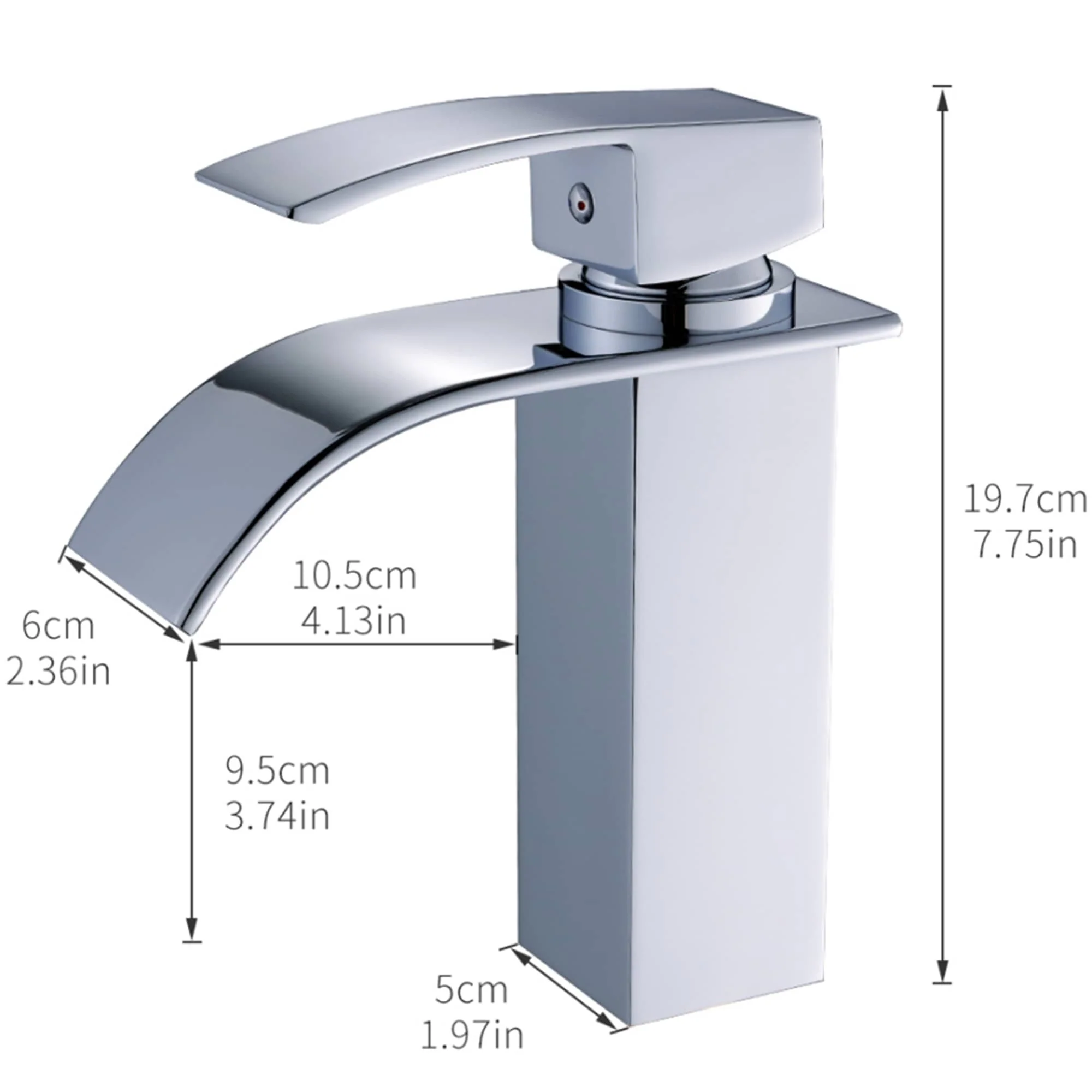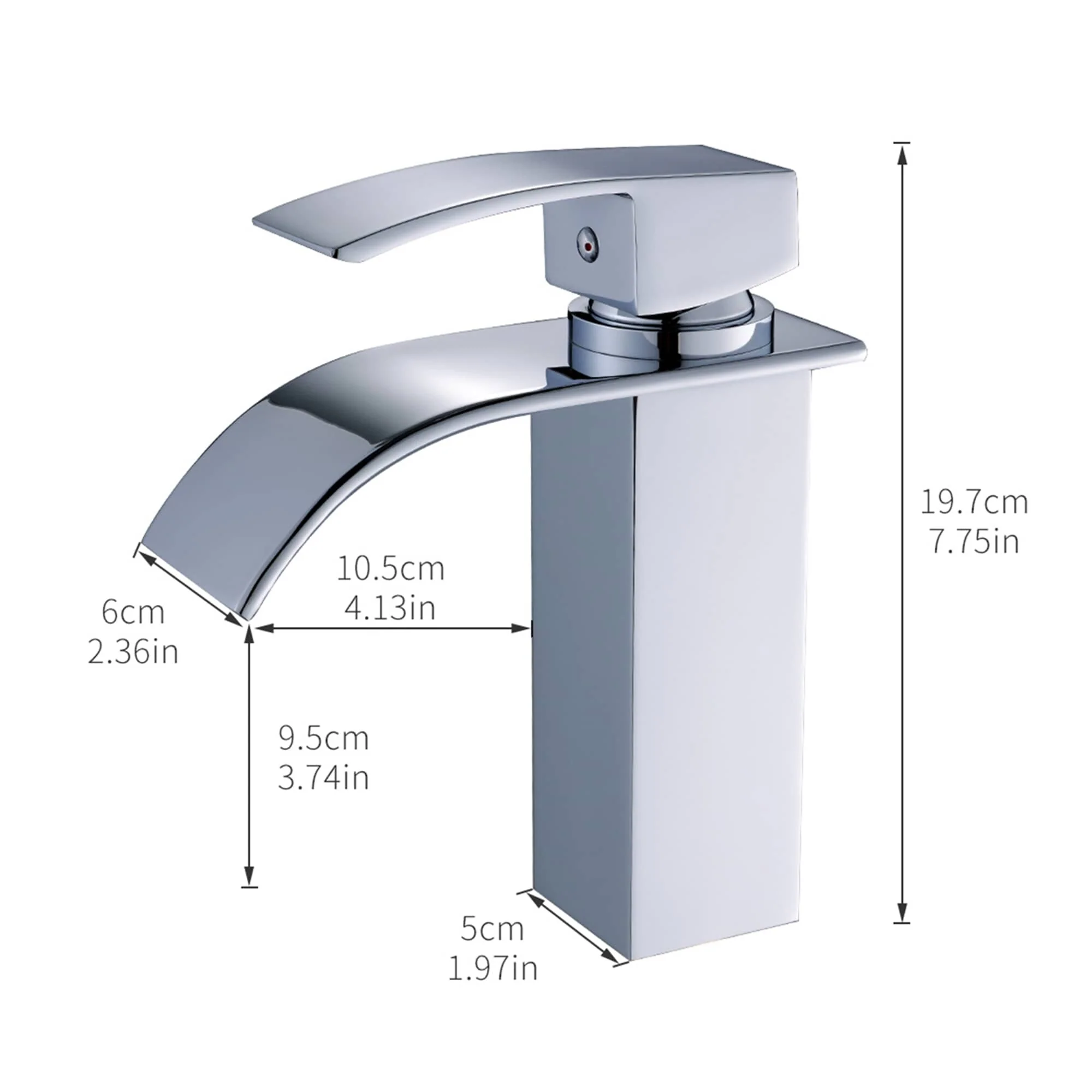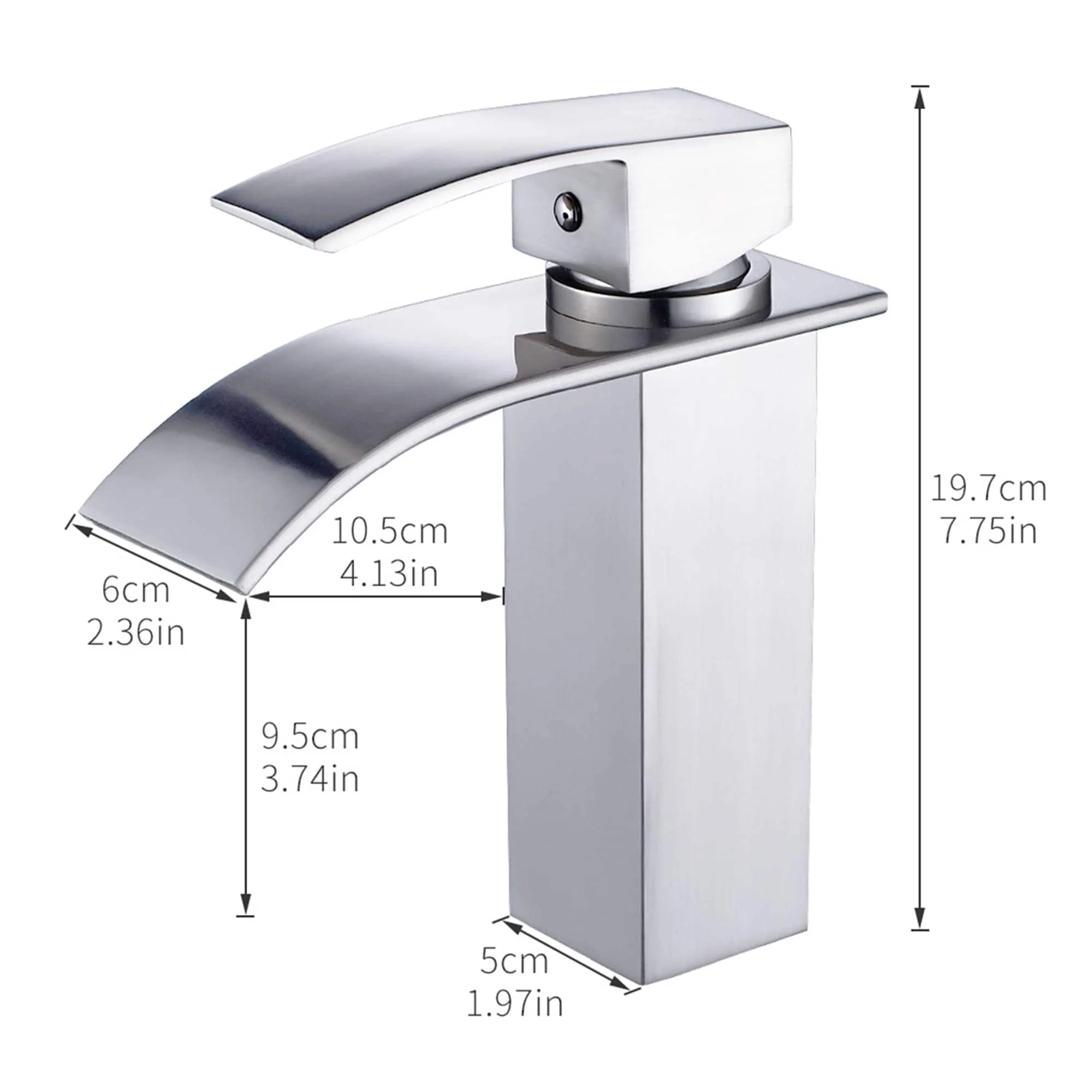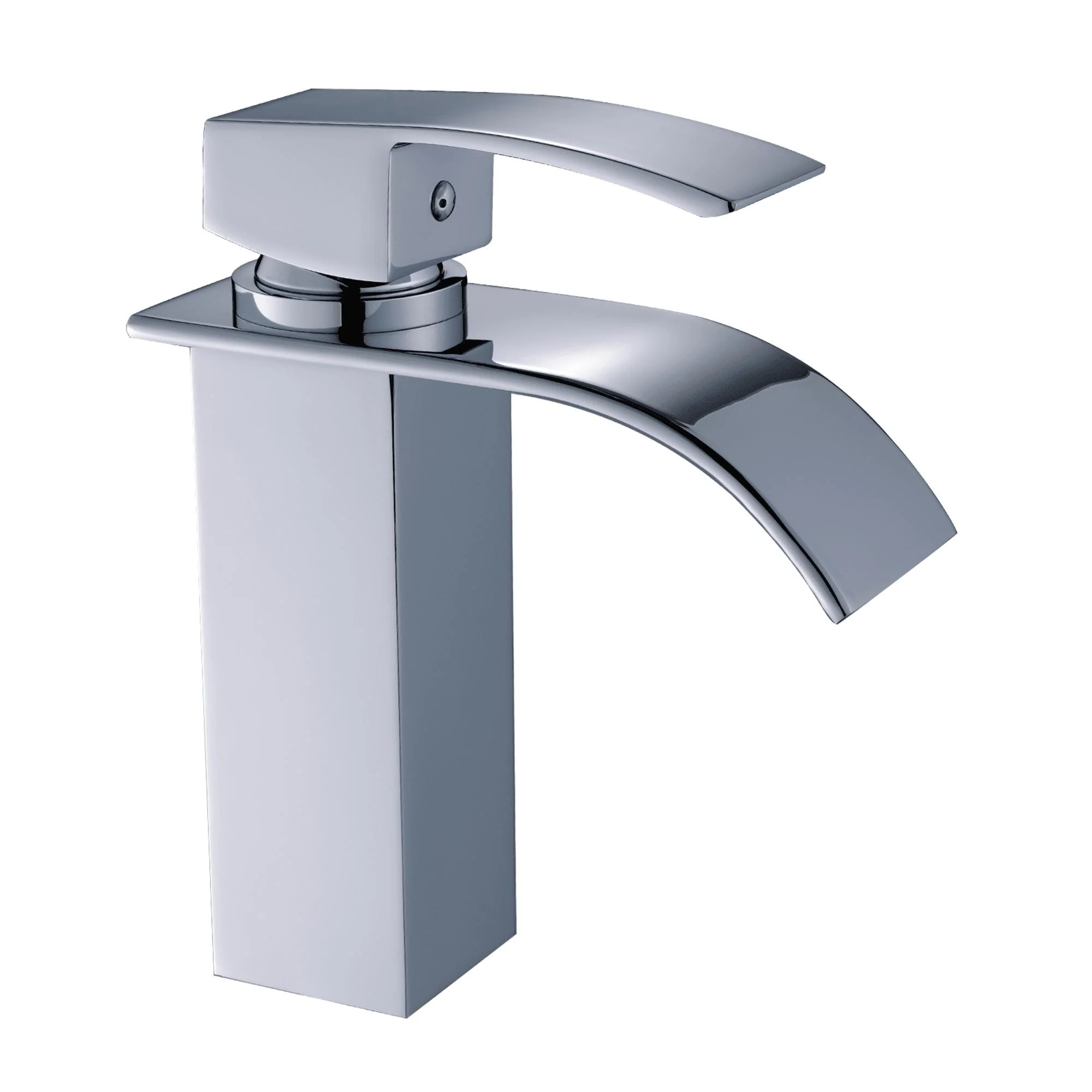 Chic style meets clean design to create this modern, minimalist siangle handle bathroom sink faucet. It features crisp lines and right angles throughout the simple square body to suit hospitality or residential settings flawlessly. With a waterfall spout, it sends water cascading down into the sink and makes a beautiful waterfall statement. Boasting a flat handle atop the body, it is a breeze to adjust the water flow and temperature precisely. Made from solid brass in superior finish, this sink faucet for bathroom is a durable and attractive piece to renew your bathroom with contemporary appeal.