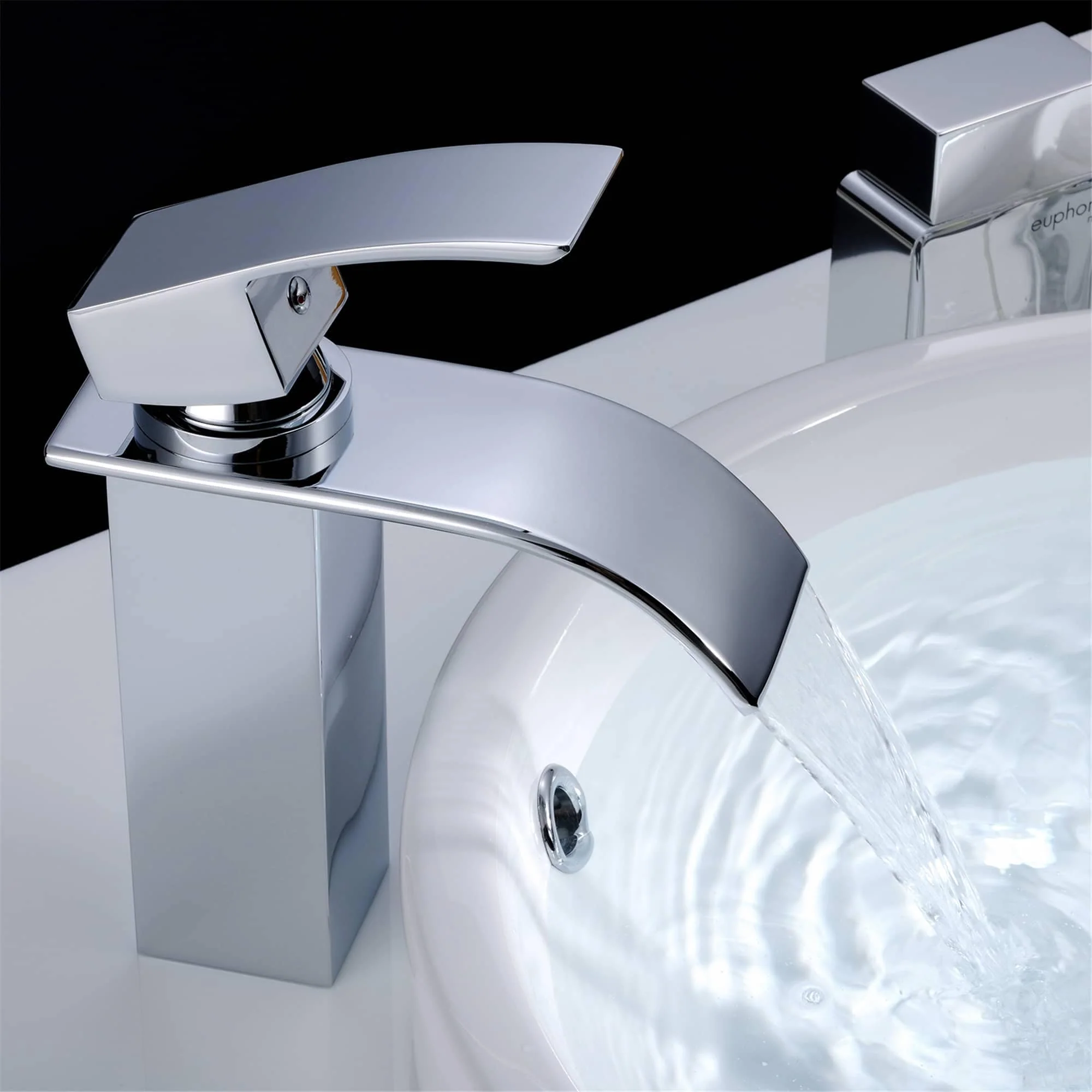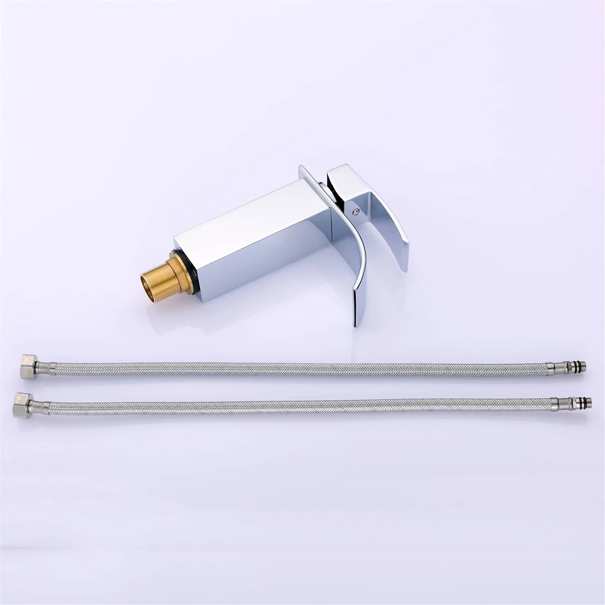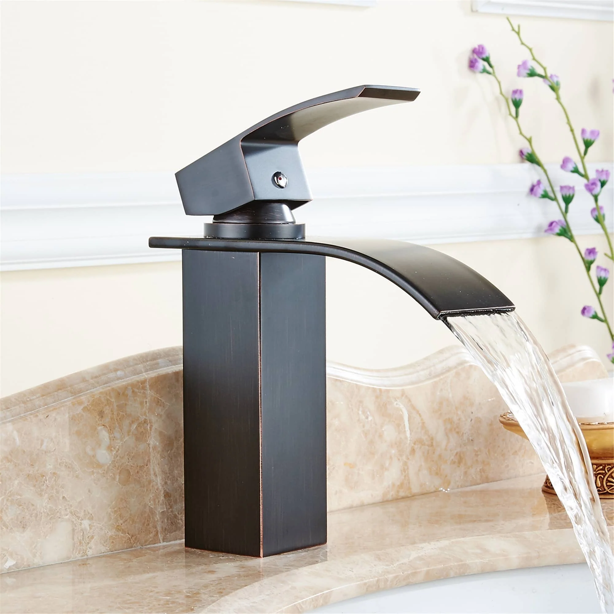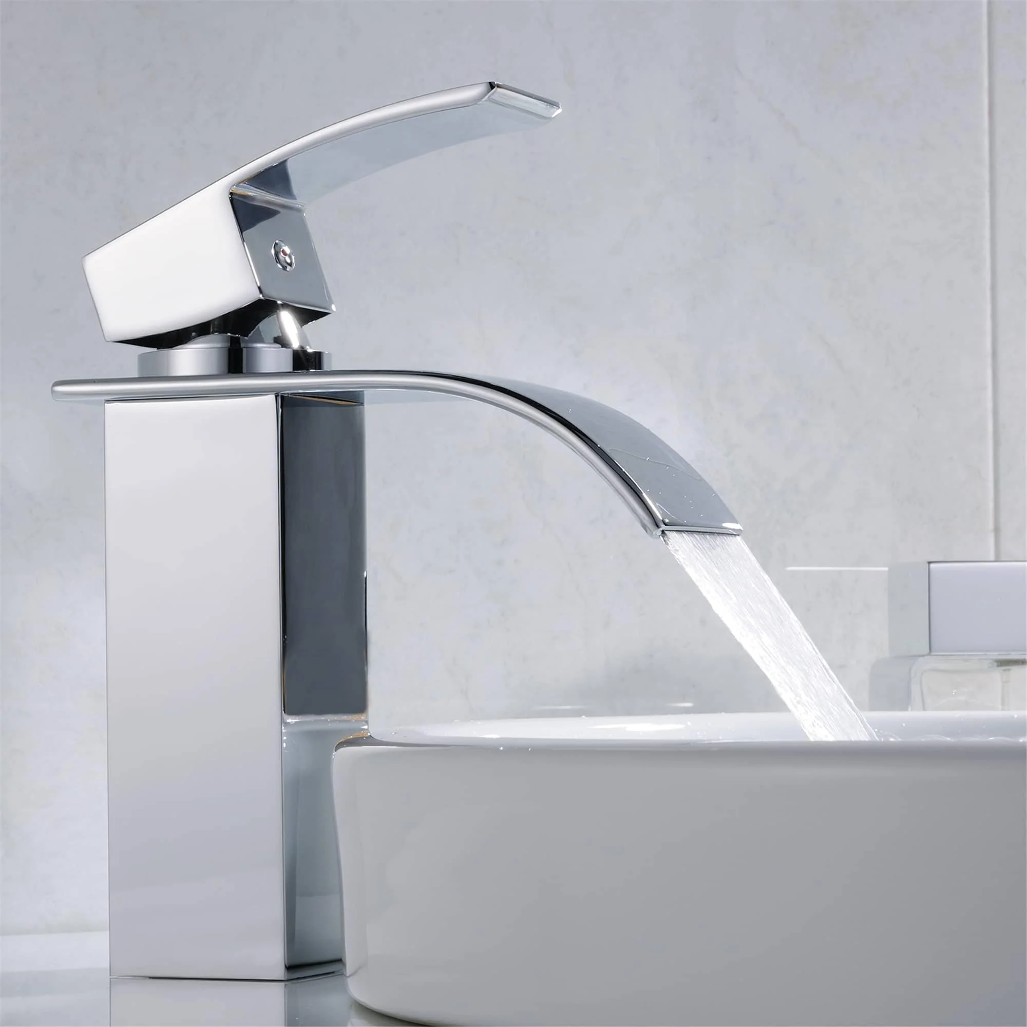 Chic style meets clean design to create this modern, minimalist siangle handle bathroom sink faucet. It features crisp lines and right angles throughout the simple square body to suit hospitality or residential settings flawlessly. With a waterfall spout, it sends water cascading down into the sink and makes a beautiful waterfall statement. Boasting a flat handle atop the body, it is a breeze to adjust the water flow and temperature precisely. Made from solid brass in superior finish, this sink faucet for bathroom is a durable and attractive piece to renew your bathroom with contemporary appeal.
