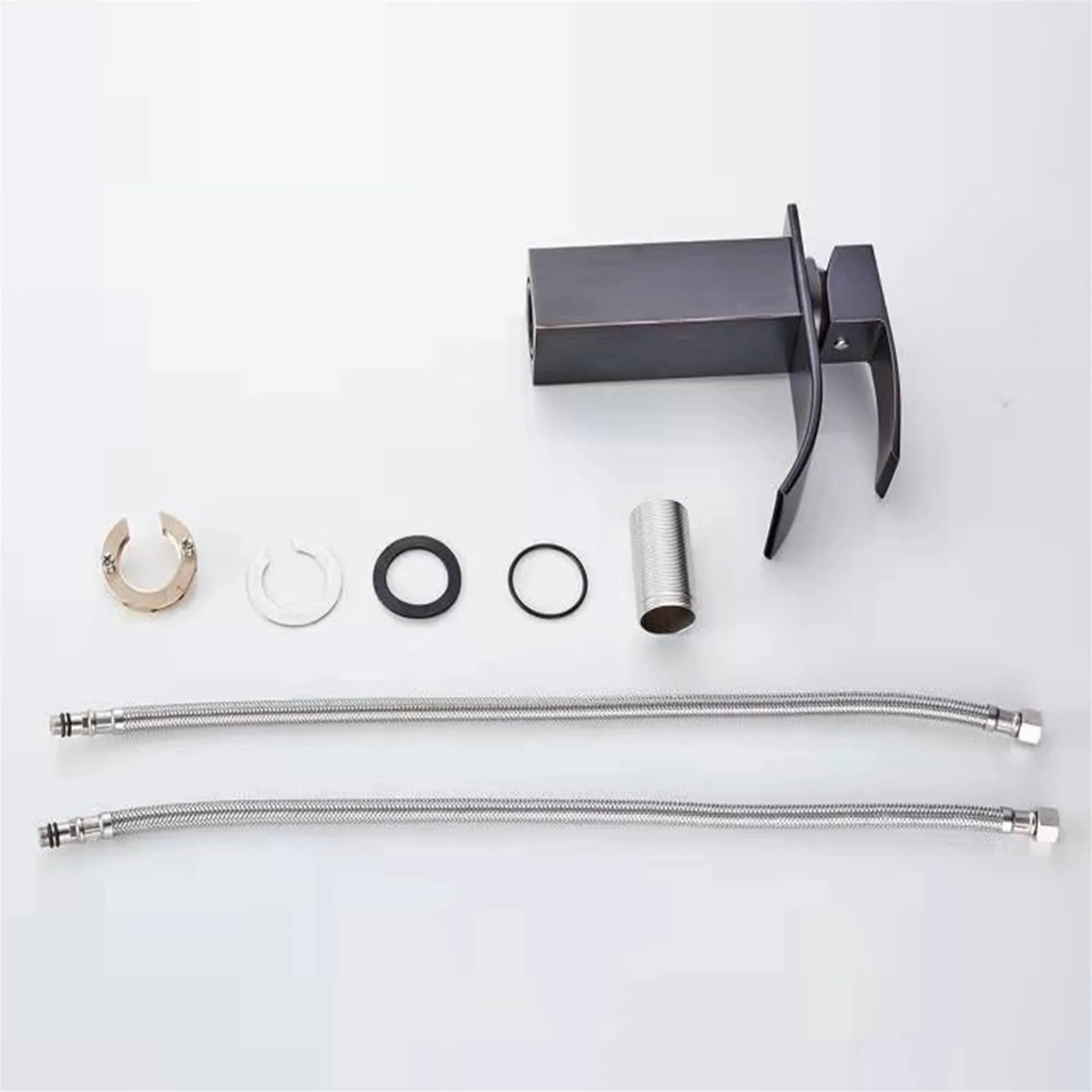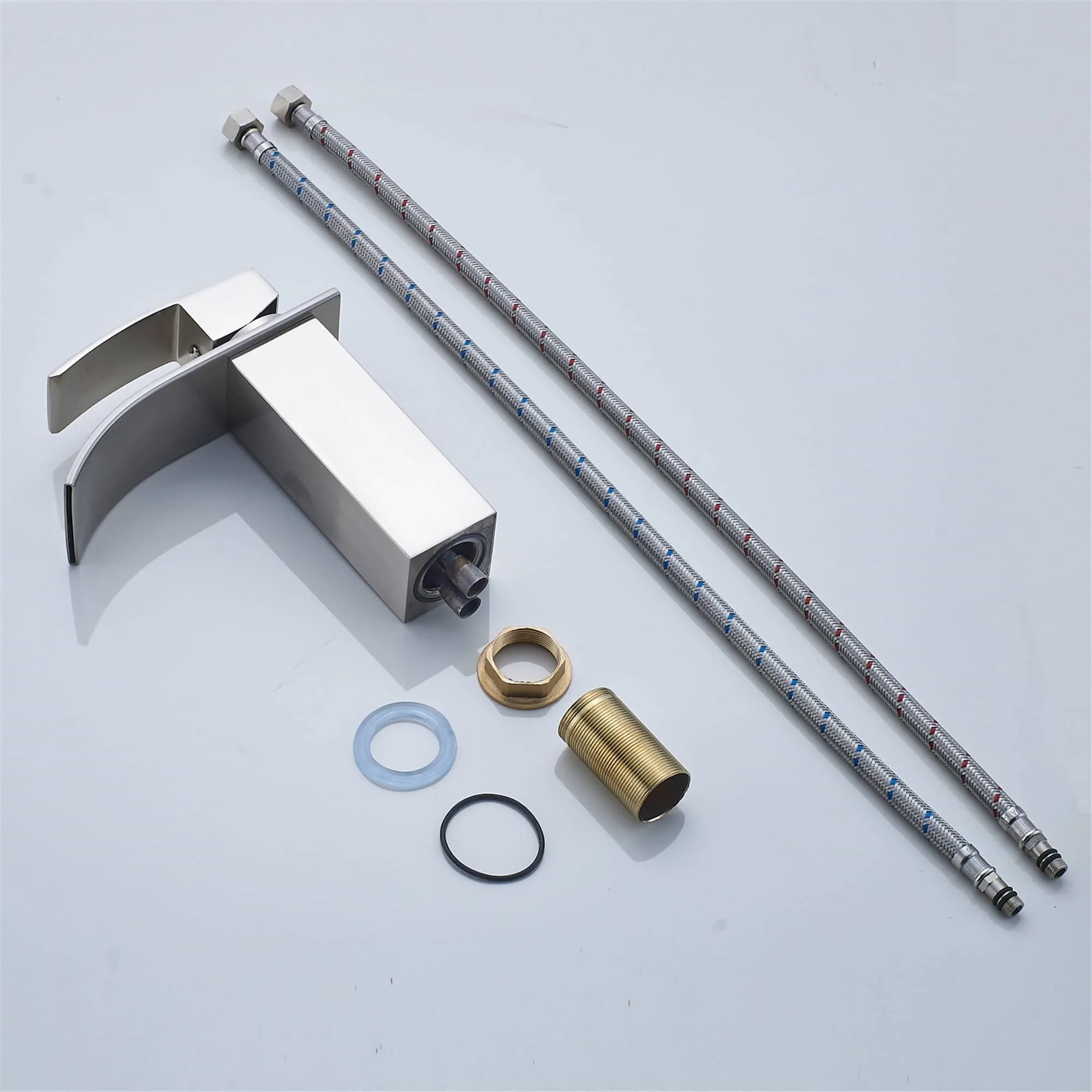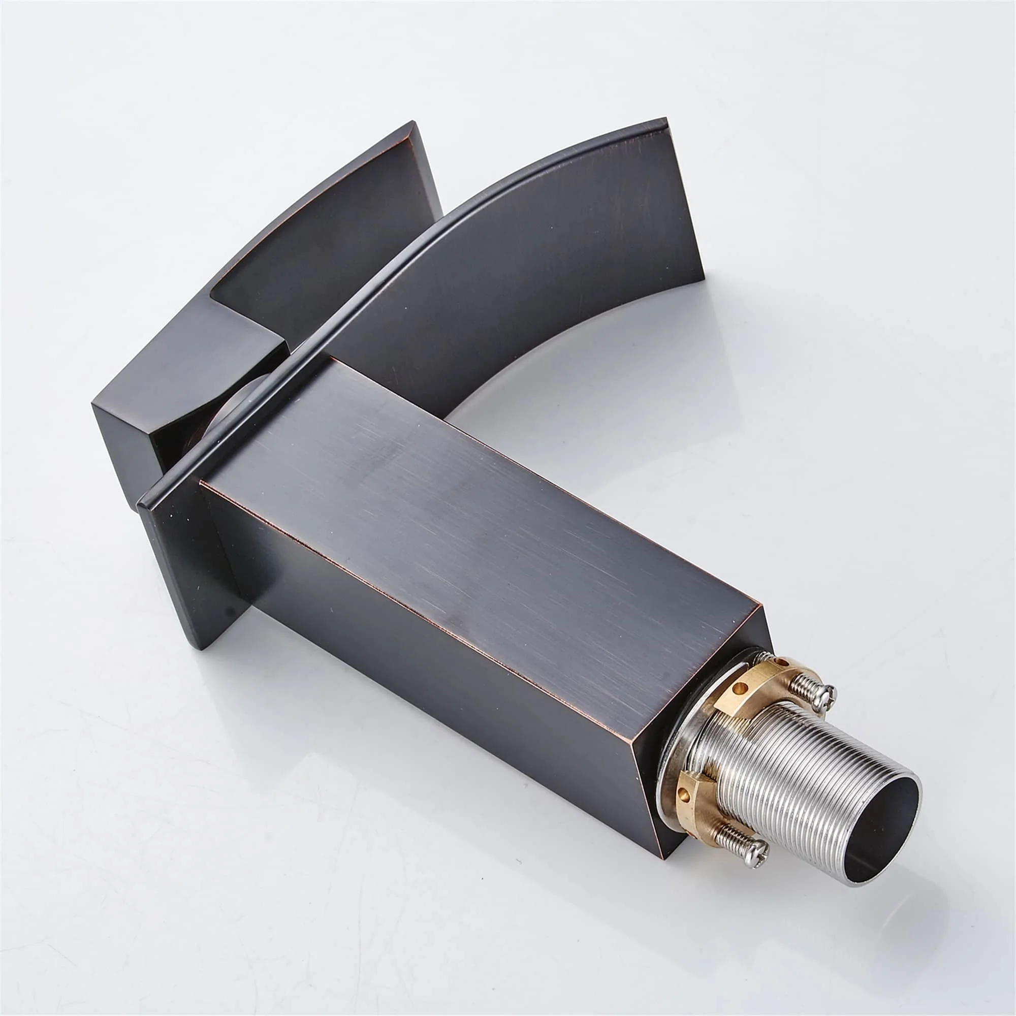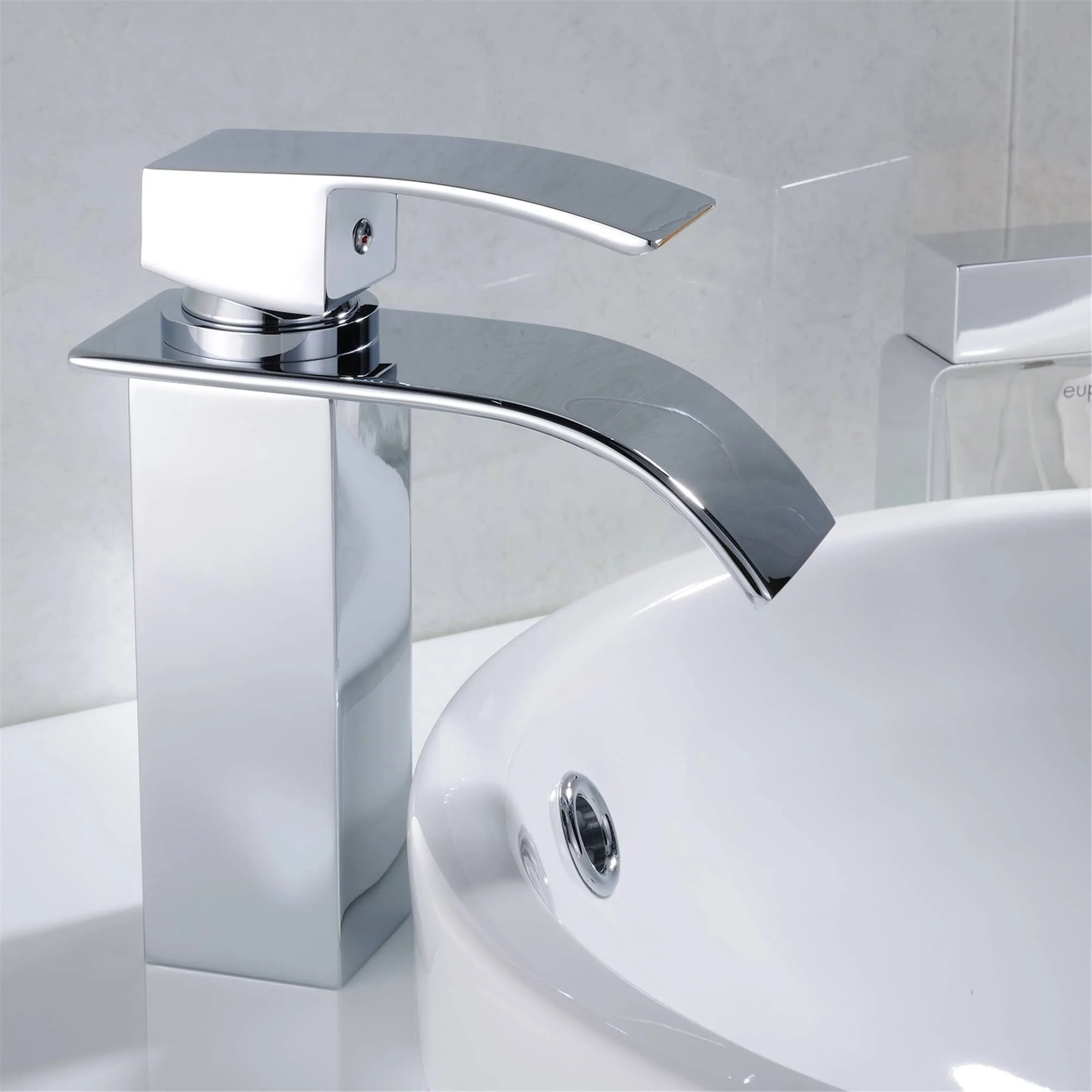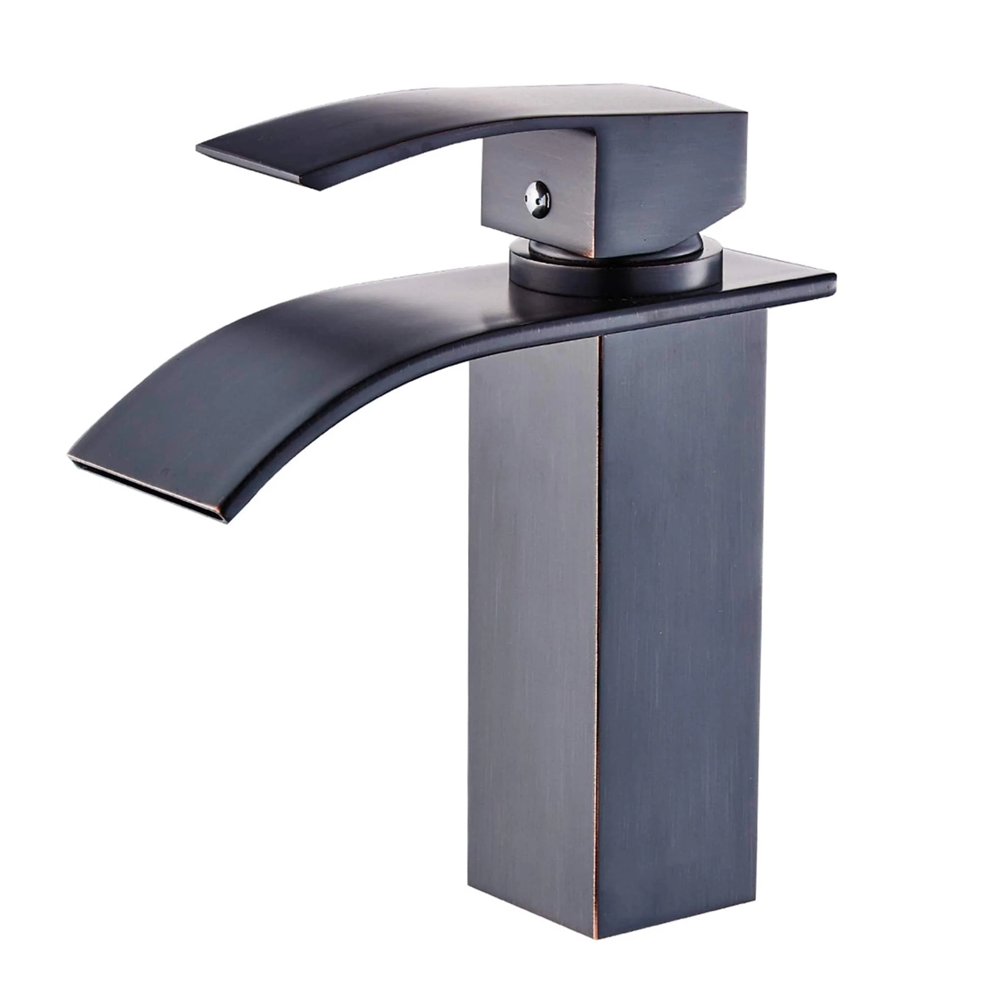 Chic style meets clean design to create this modern, minimalist siangle handle bathroom sink faucet. It features crisp lines and right angles throughout the simple square body to suit hospitality or residential settings flawlessly. With a waterfall spout, it sends water cascading down into the sink and makes a beautiful waterfall statement. Boasting a flat handle atop the body, it is a breeze to adjust the water flow and temperature precisely. Made from solid brass in superior finish, this sink faucet for bathroom is a durable and attractive piece to renew your bathroom with contemporary appeal.