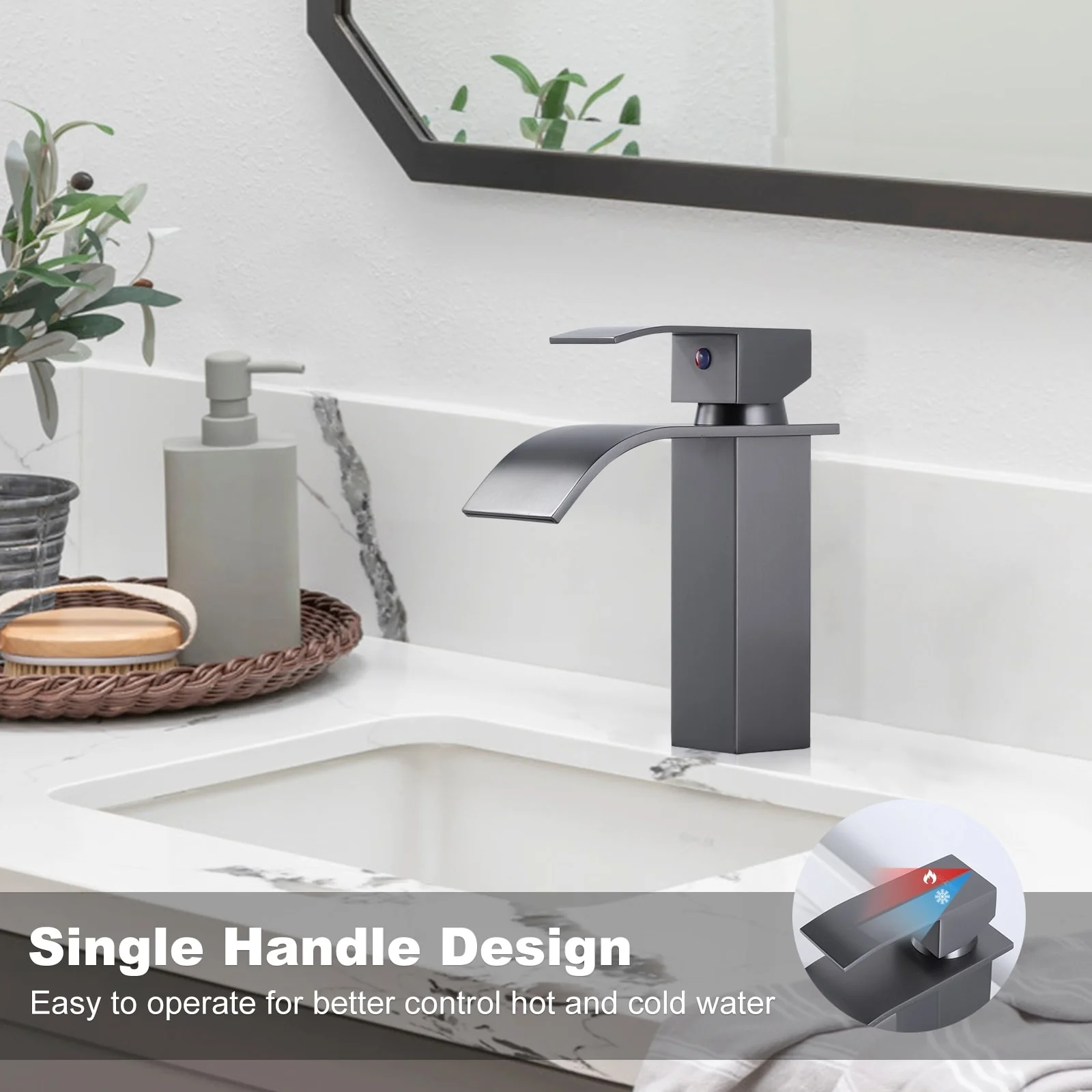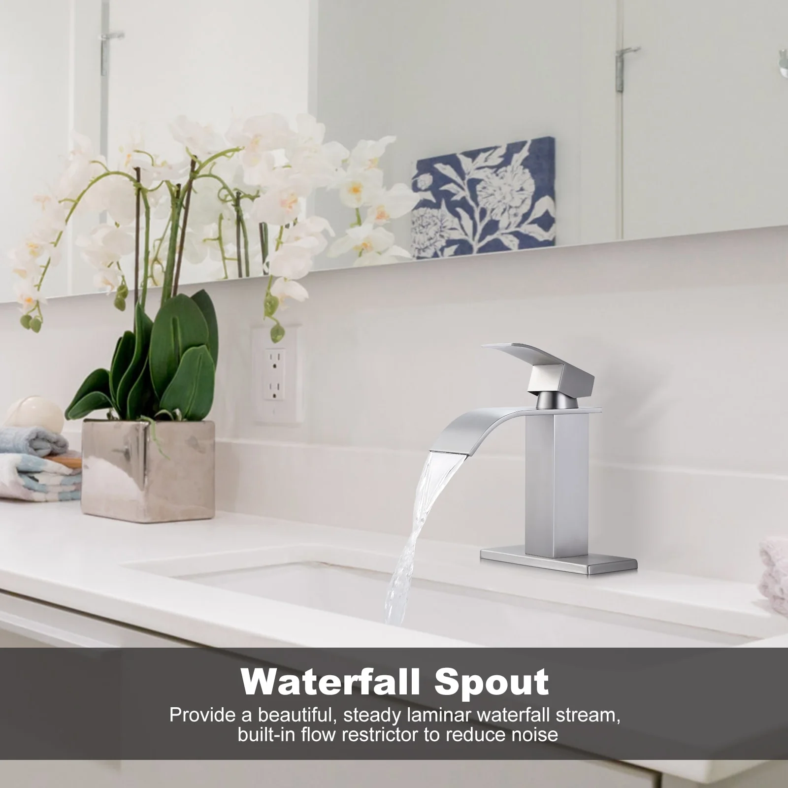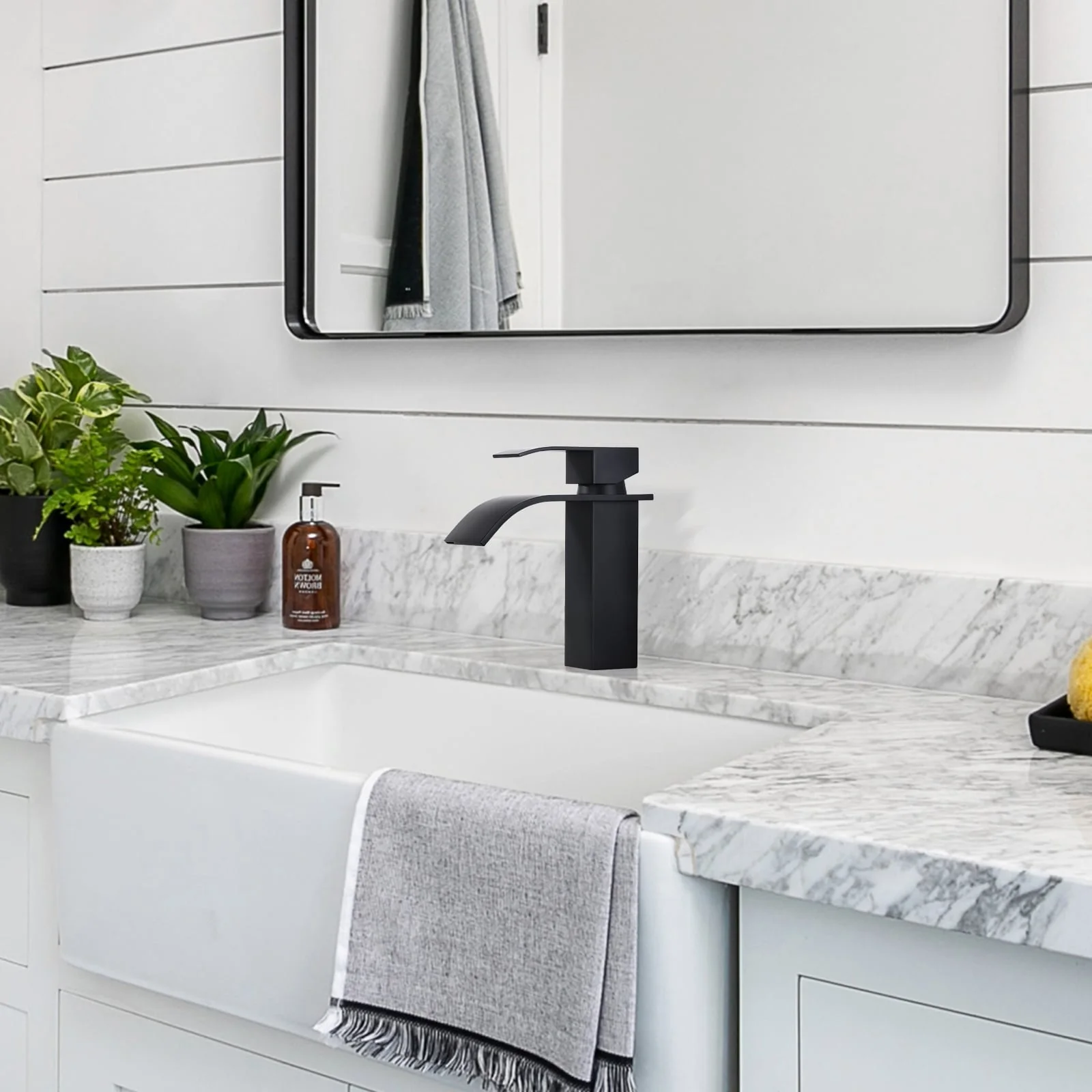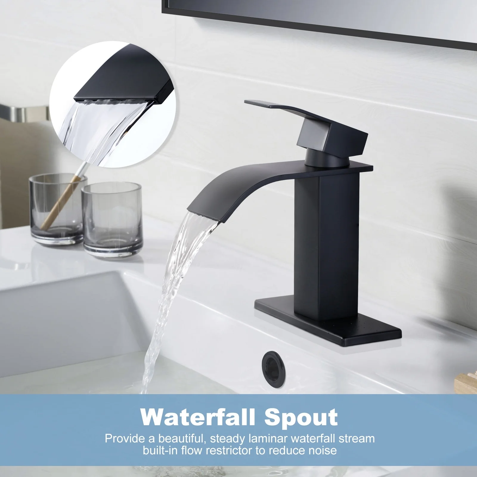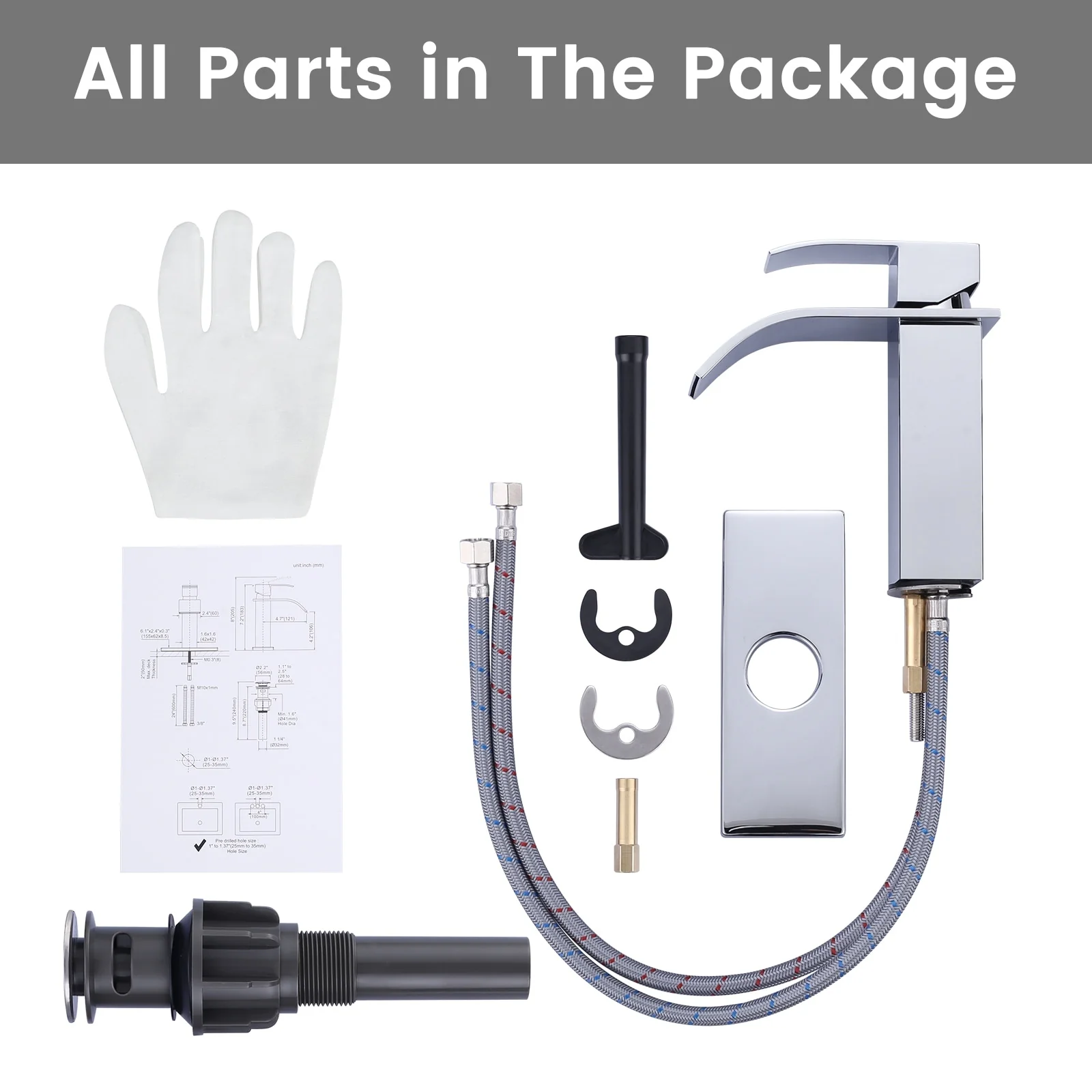 Single-handle waterfall-style bathroom faucet can effectively enhance the elegance of your bathroom. With a waterfall spout, water flows smoothly with a gentle lift of the handle, providing a quiet and elegant experience. The included drain makes water drainage easy and efficient with a simple press.
