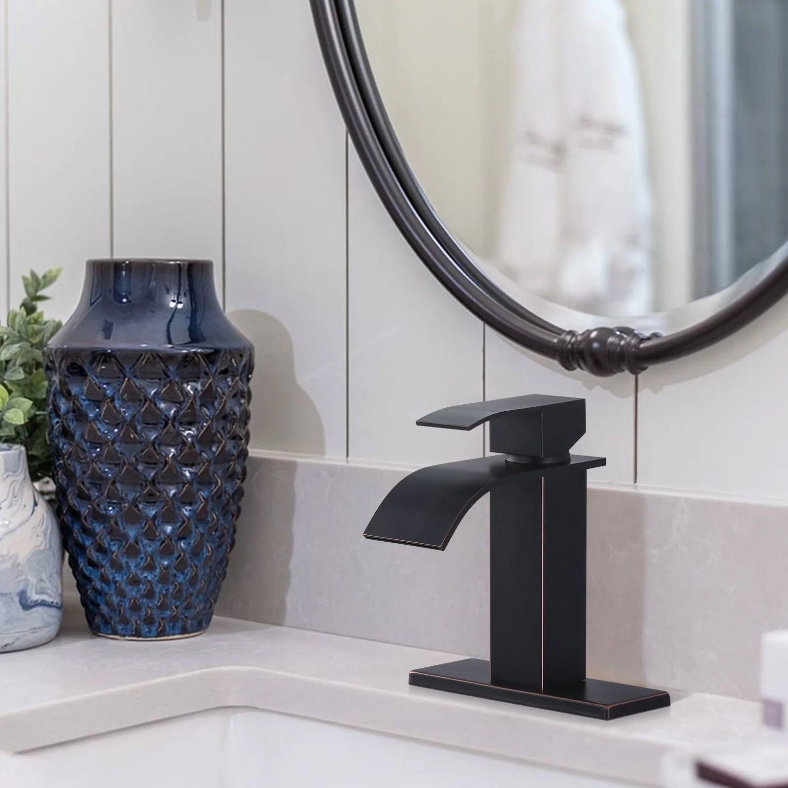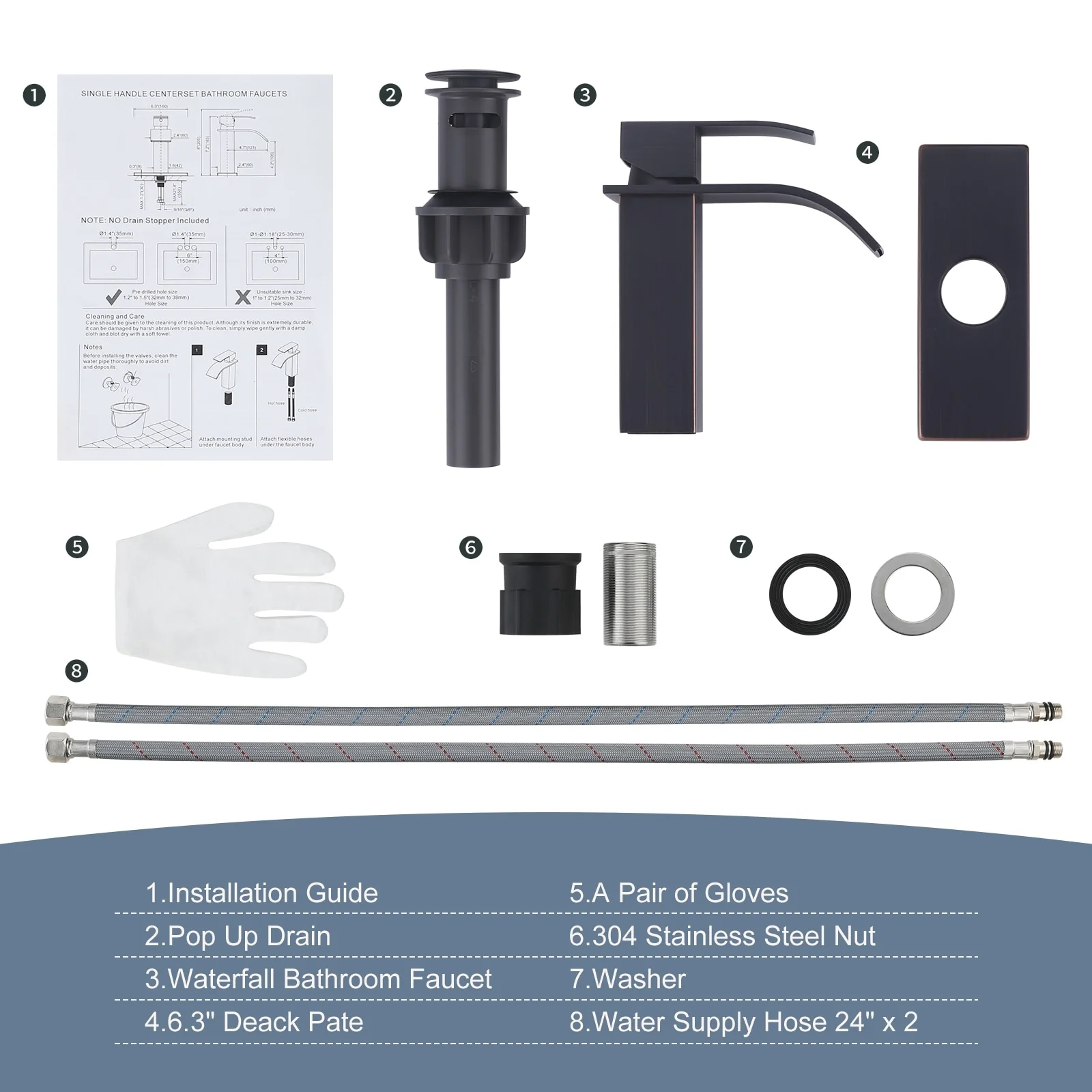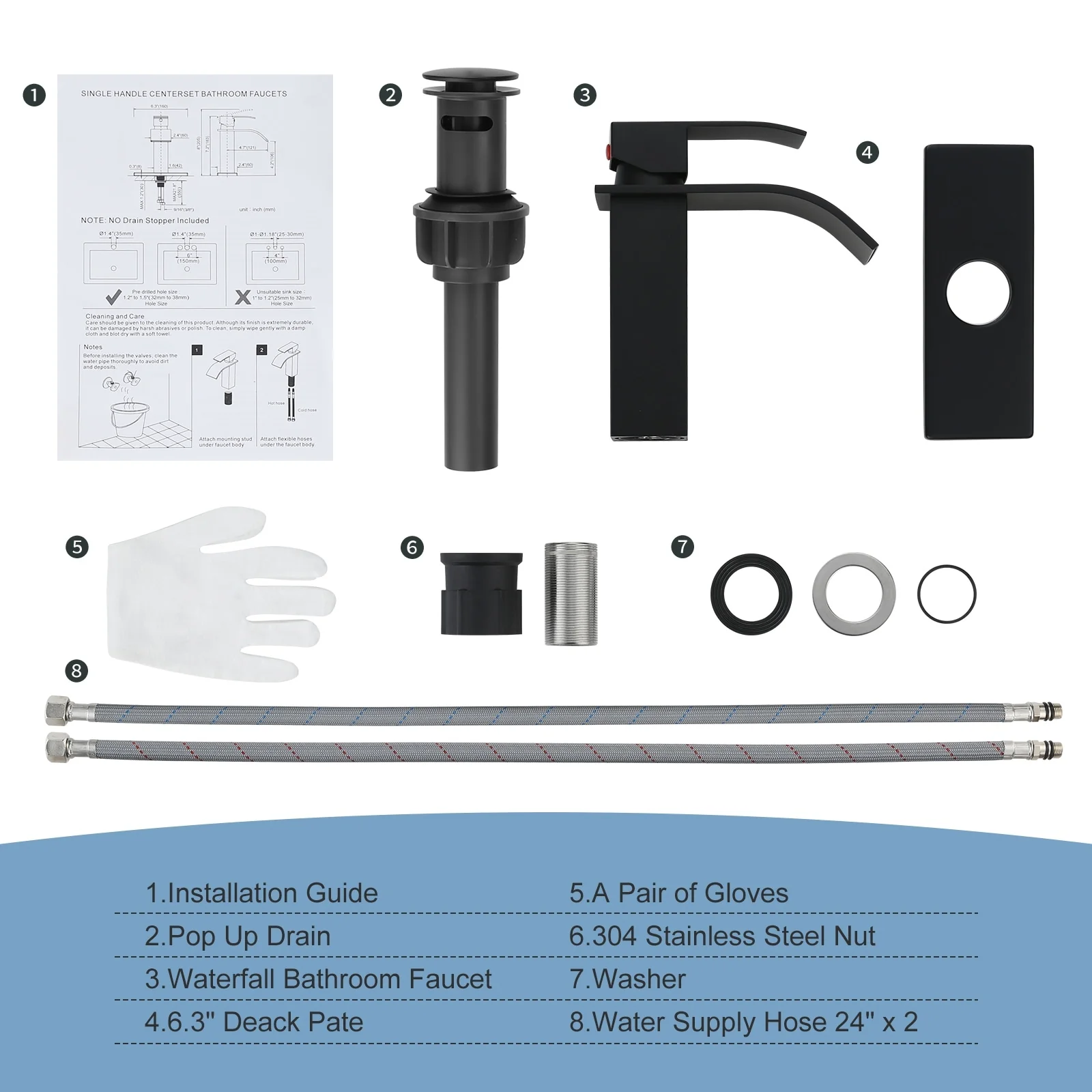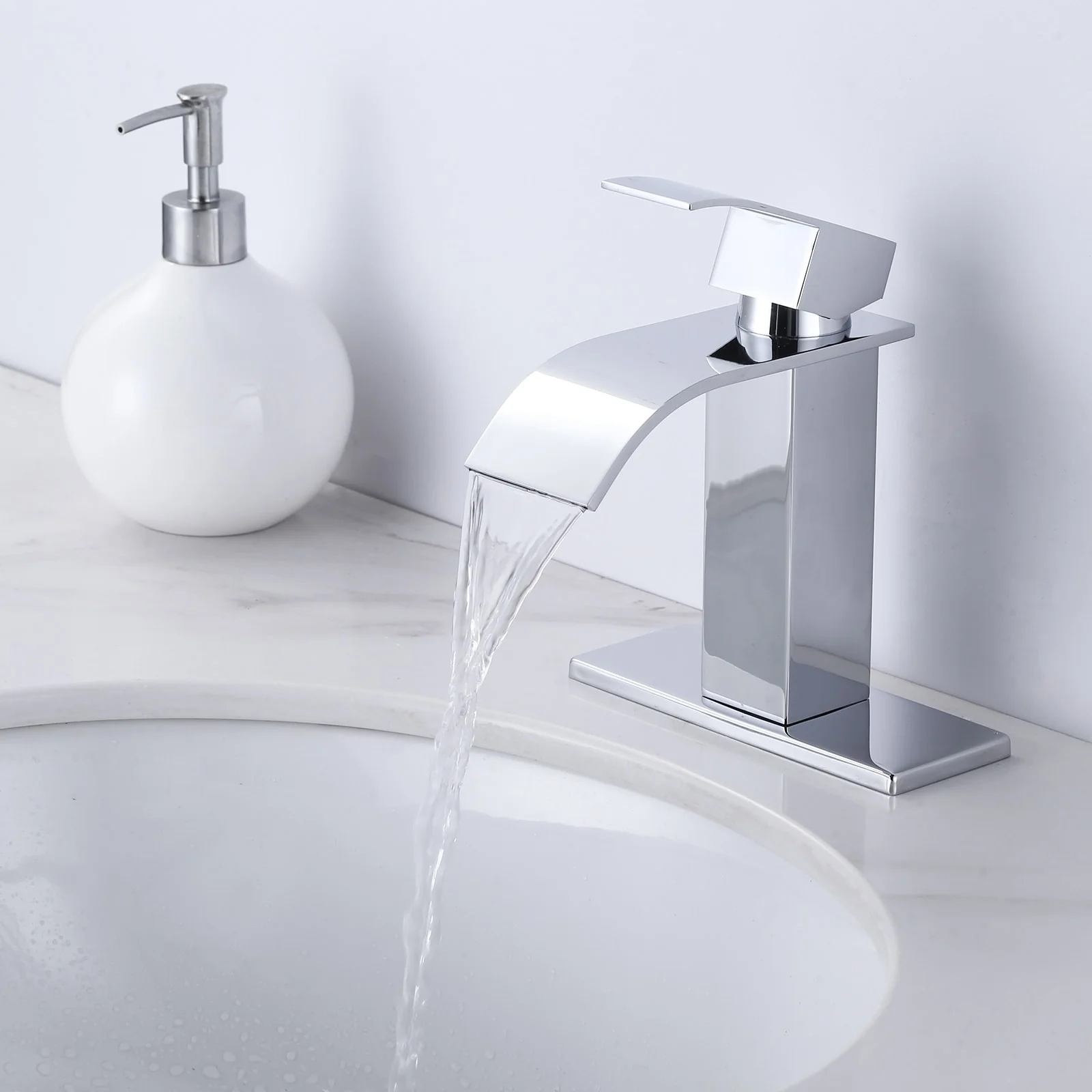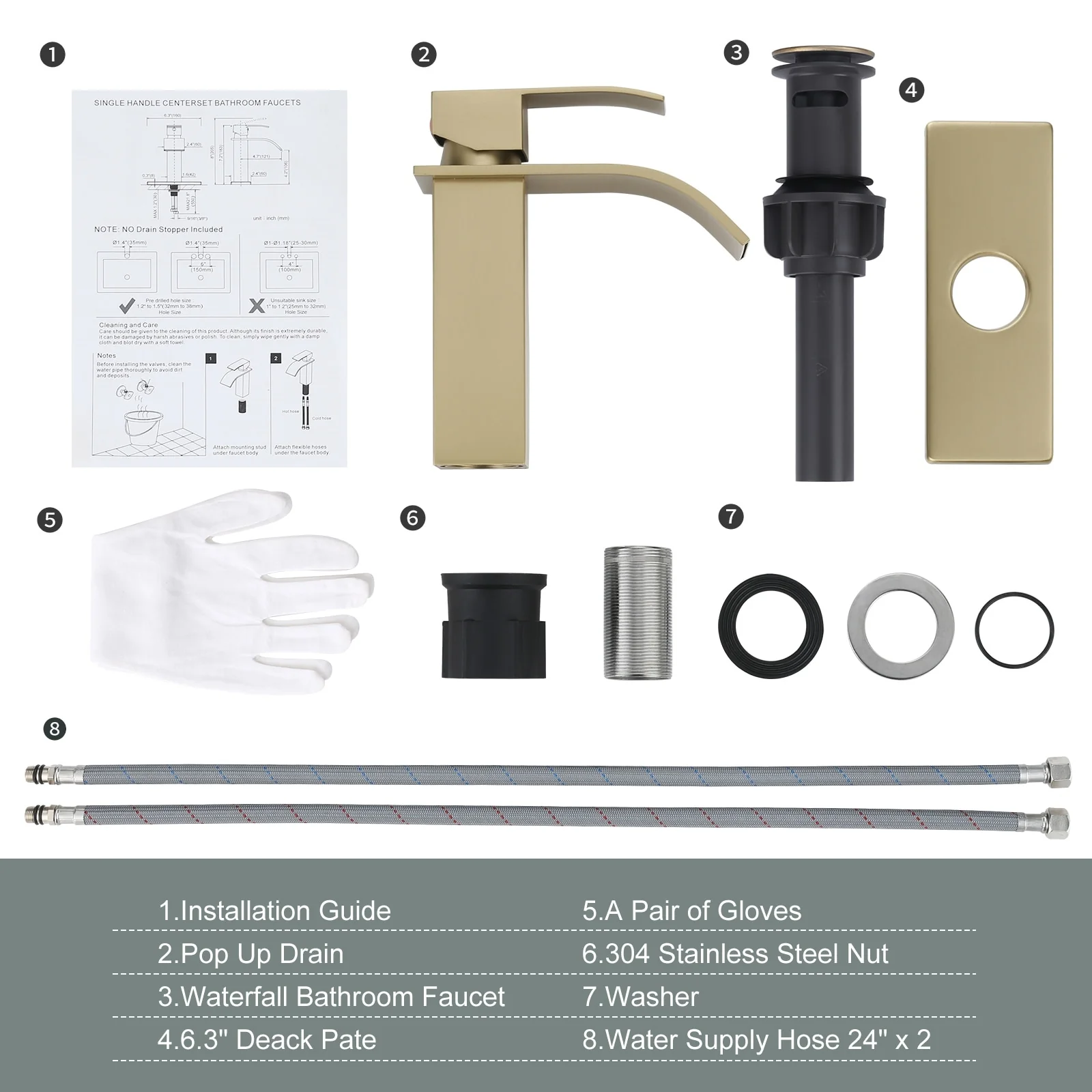 Single-handle waterfall-style bathroom faucet can effectively enhance the elegance of your bathroom. With a waterfall spout, water flows smoothly with a gentle lift of the handle, providing a quiet and elegant experience. The included drain makes water drainage easy and efficient with a simple press.