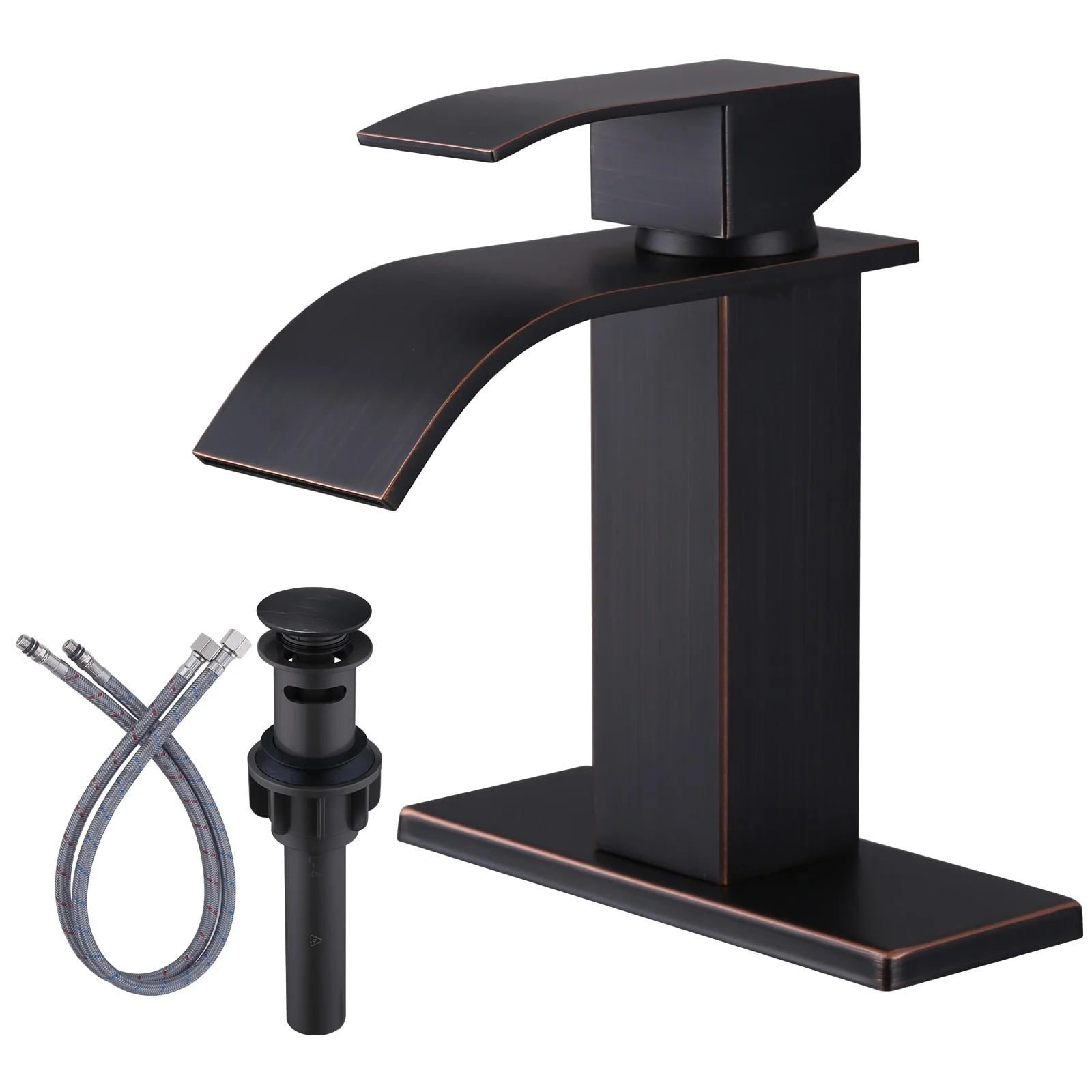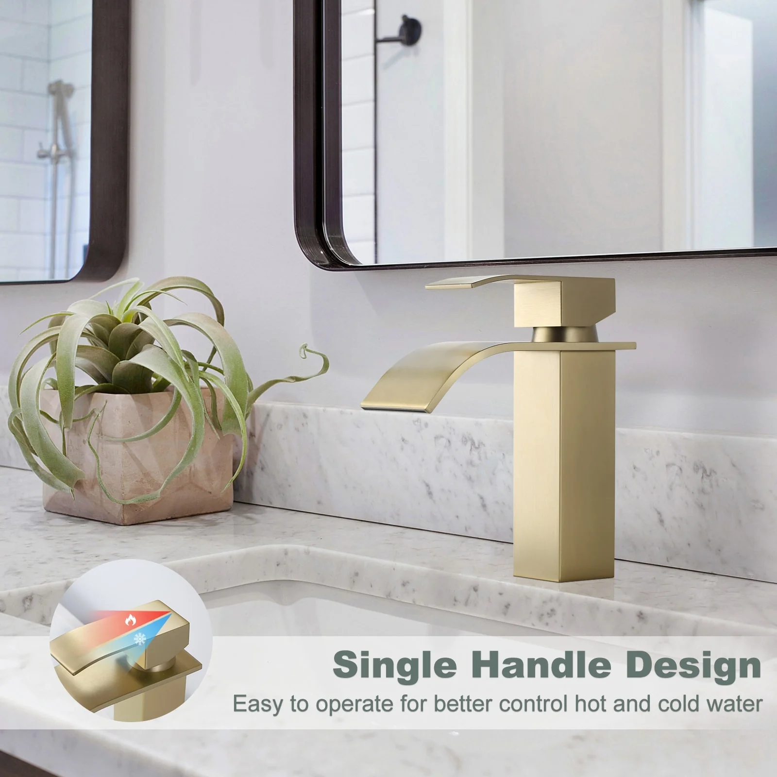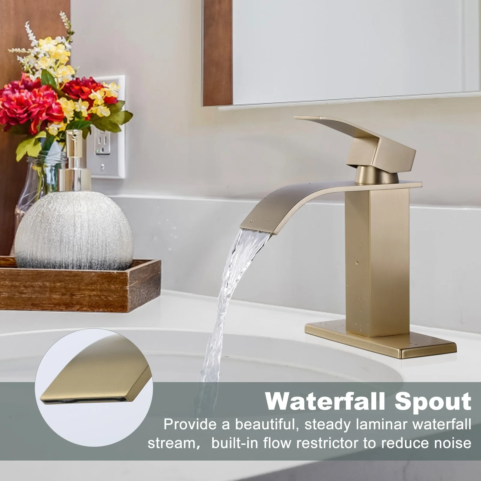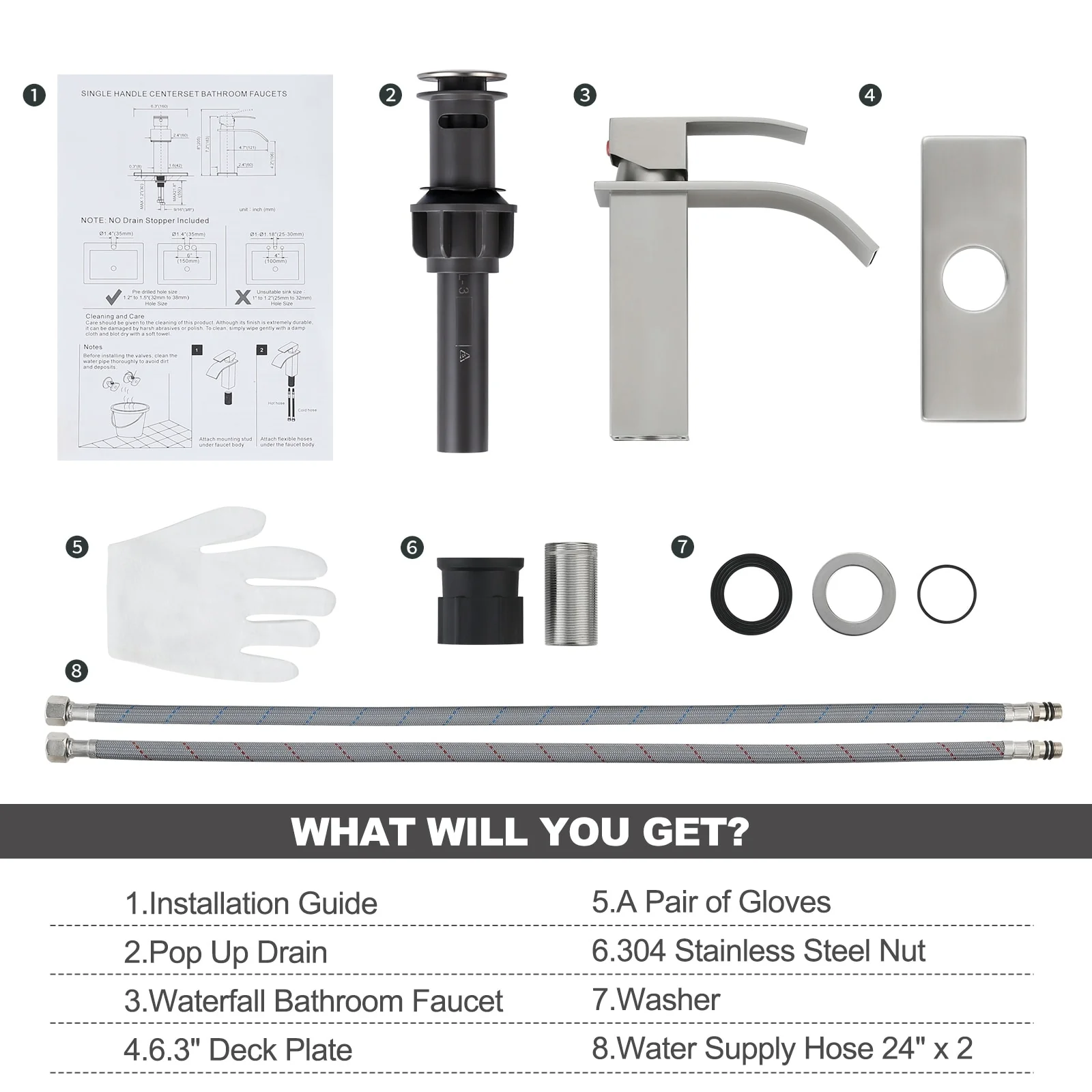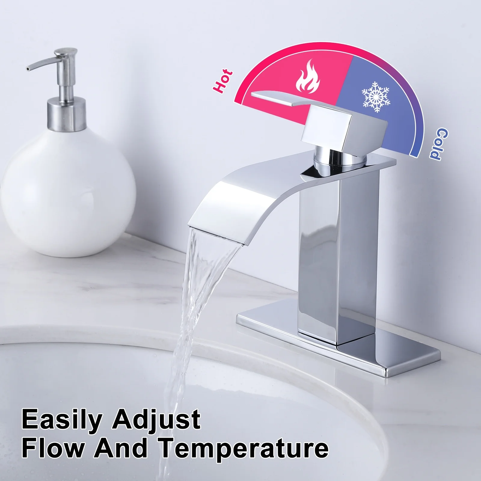 Single-handle waterfall-style bathroom faucet can effectively enhance the elegance of your bathroom. With a waterfall spout, water flows smoothly with a gentle lift of the handle, providing a quiet and elegant experience. The included drain makes water drainage easy and efficient with a simple press.