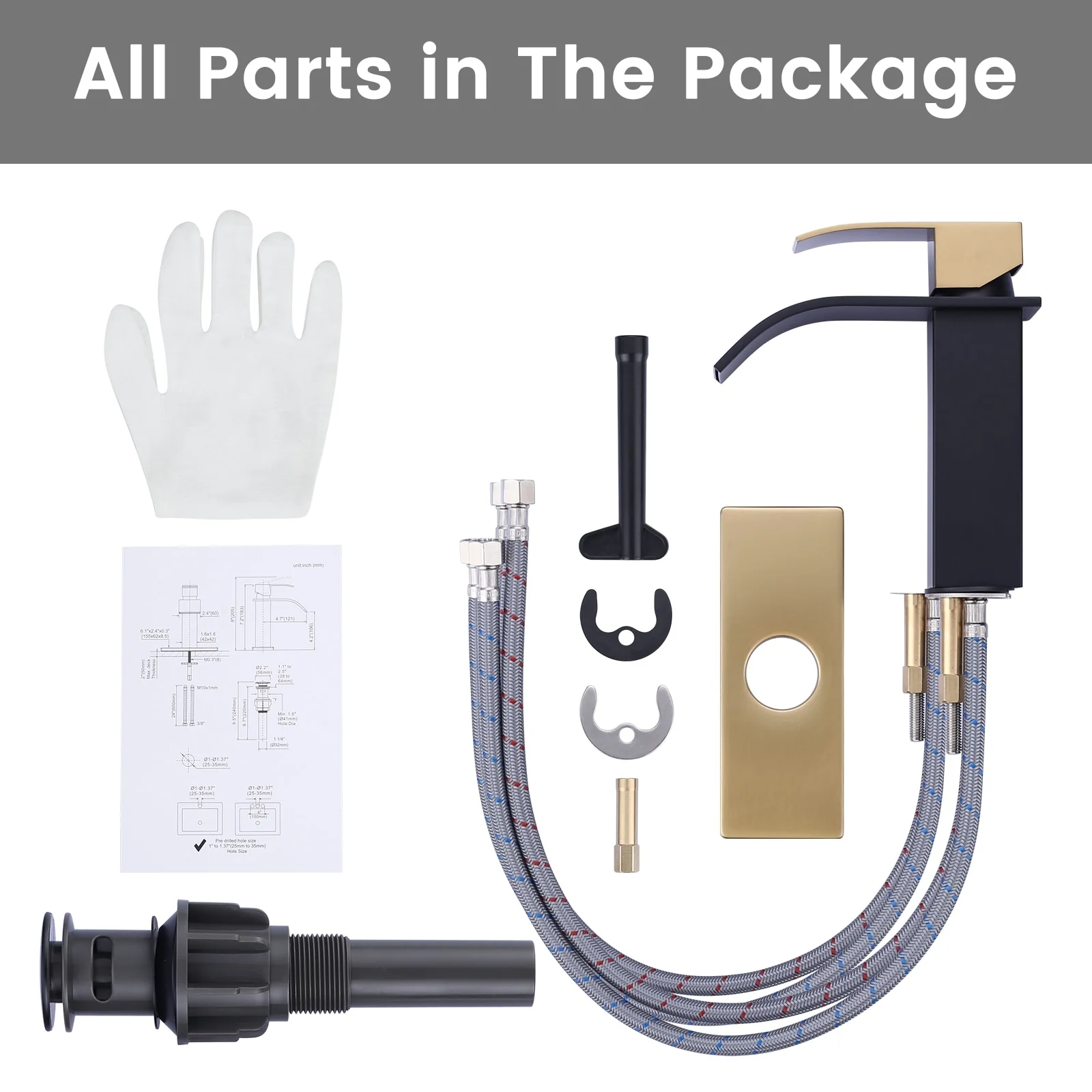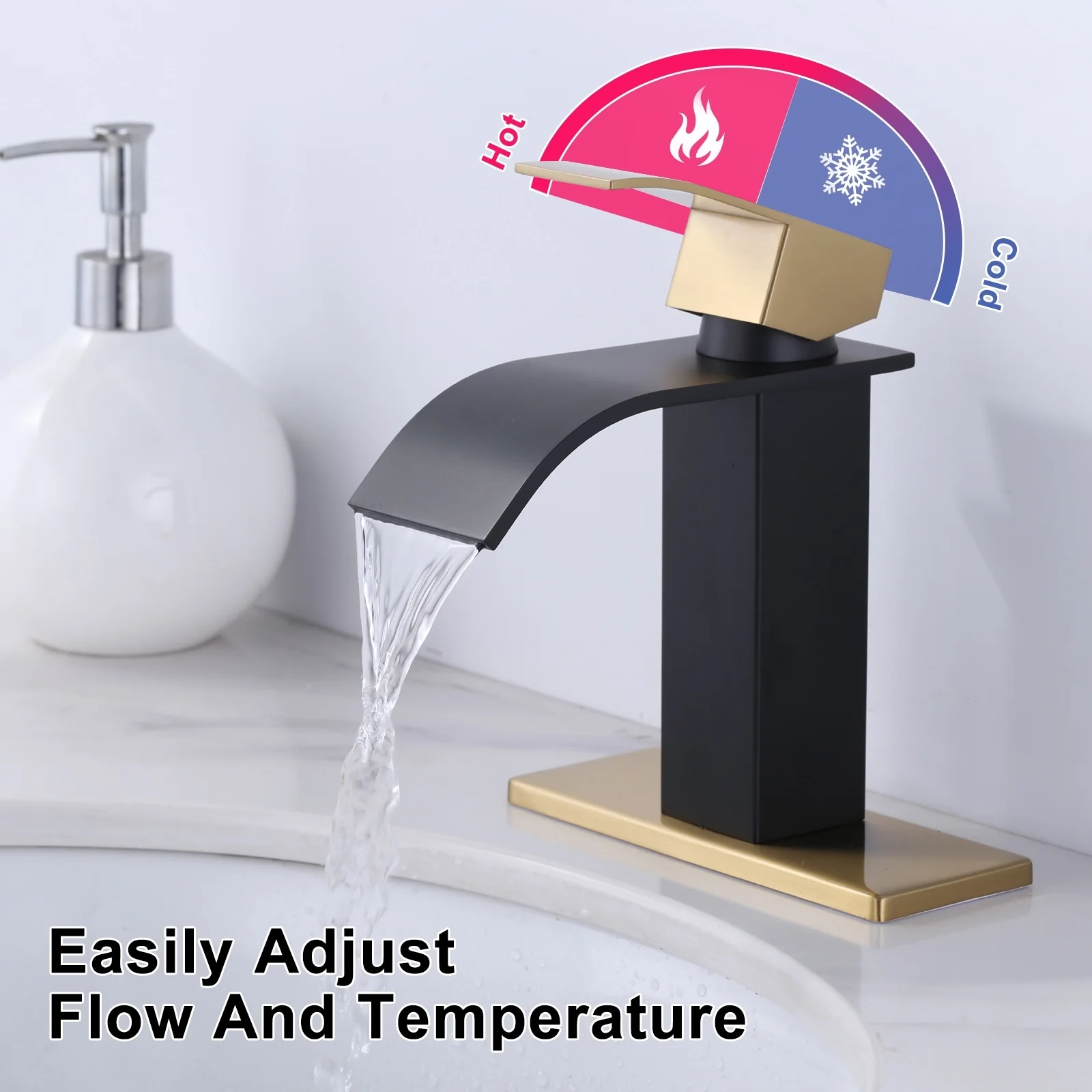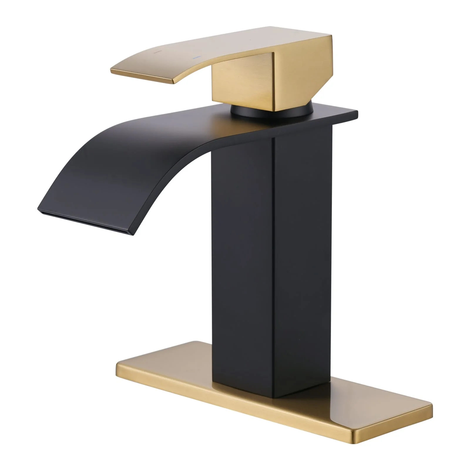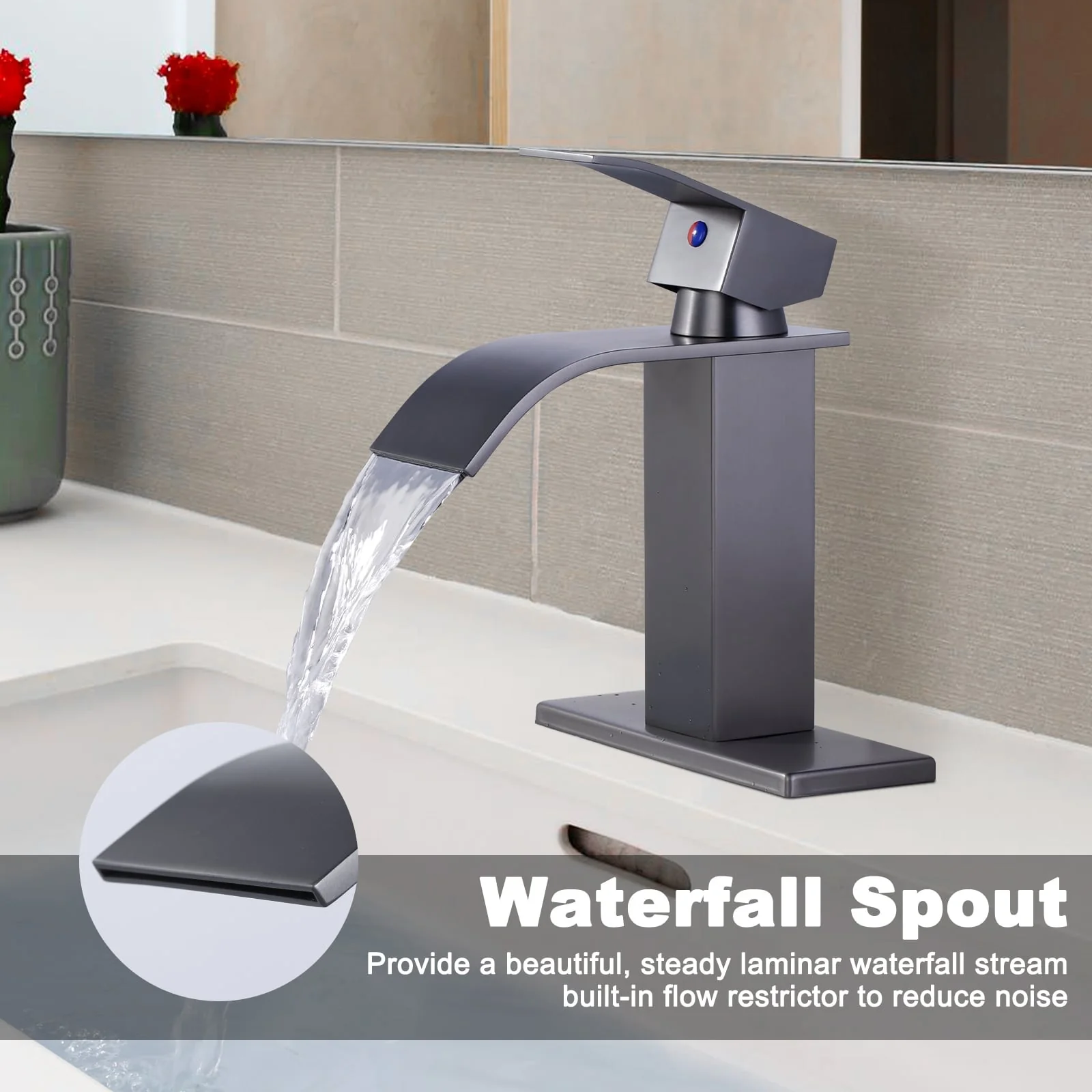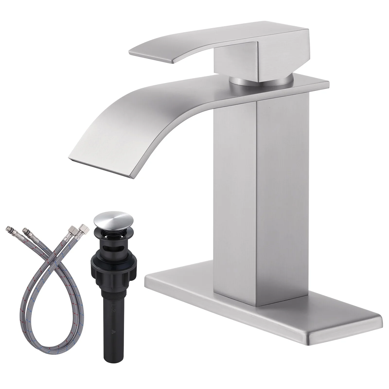 Single-handle waterfall-style bathroom faucet can effectively enhance the elegance of your bathroom. With a waterfall spout, water flows smoothly with a gentle lift of the handle, providing a quiet and elegant experience. The included drain makes water drainage easy and efficient with a simple press.