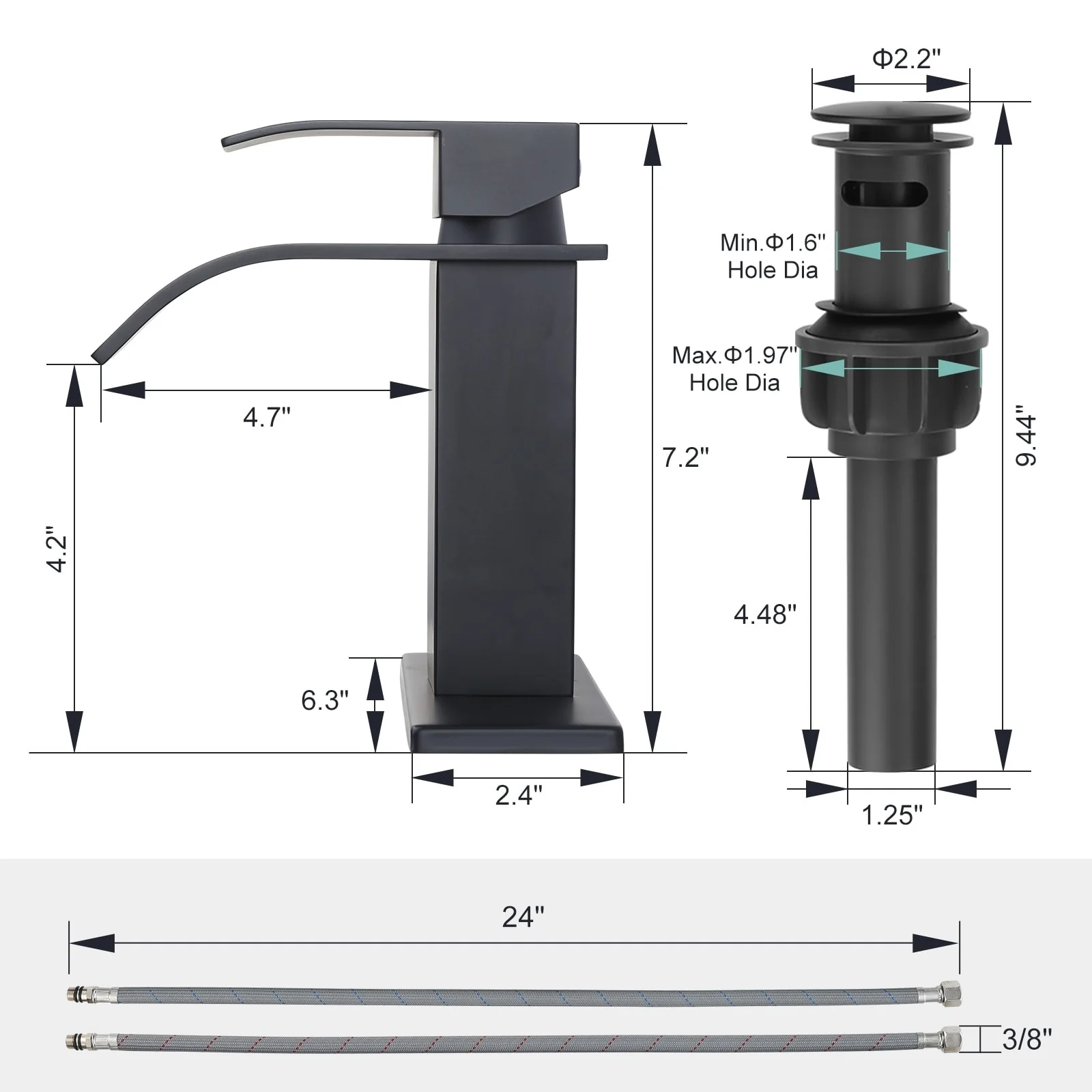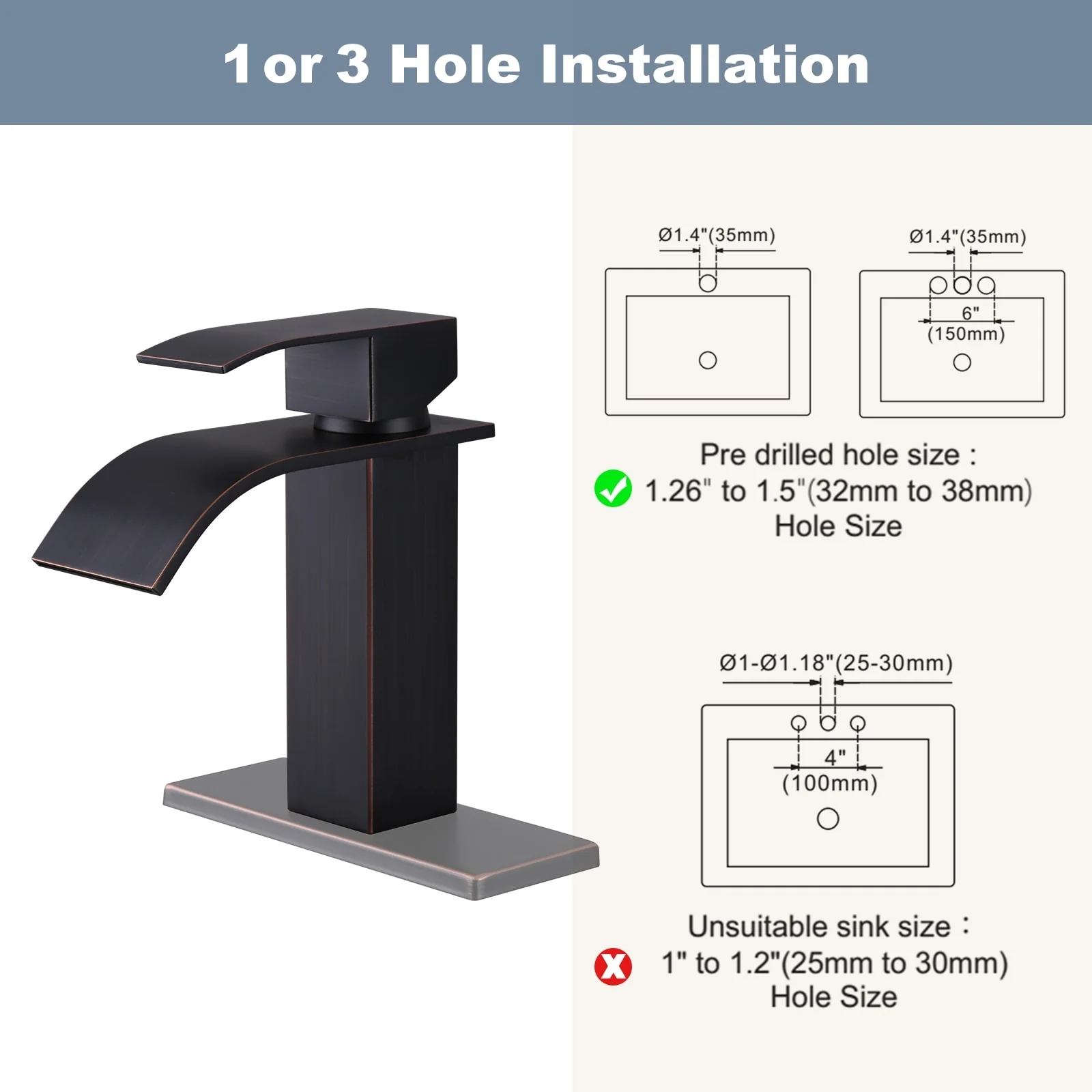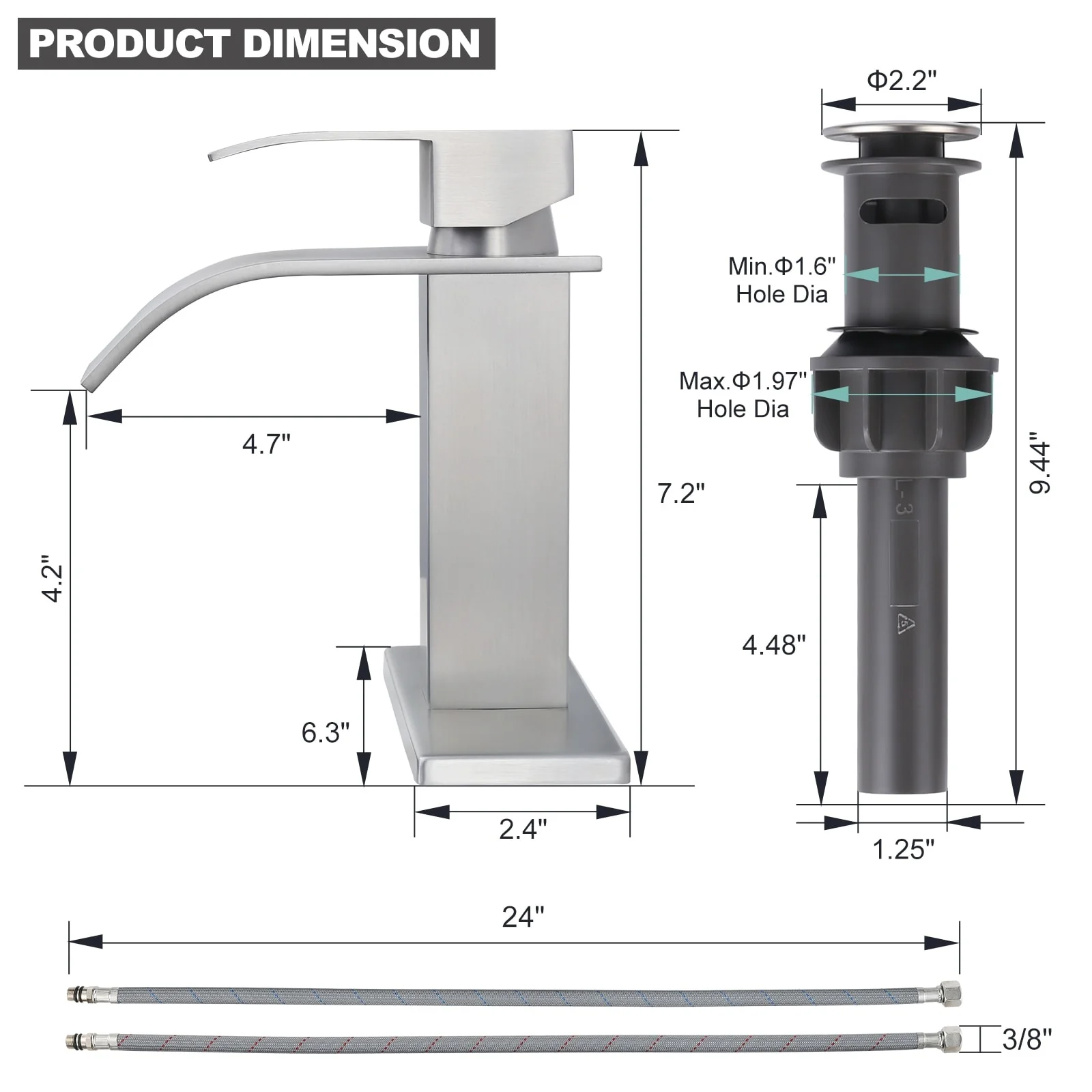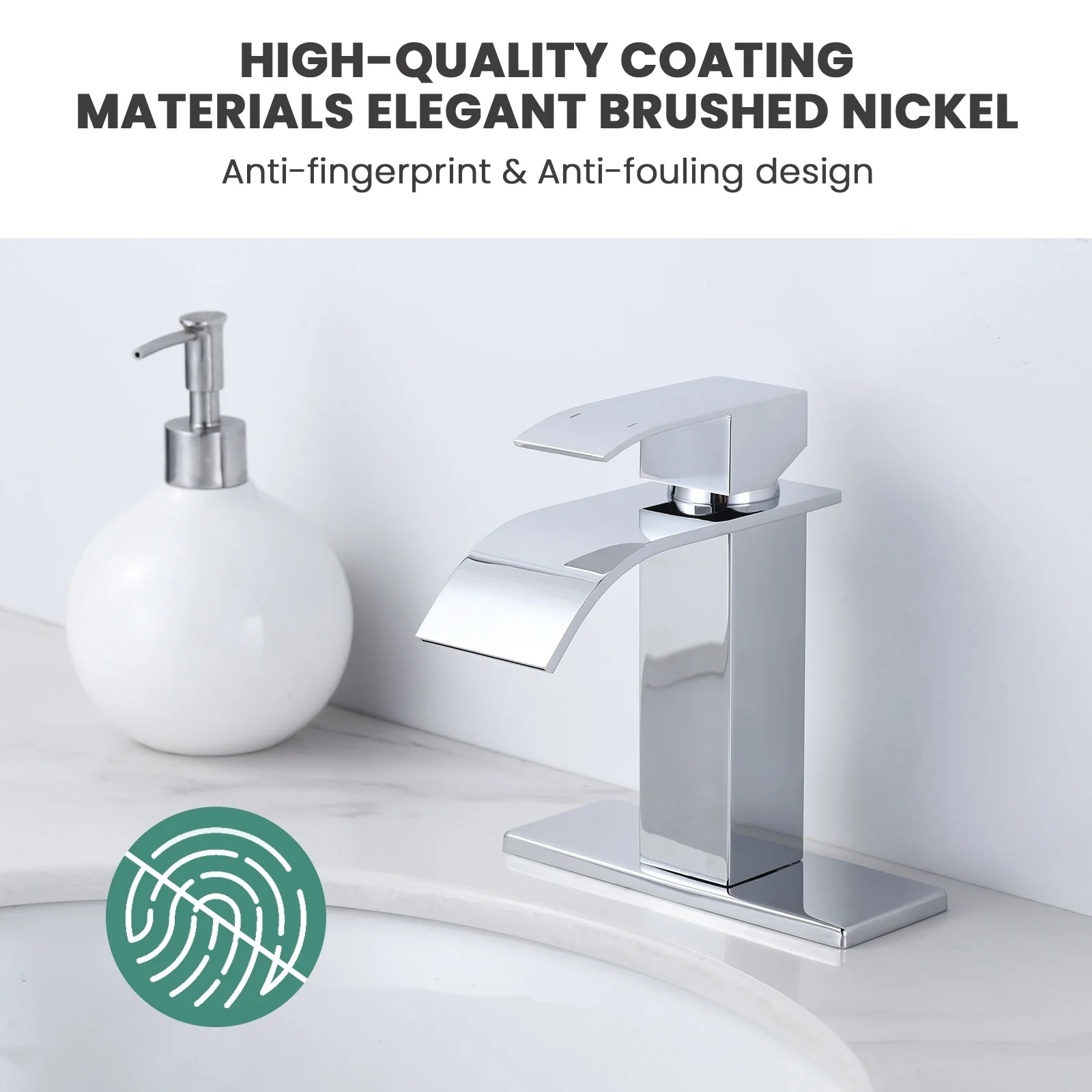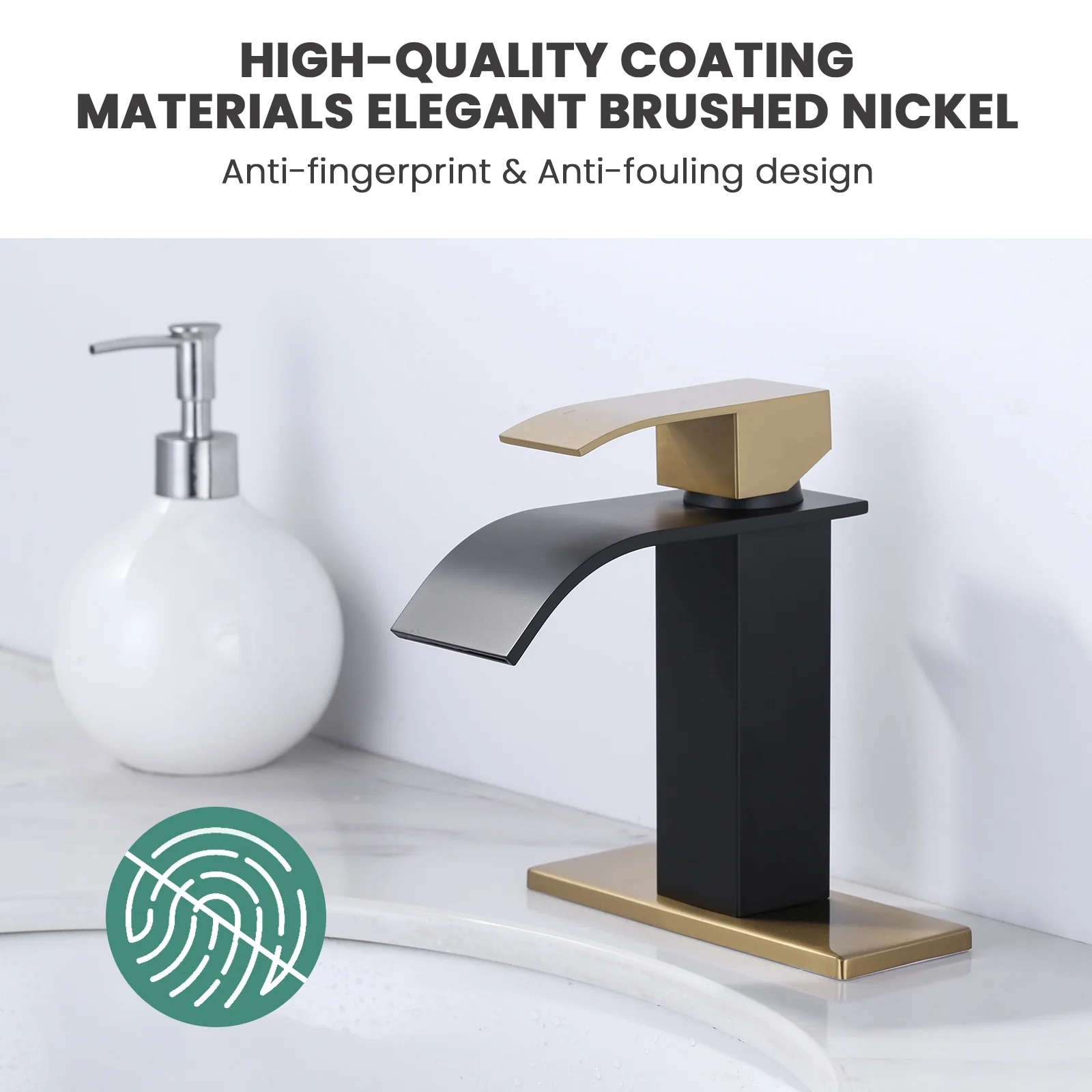Single-handle waterfall-style bathroom faucet can effectively enhance the elegance of your bathroom. With a waterfall spout, water flows smoothly with a gentle lift of the handle, providing a quiet and elegant experience. The included drain makes water drainage easy and efficient with a simple press.