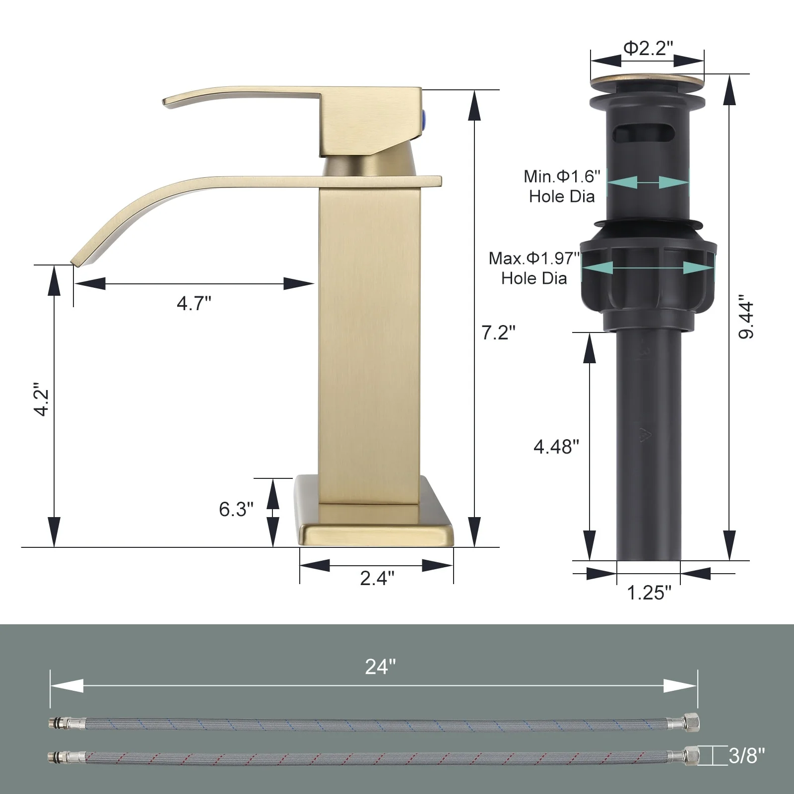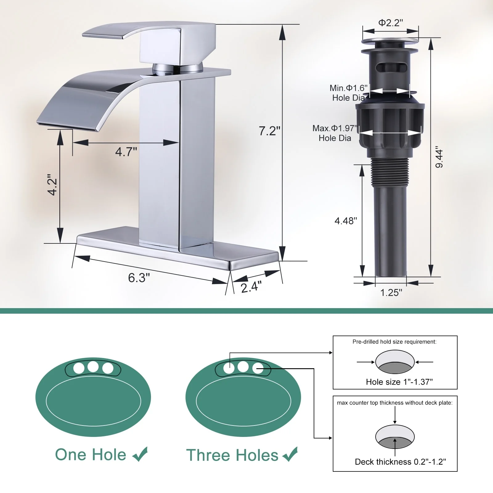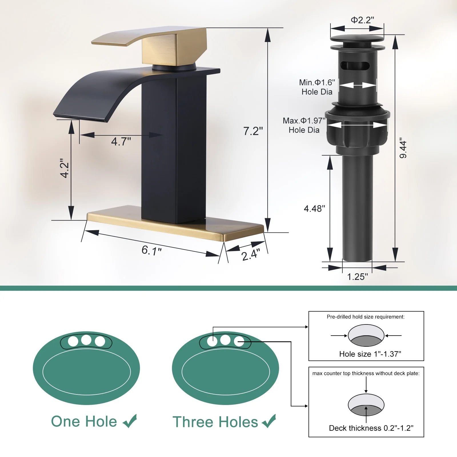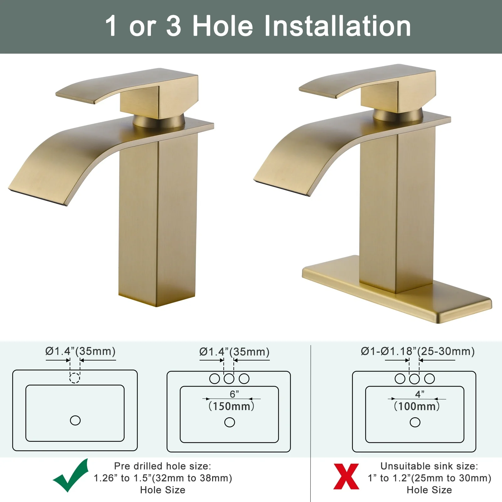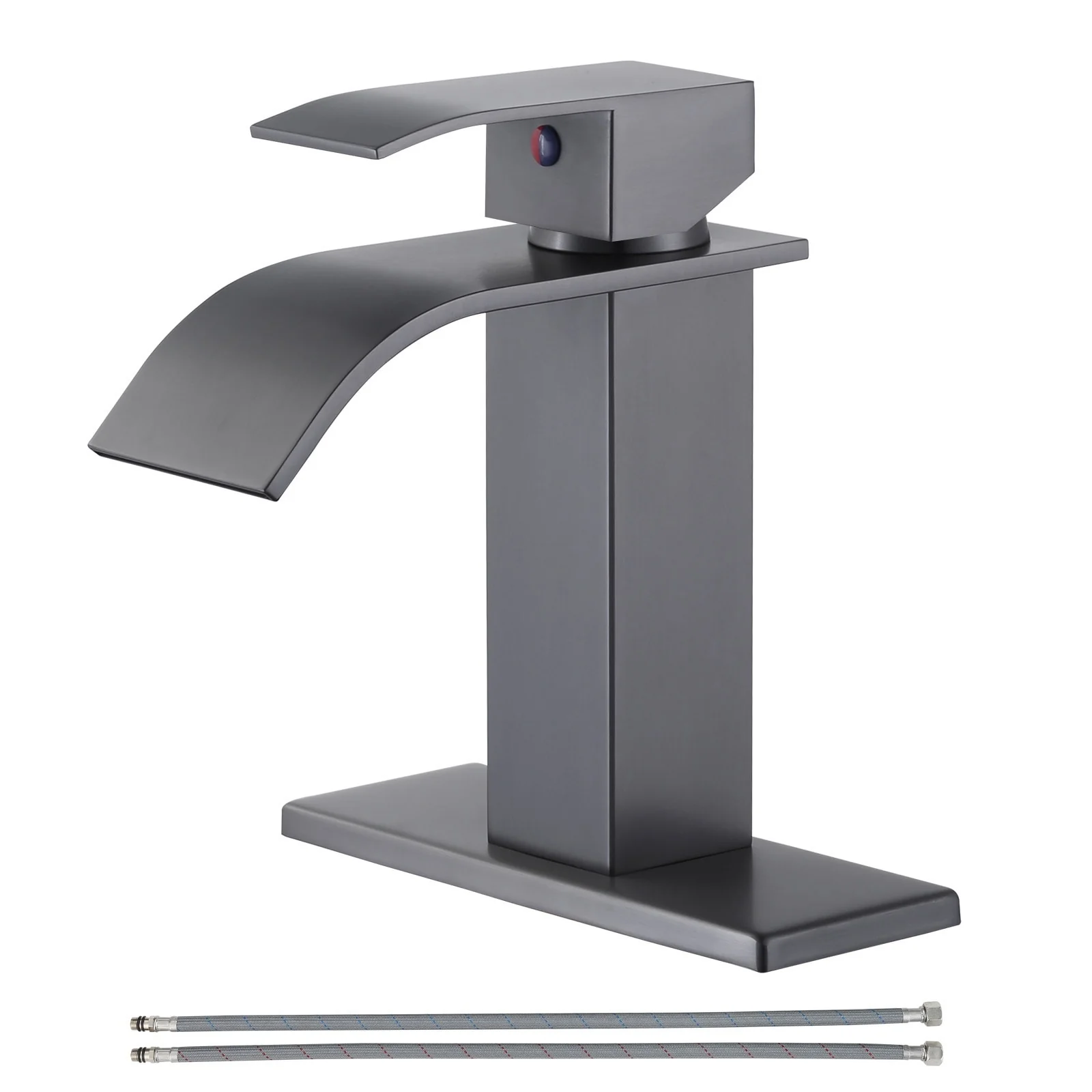 Single-handle waterfall-style bathroom faucet can effectively enhance the elegance of your bathroom. With a waterfall spout, water flows smoothly with a gentle lift of the handle, providing a quiet and elegant experience. The included drain makes water drainage easy and efficient with a simple press.