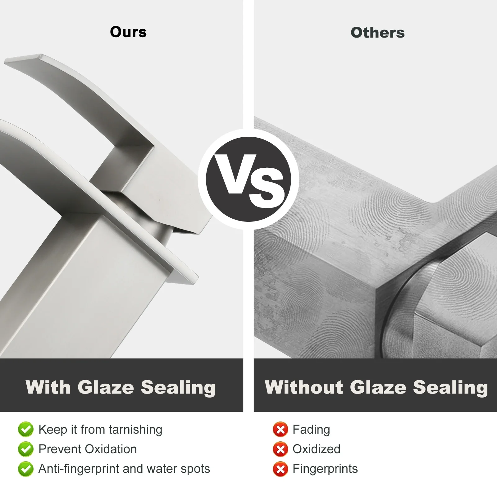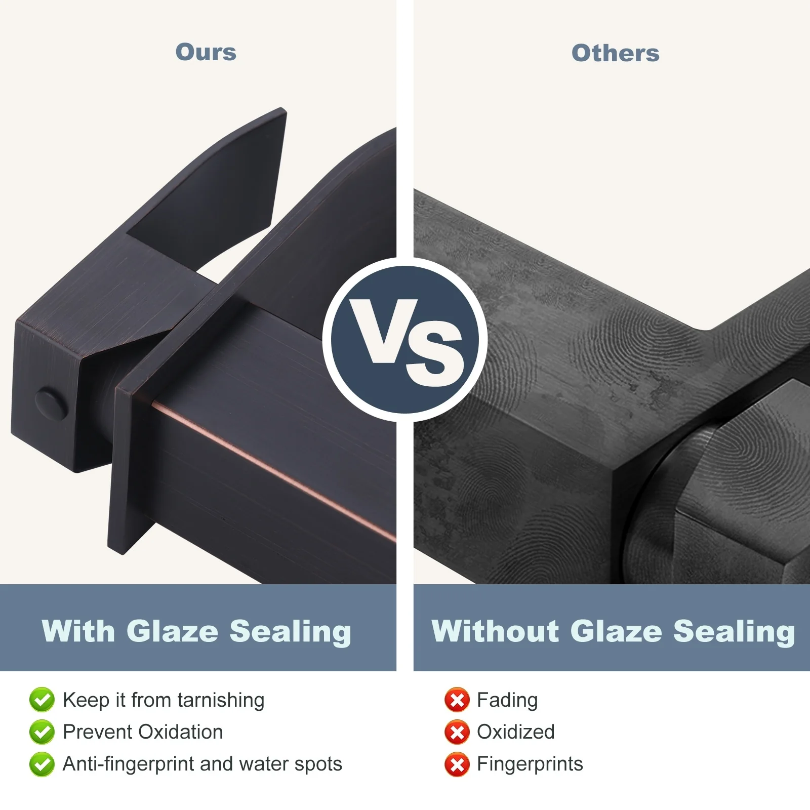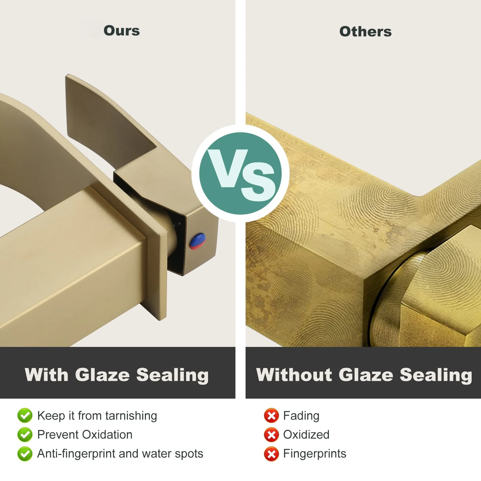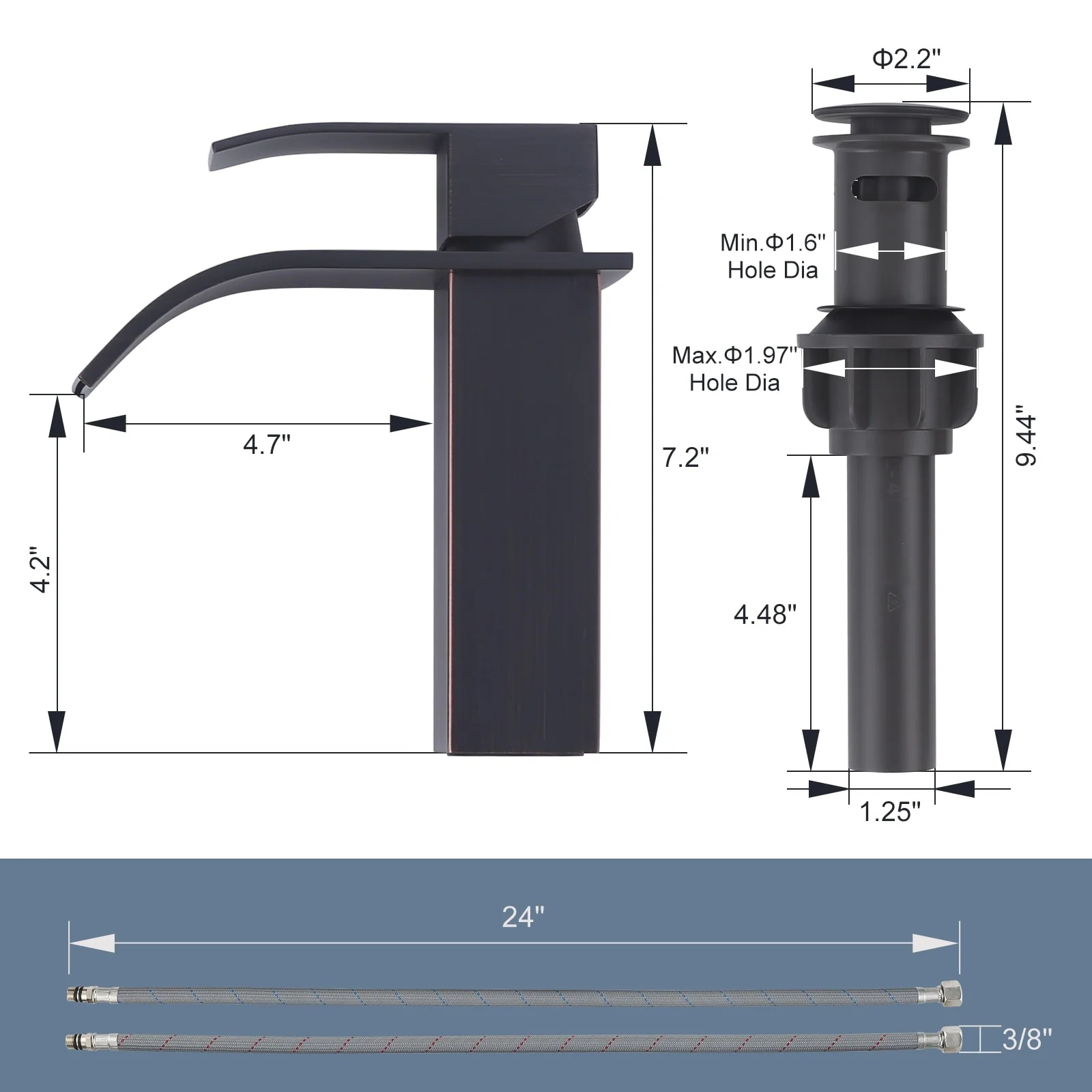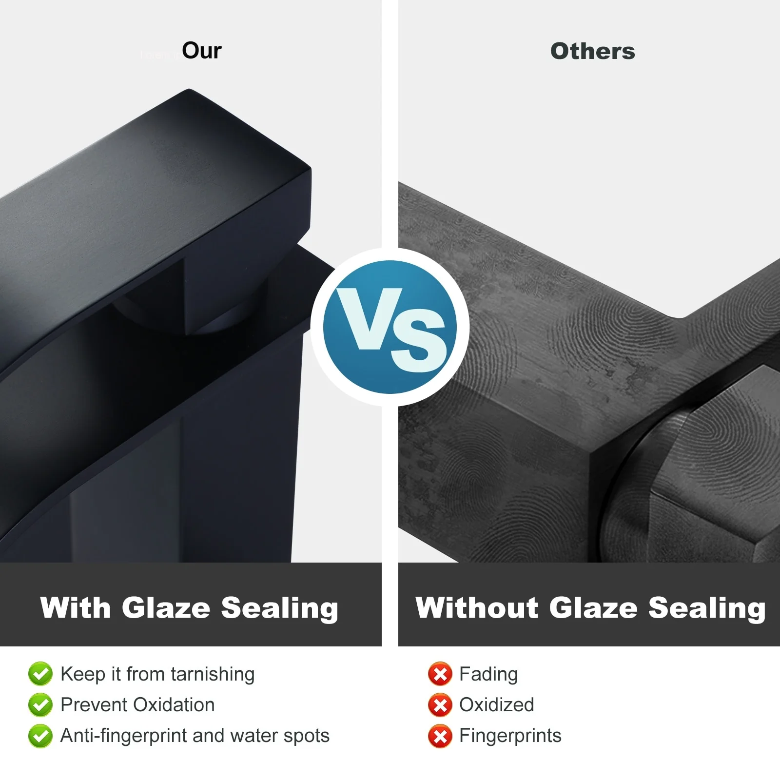 Single-handle waterfall-style bathroom faucet can effectively enhance the elegance of your bathroom. With a waterfall spout, water flows smoothly with a gentle lift of the handle, providing a quiet and elegant experience. The included drain makes water drainage easy and efficient with a simple press.